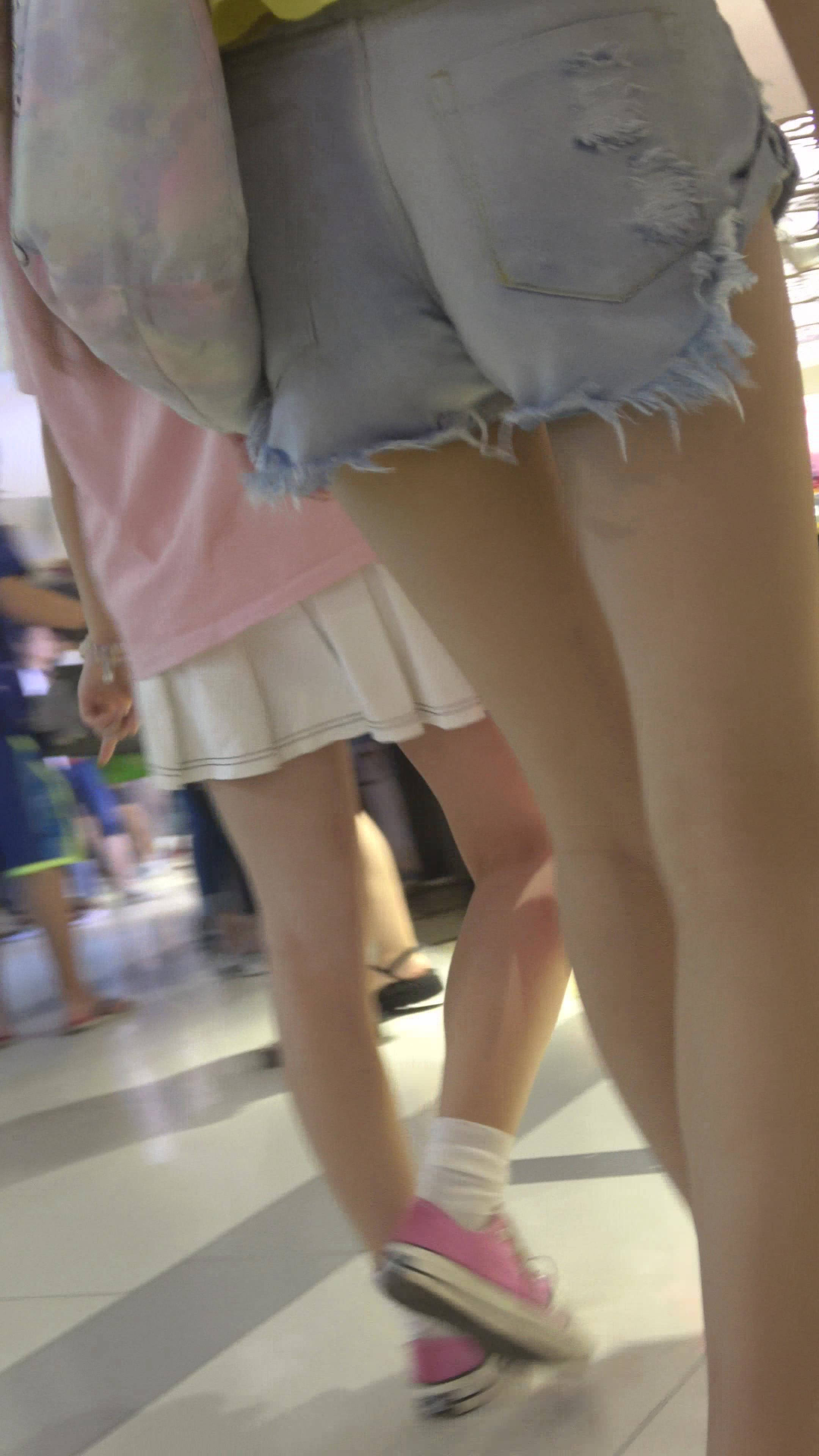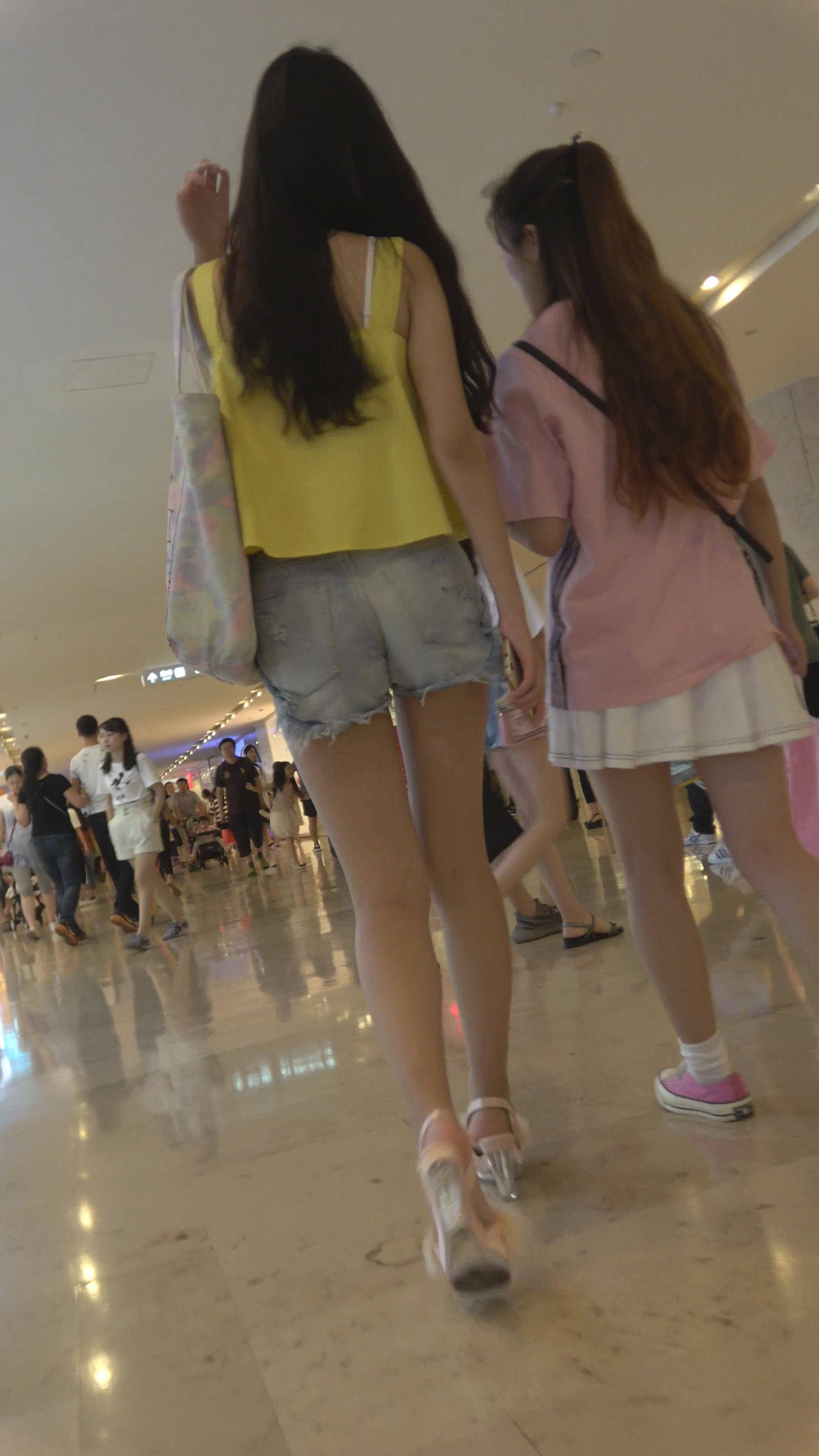 4K - 街拍黄色吊带衫性感超短热裤高跟鞋美女 编号7913