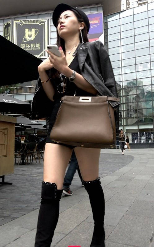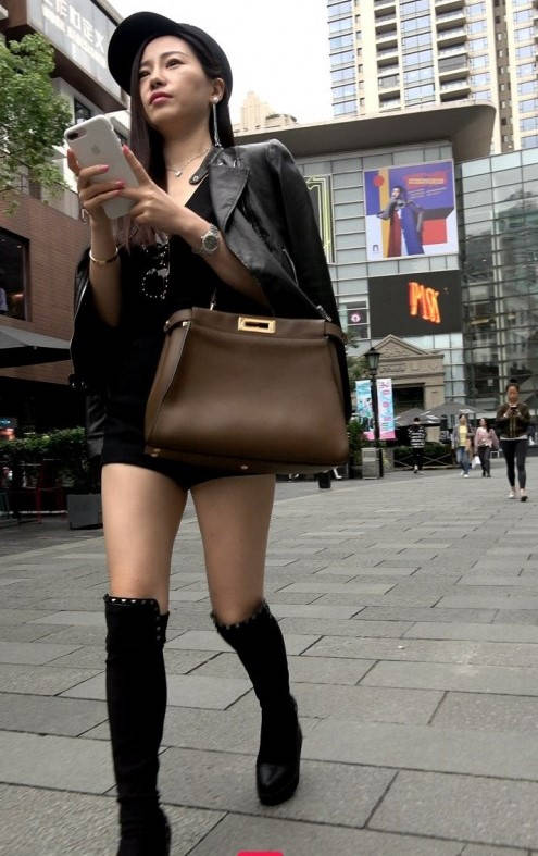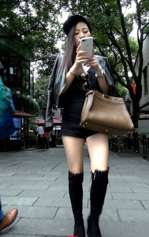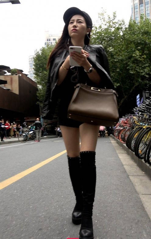 4K-性感黑短裤长腿长靴街拍美女 编号9354