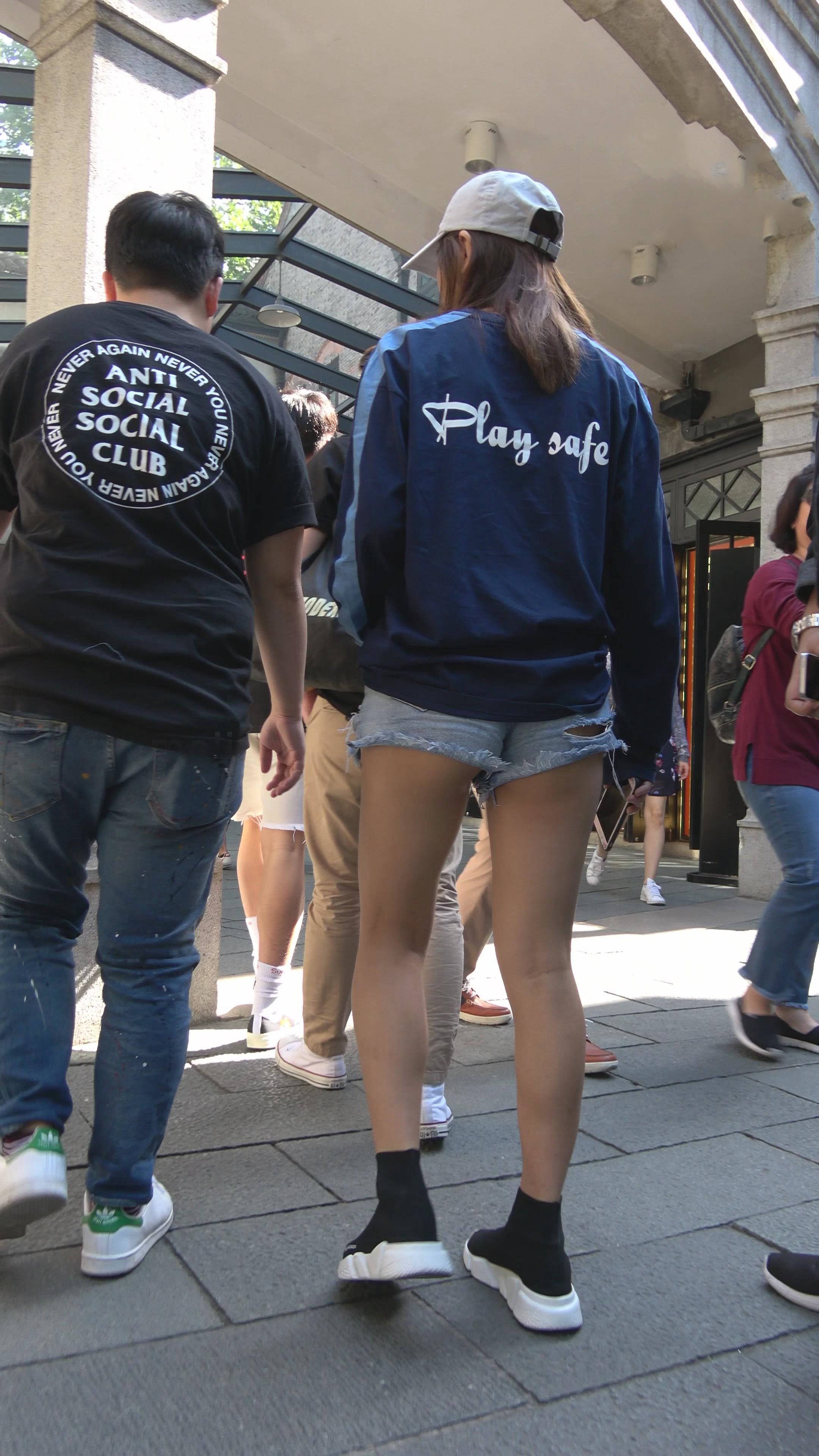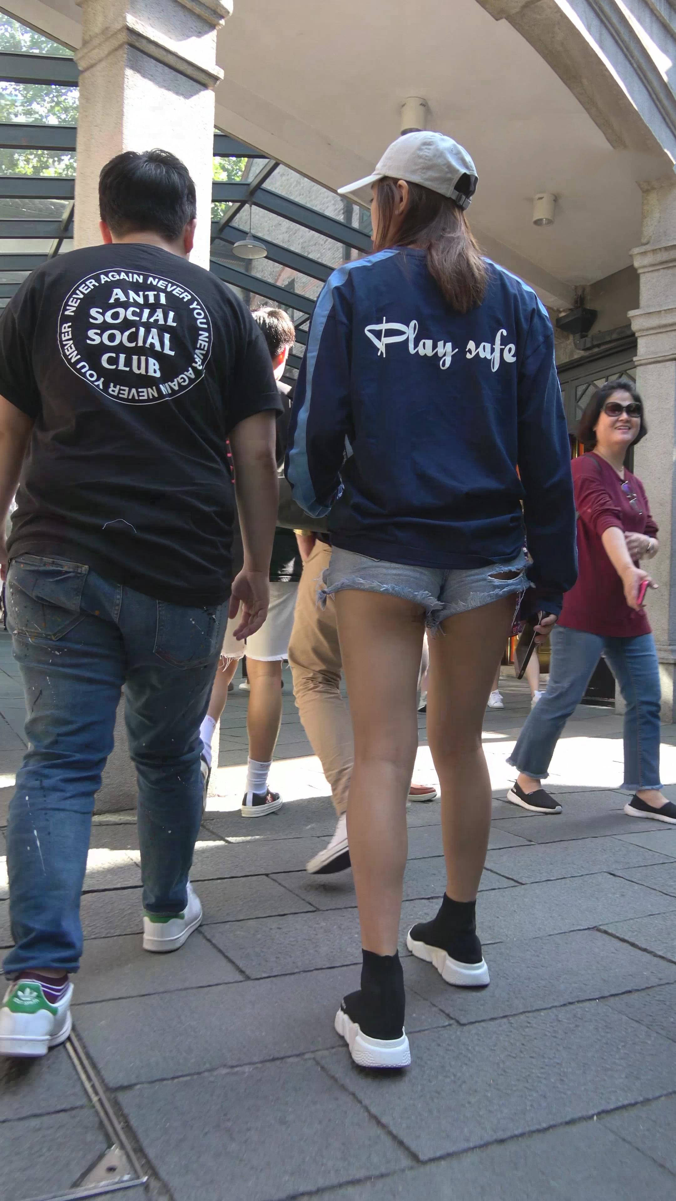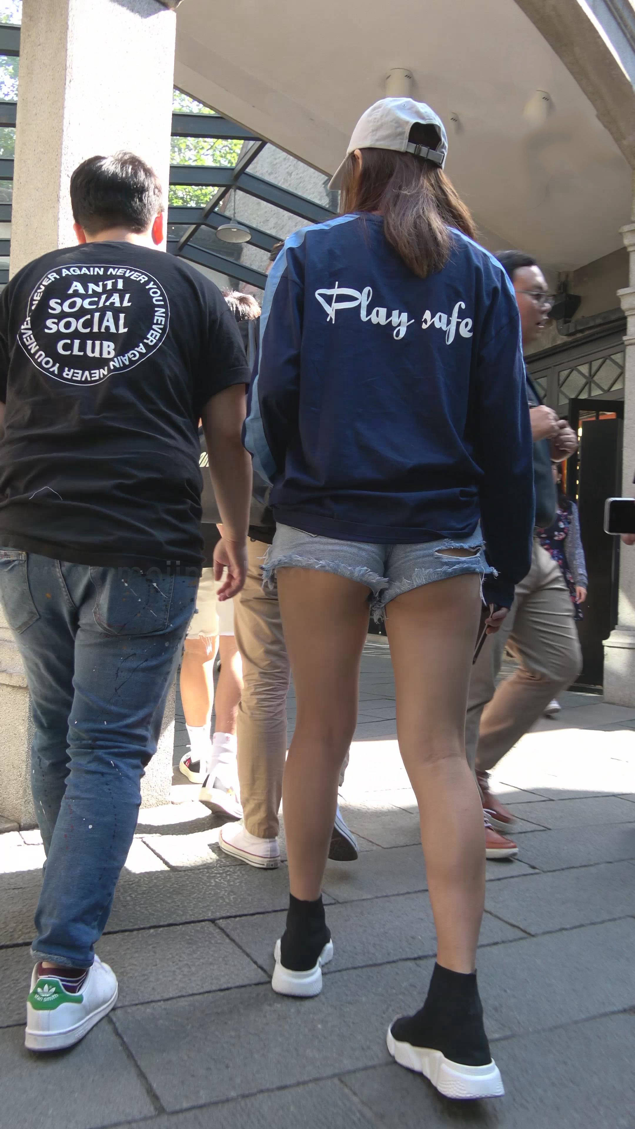 4k-街拍饱满月牙破洞牛仔热裤鸭舌帽小女友 编号7450