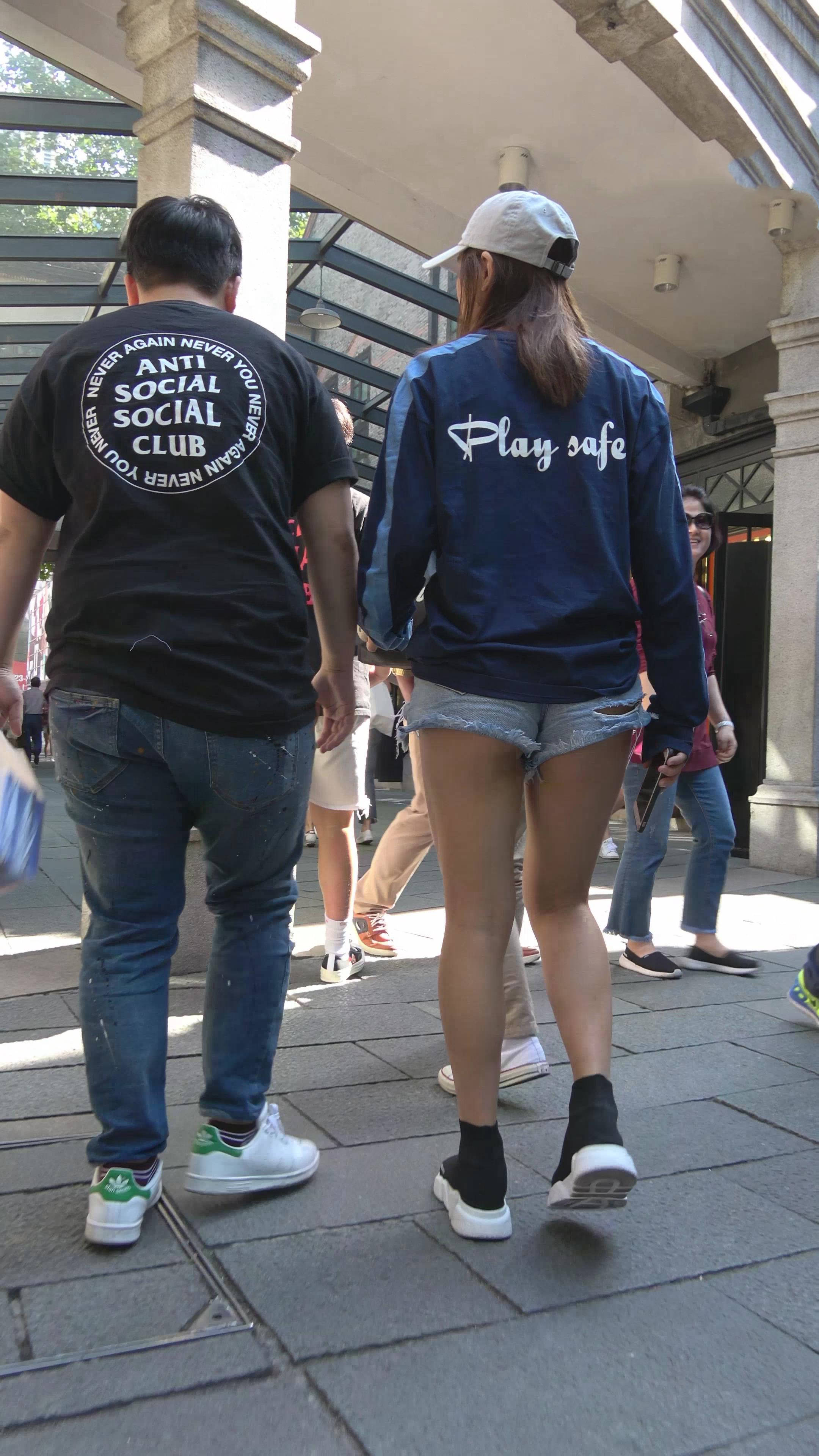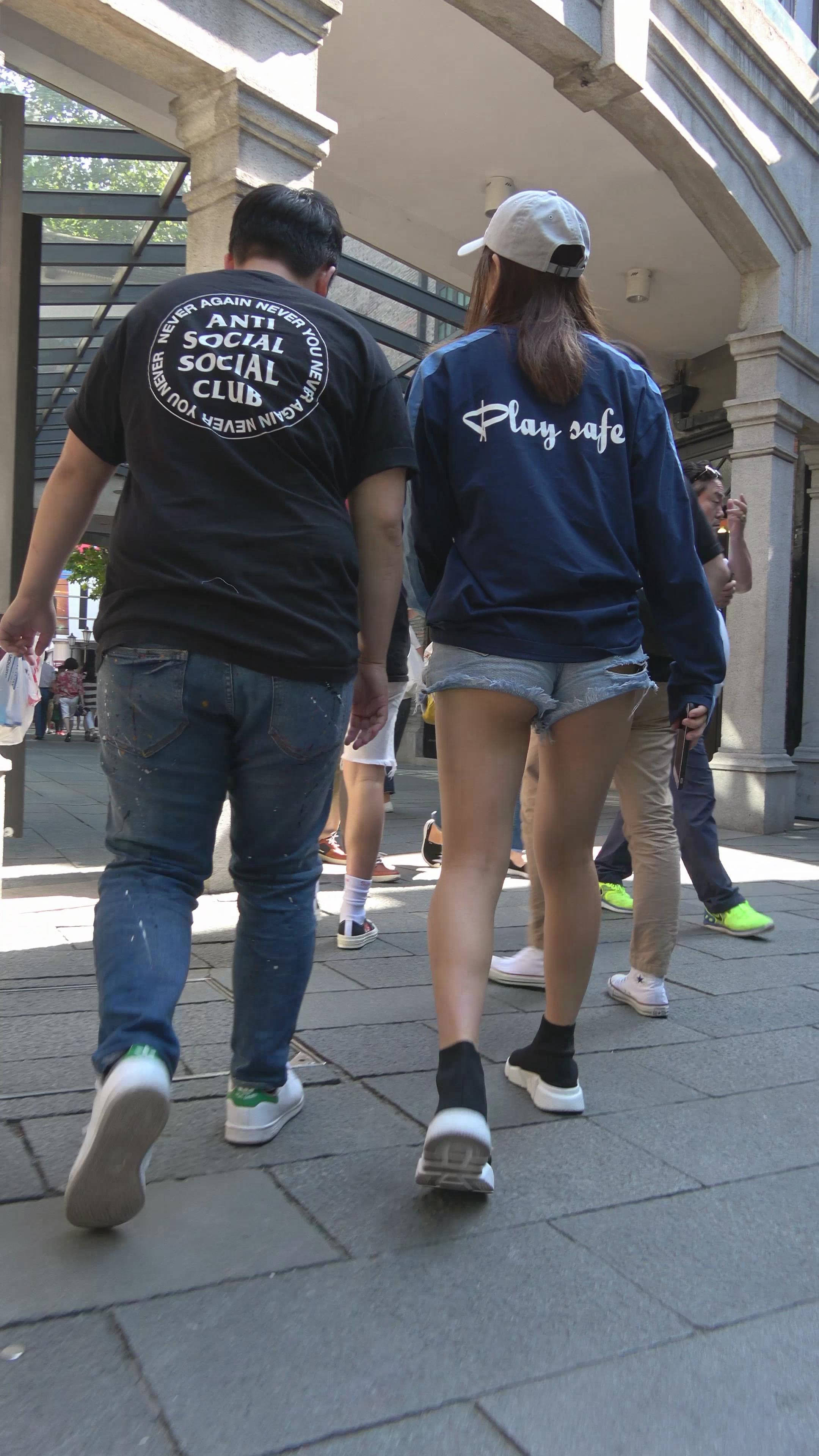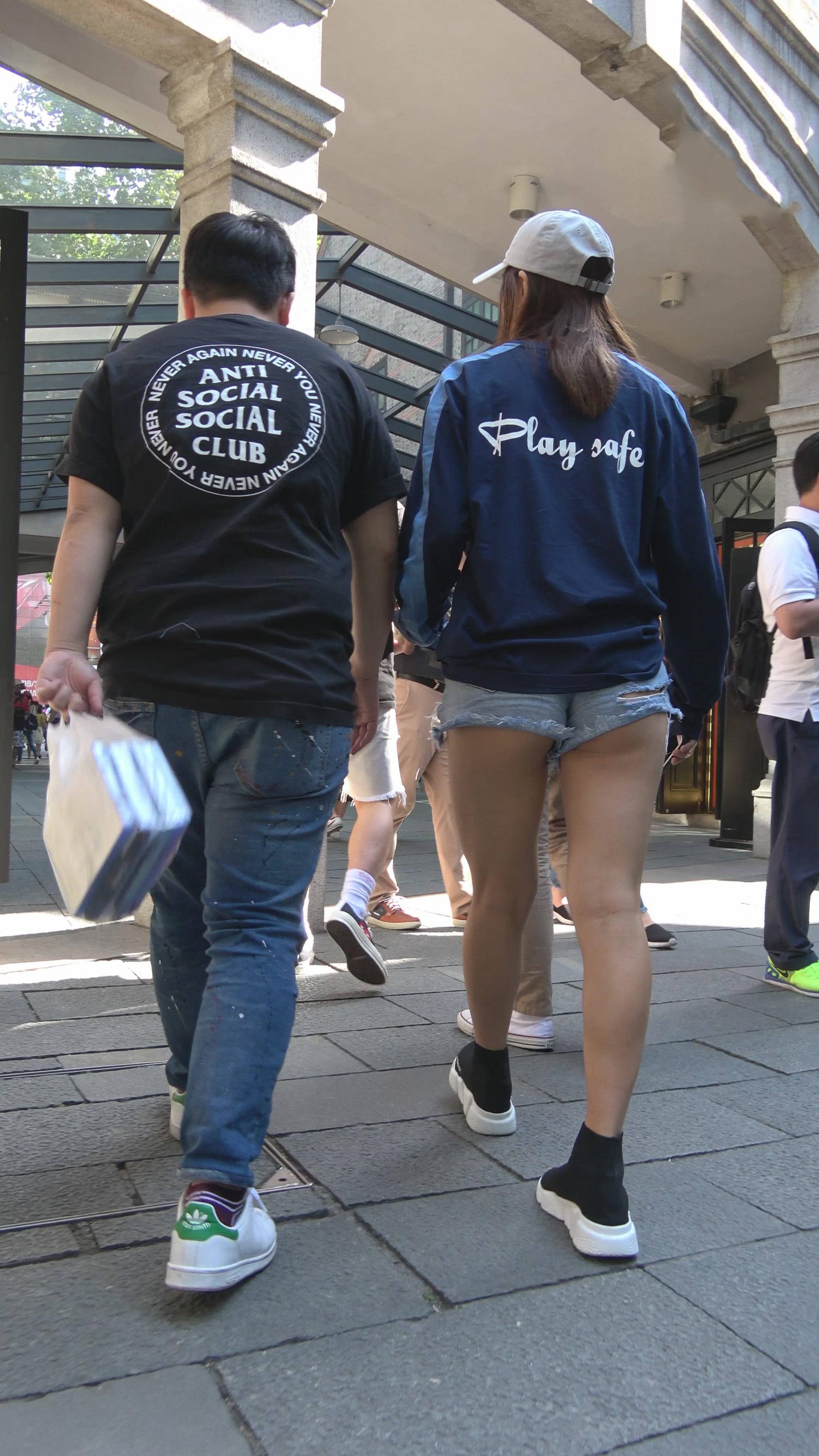4k-街拍饱满月牙破洞牛仔热裤鸭舌帽小女友 编号7450
