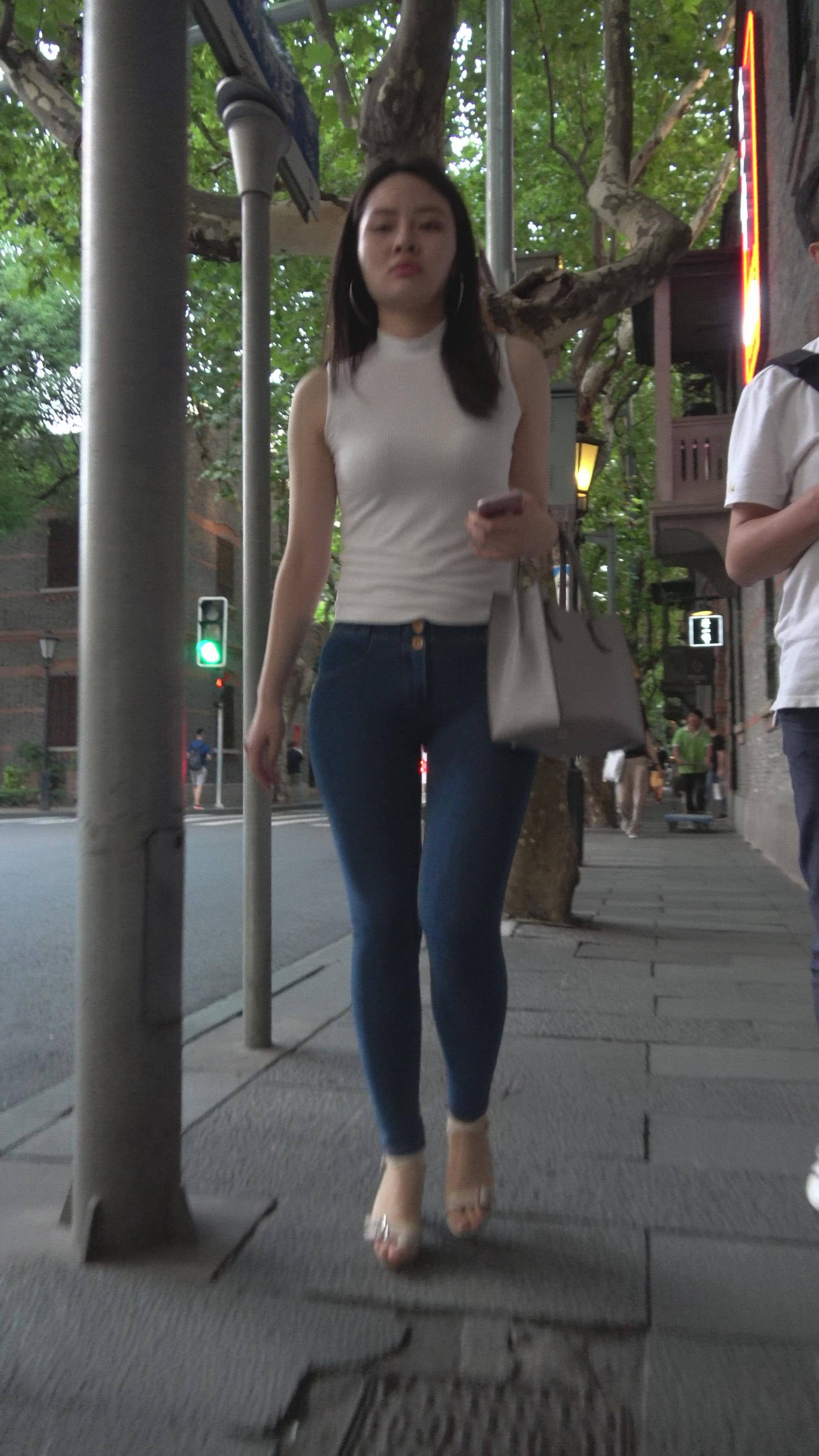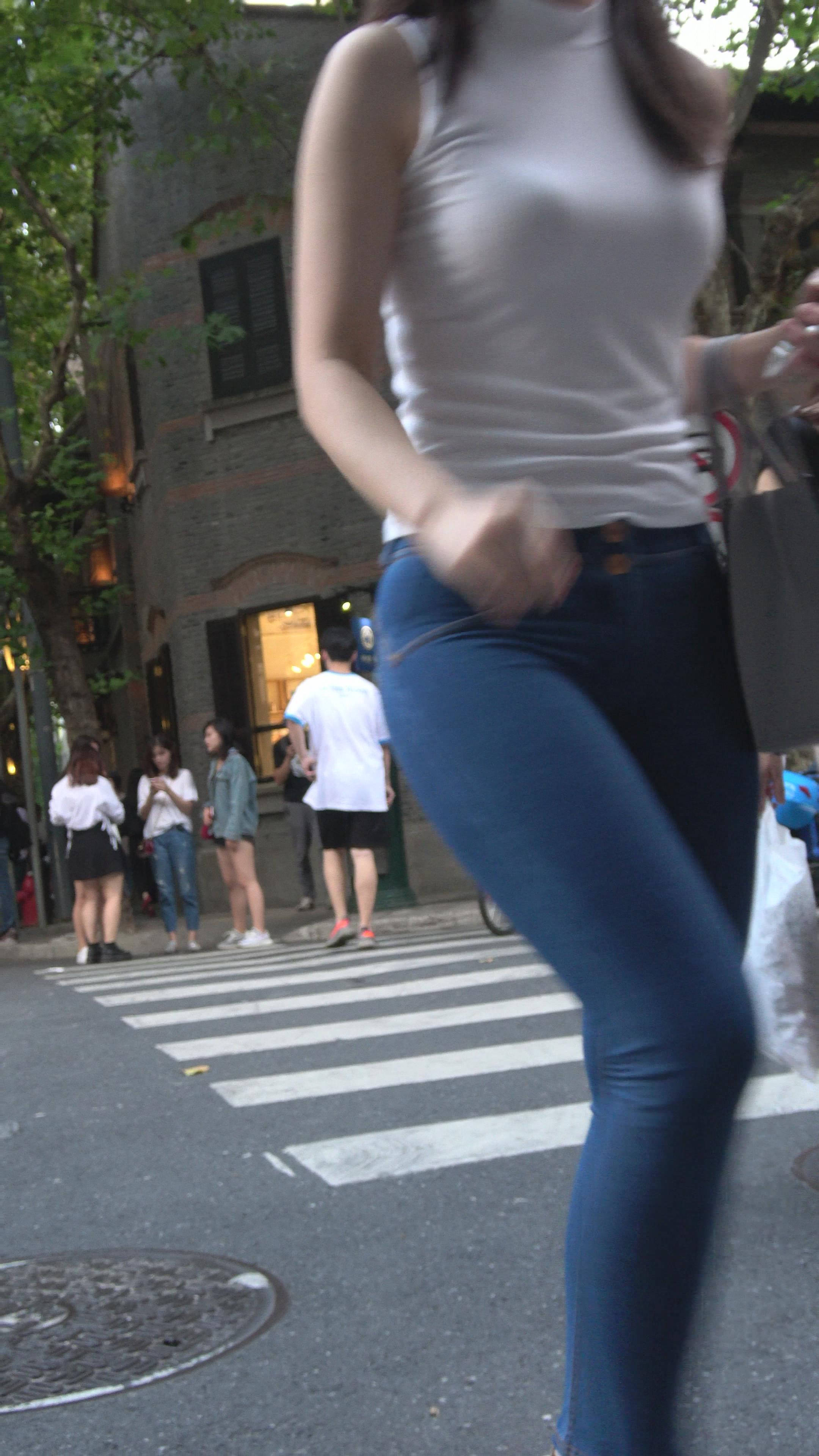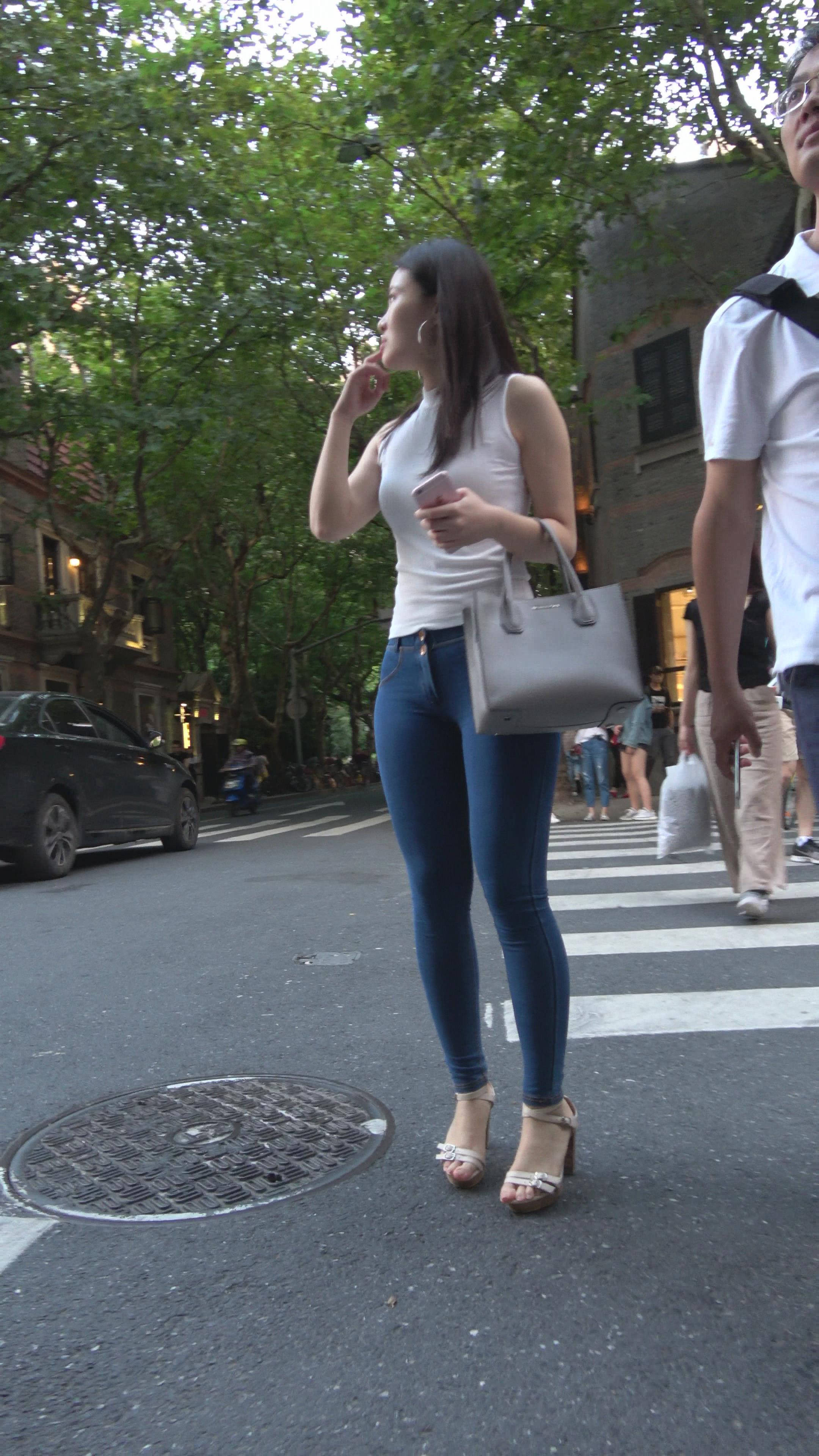 丰满白T恤极品紧身牛仔裤性感美女 编号7476