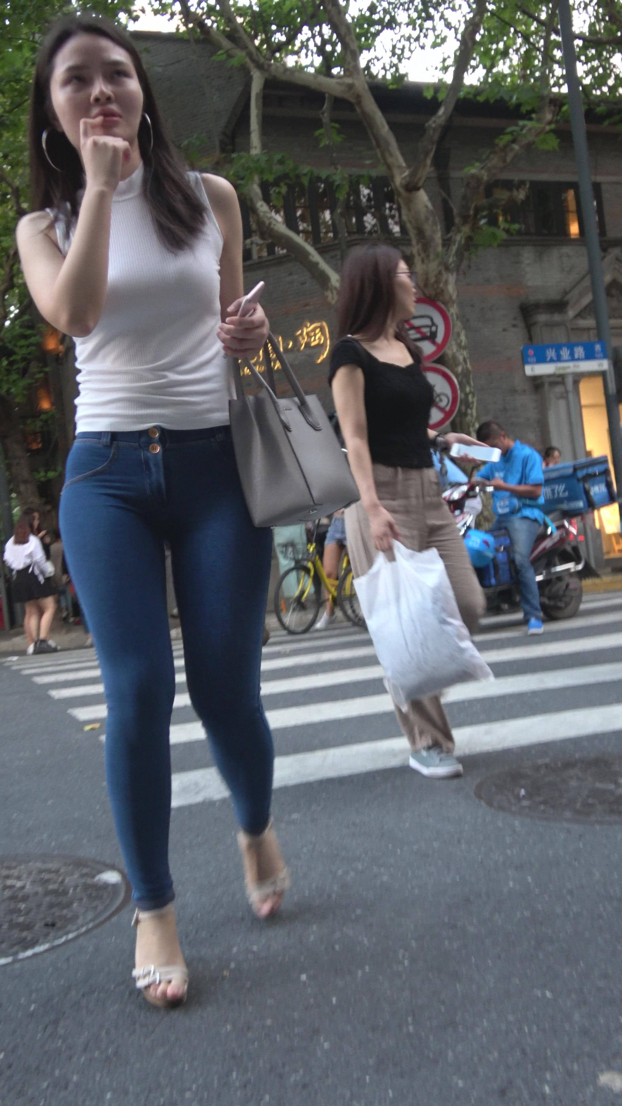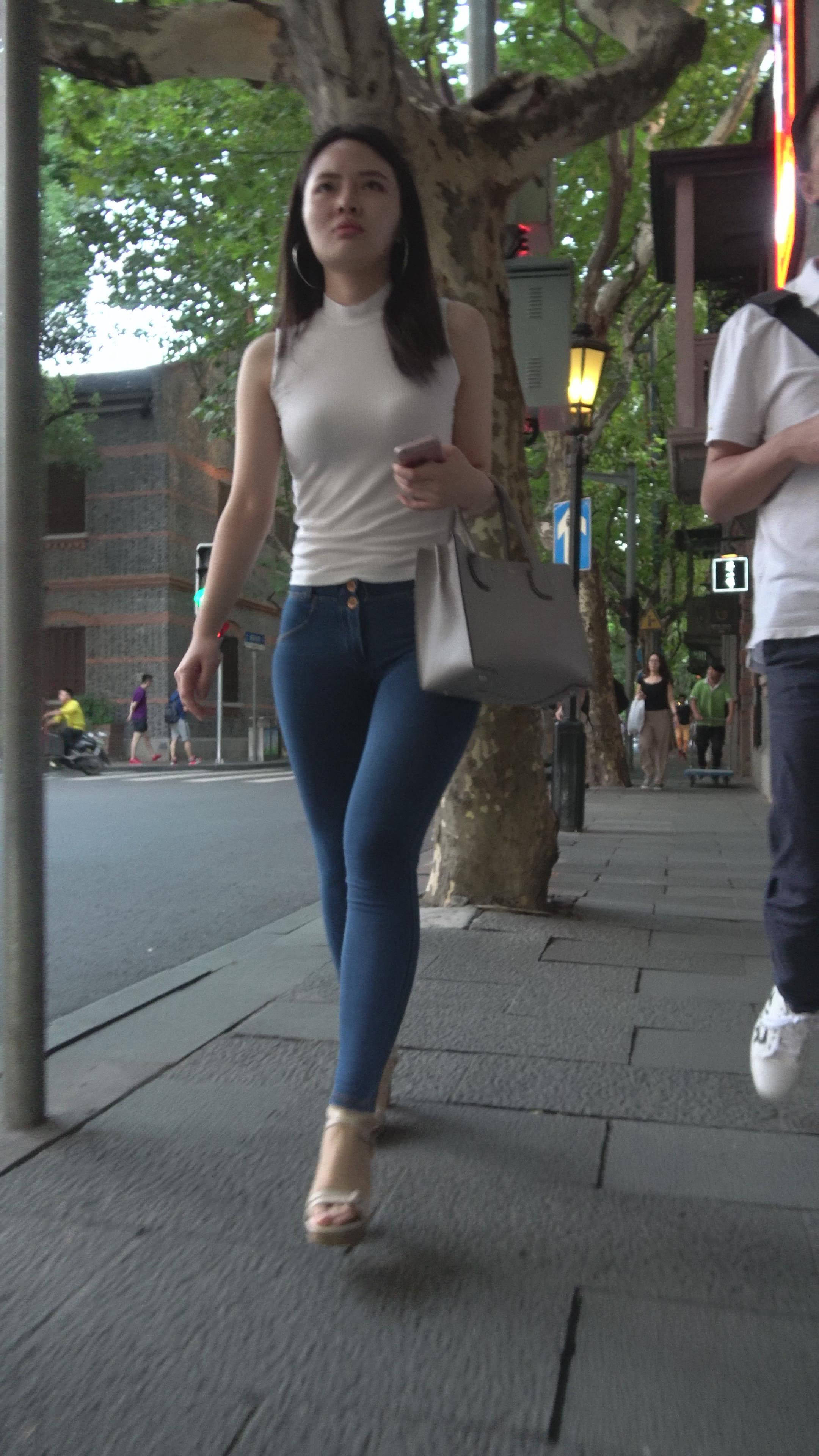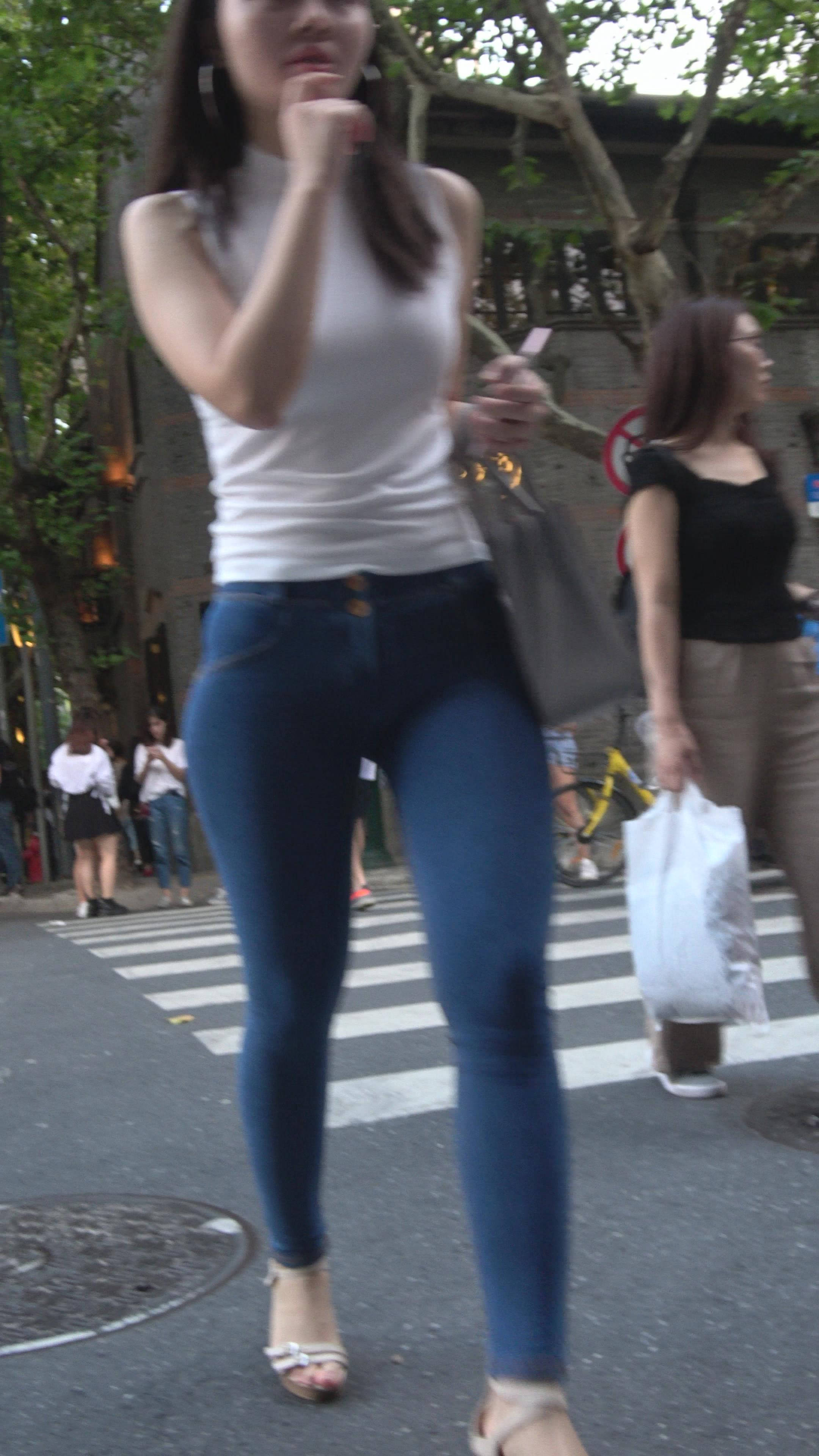 丰满白T恤极品紧身牛仔裤性感美女 编号7476
