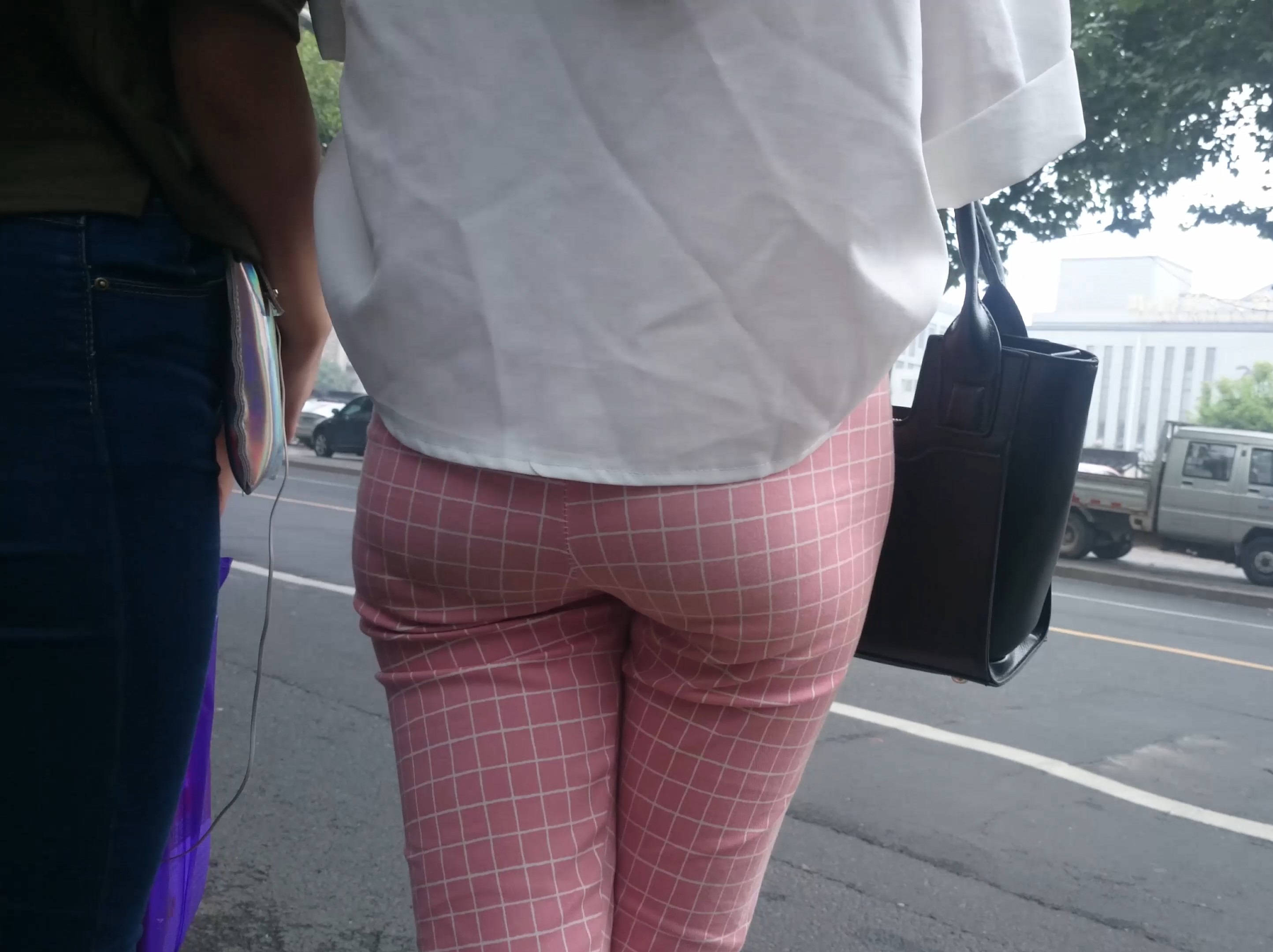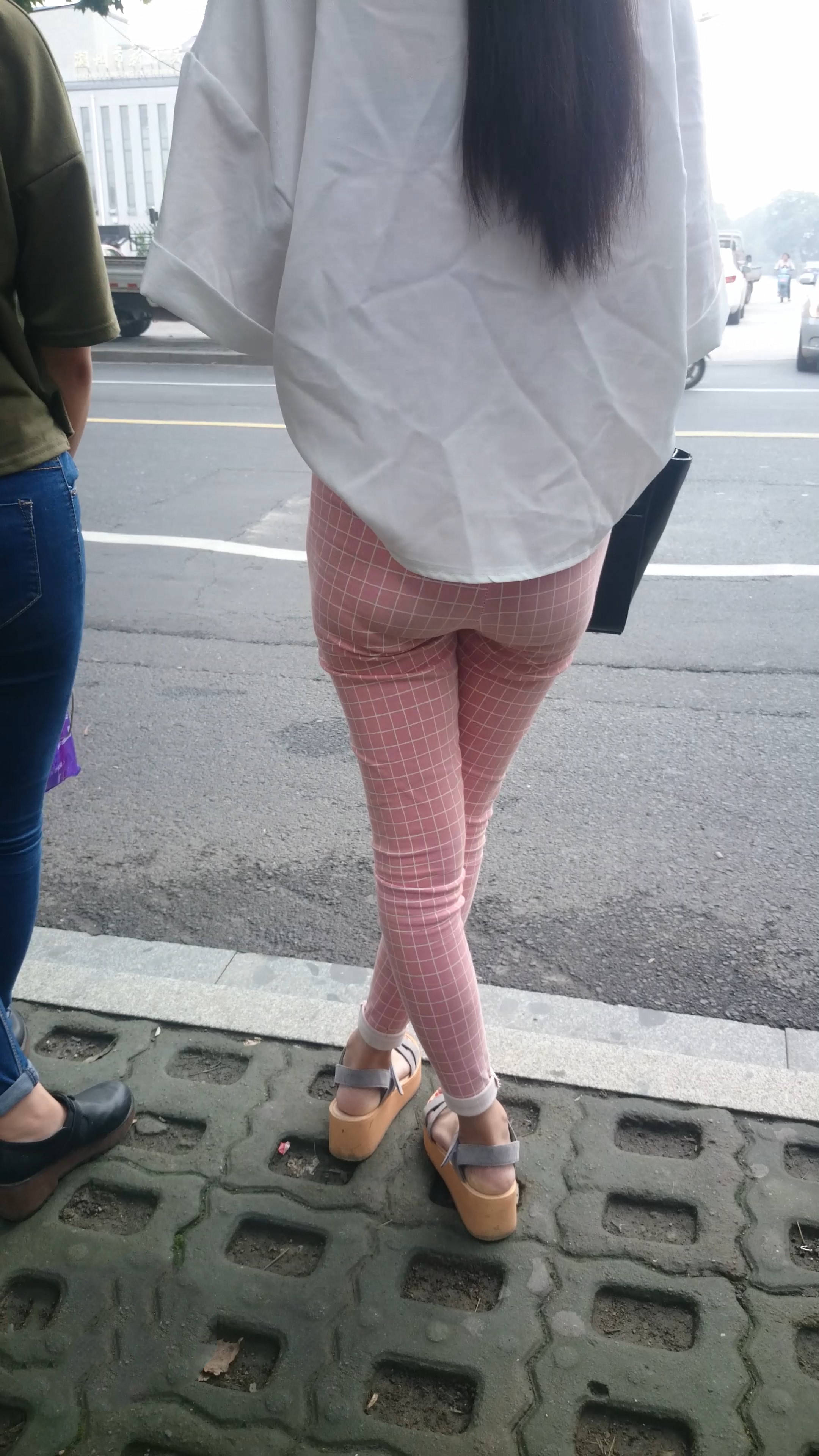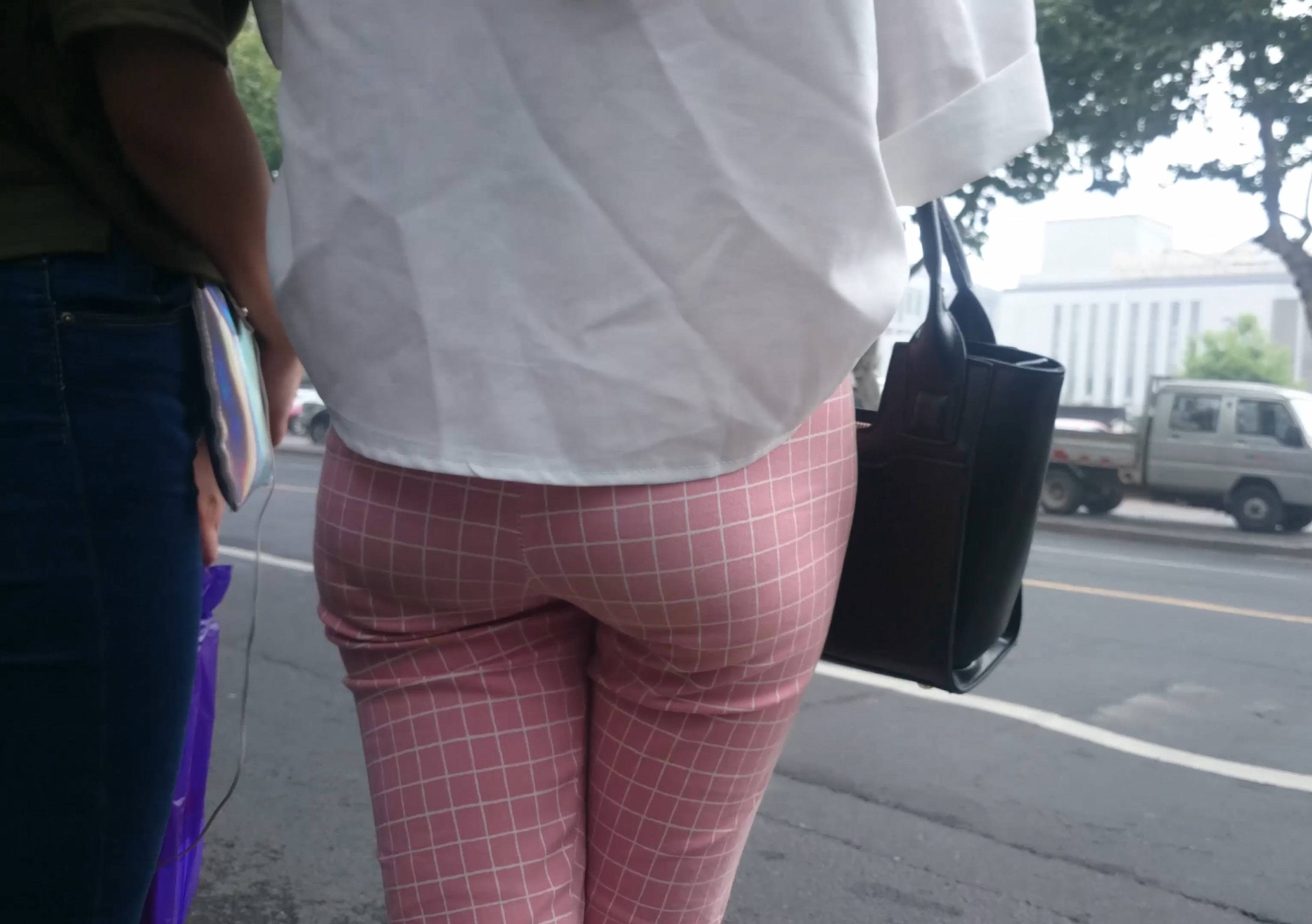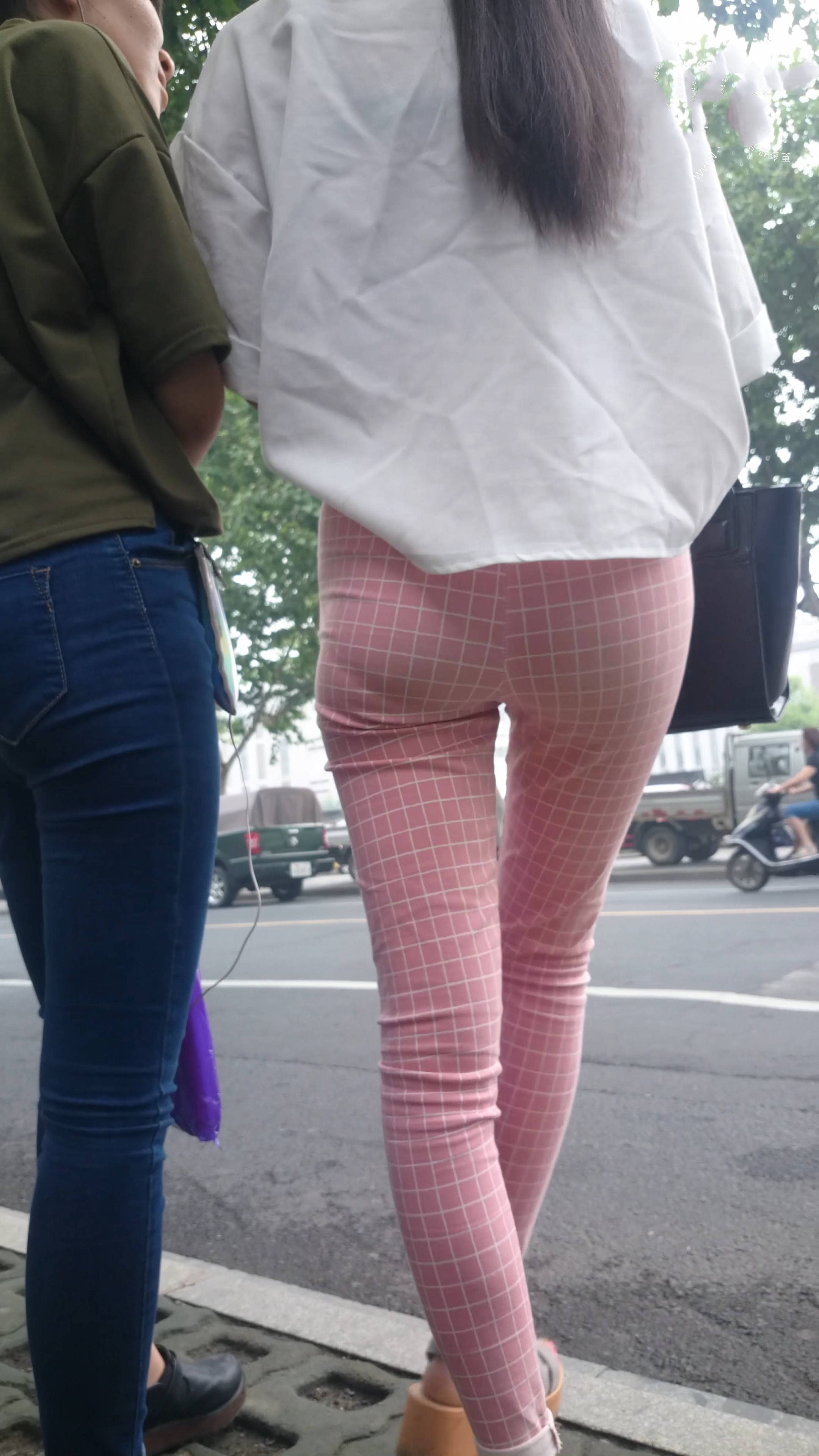 4k-街拍路边等车的粉色格子裤美女 编号7602