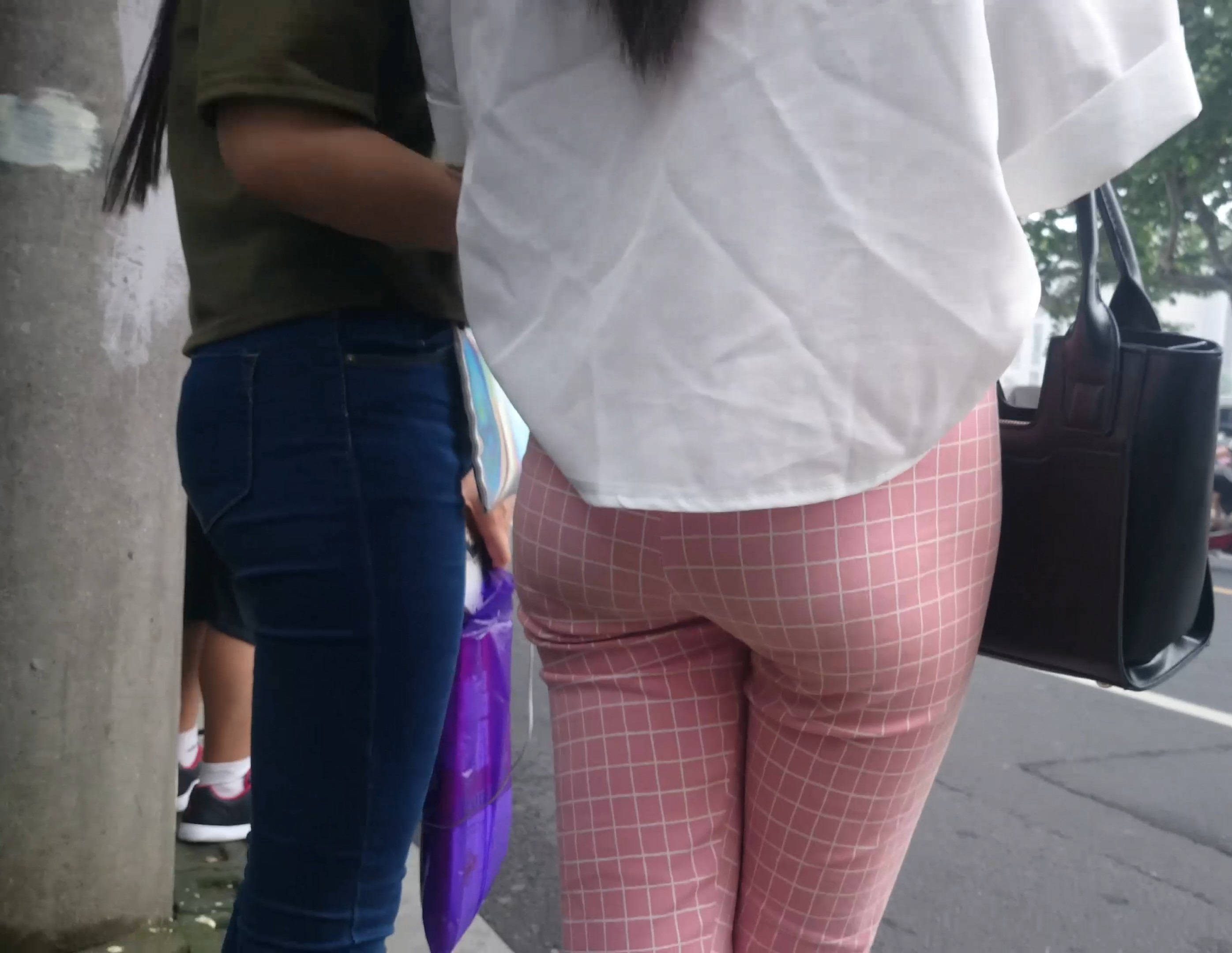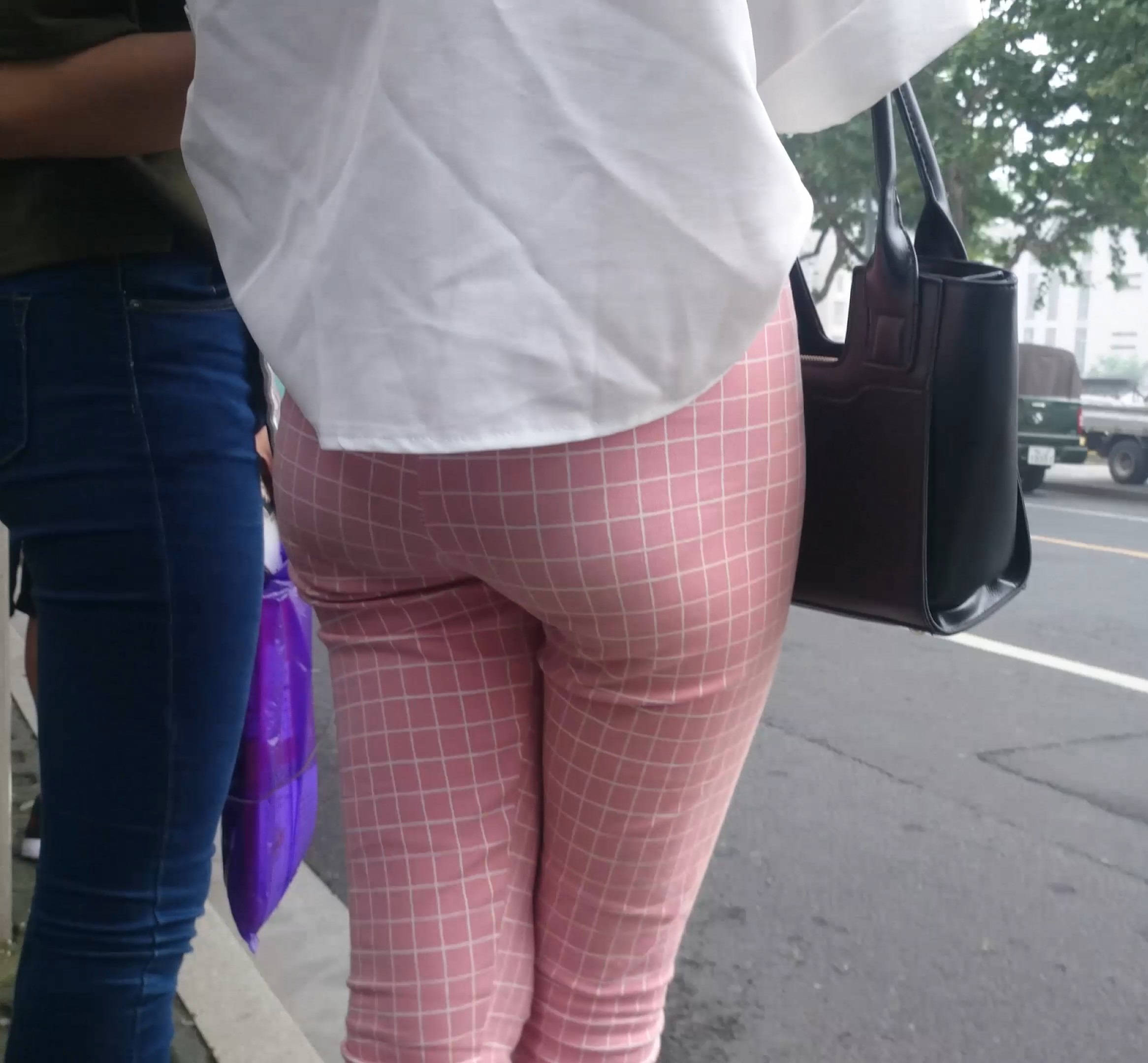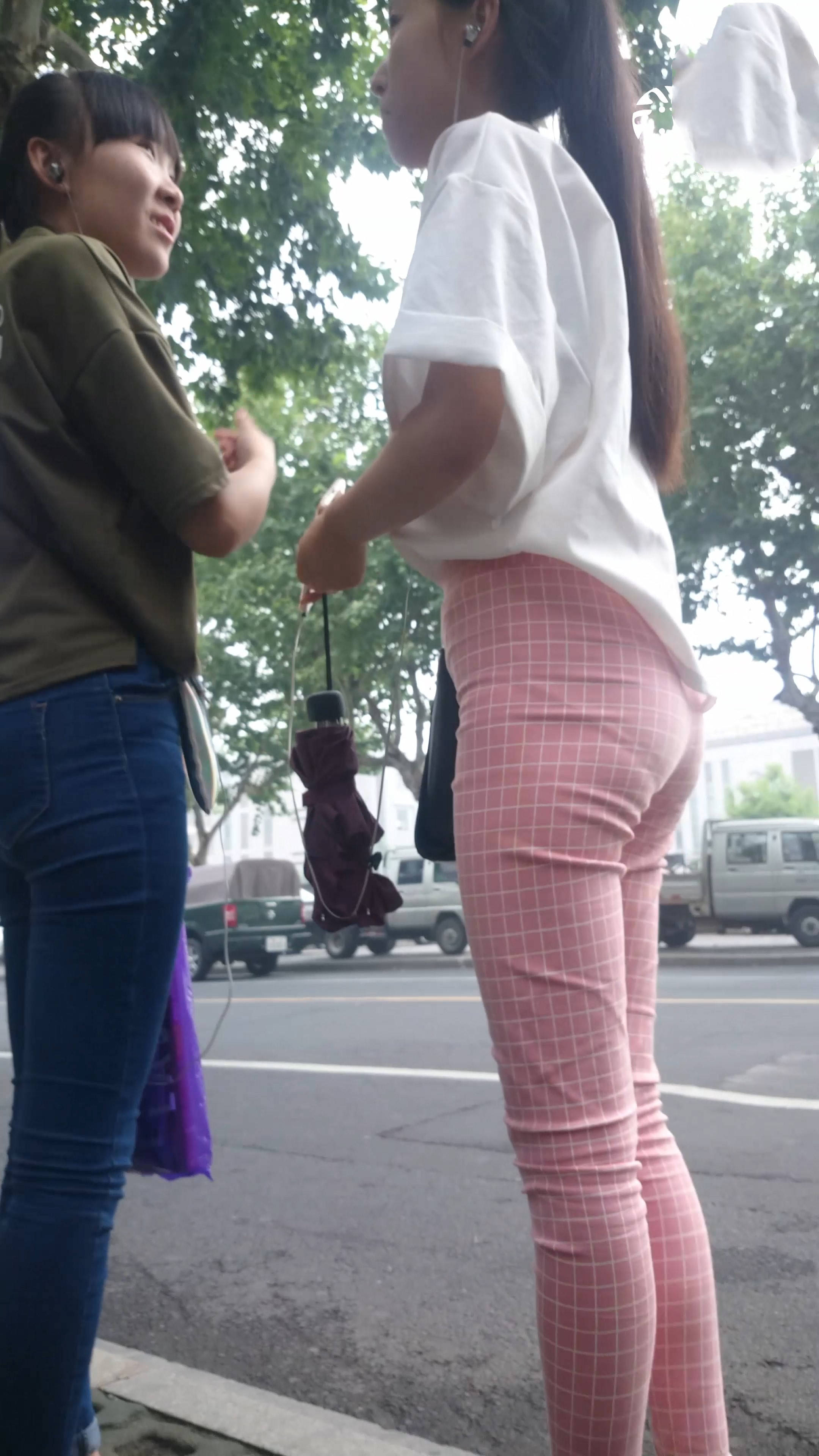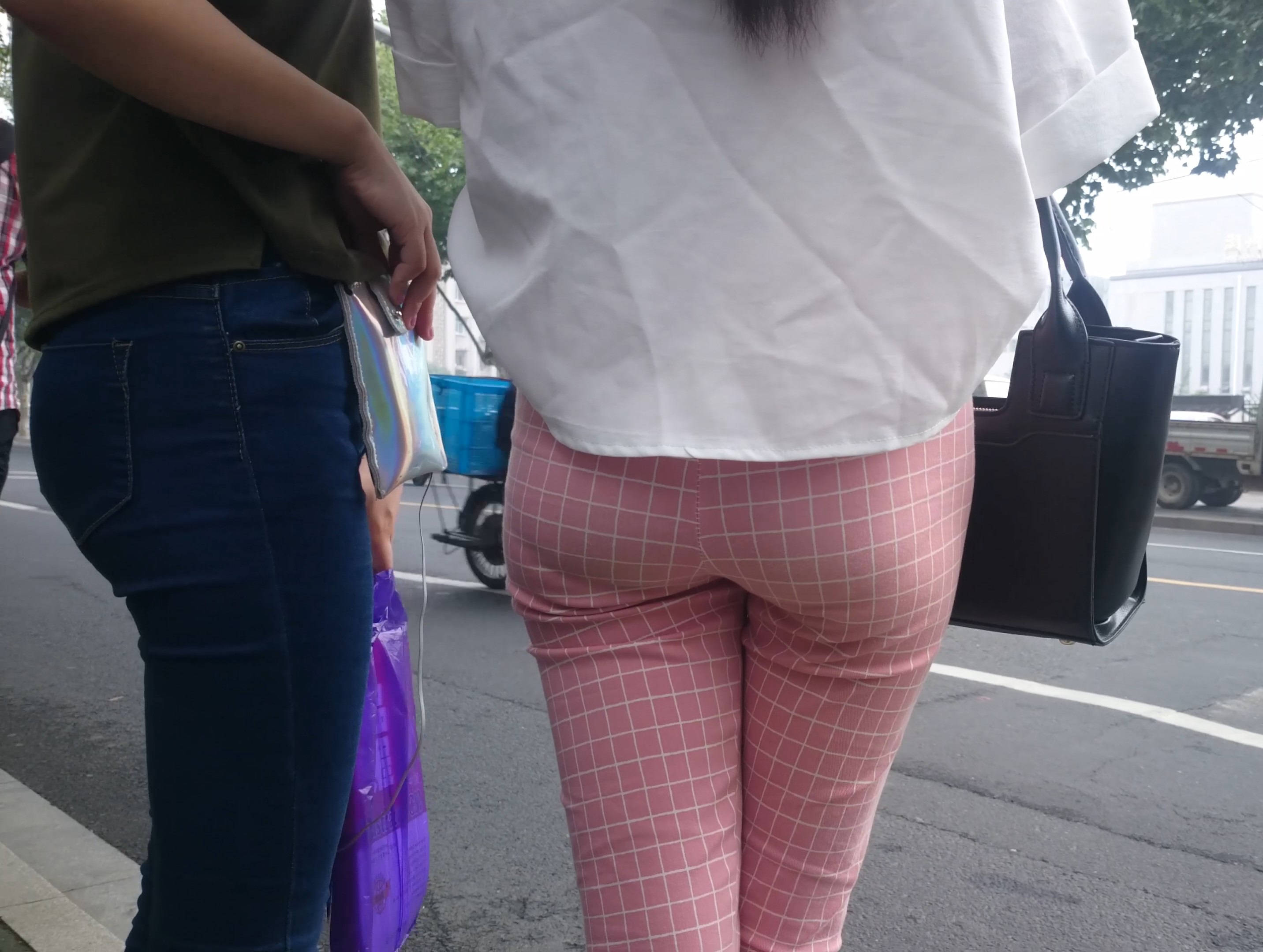 4k-街拍路边等车的粉色格子裤美女 编号7602