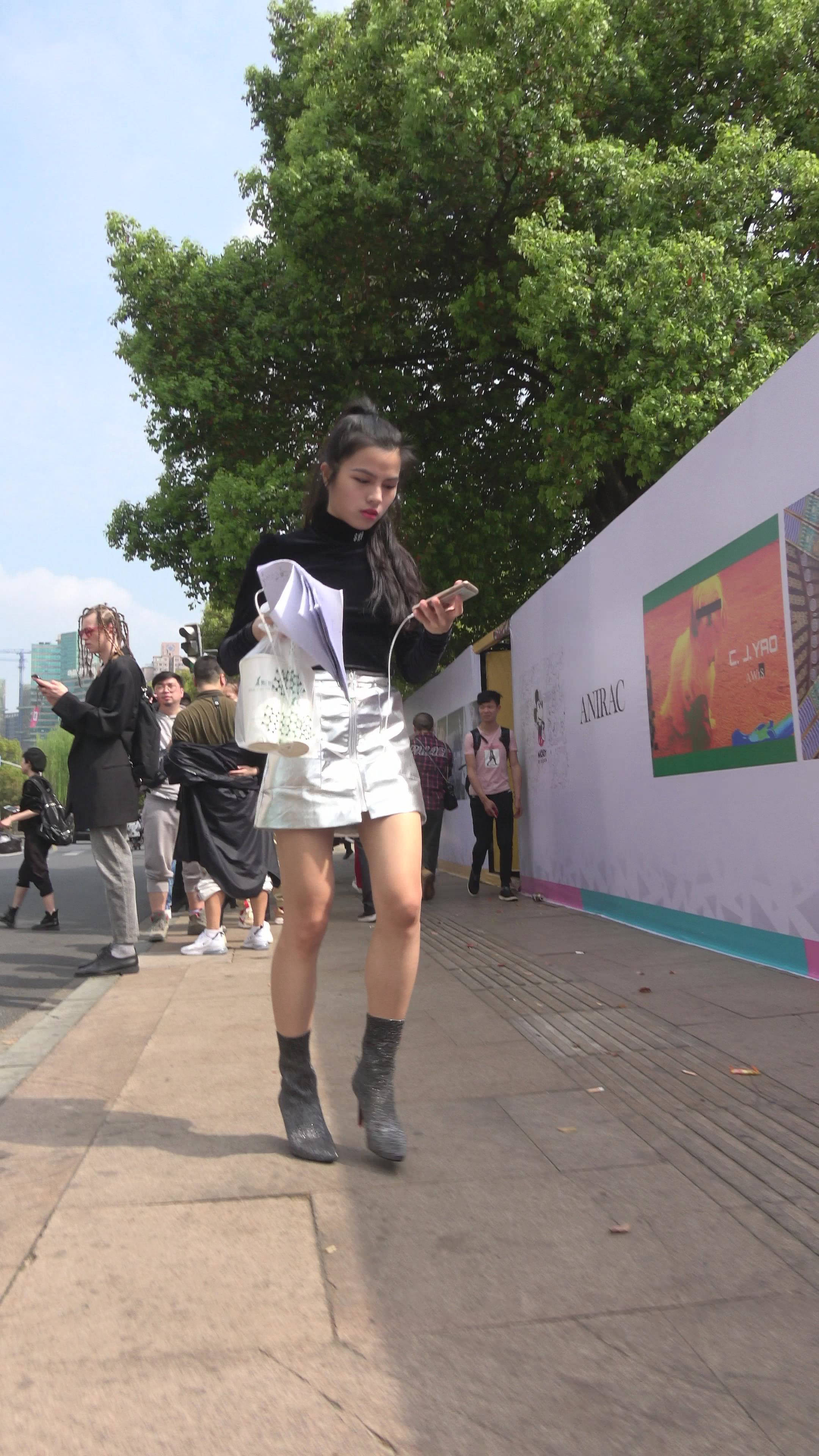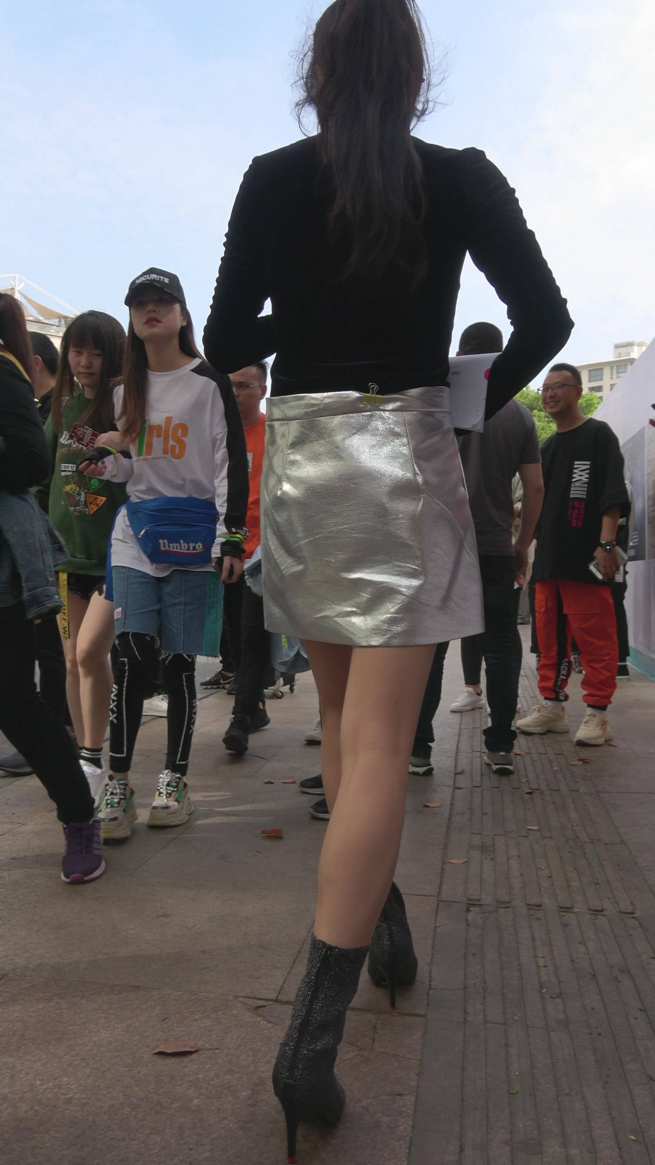 4K - 银白色皮裙黑色毛衣街拍肉丝气质女神姐姐 编号7716