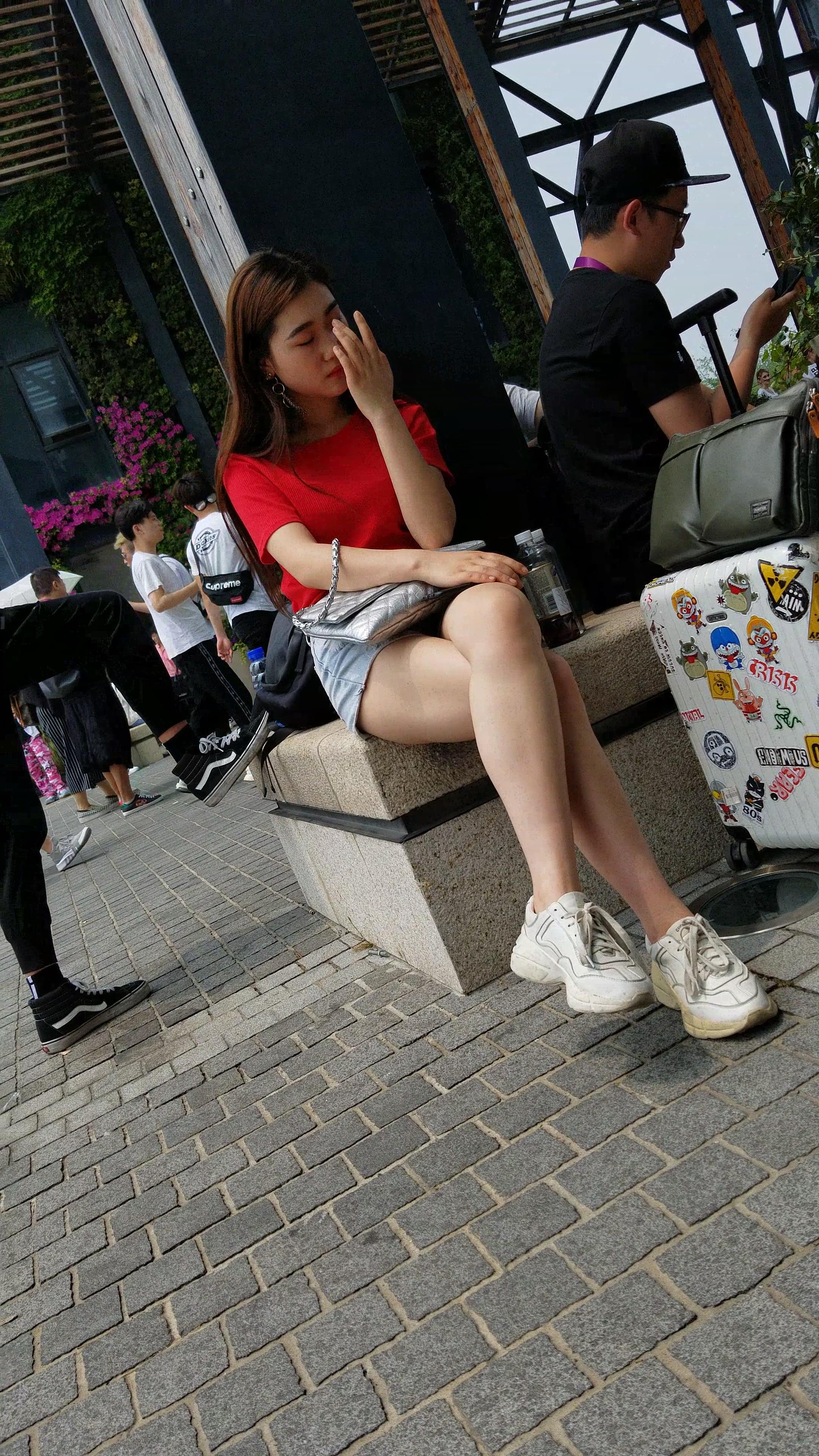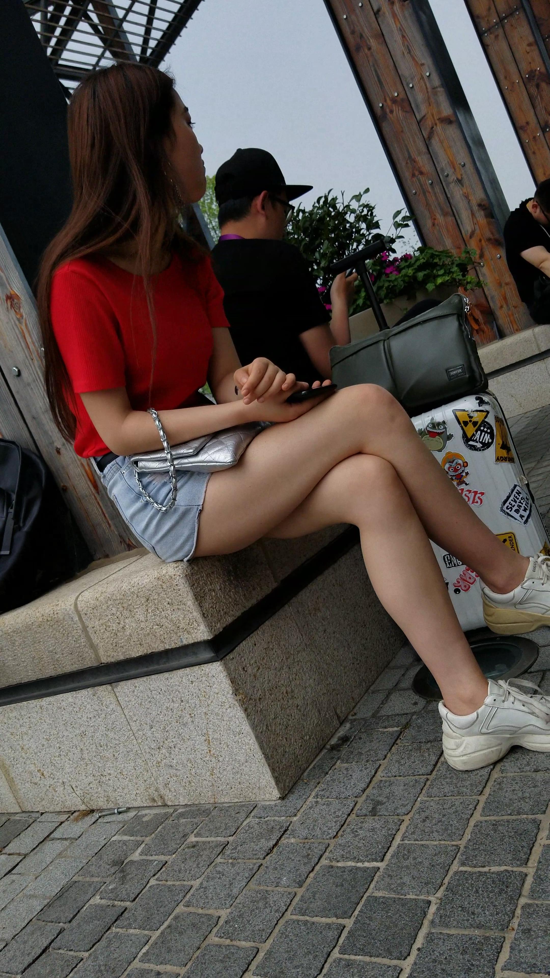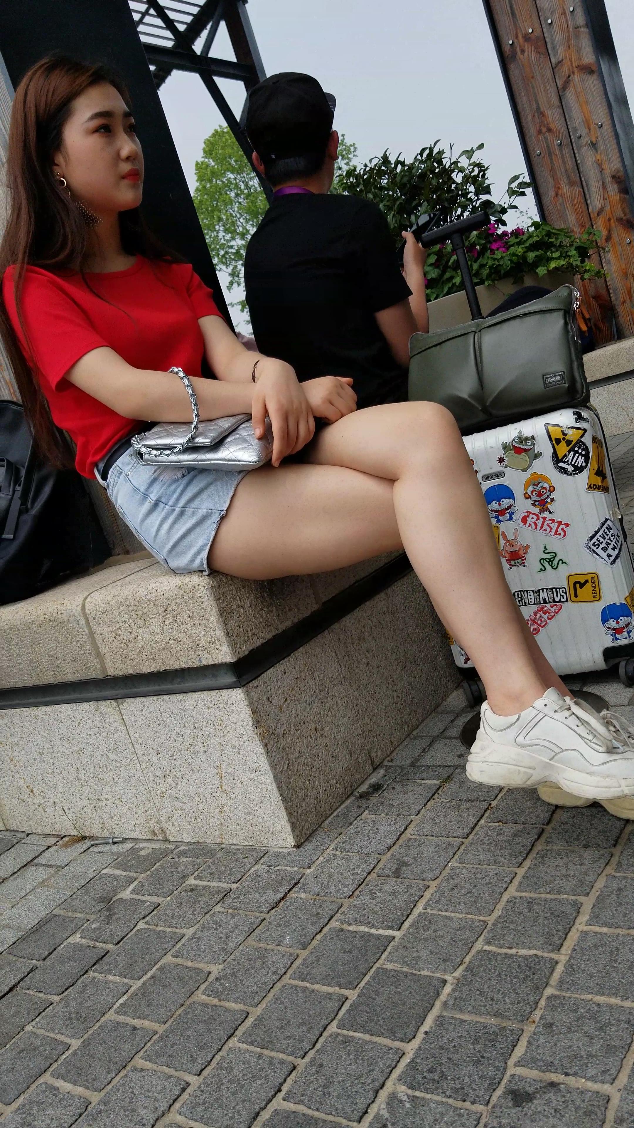 红T恤牛仔热裤白皙美腿小姐姐美若天仙 编号5191