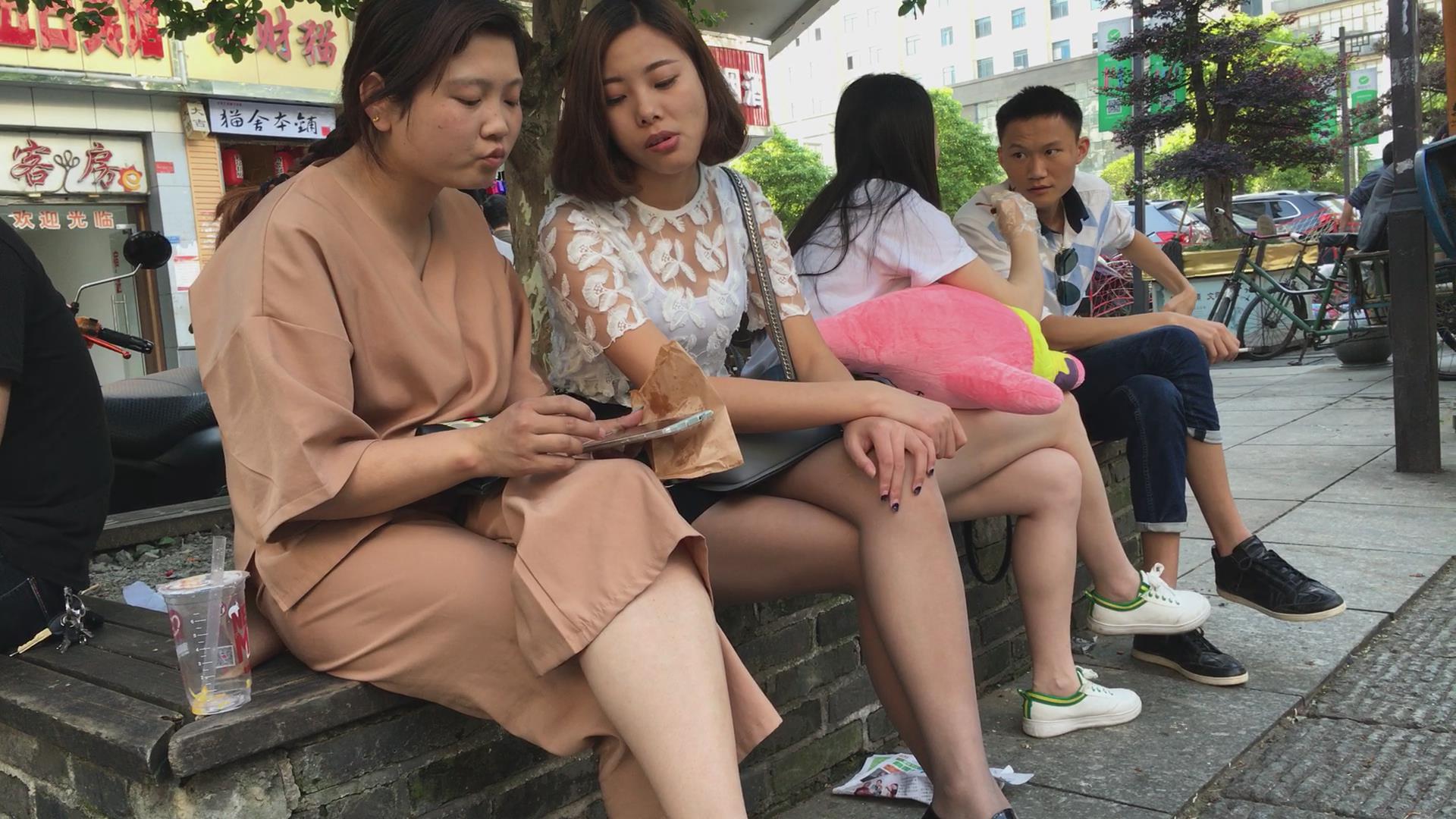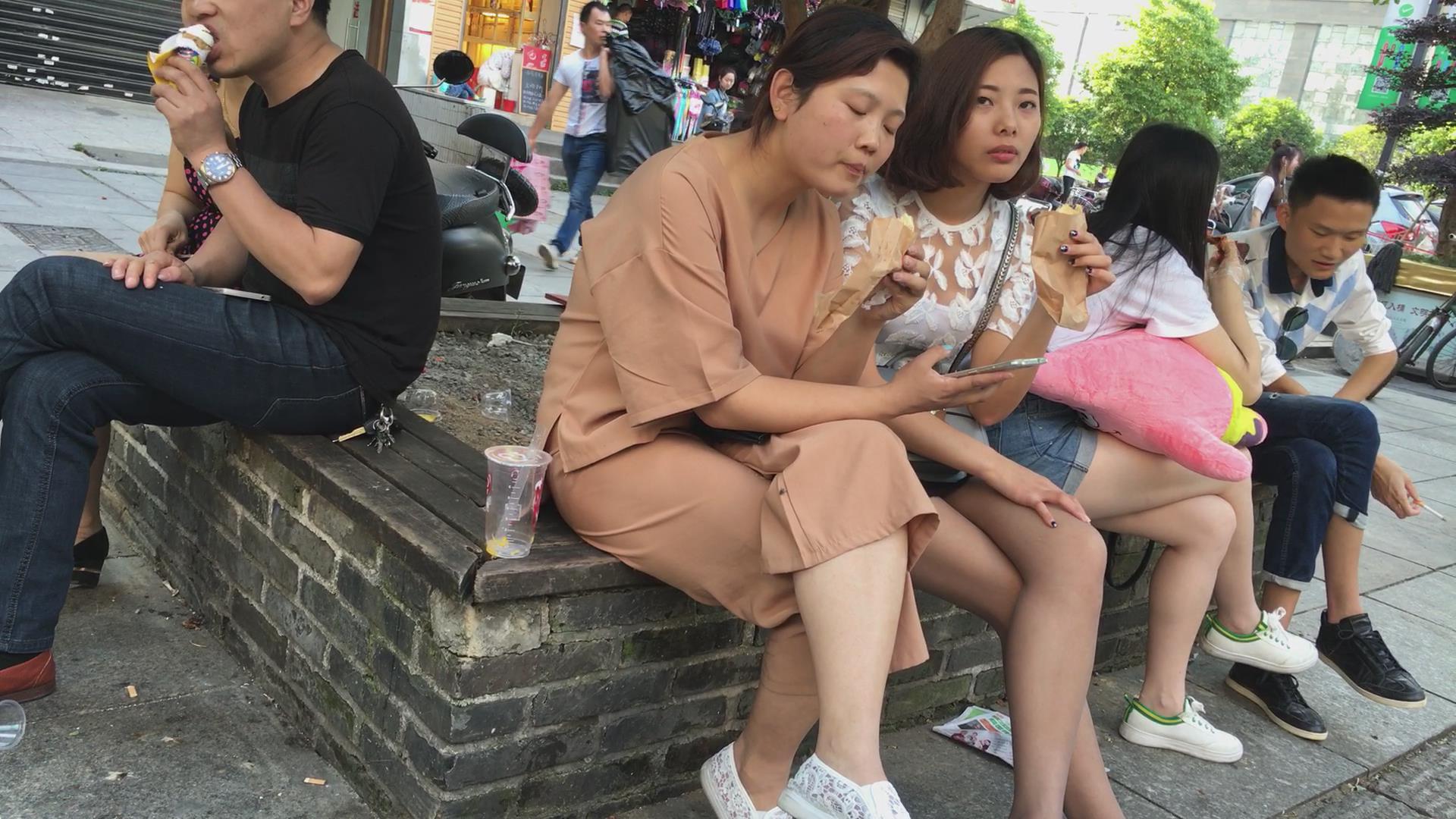 广场边花坛坐着跟闺蜜吃东西聊天的妹子 编号5172