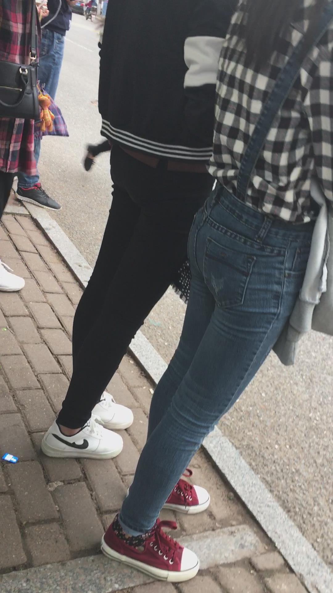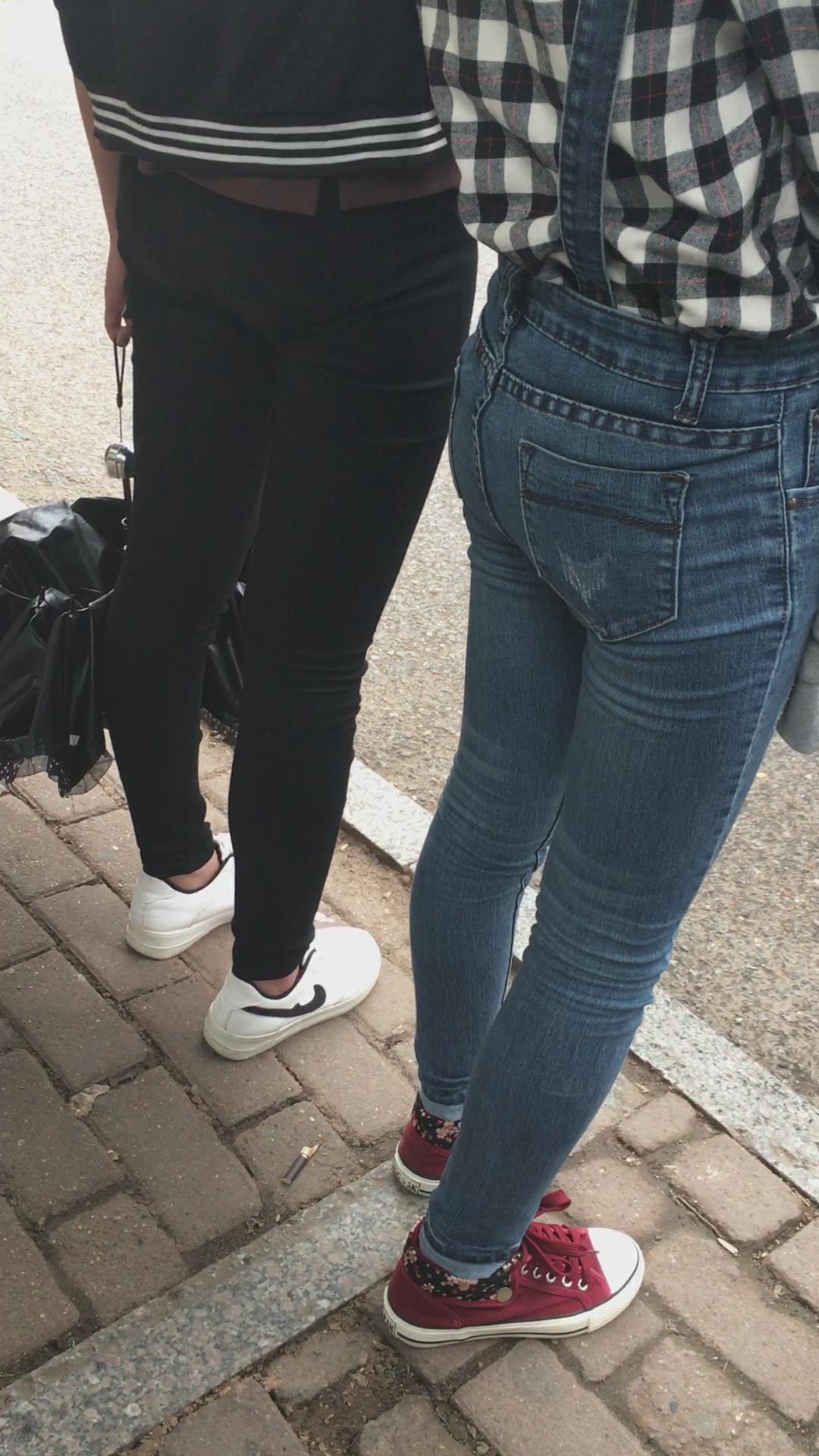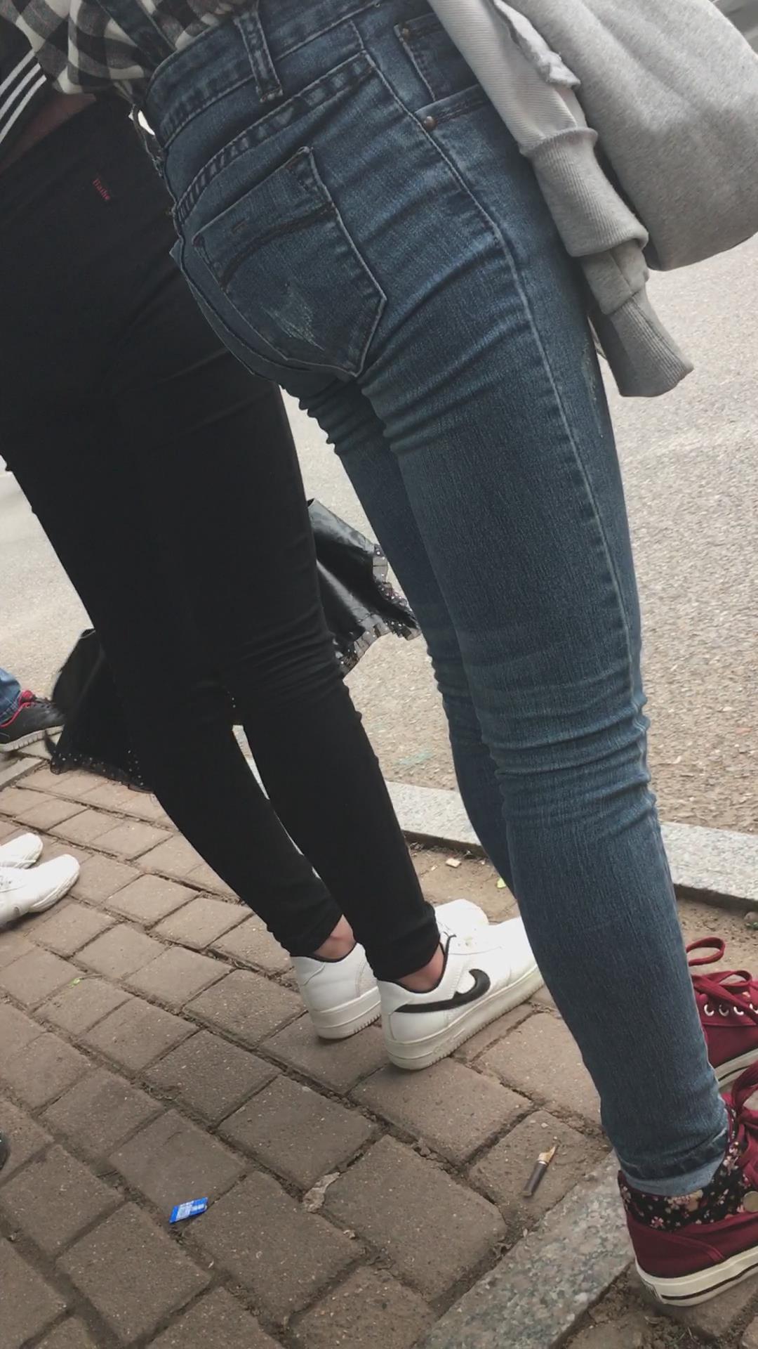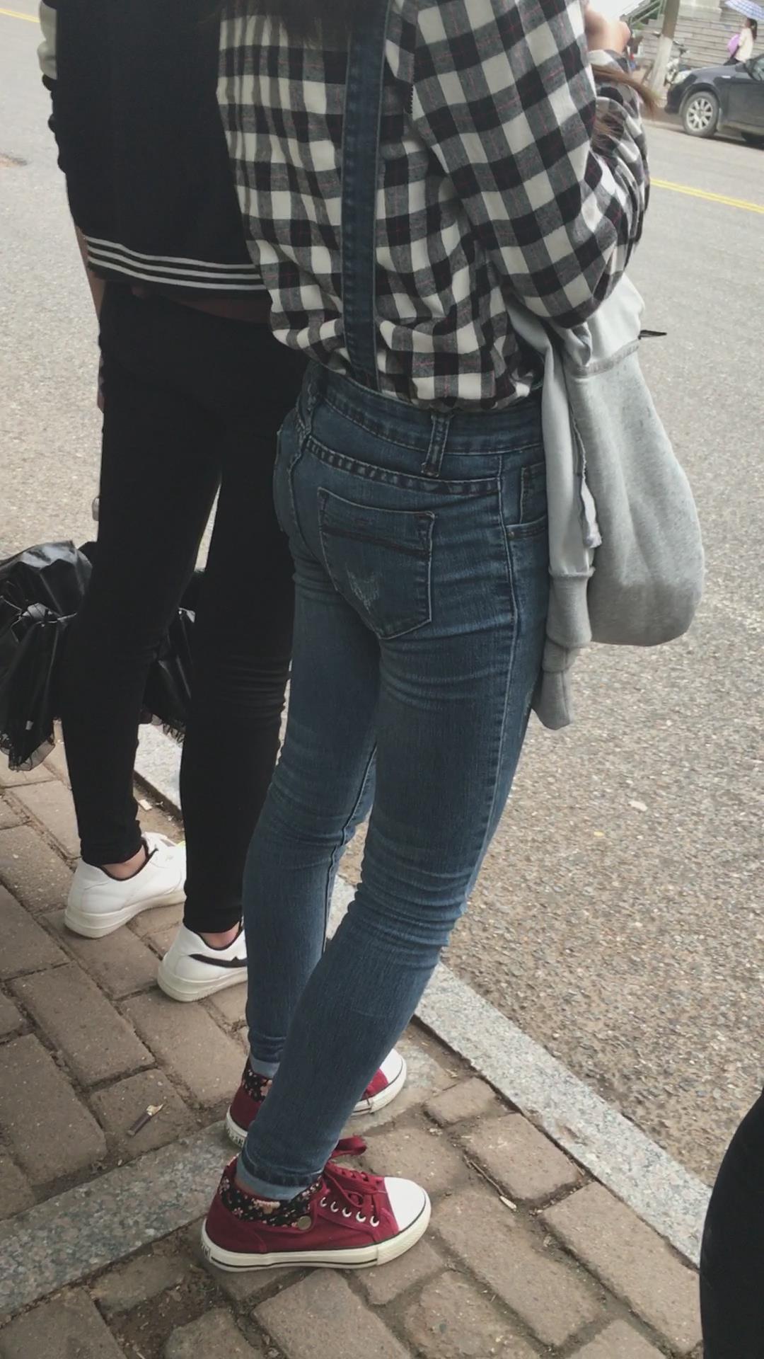 等公交车的格子衫紧身蓝牛街拍美女学生妹 编号5295