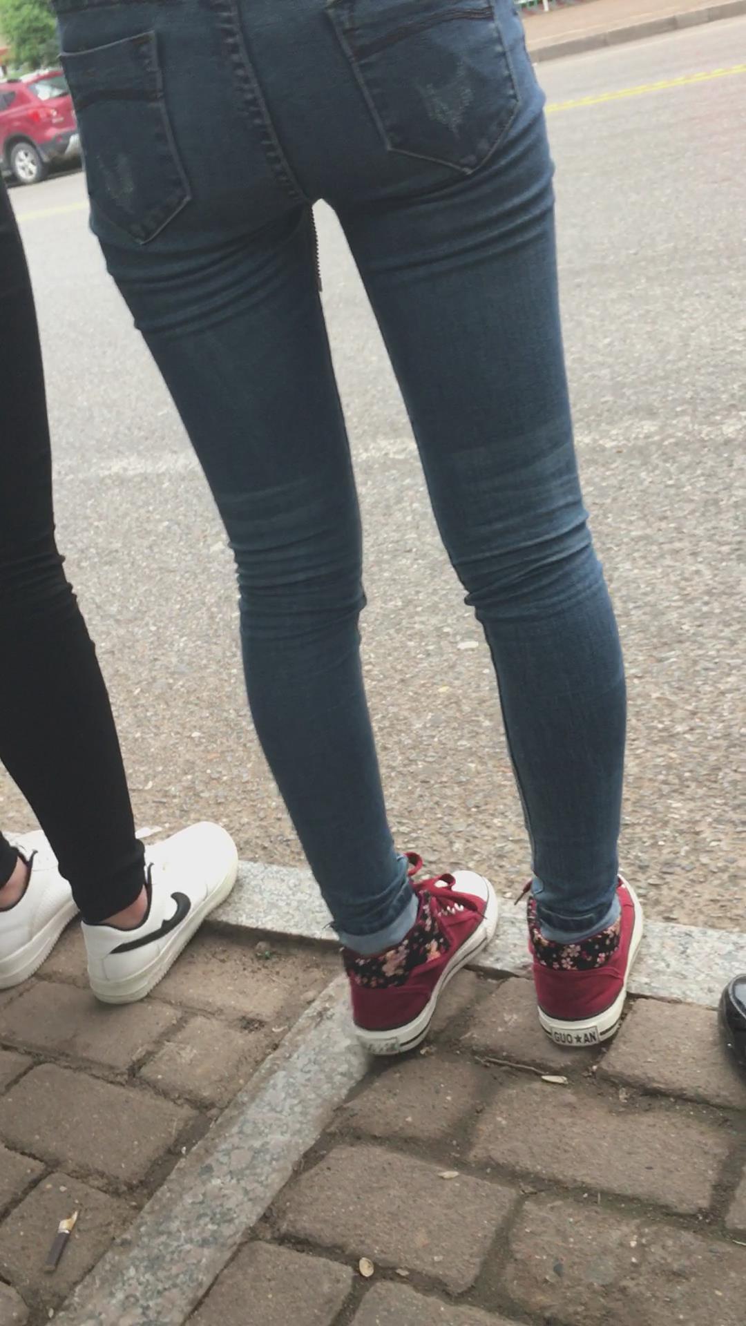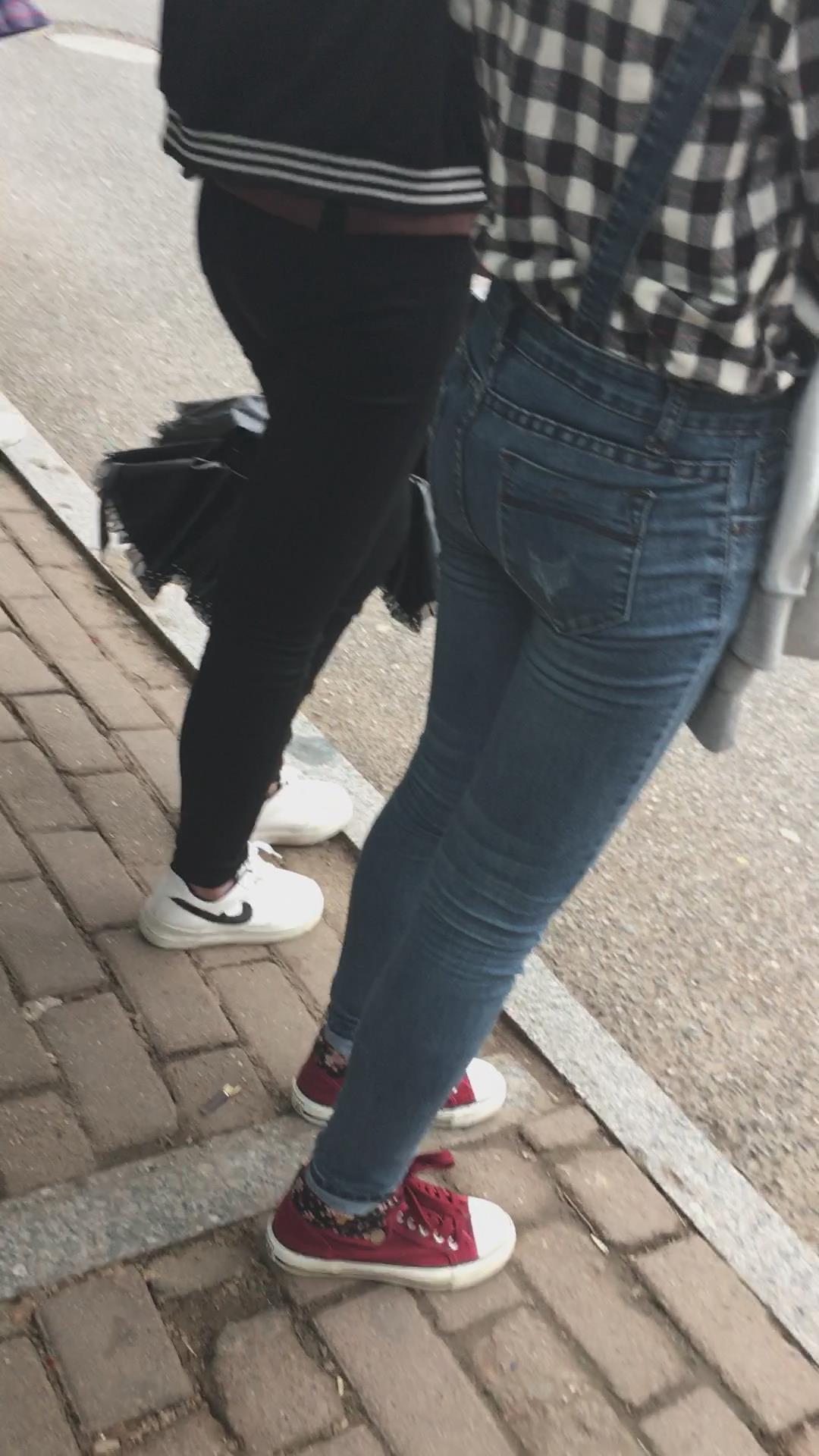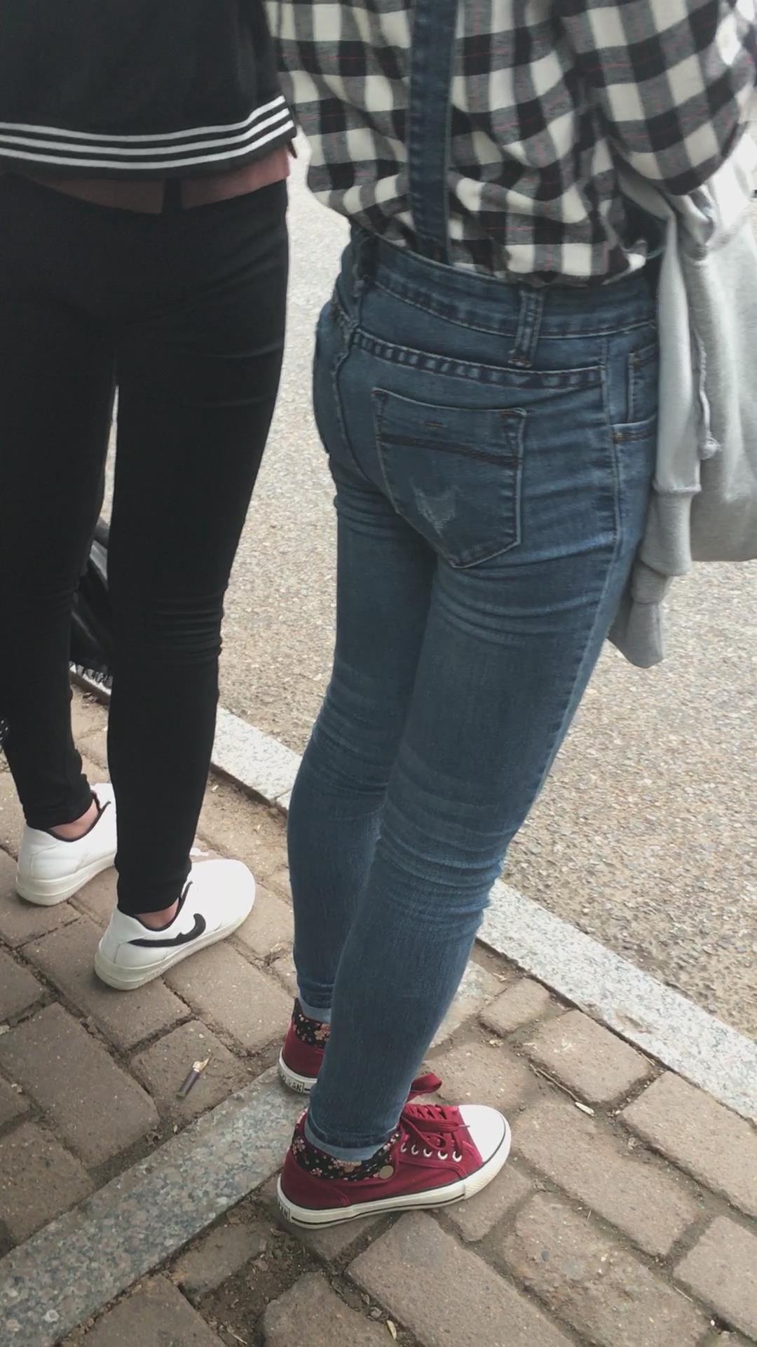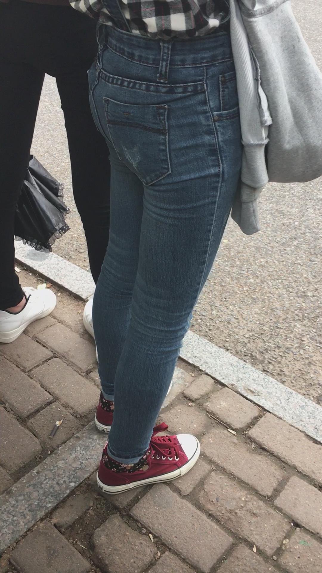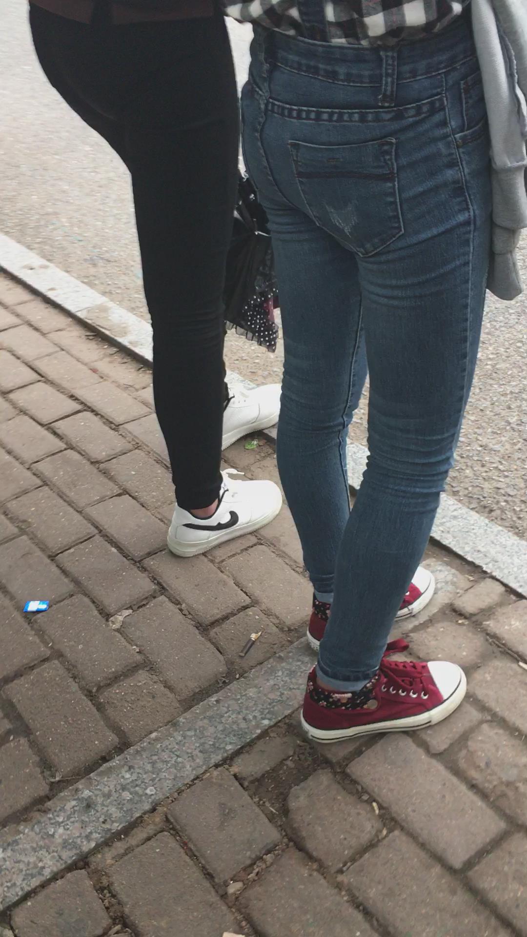 等公交车的格子衫紧身蓝牛街拍美女学生妹 编号5295