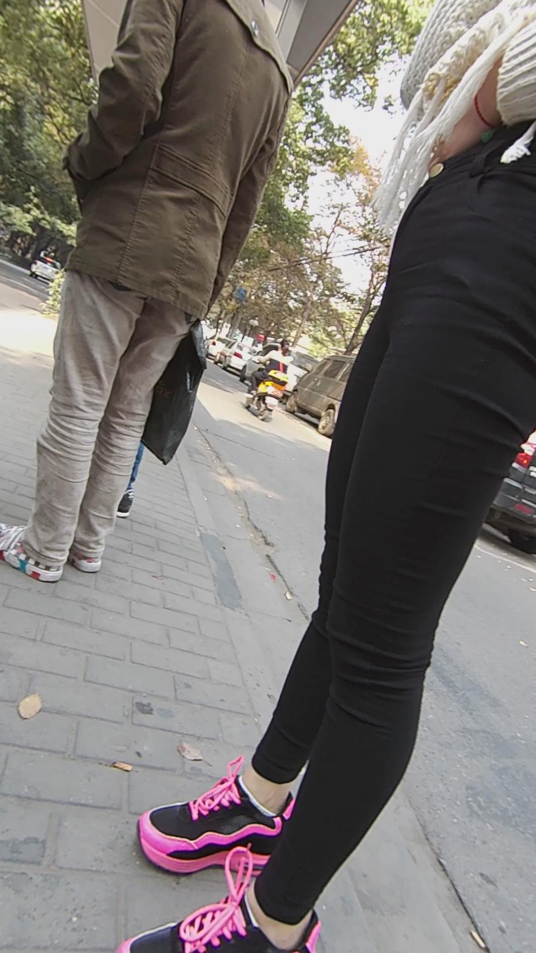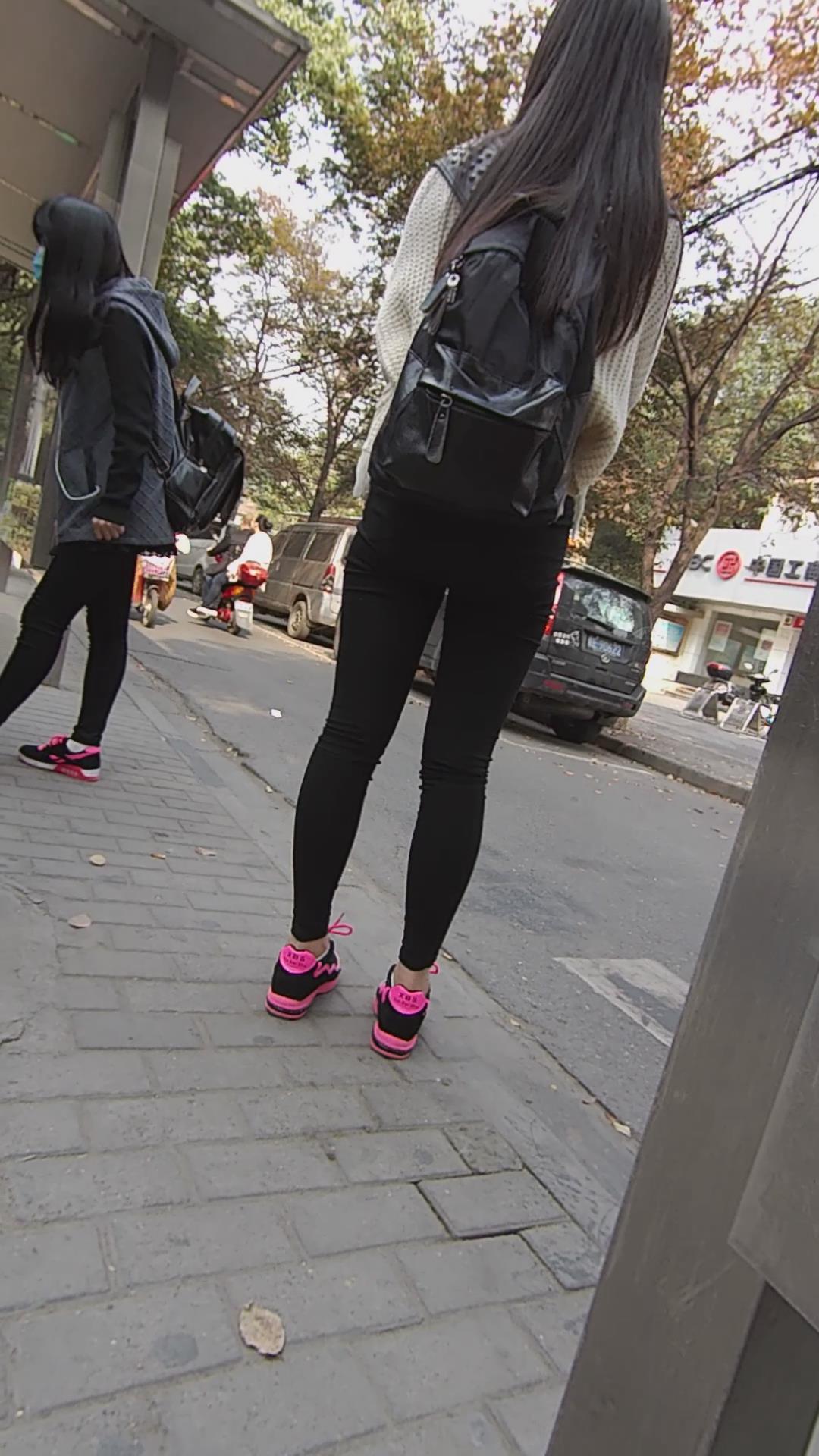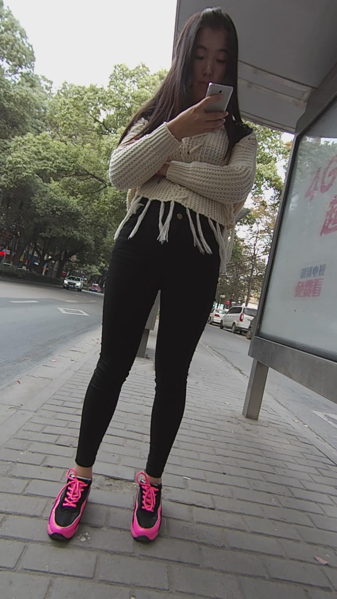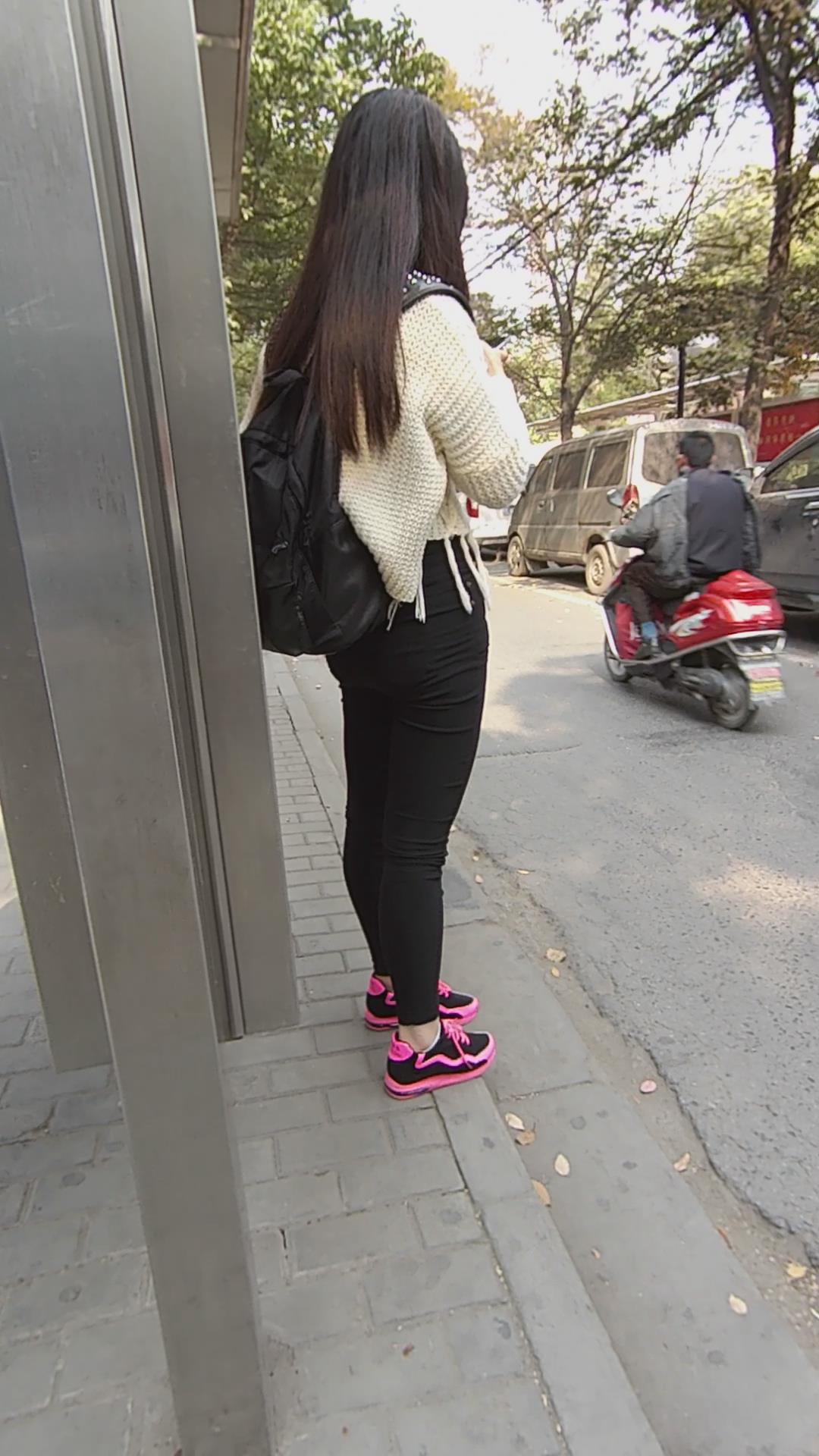 黑色紧身裤妹子公交站等车车 编号5305