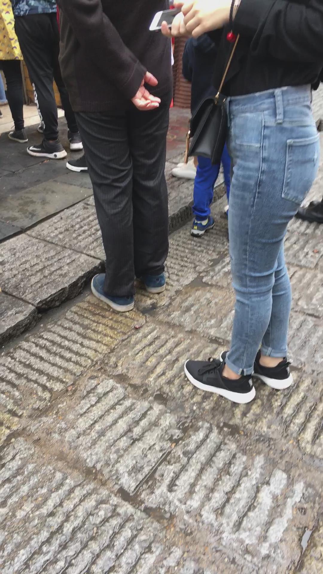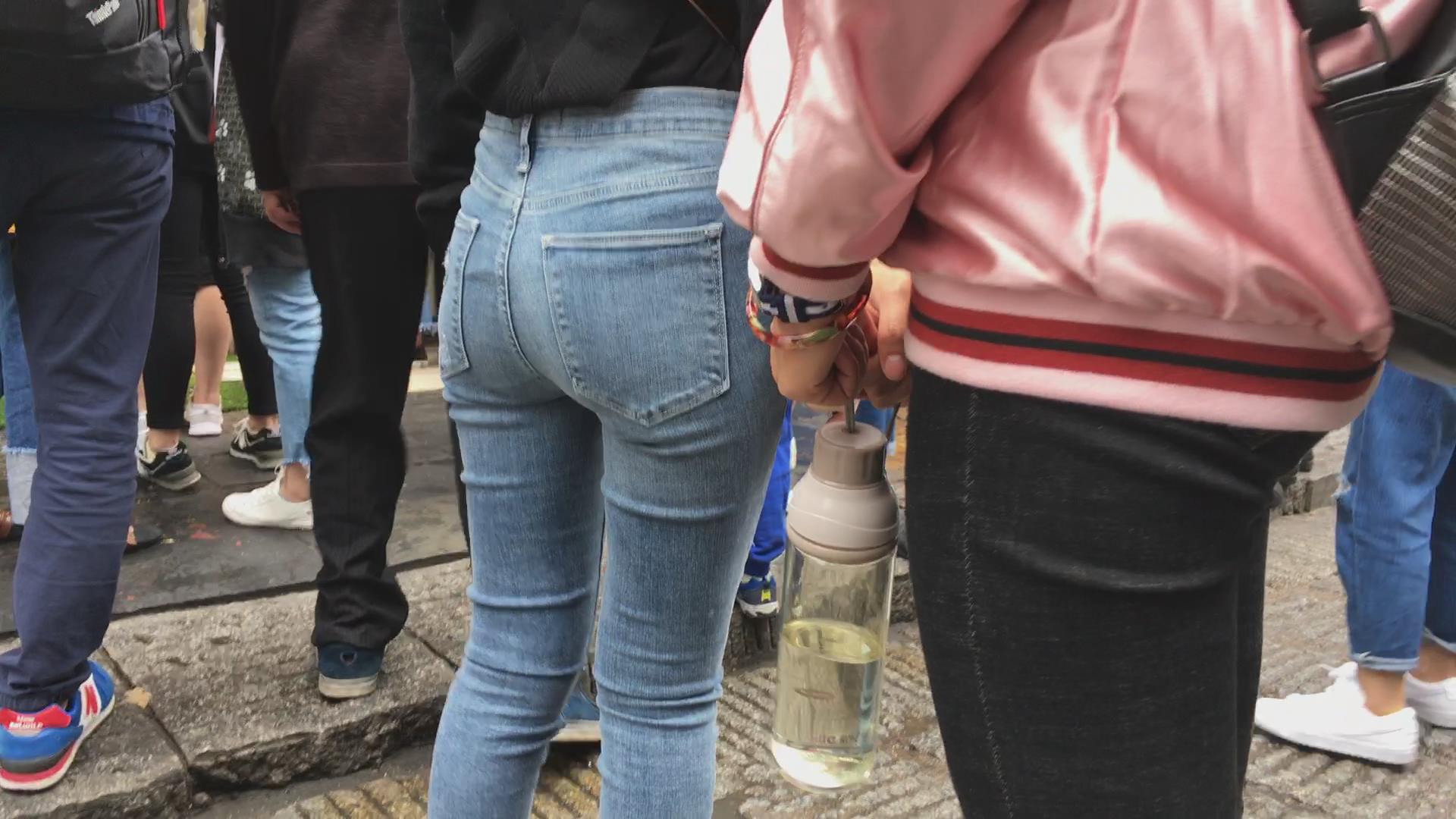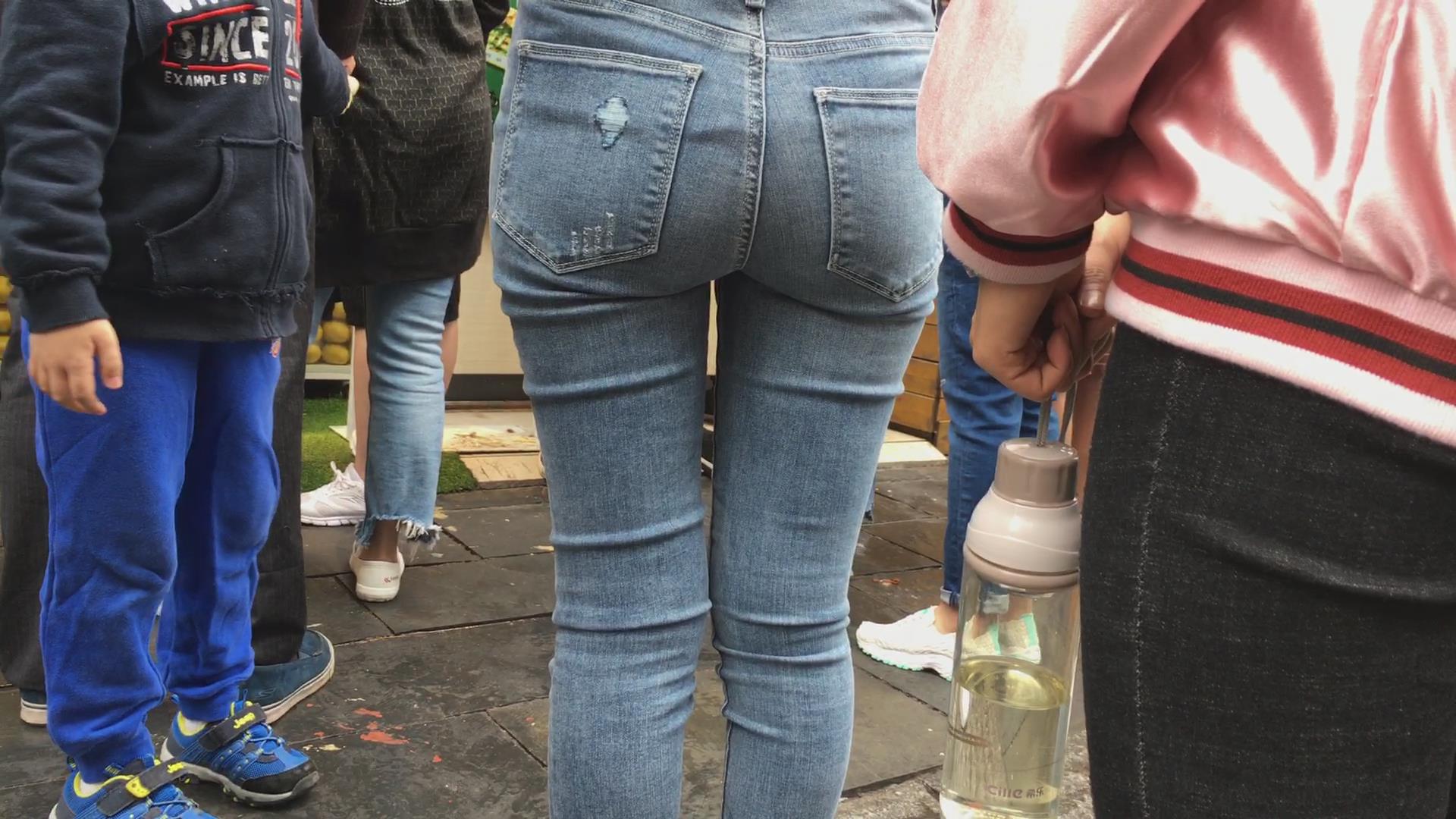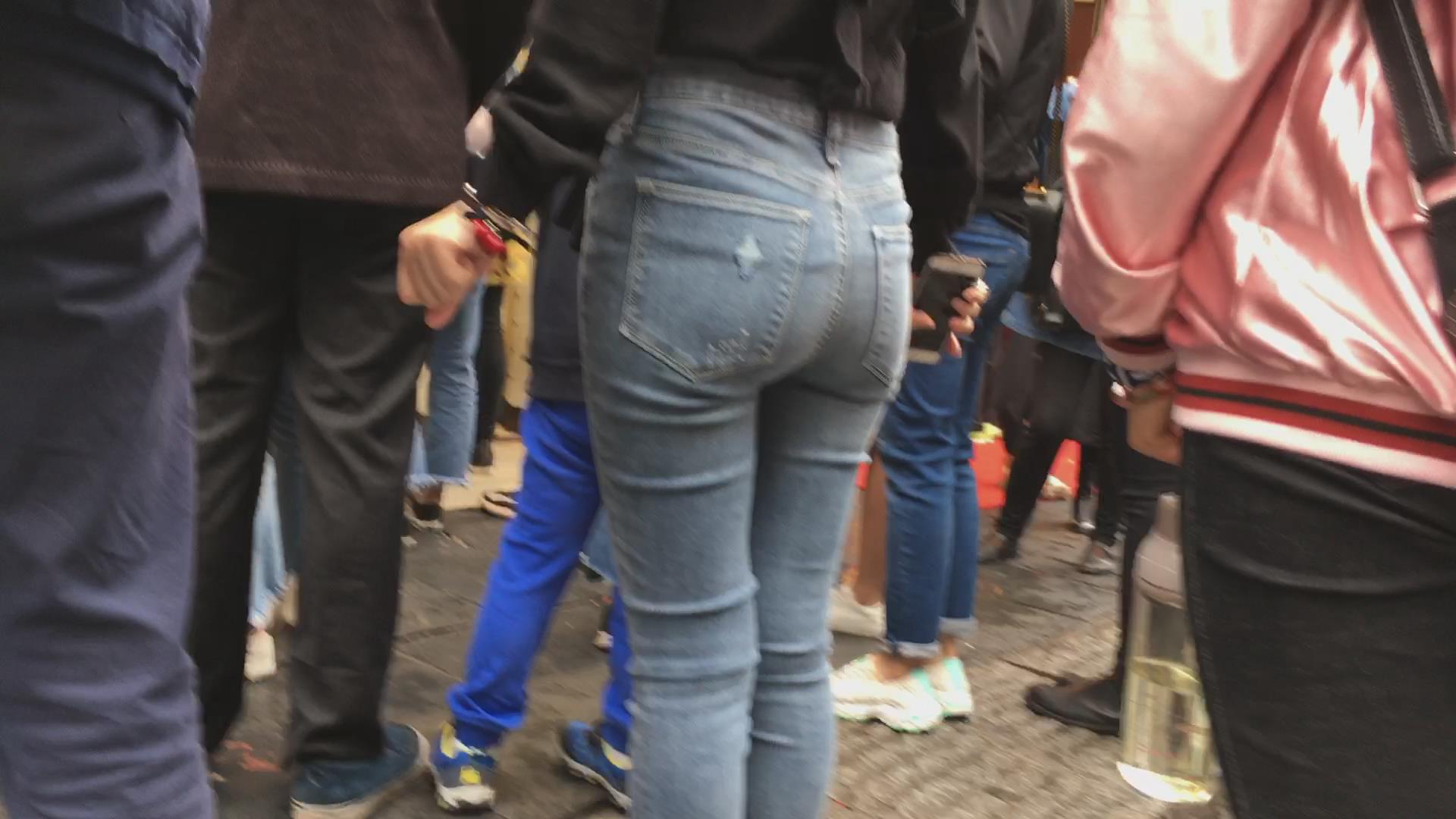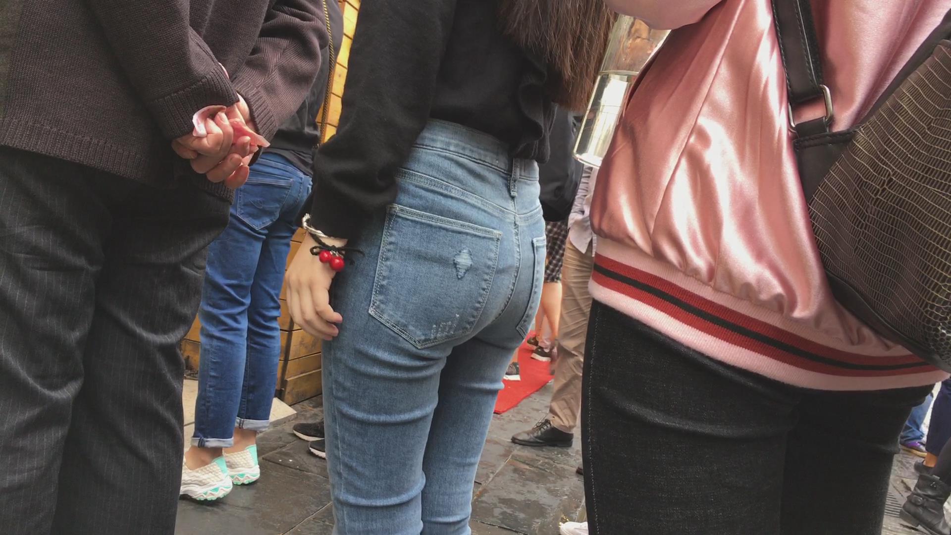 黑色衬衫街拍圆臀紧身牛仔裤美女 编号5331
