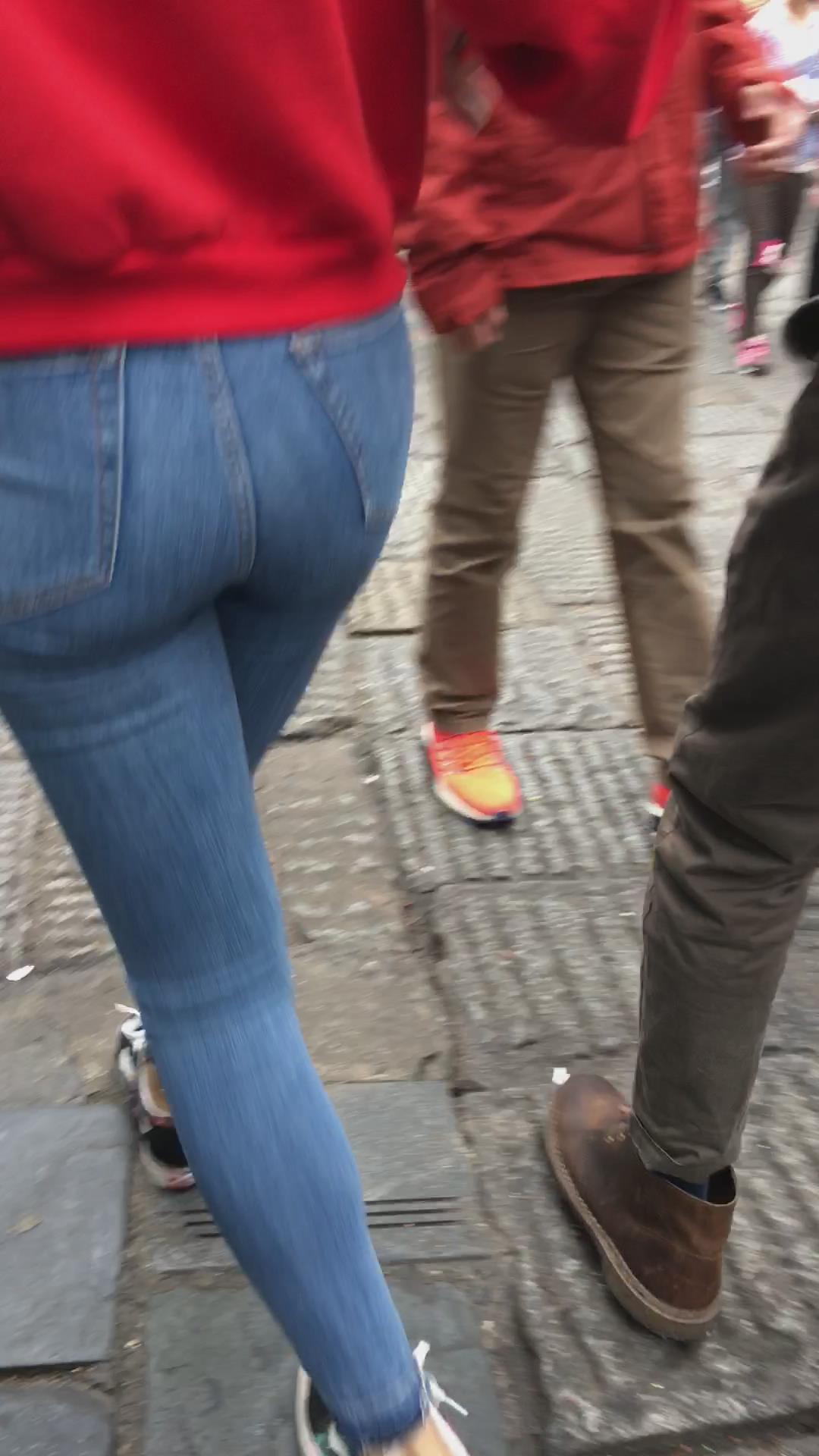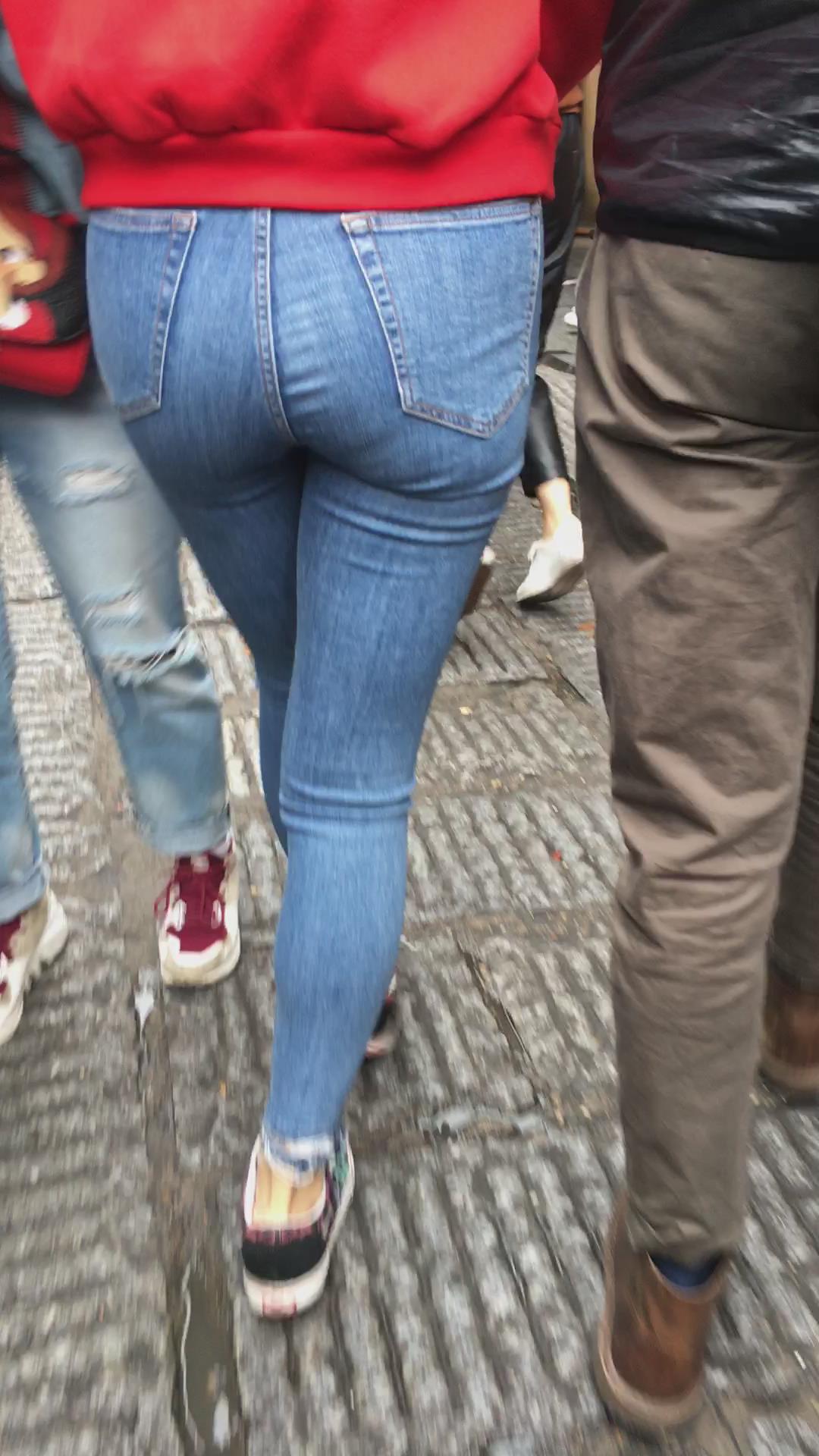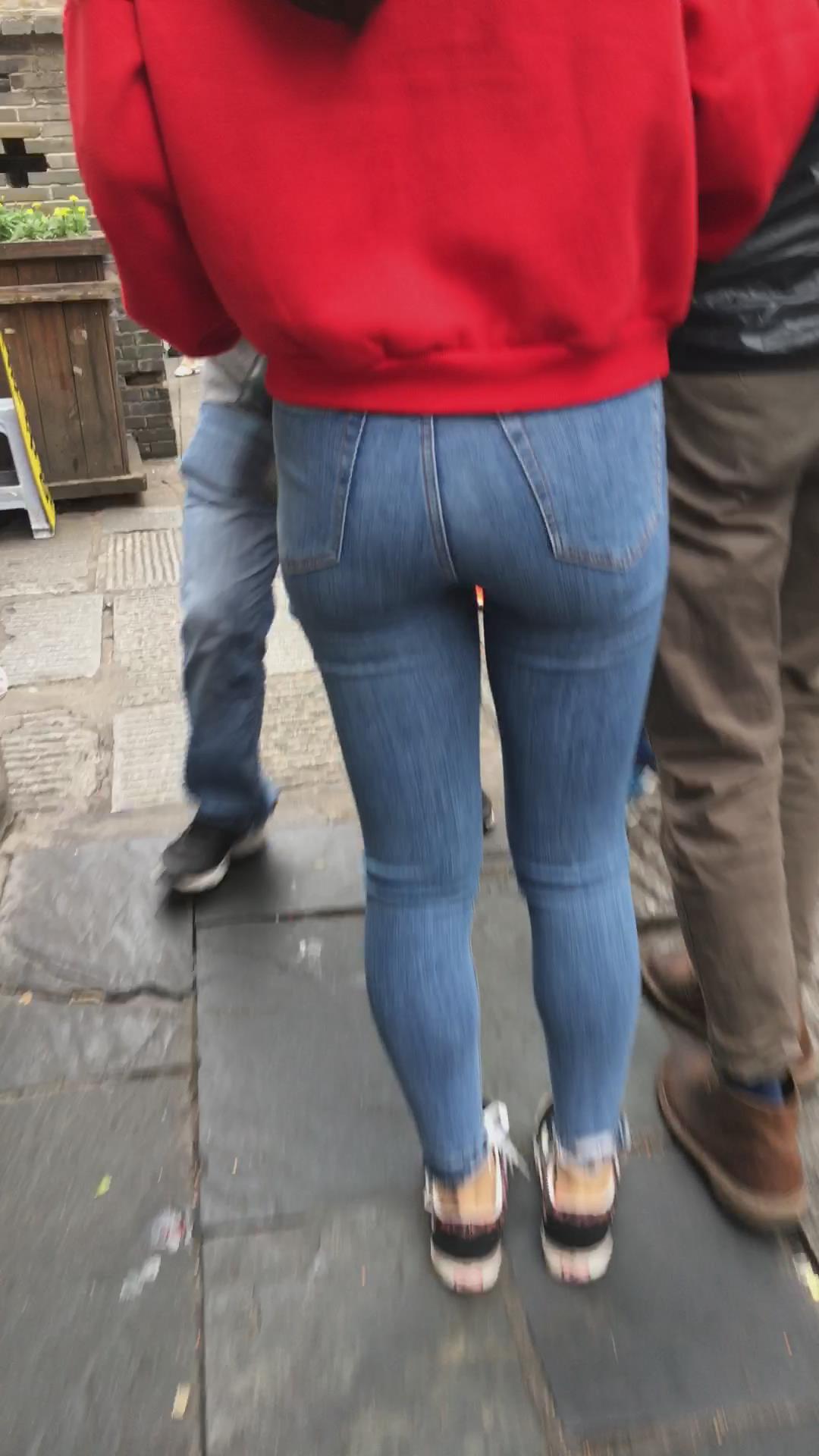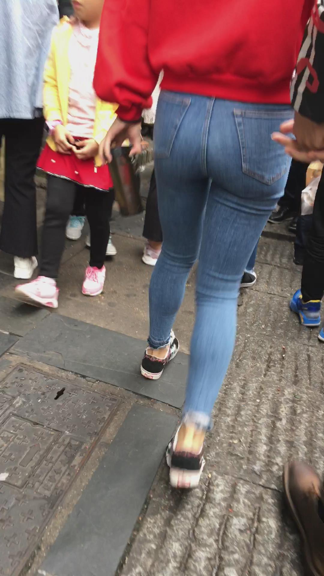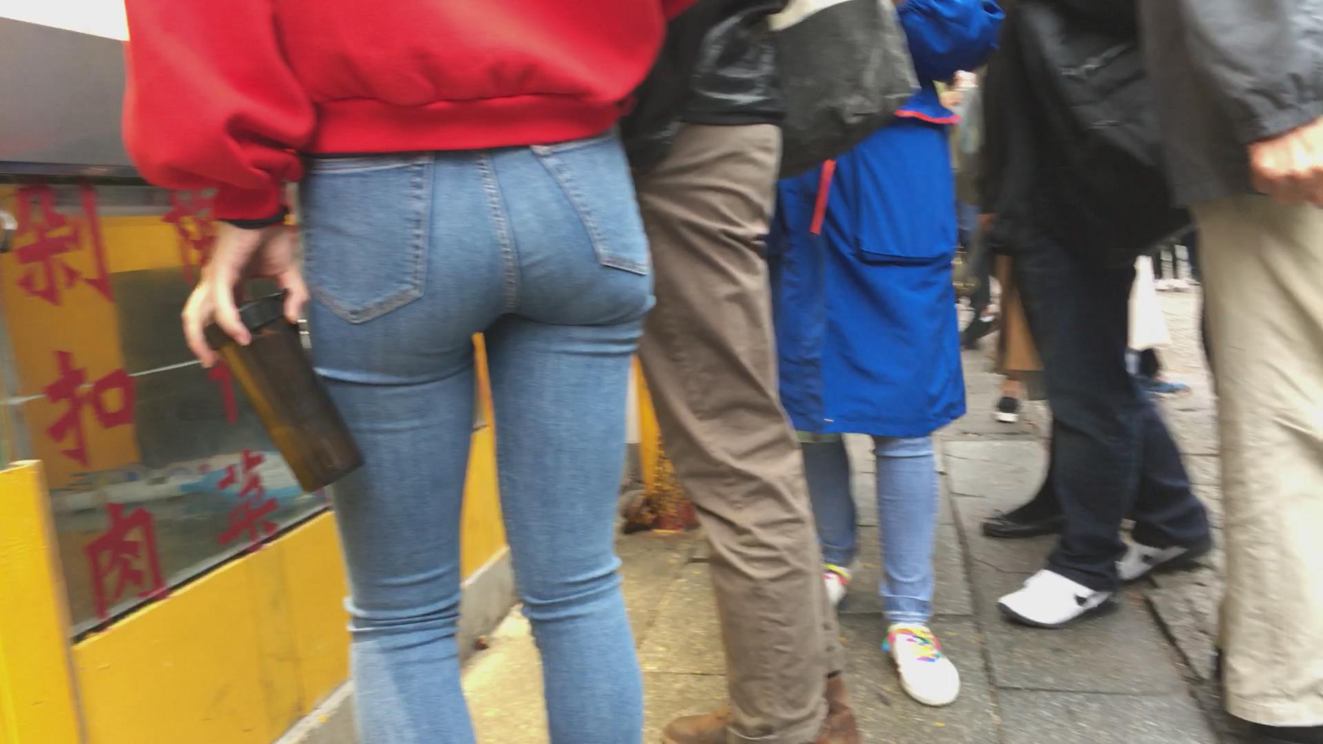 极度紧绷蓝色牛仔裤红衣服街拍美女 编号5337