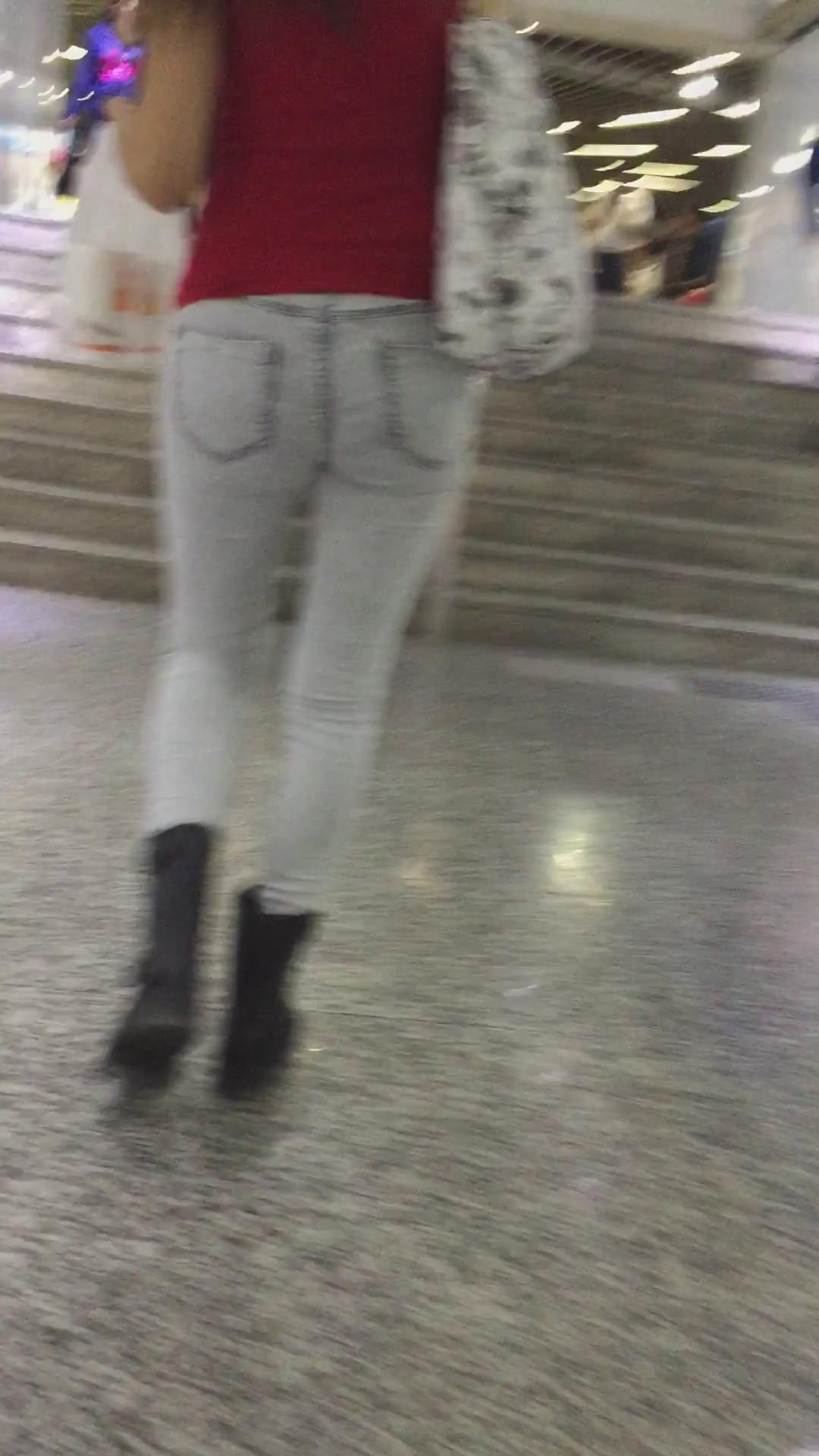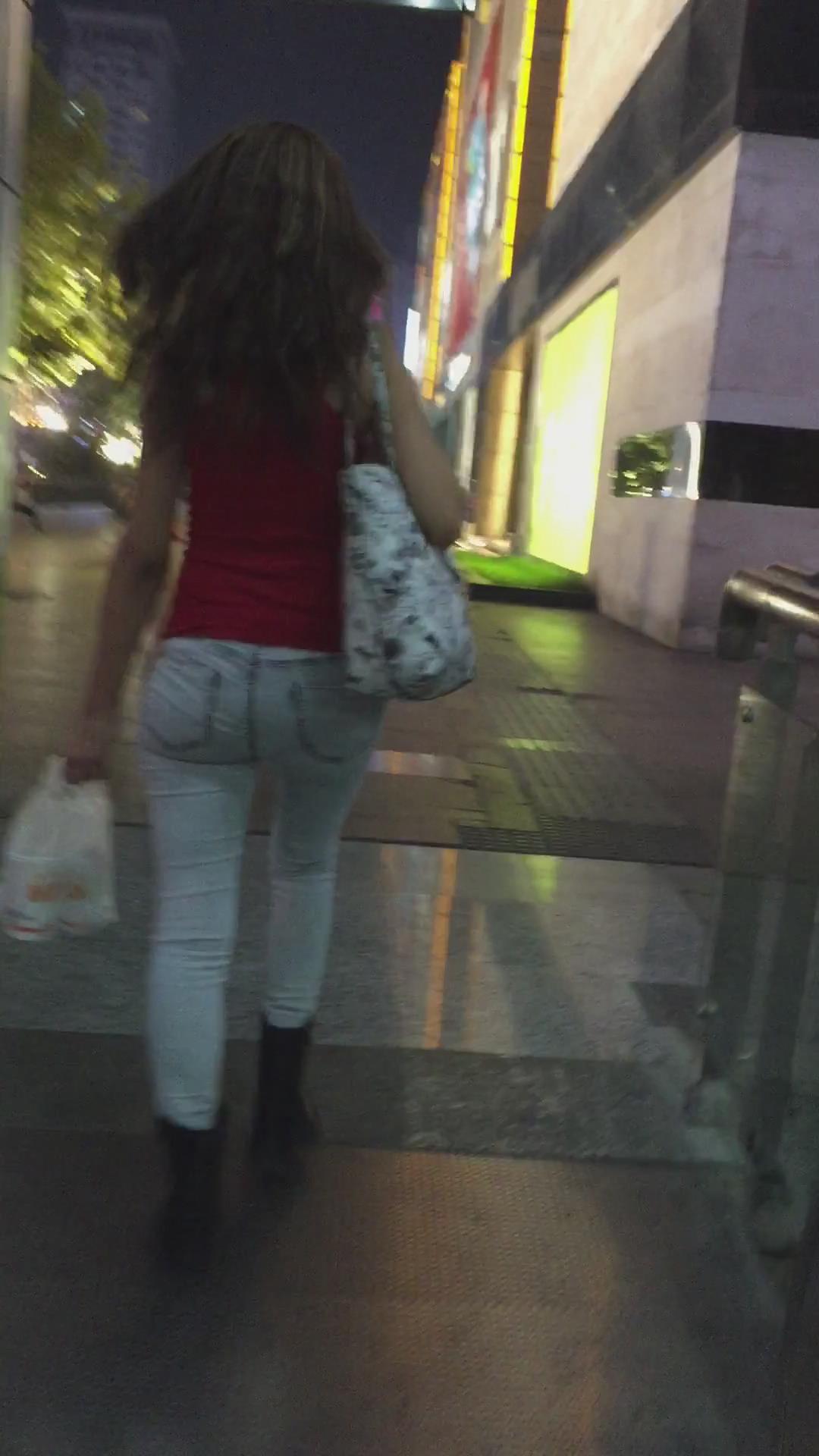红T恤超紧绷牛仔裤街拍美臀 编号5343