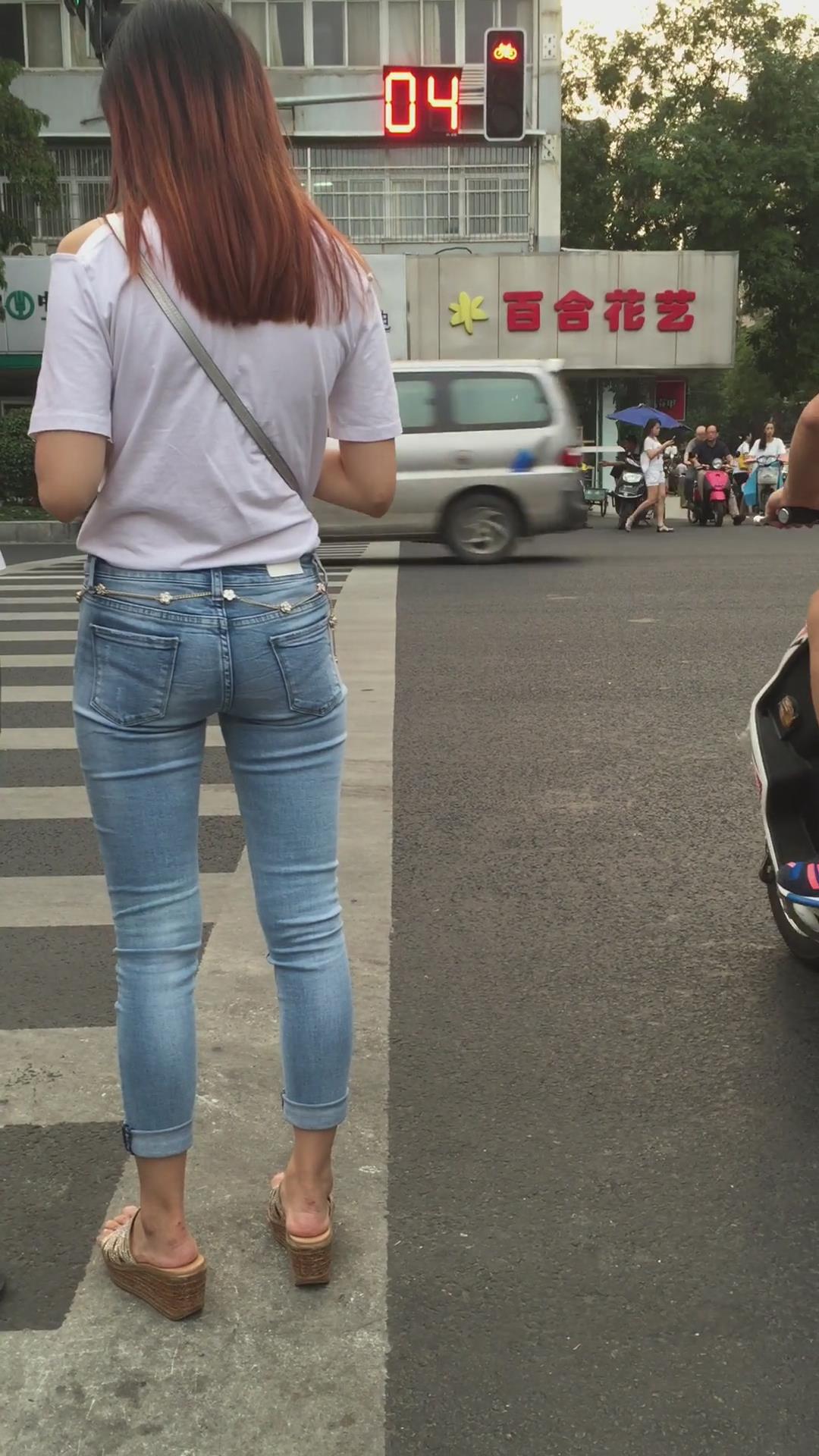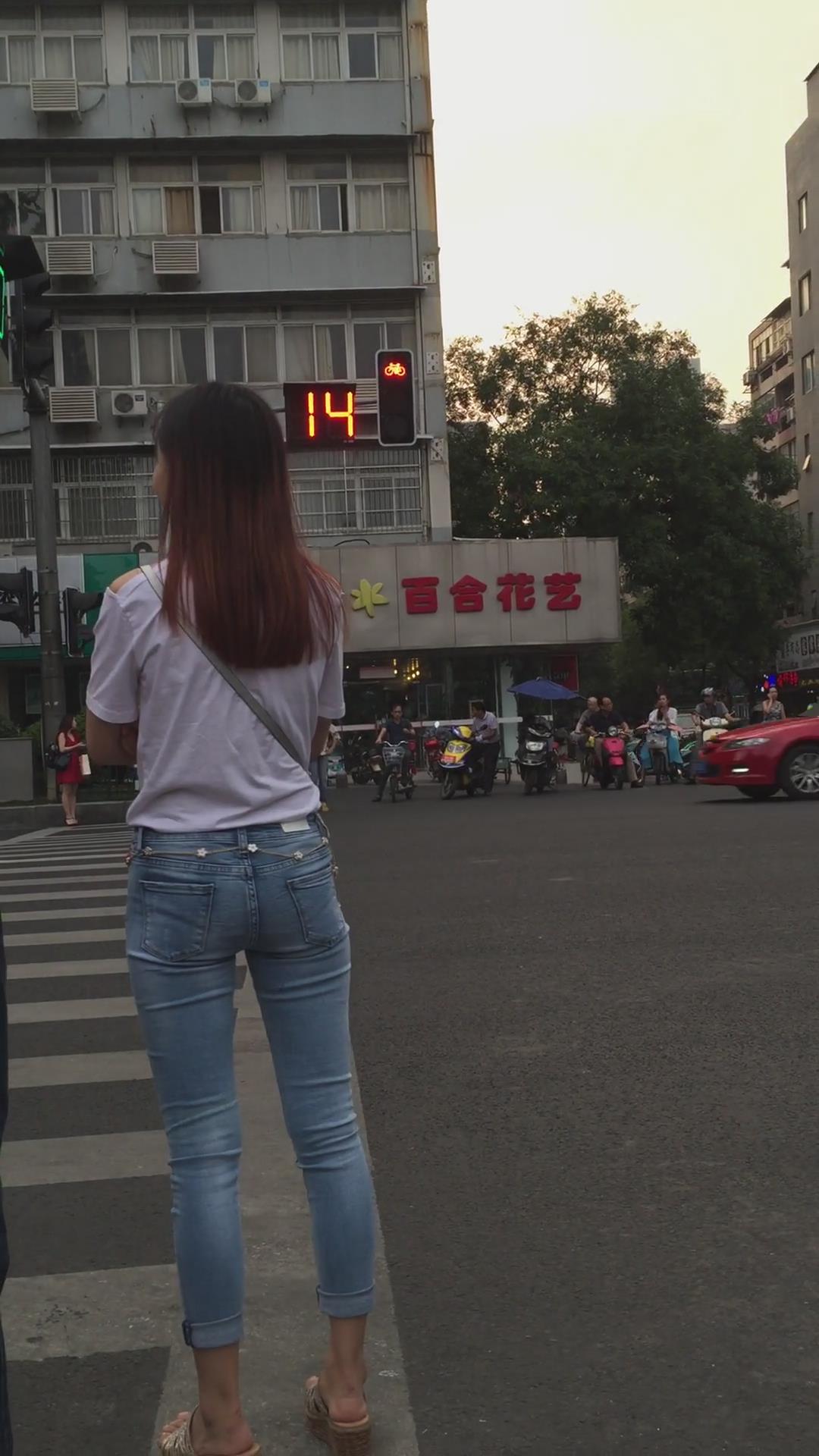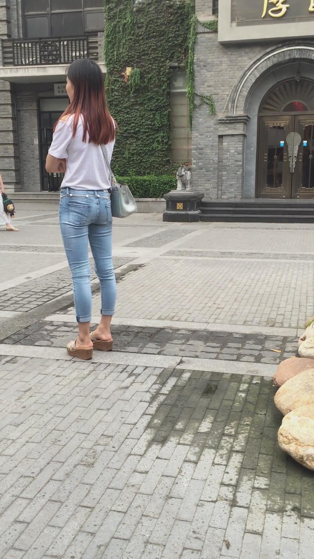 街拍超紧身蓝色牛仔裤宽臀小姐姐 编号5395