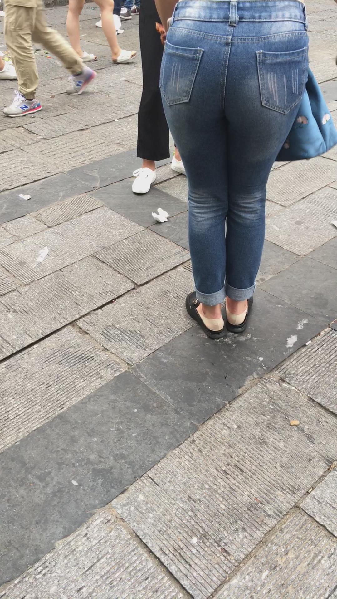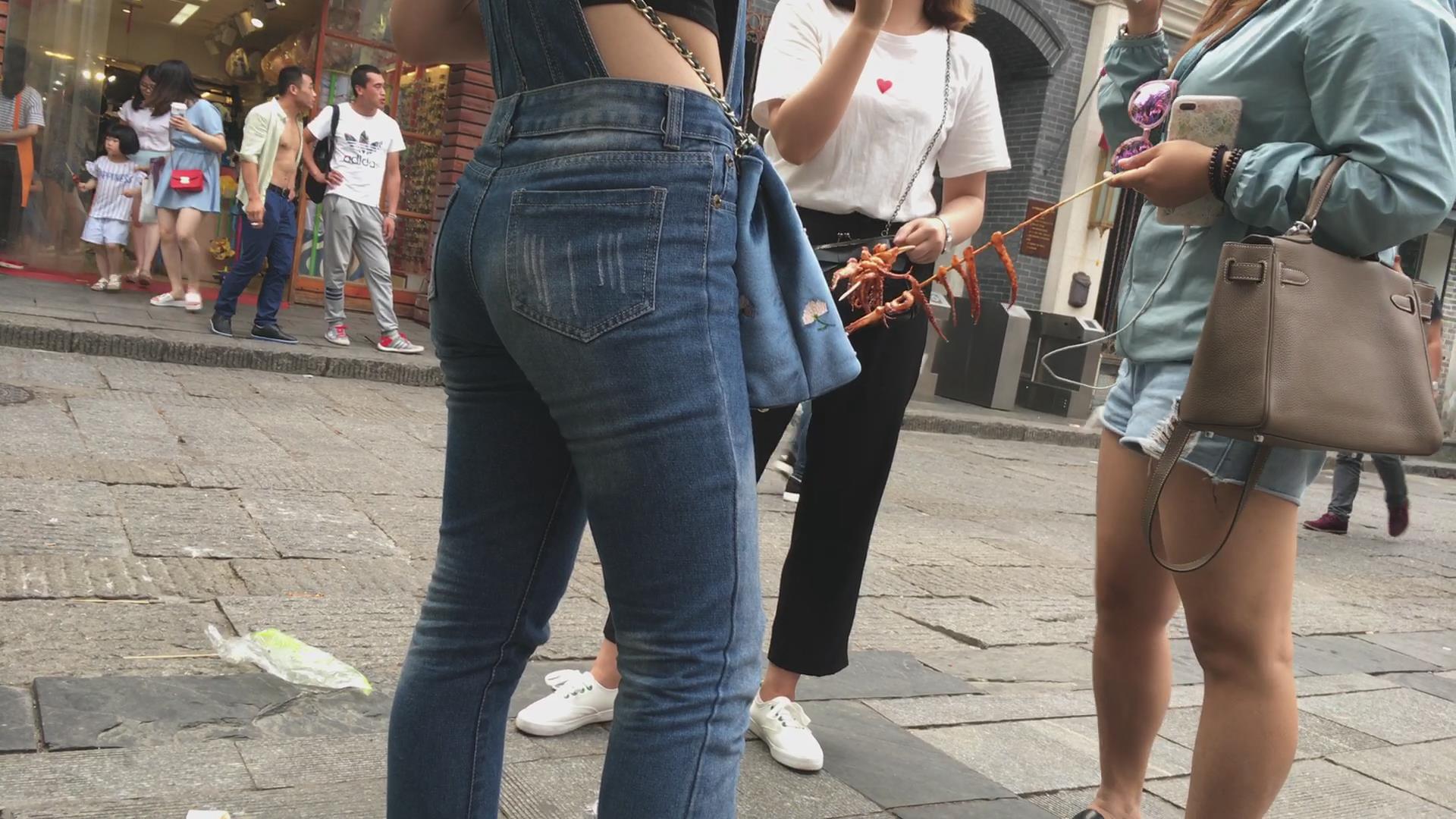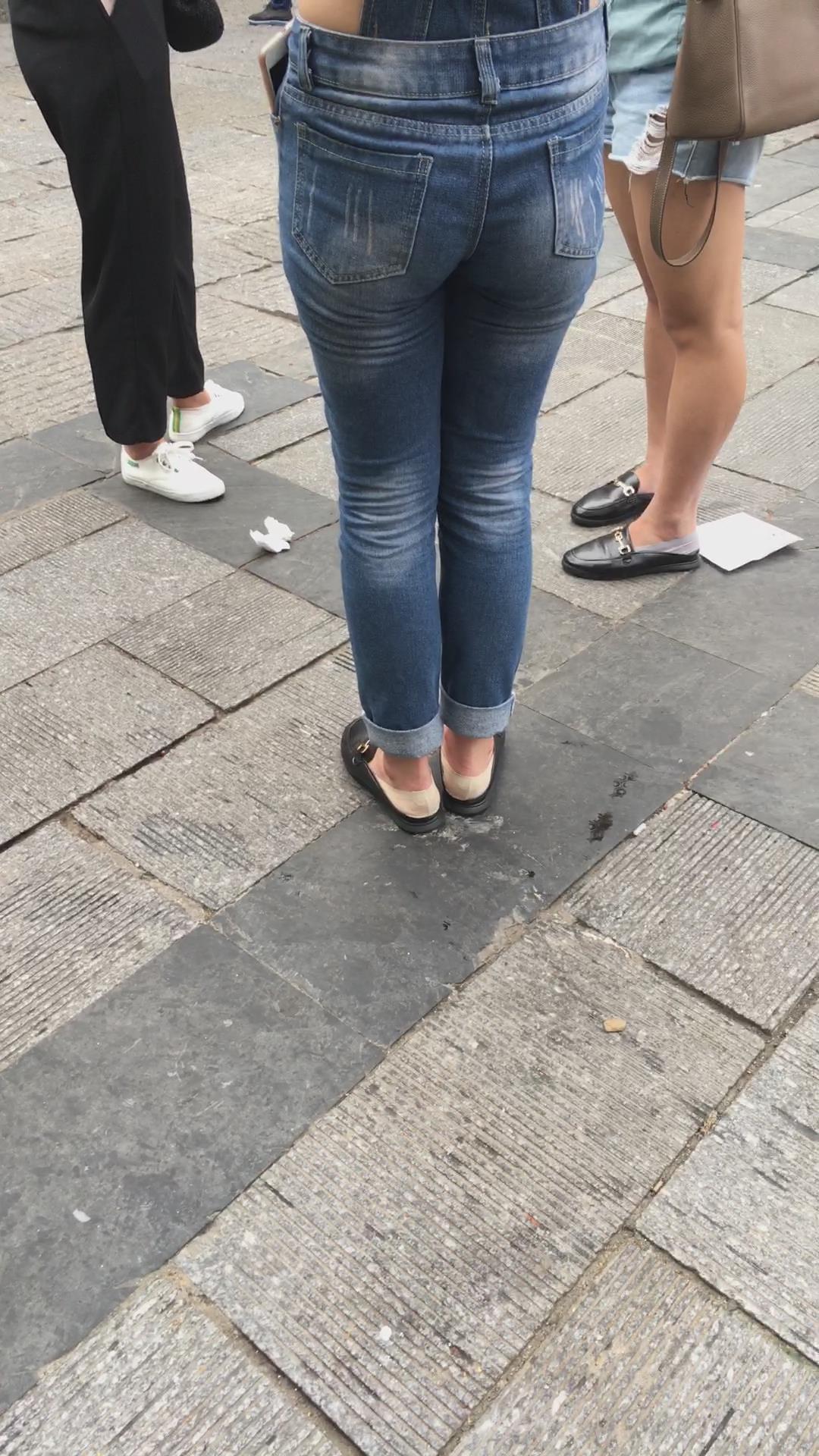 街拍紧身吊带蓝色牛仔裤美女,丰满圆润的臀部 编号5421