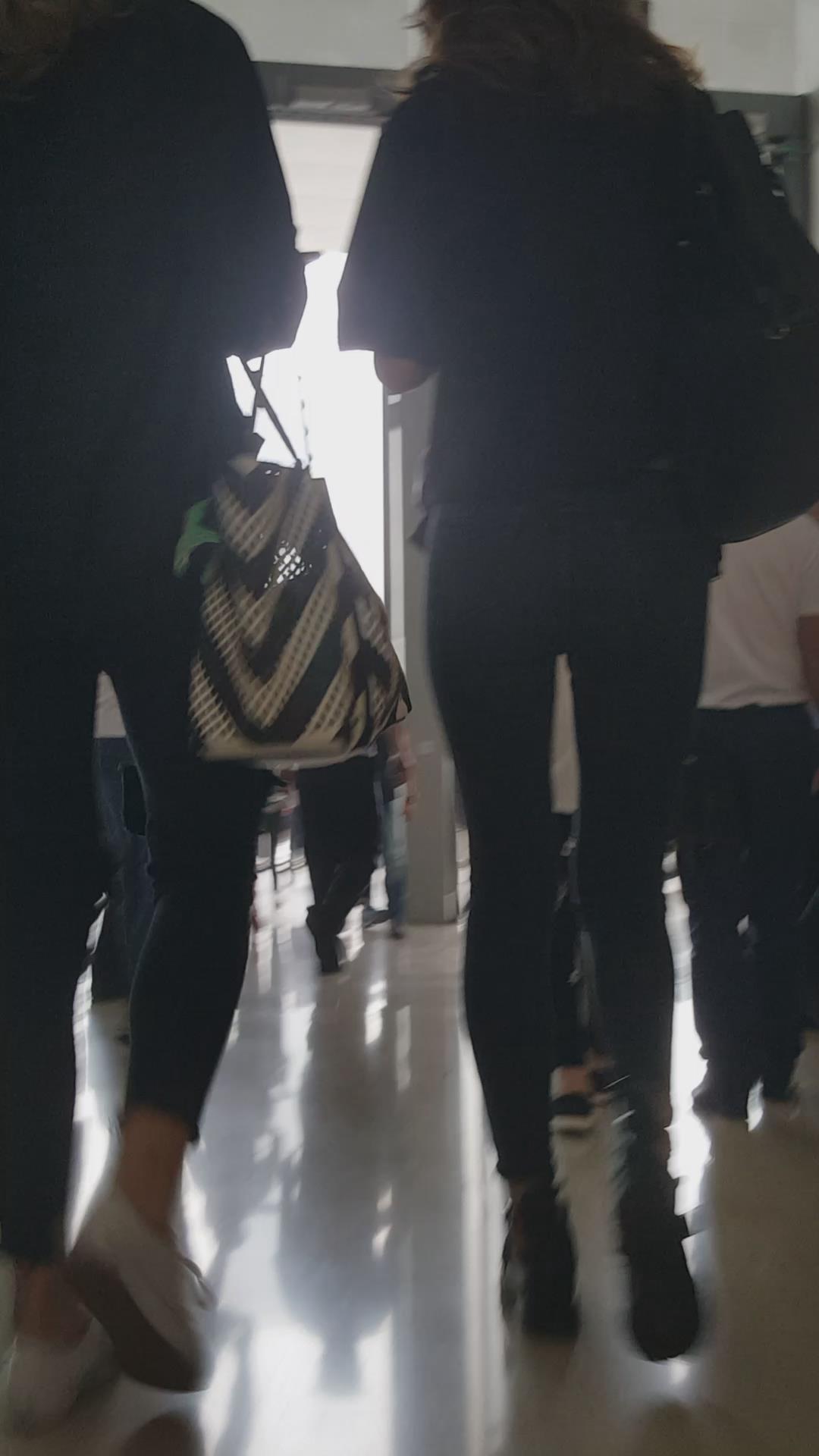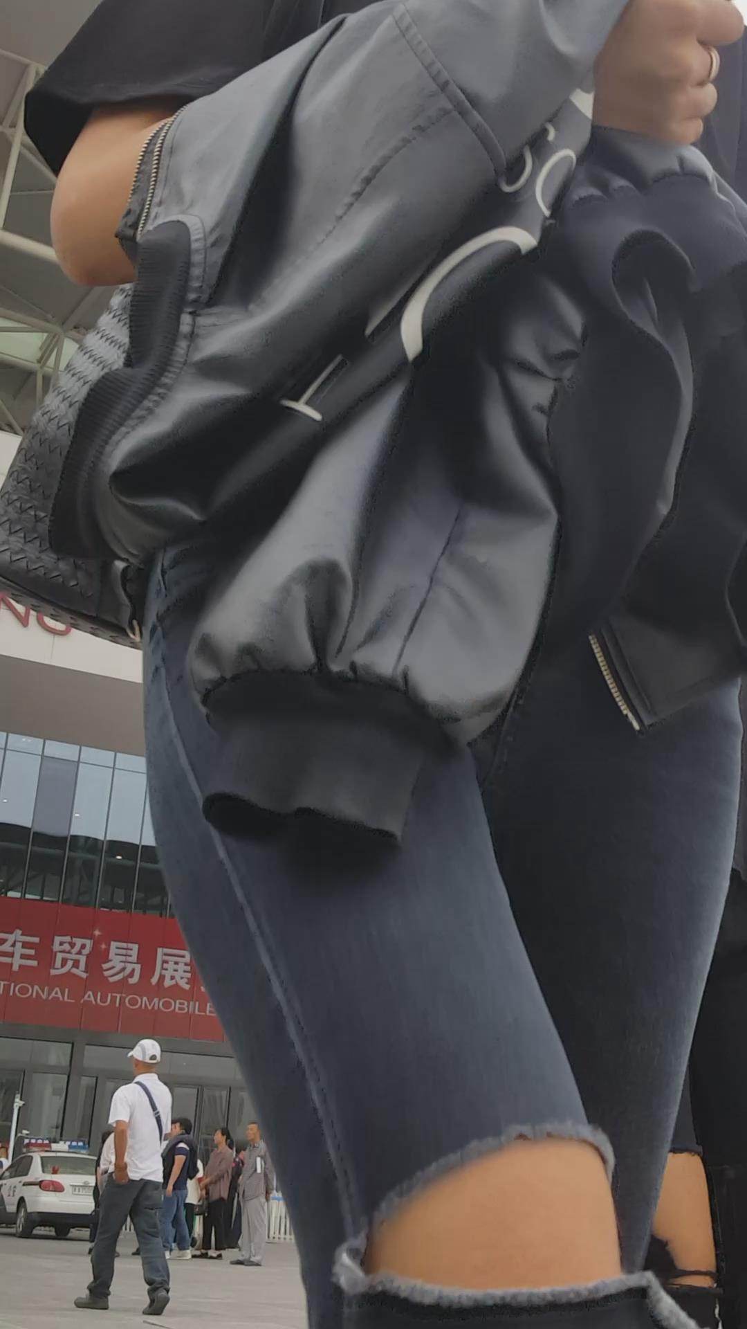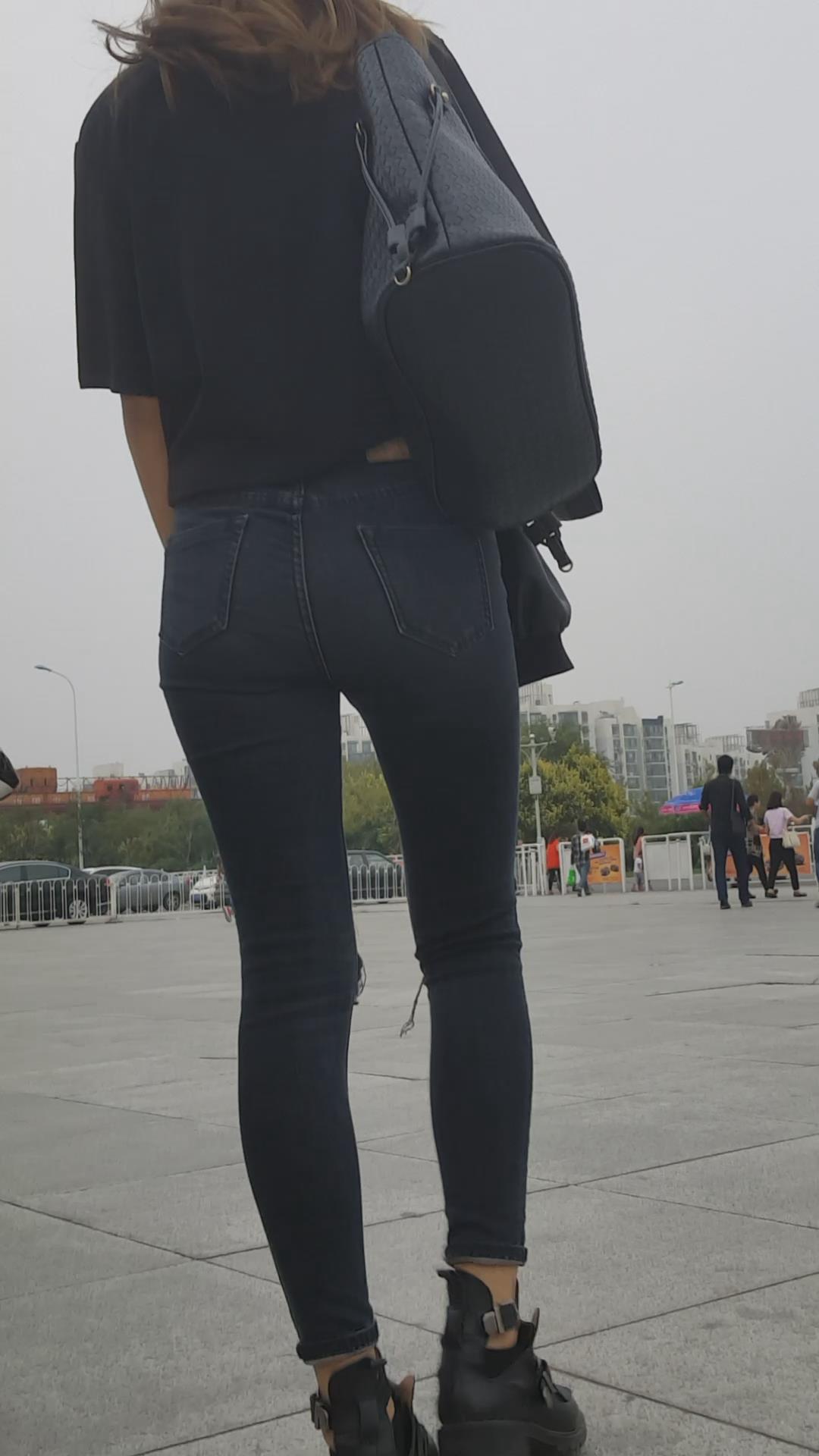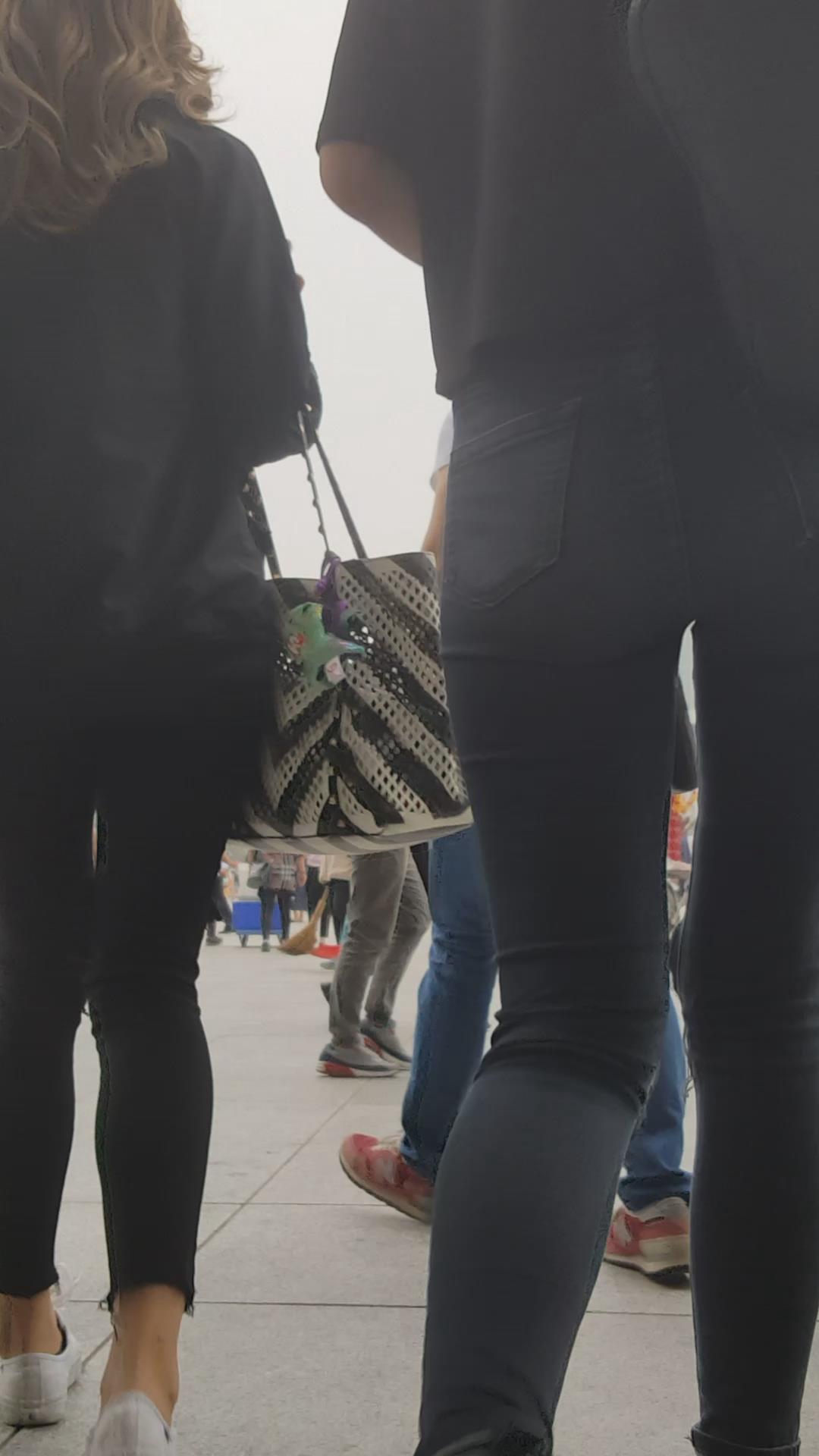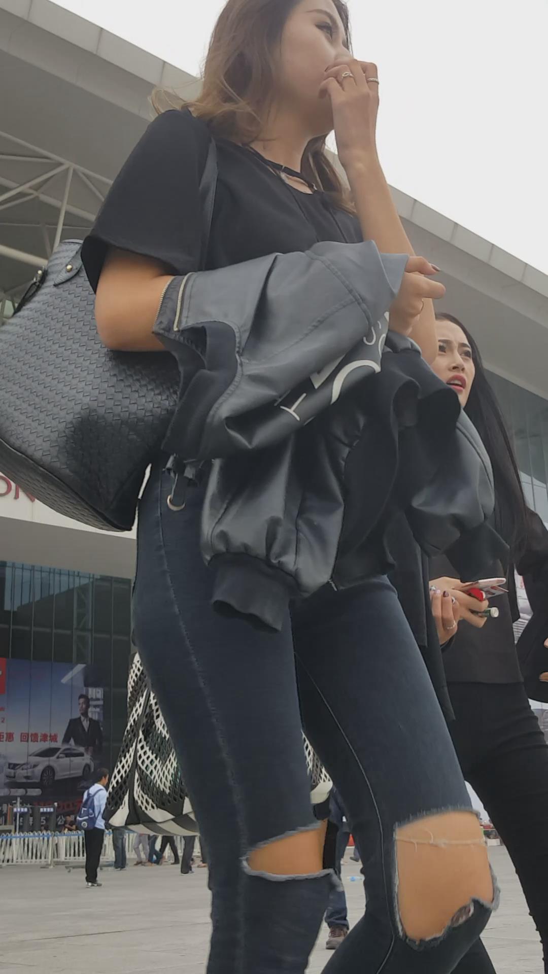 街拍颜值黑色紧身牛仔裤俩姐妹 编号5449
