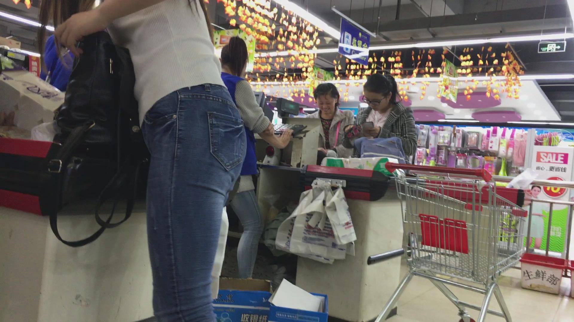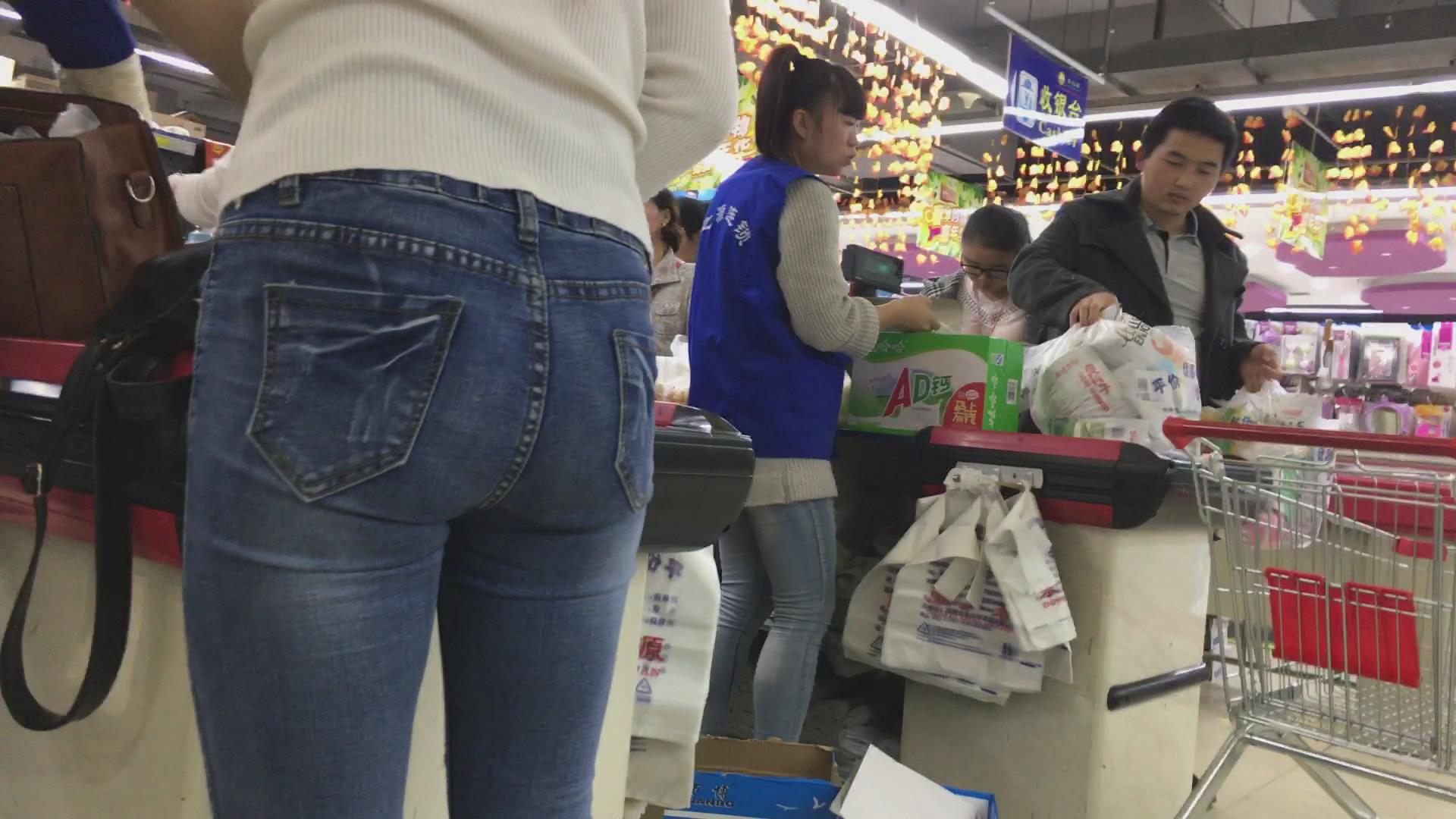 逛超市的紧身蓝色牛仔裤眼镜妹 编号5478