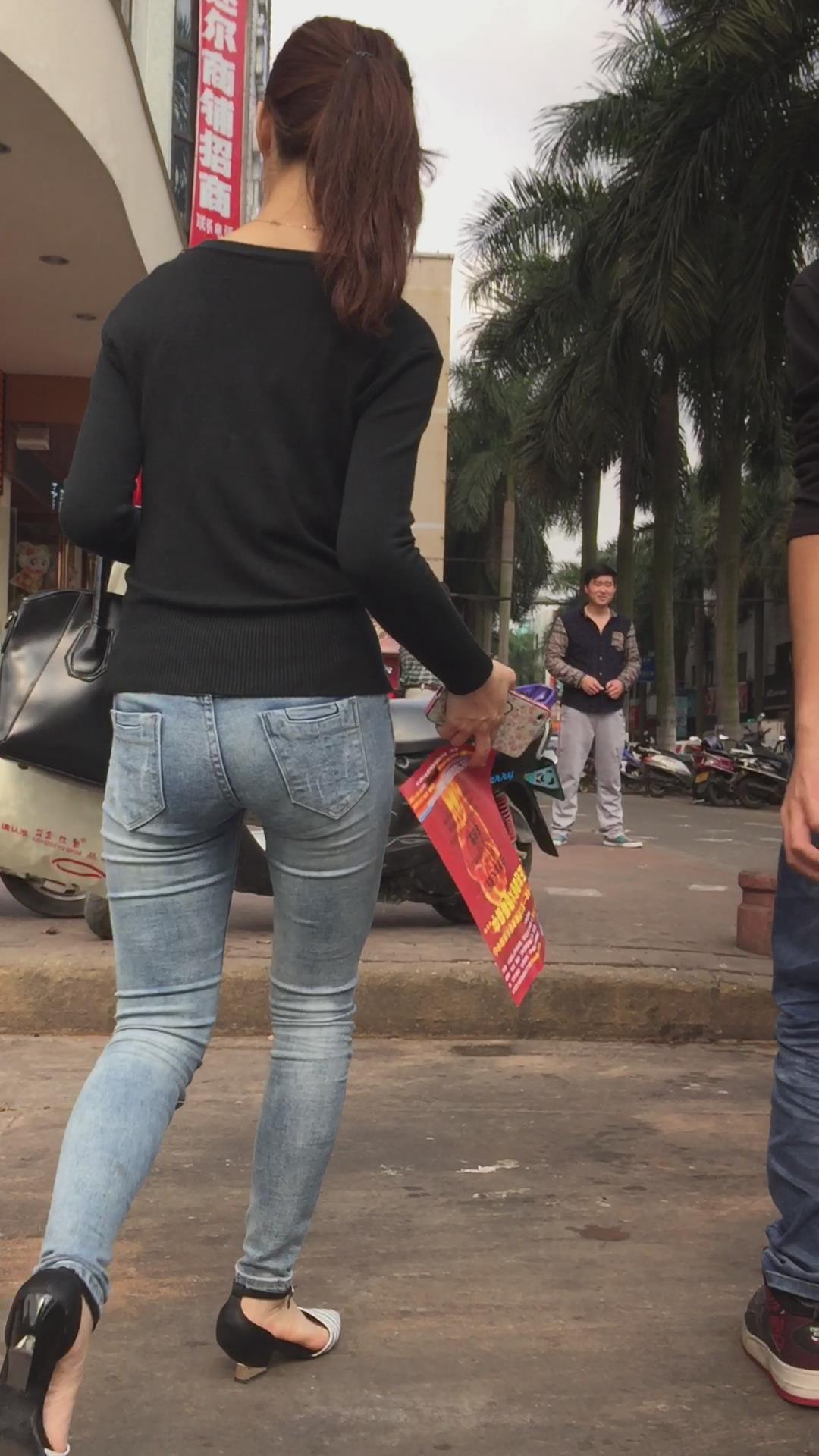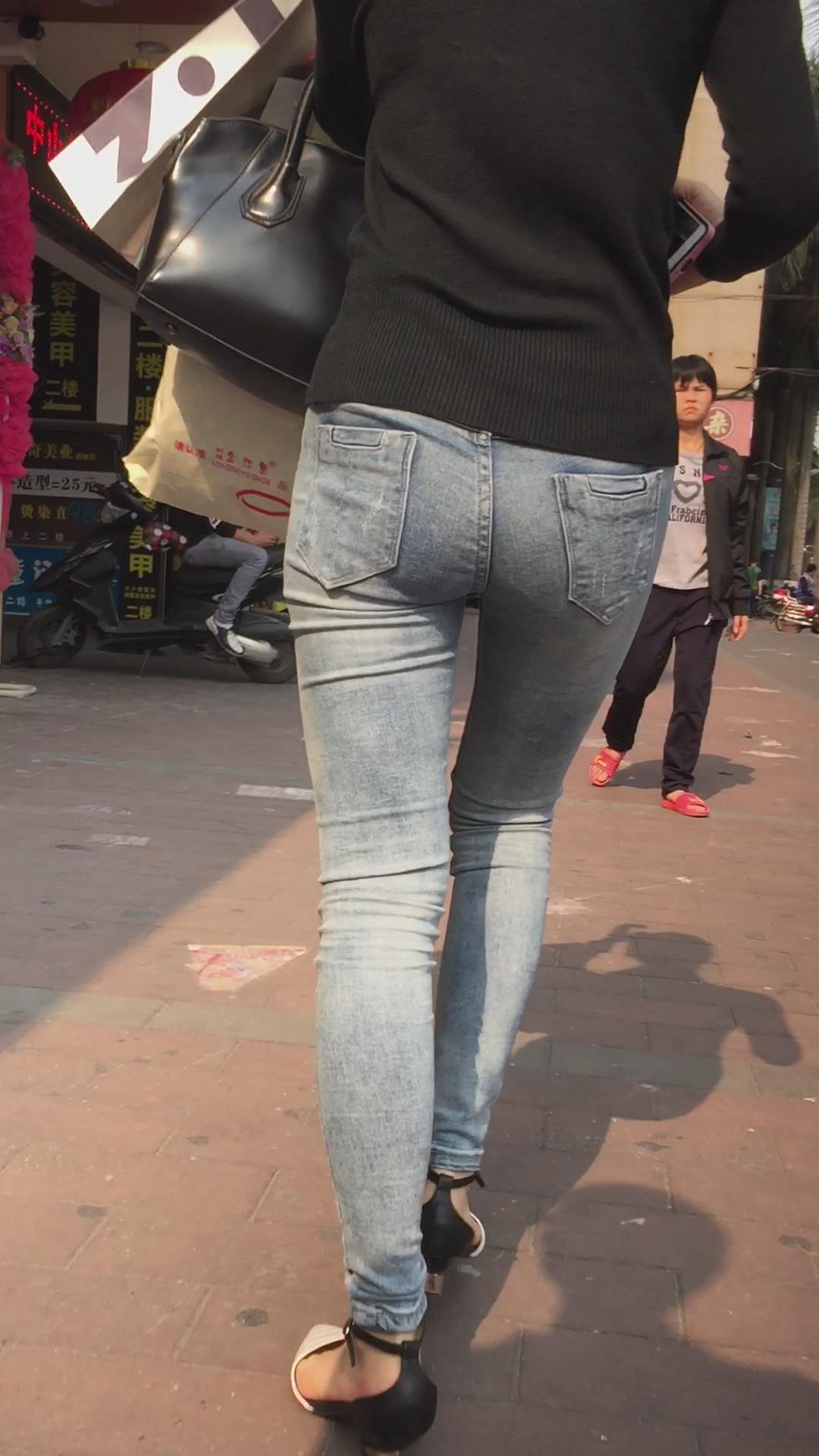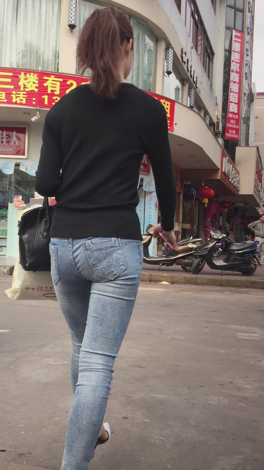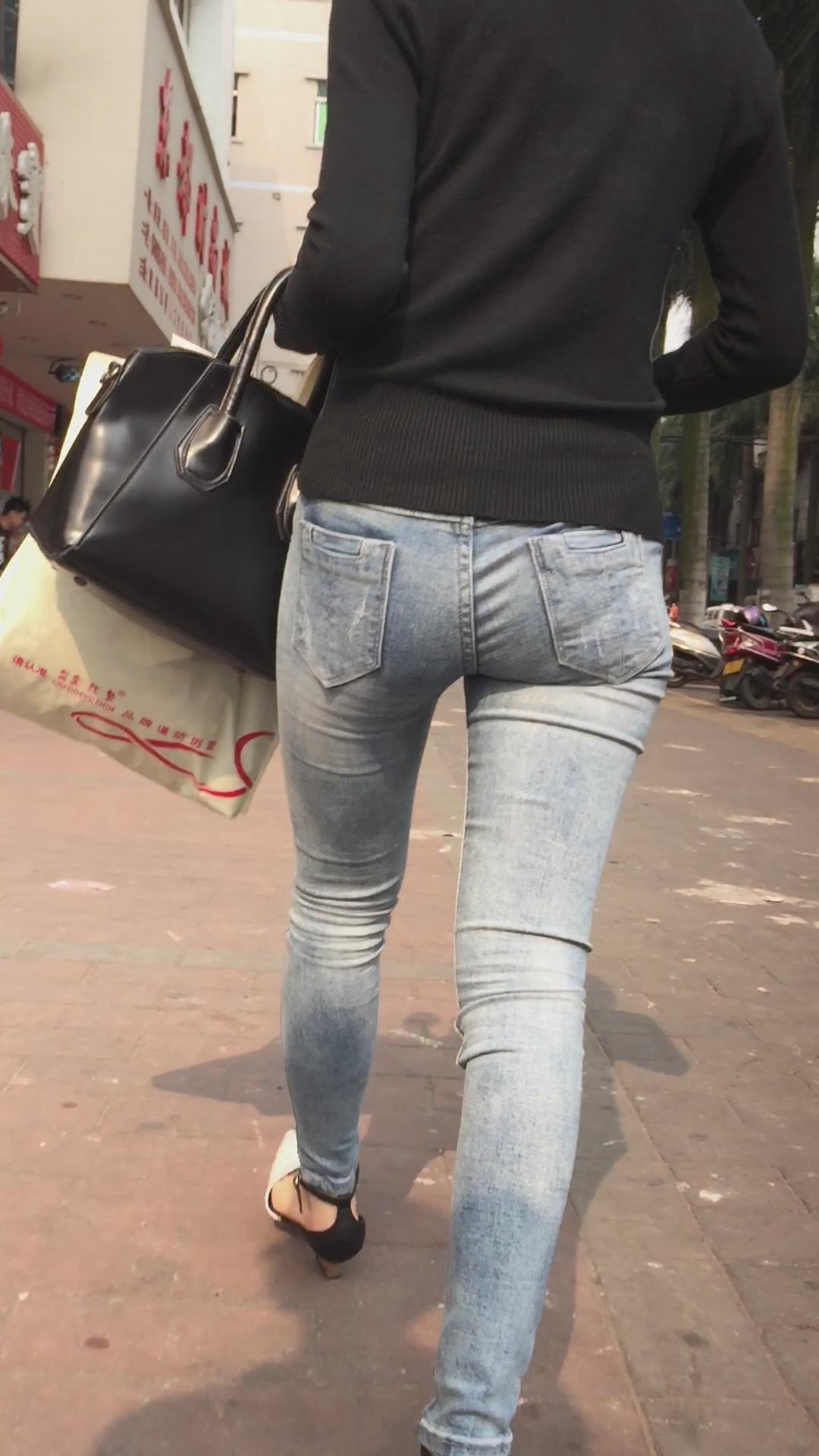 街拍超紧身蓝色牛仔裤妹子,紧到让人无法呼吸 编号5487