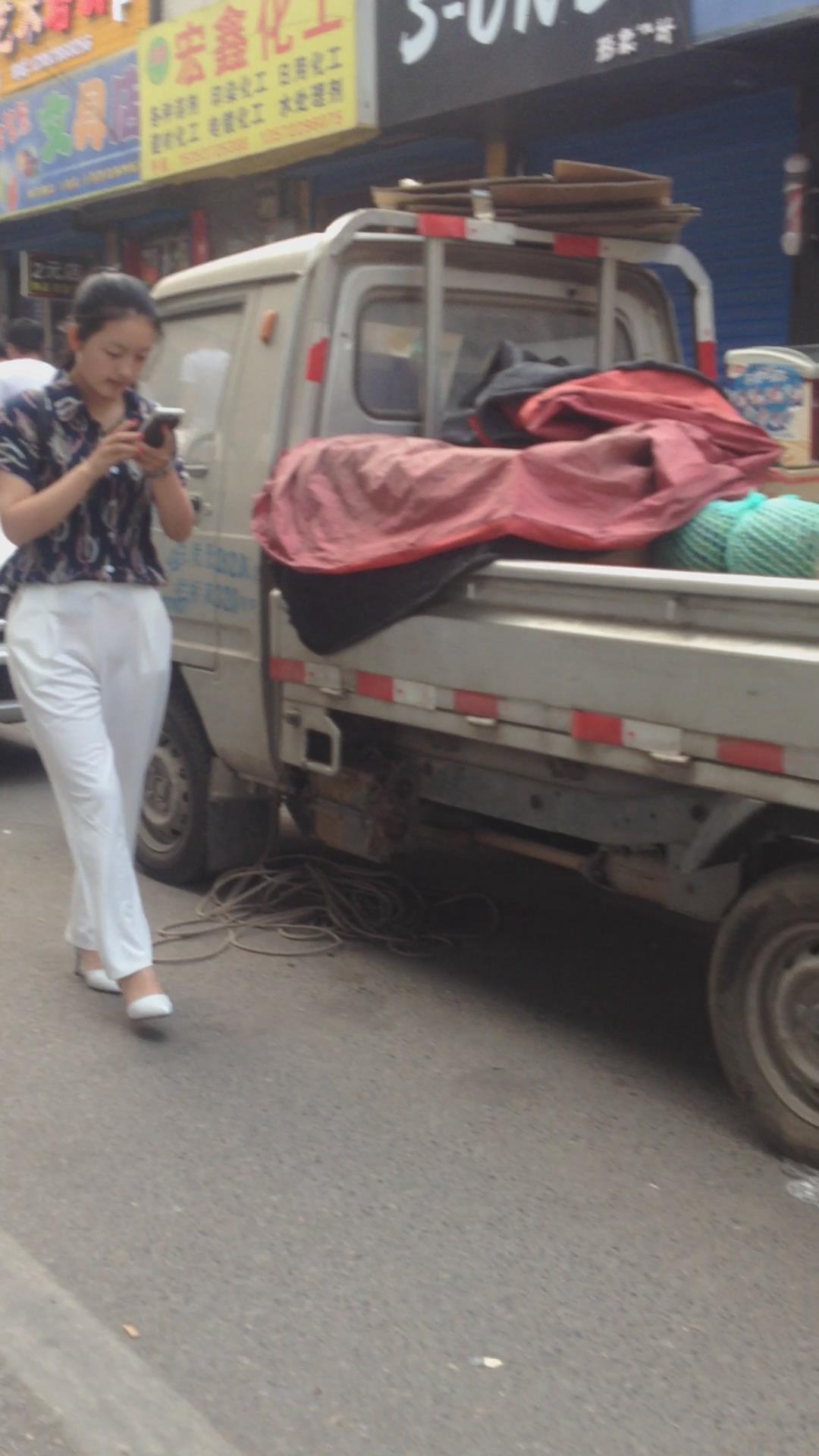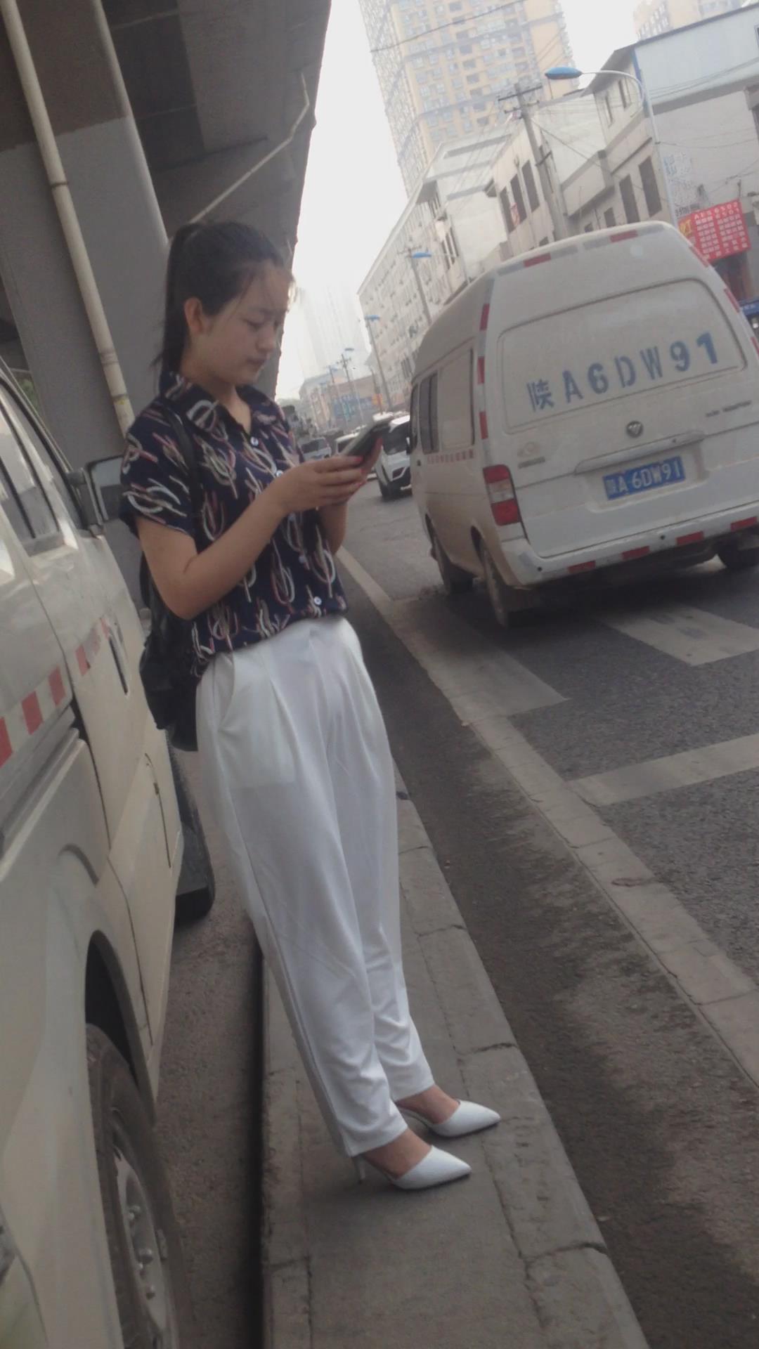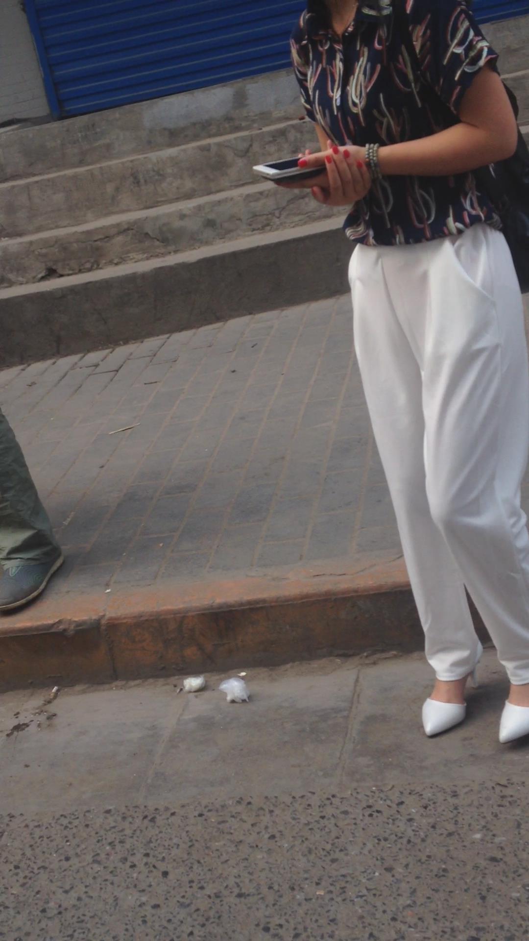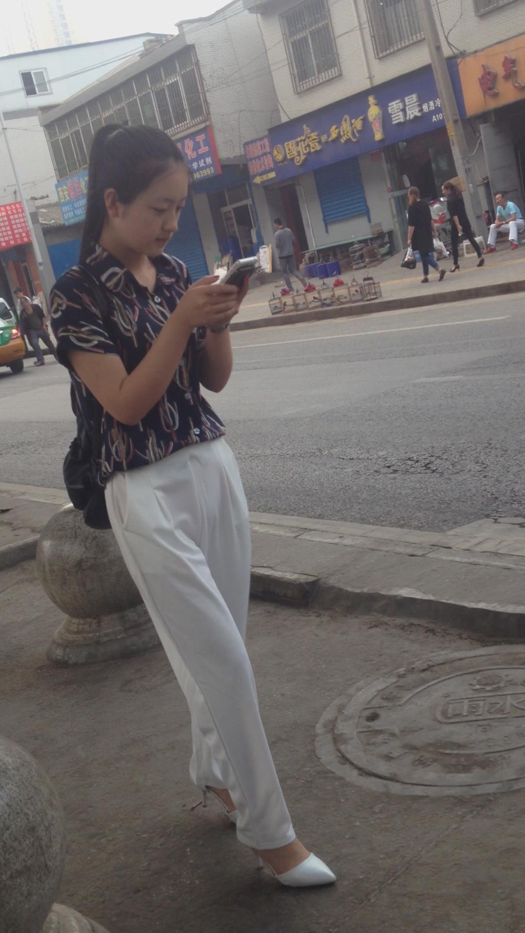 走路只顾着低头玩手机的气质白裤高跟鞋美女 编号5515