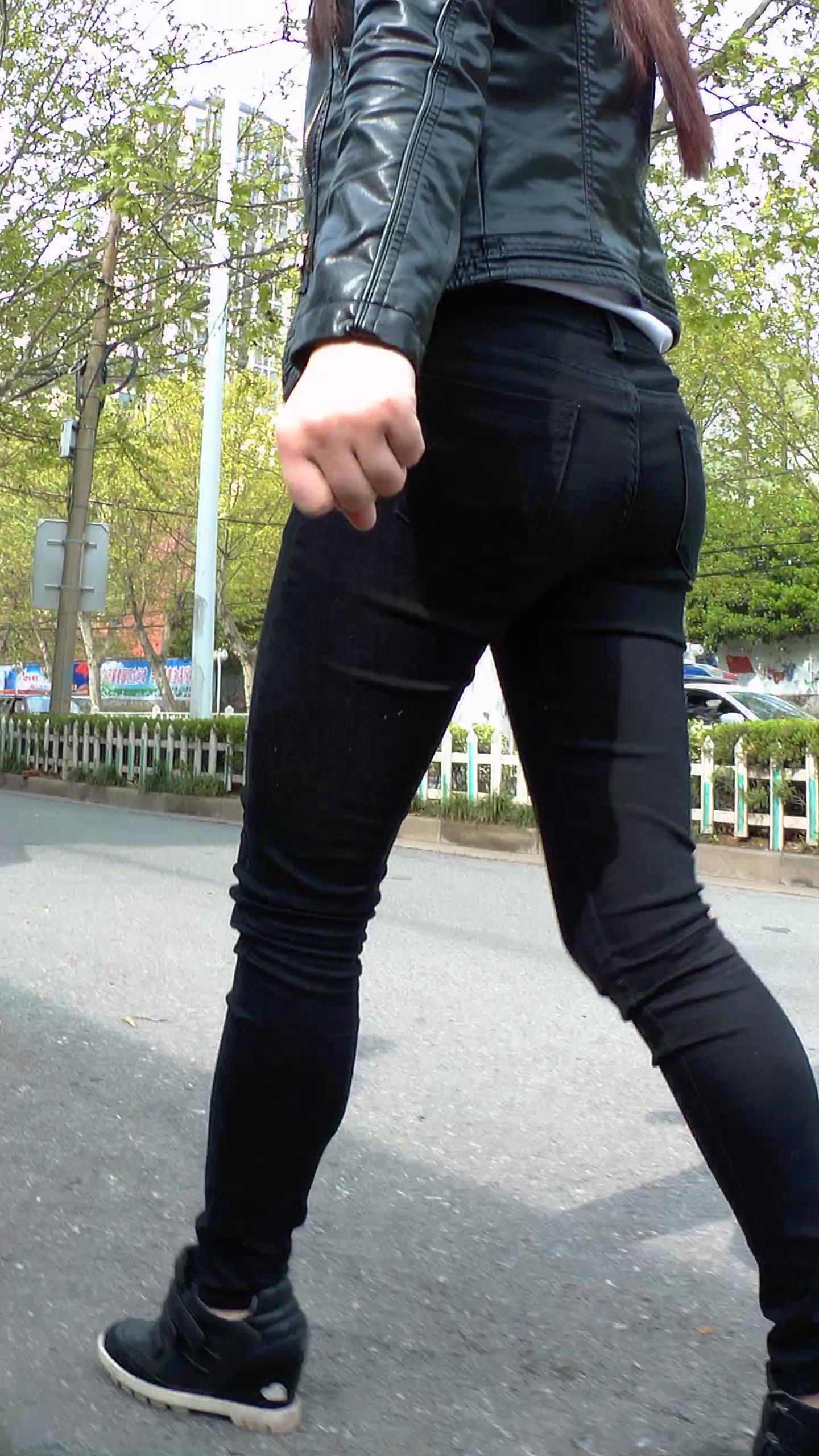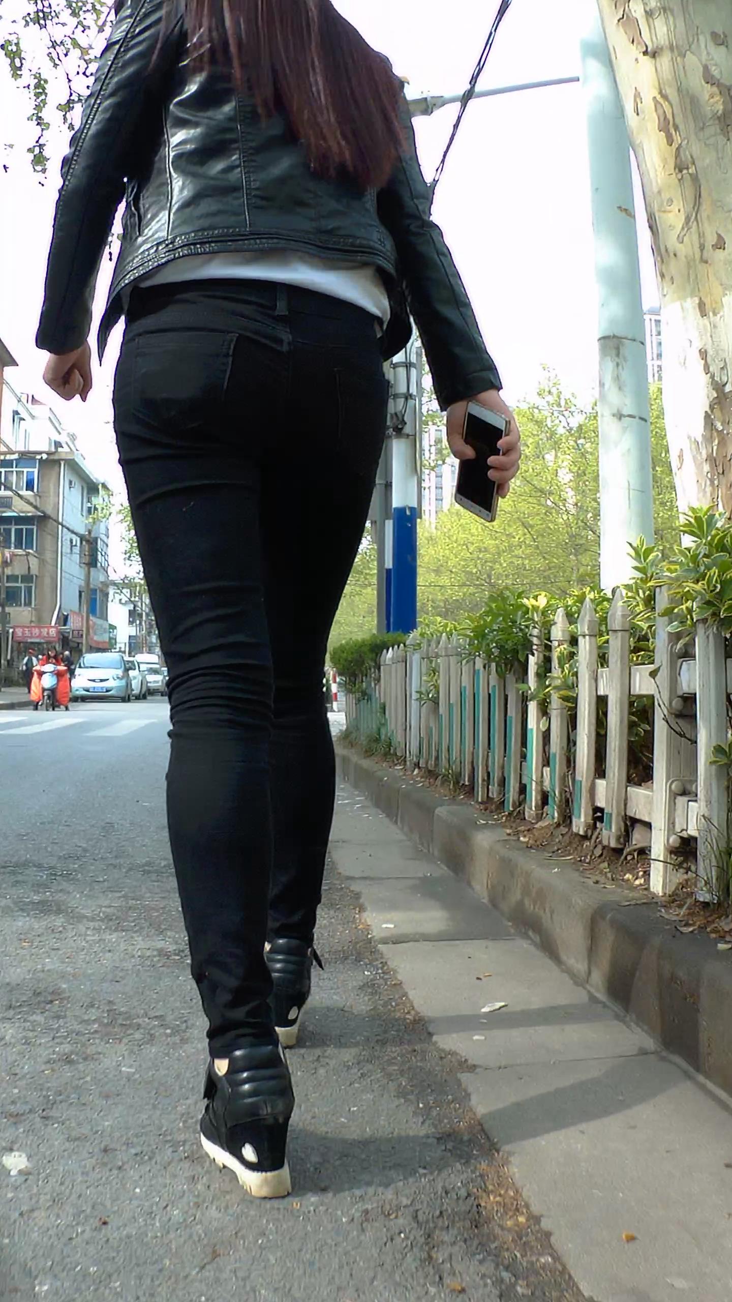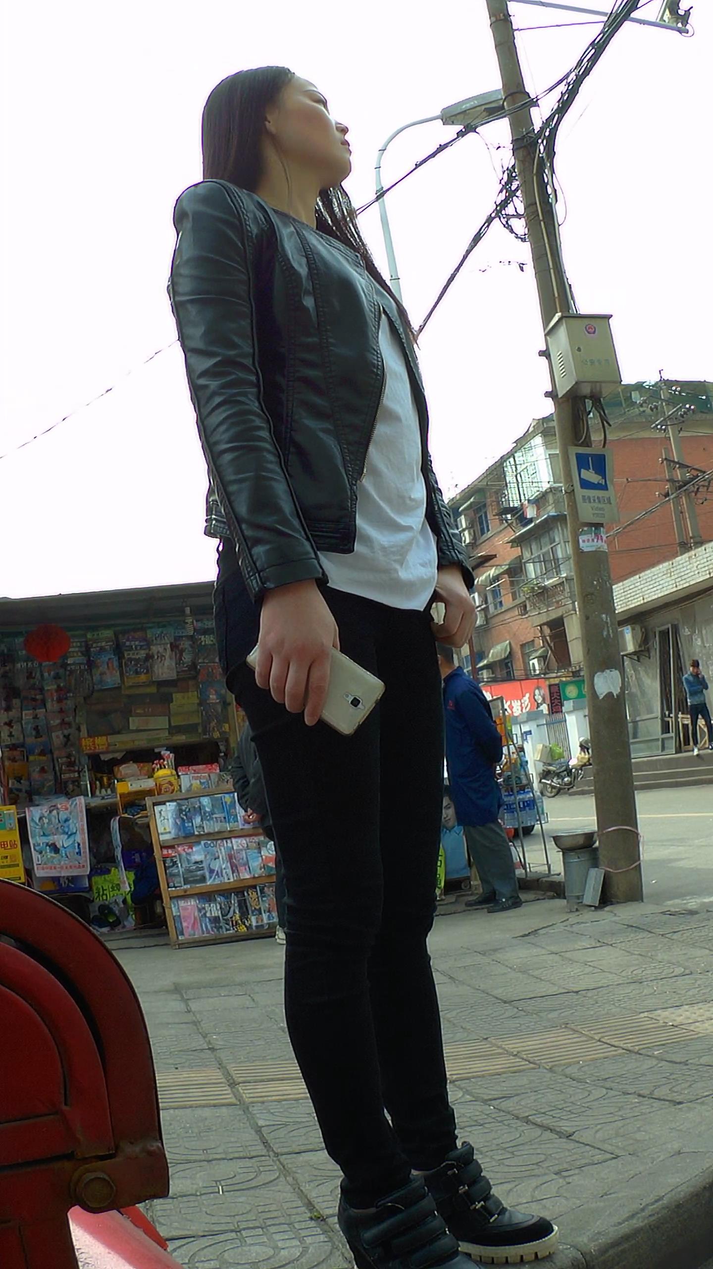 街头迷茫的黑色紧身裤皮衣妹子 编号5548