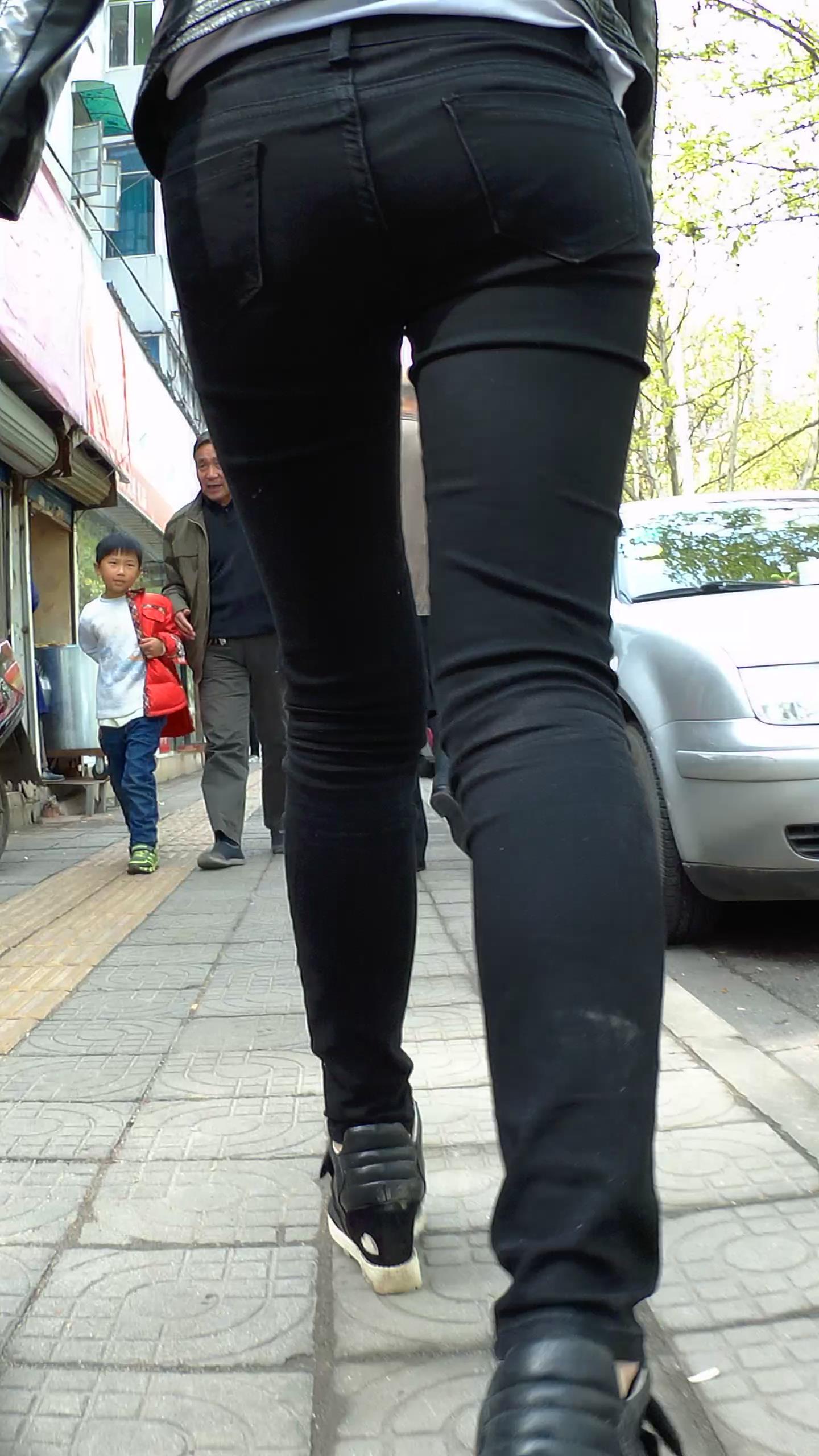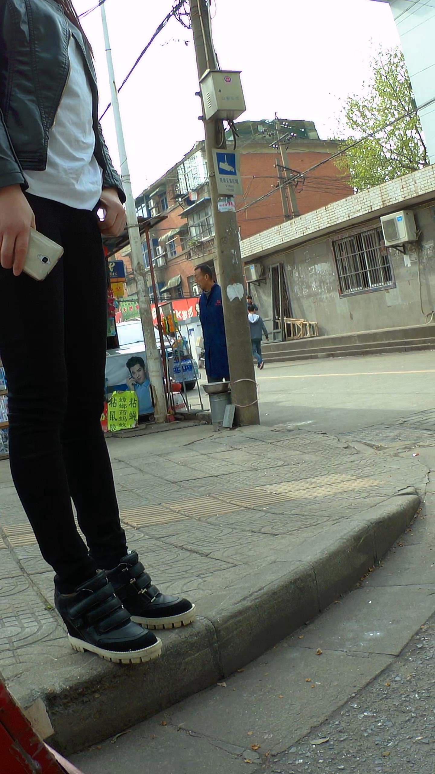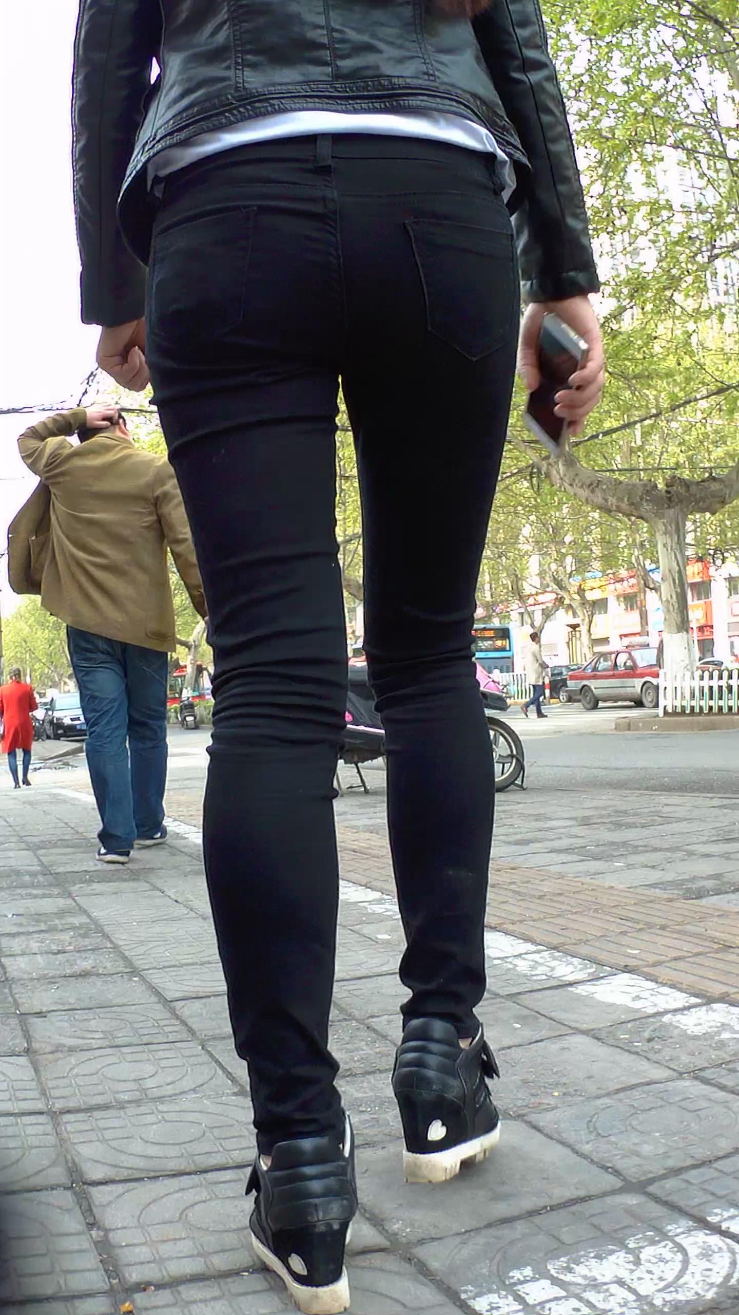 街头迷茫的黑色紧身裤皮衣妹子 编号5548
