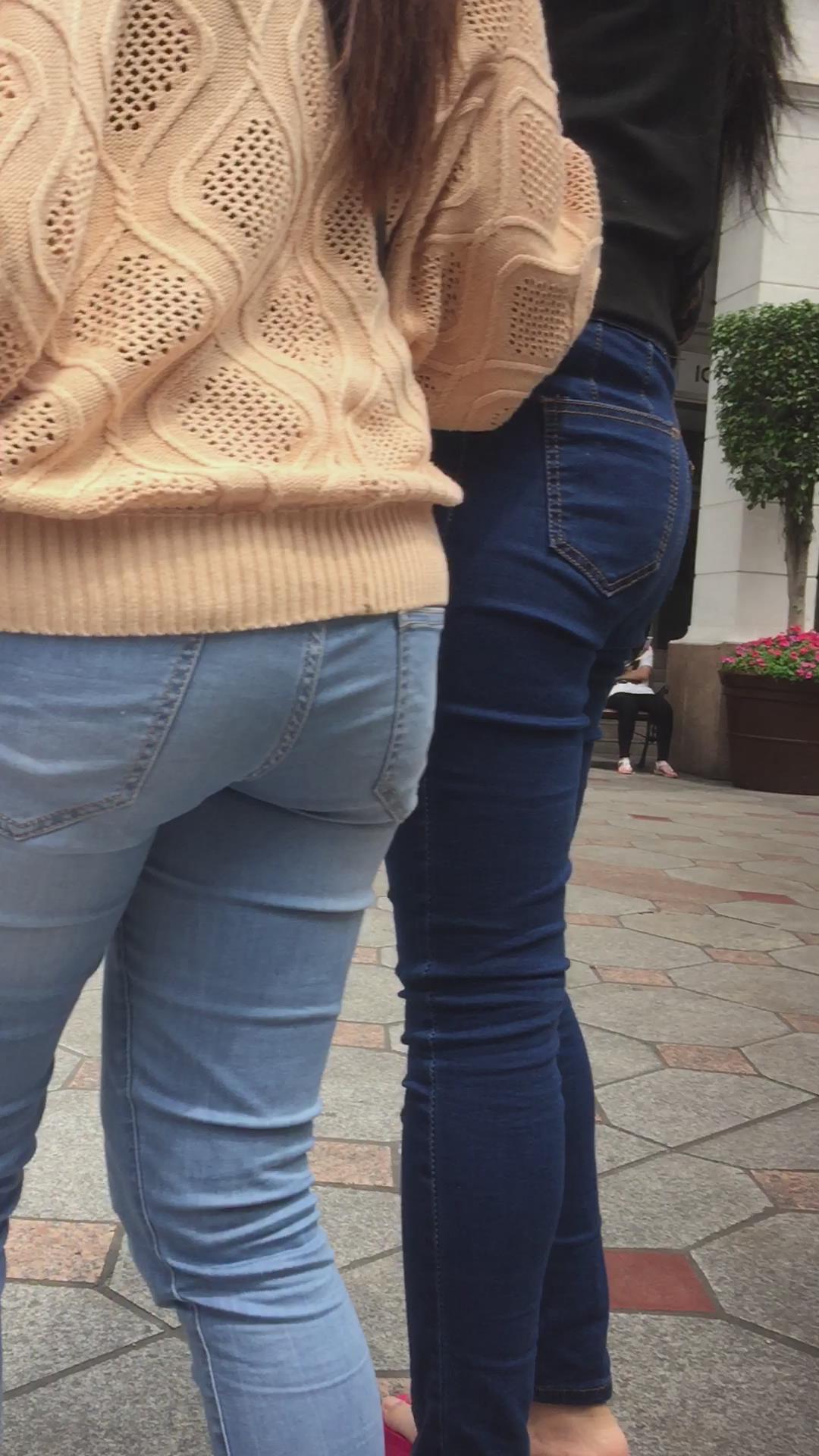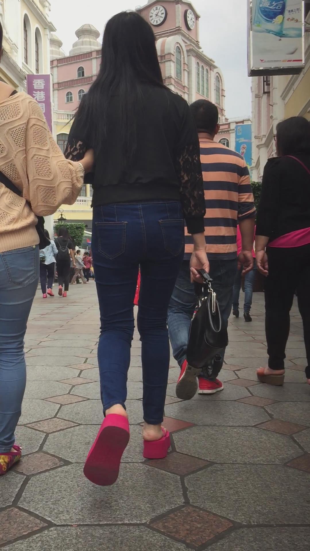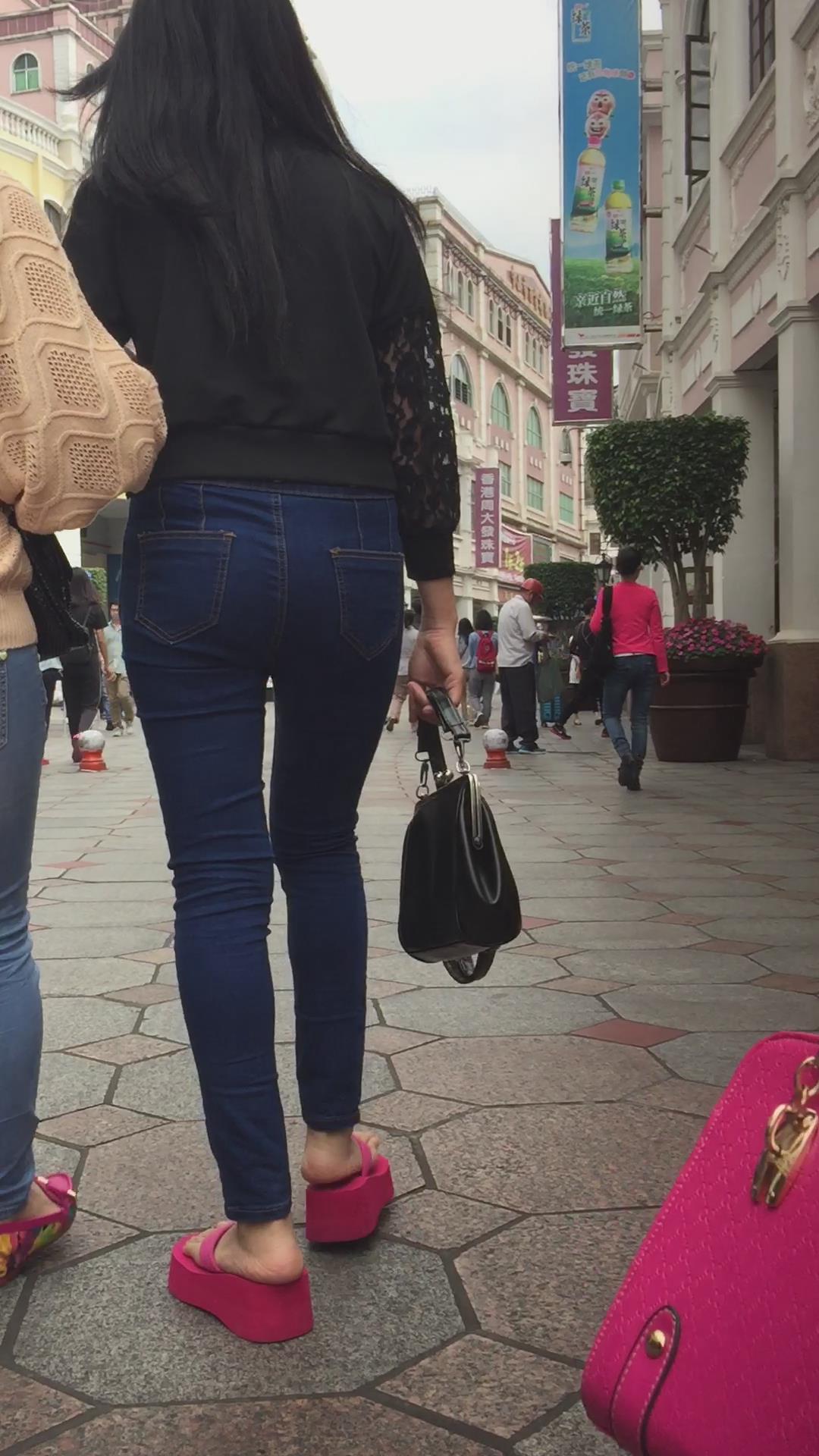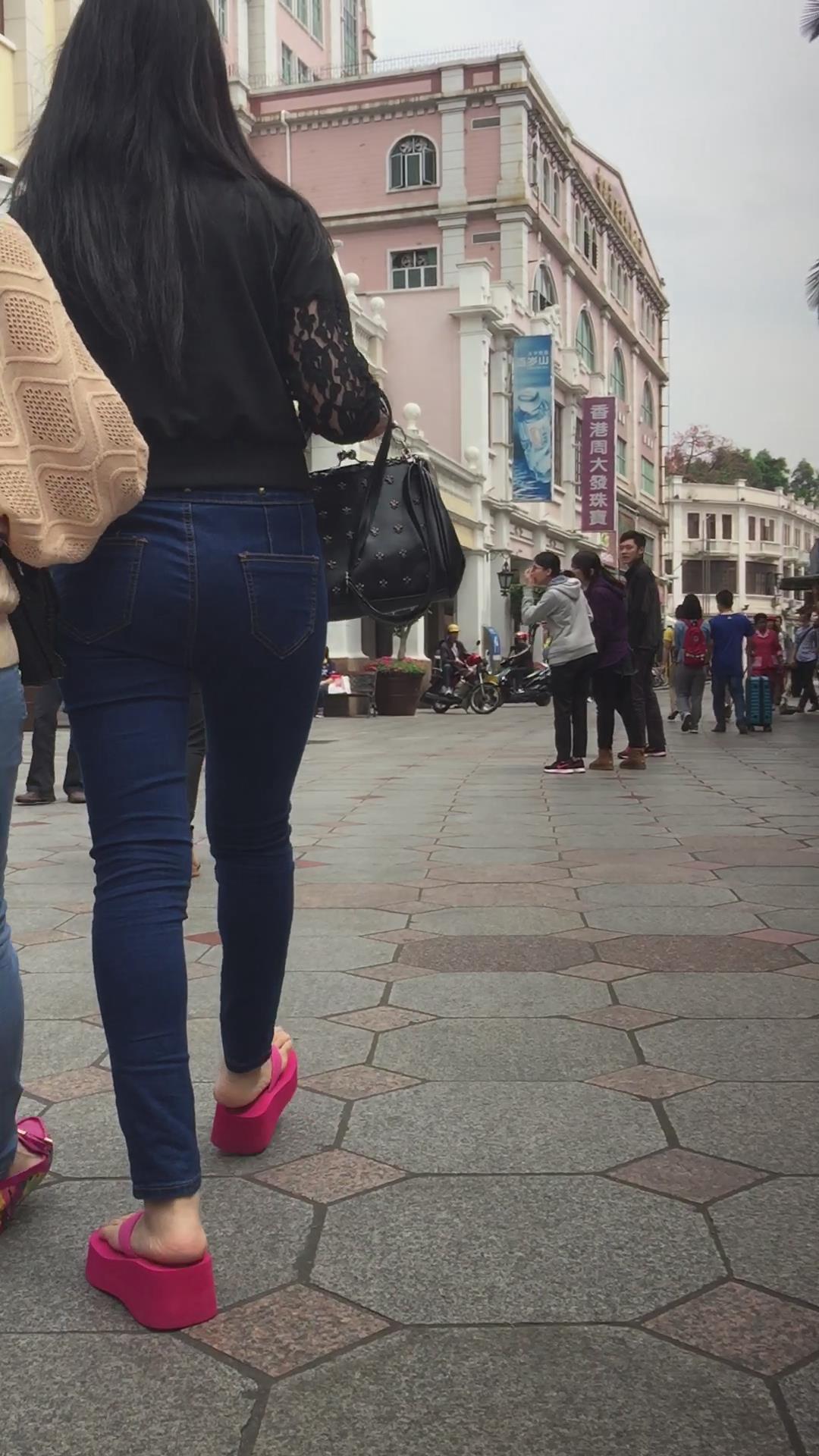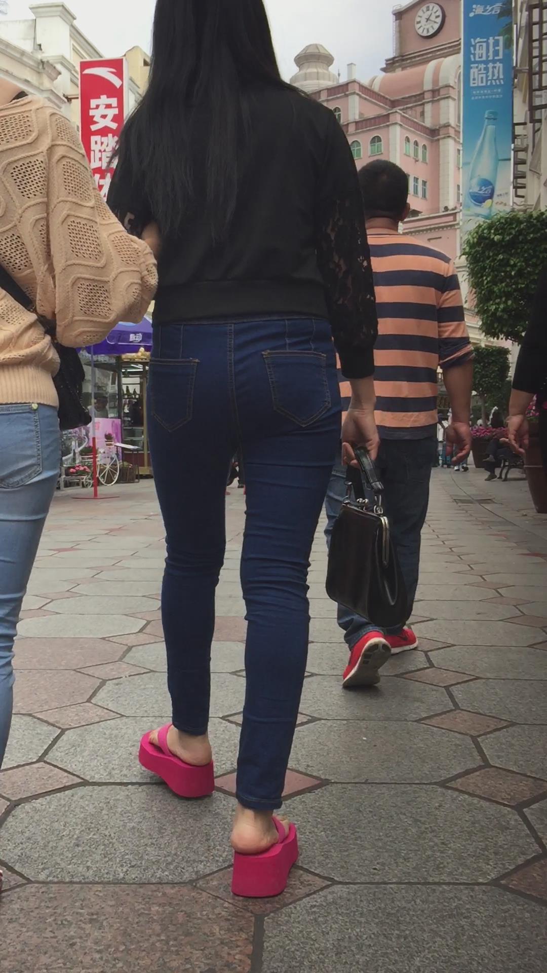 街拍红色松糕鞋紧身蓝牛翘臀妹子 编号5556