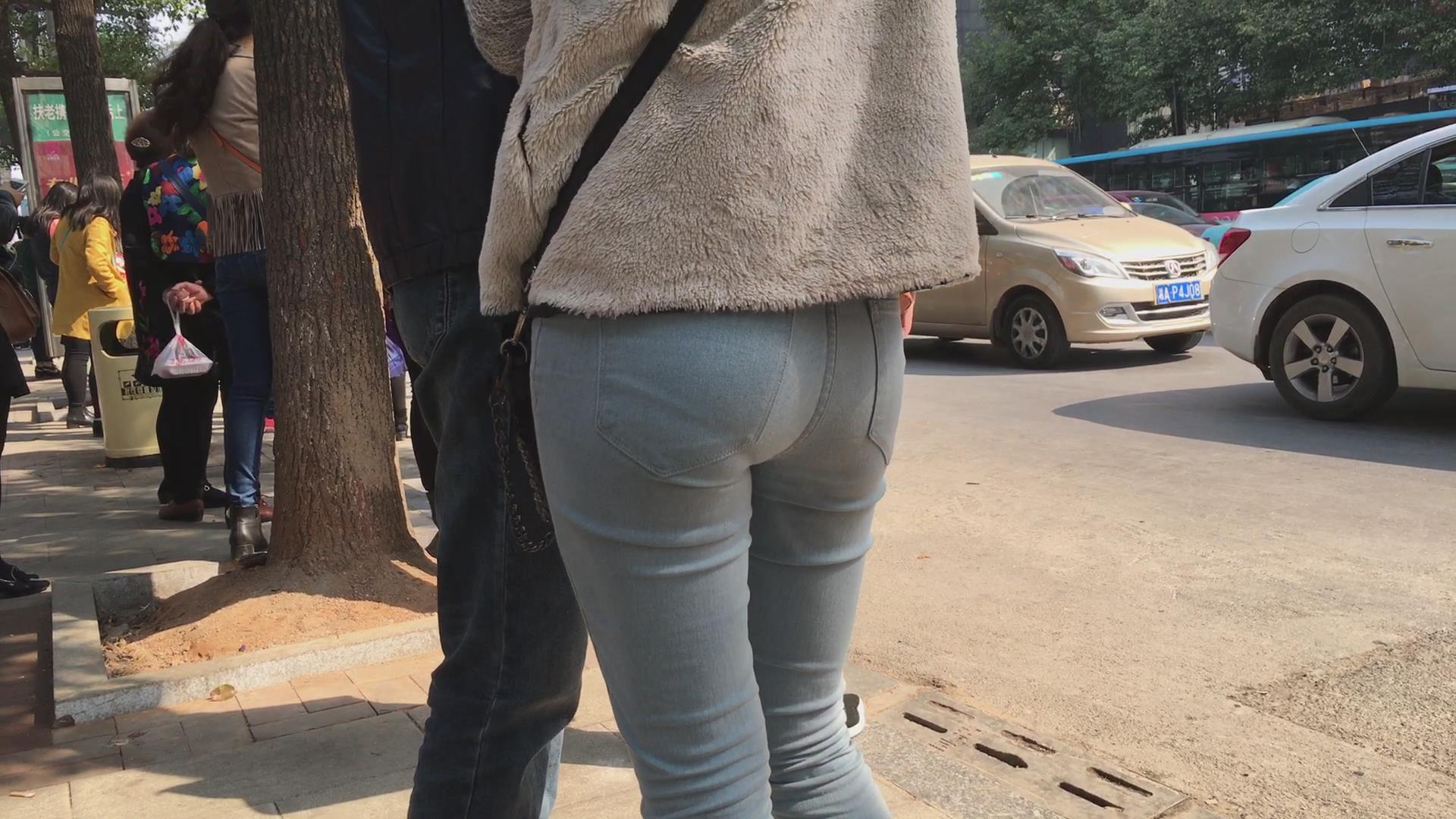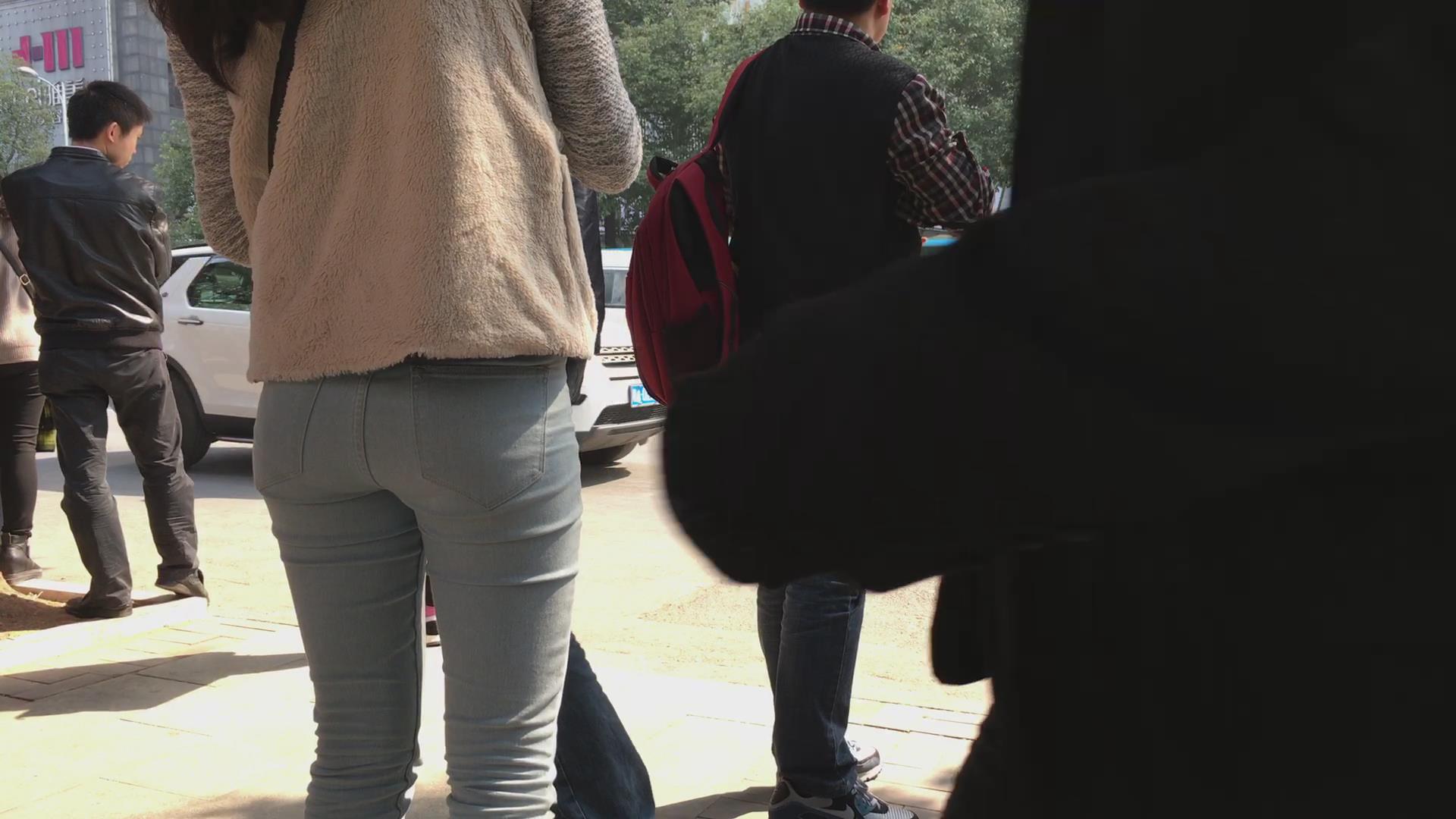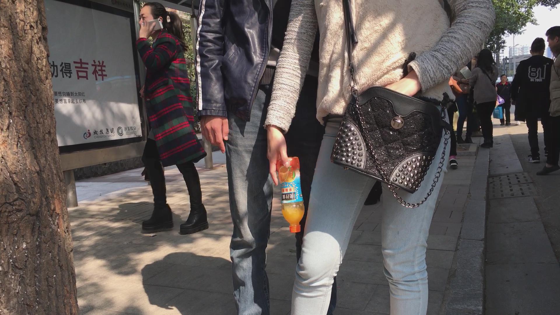 街拍蓝色紧身牛仔裤学生妹 编号5631