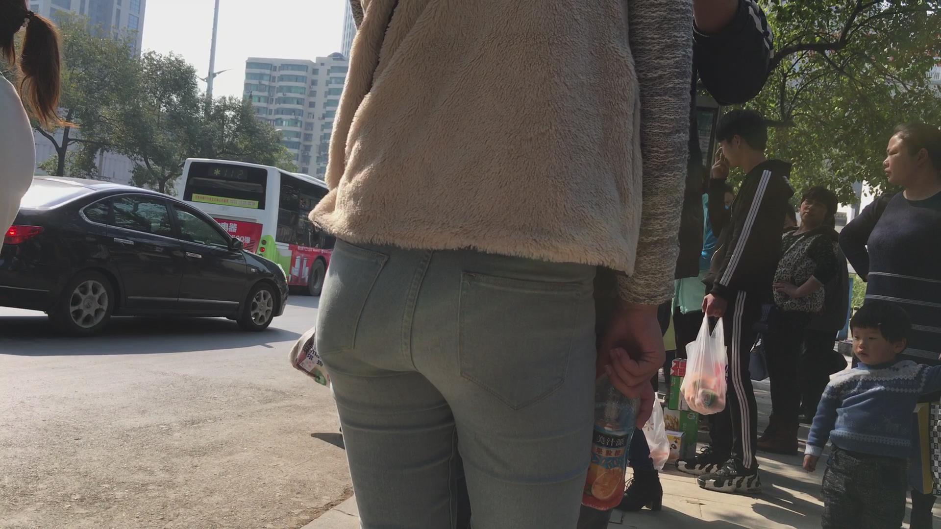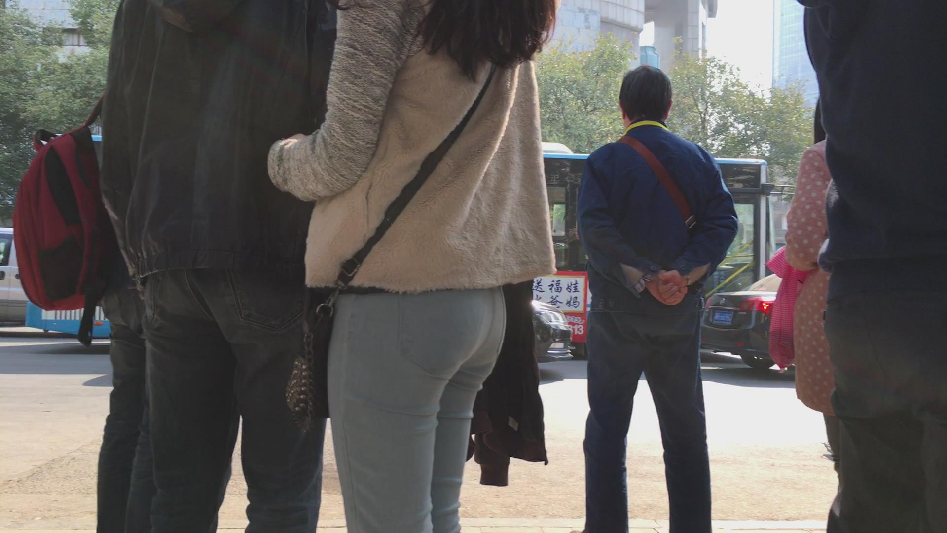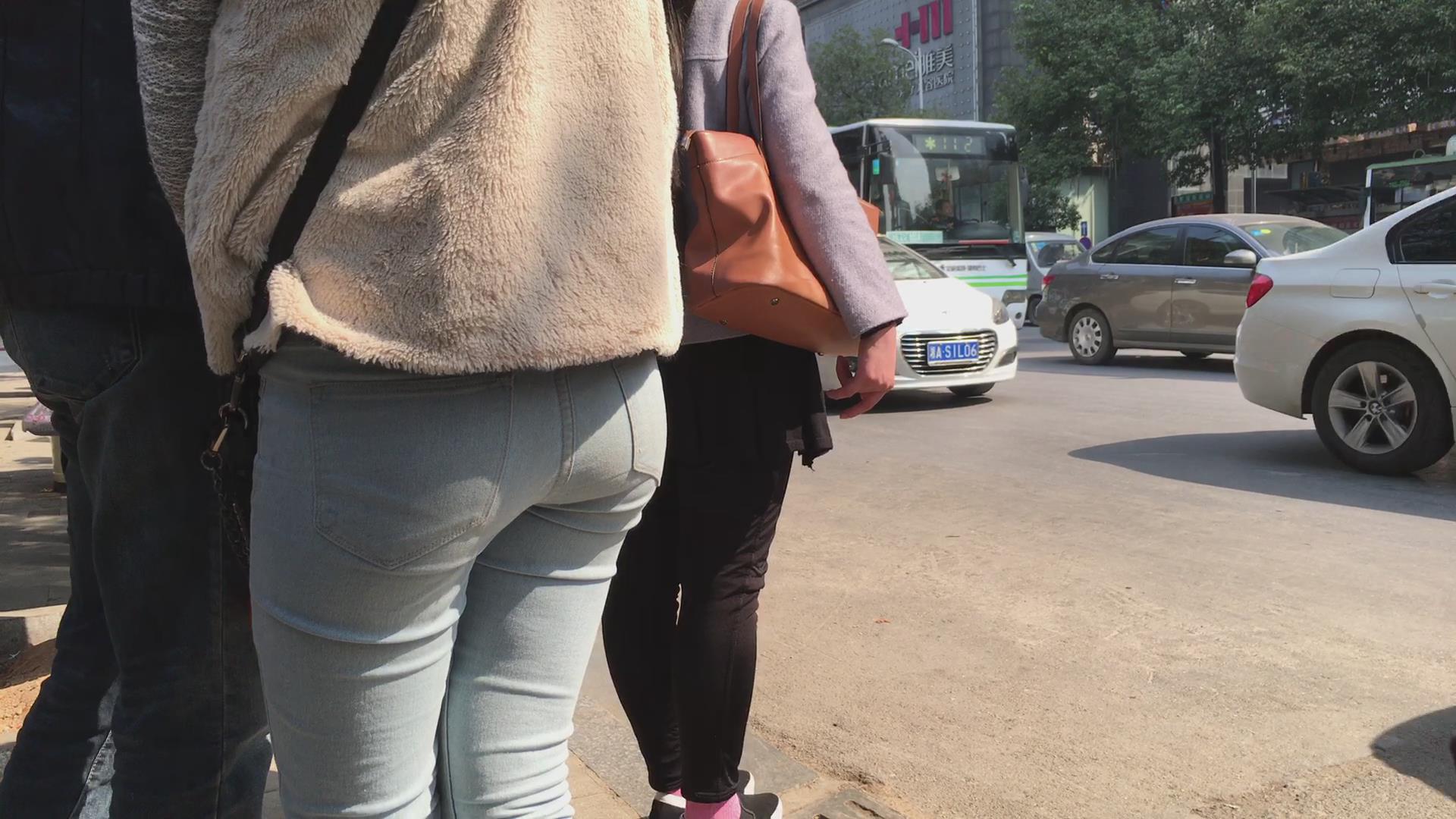 街拍蓝色紧身牛仔裤学生妹 编号5631