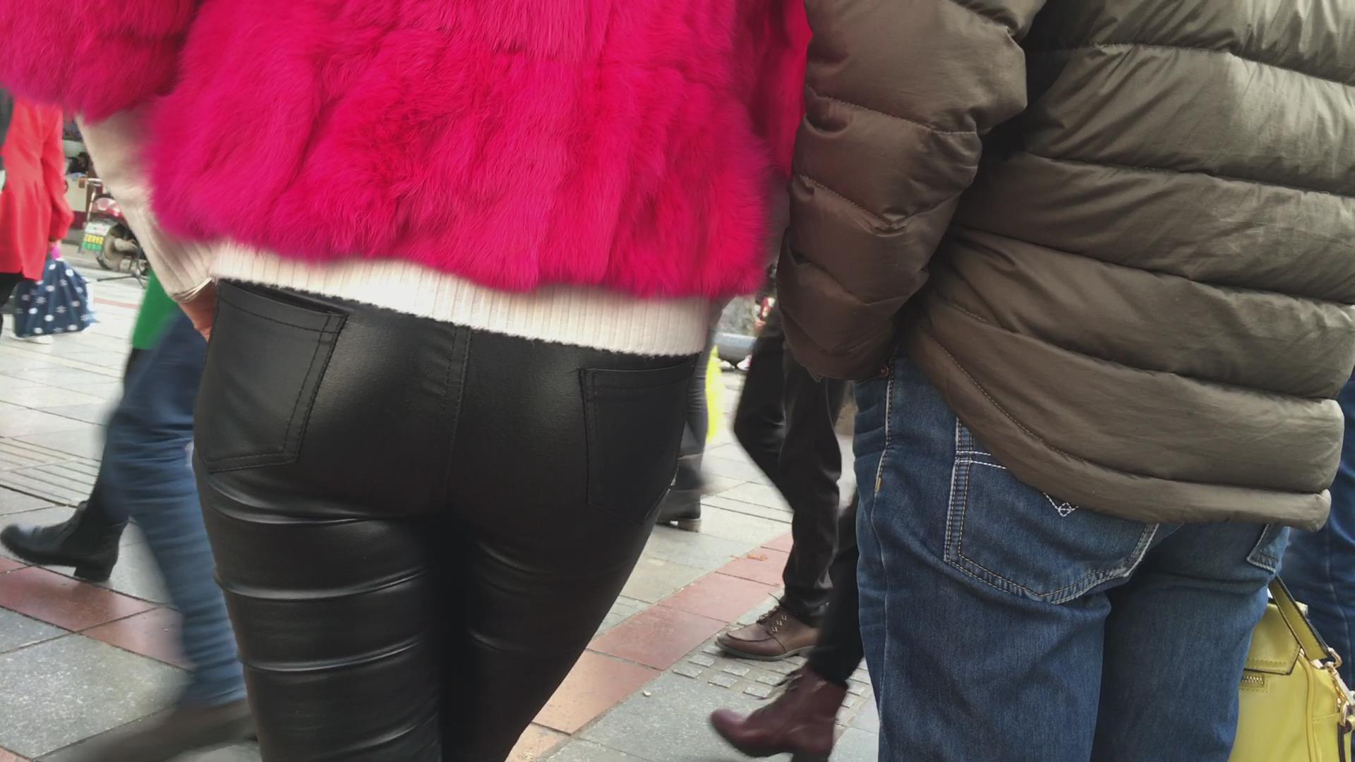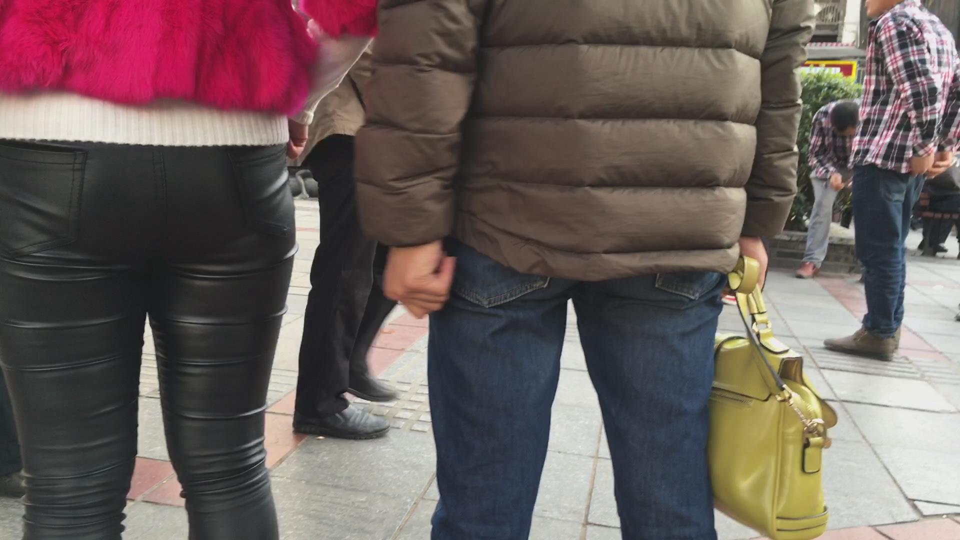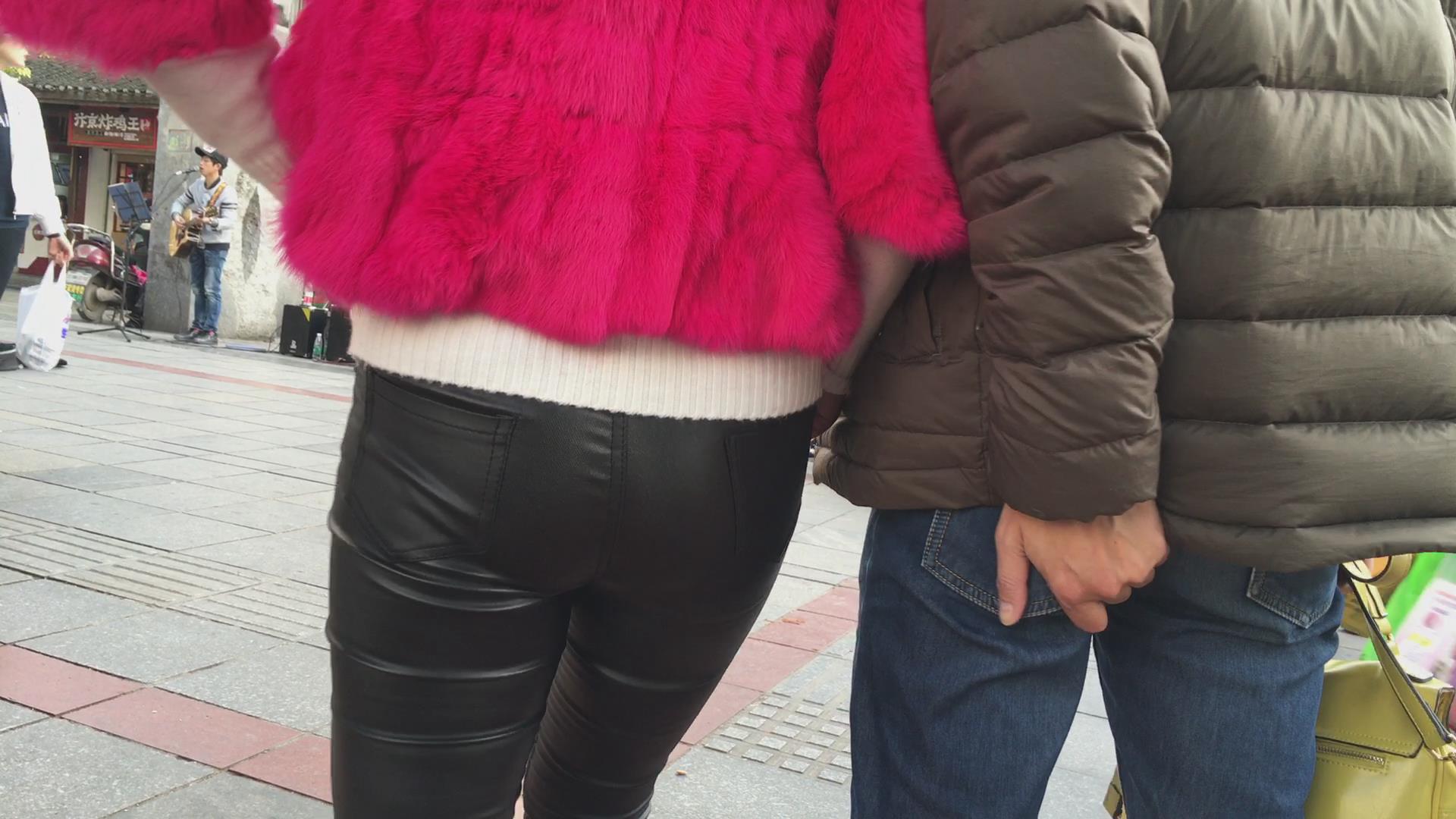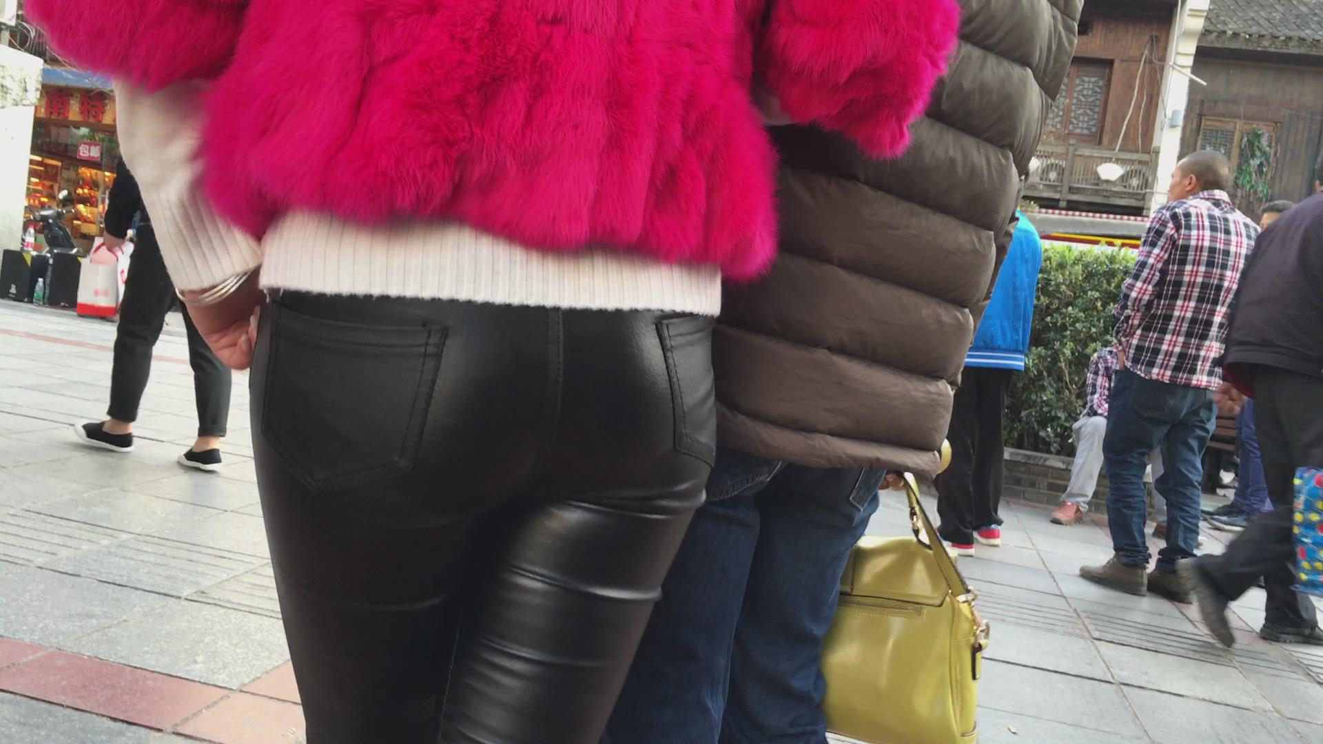 紧身黑色圆臀皮裤MM,紧绷得在太阳下都反光啦 编号5733