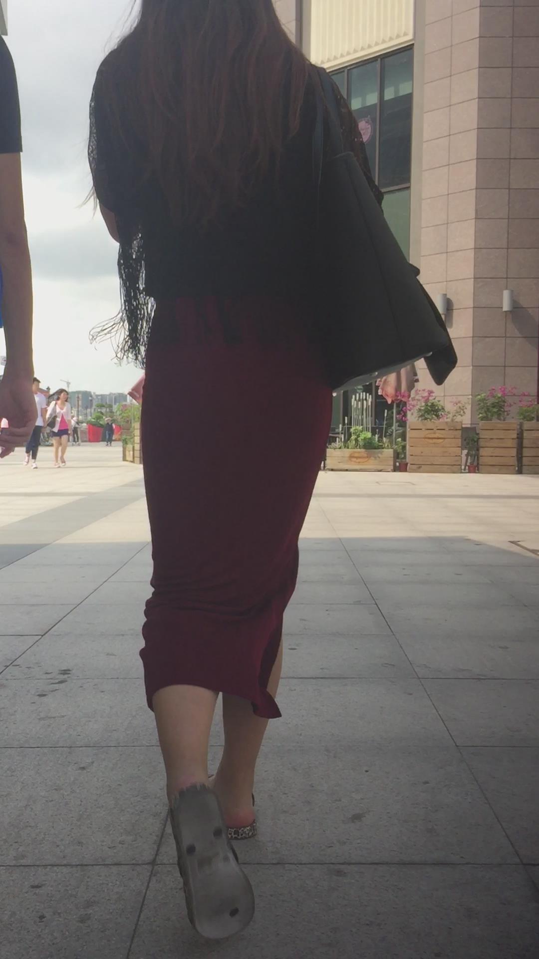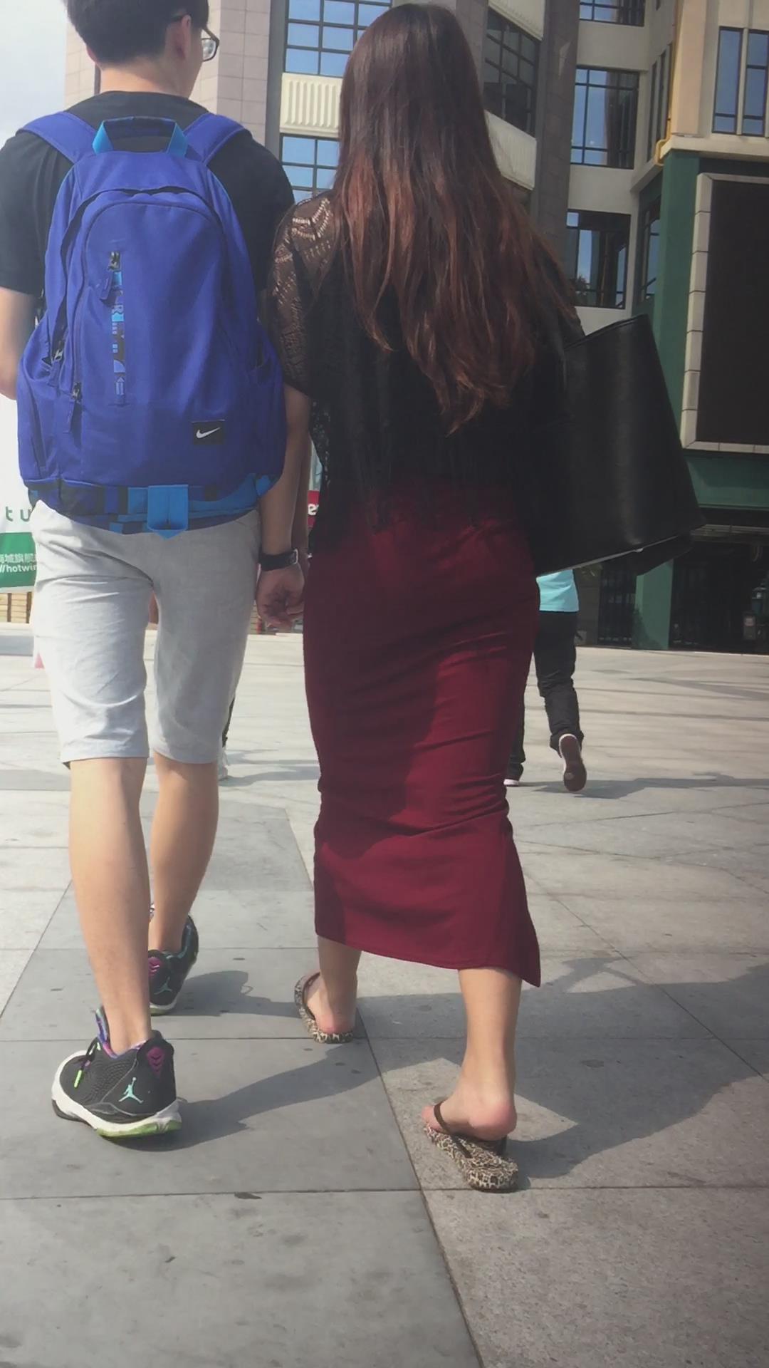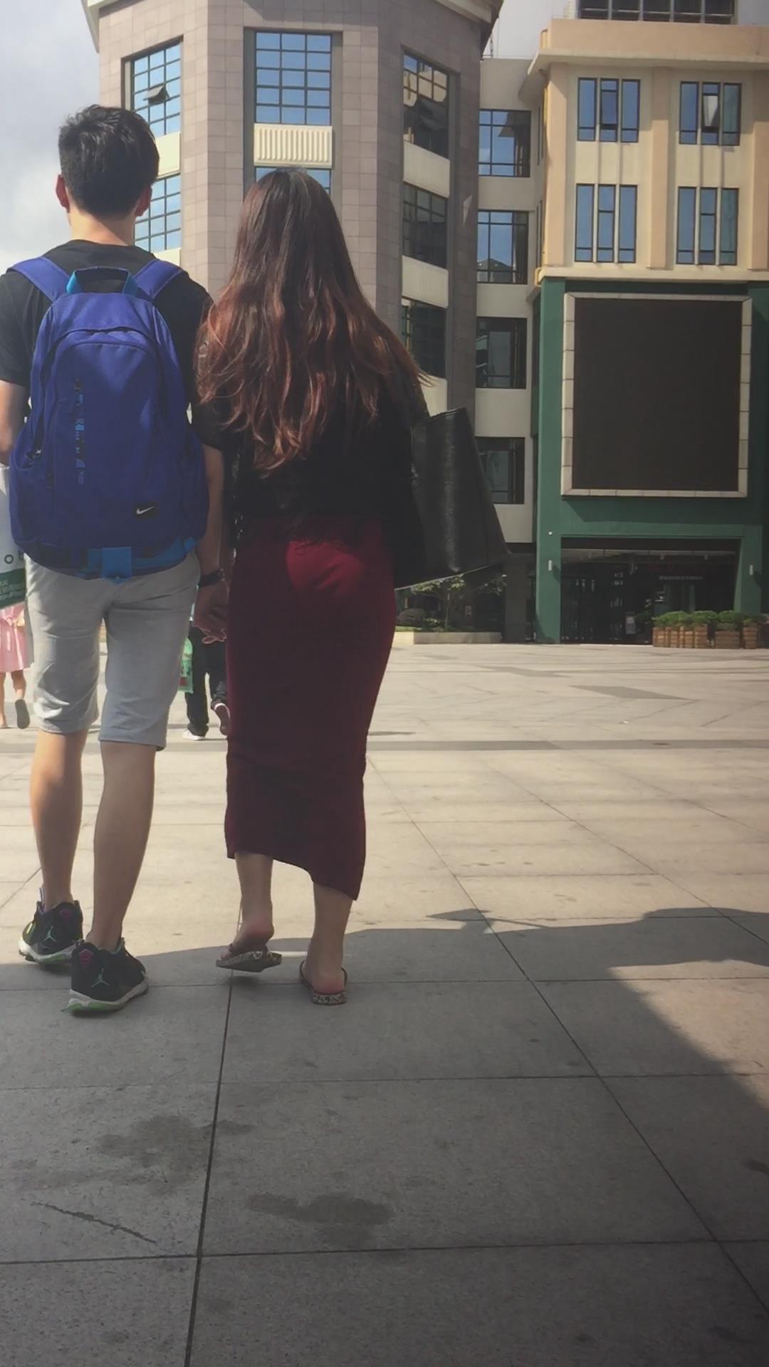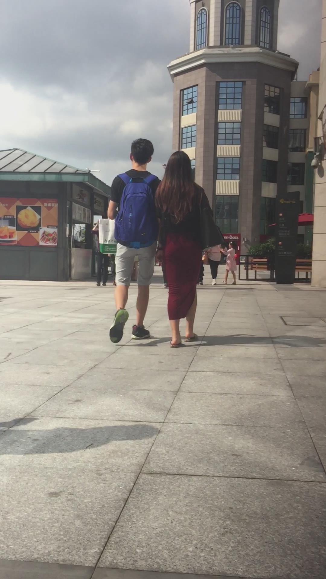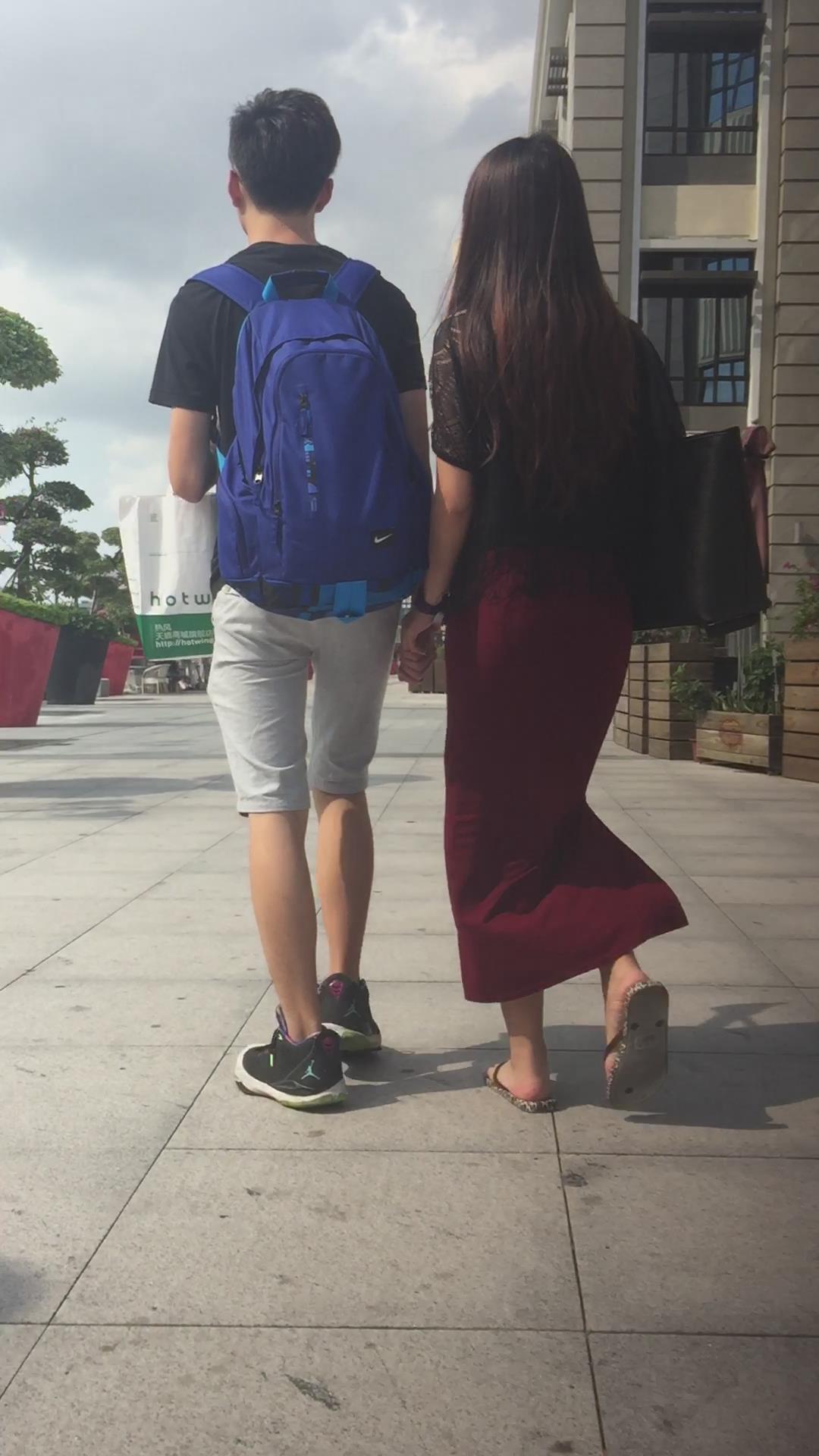 跟拍人字拖包臀大红长裙美女,跟小男友手拉手很恩爱 编号5737