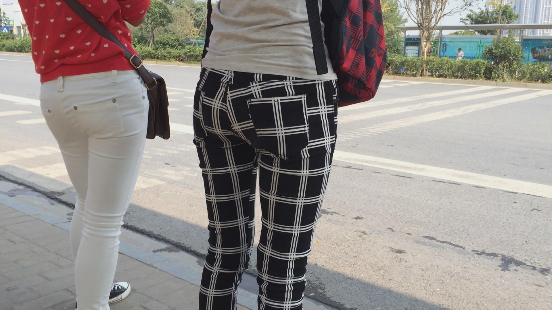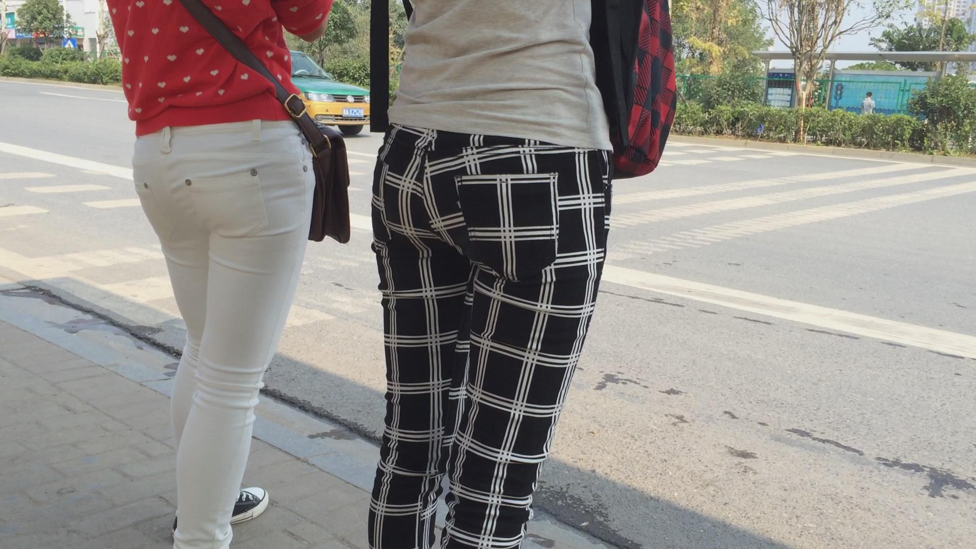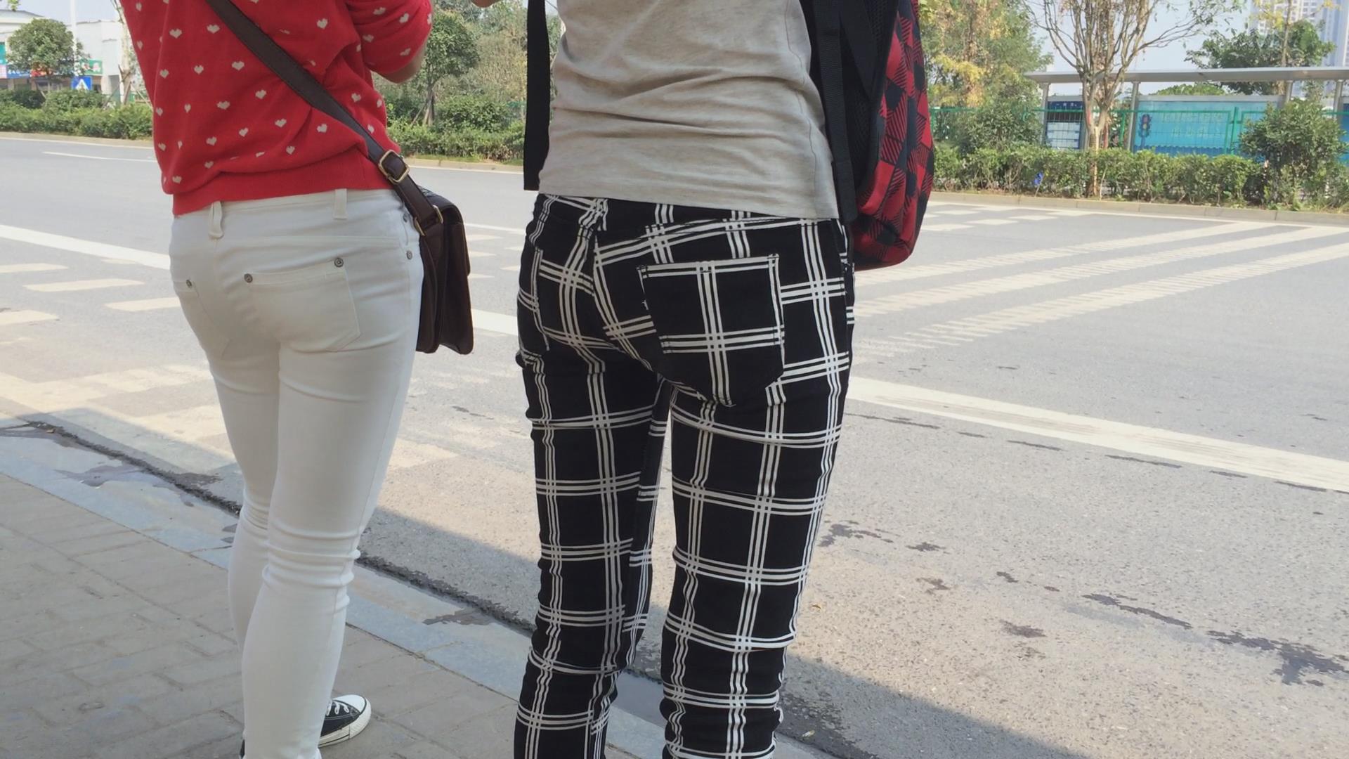紧身翘臀白裤姐妹花等车,不相上下的美 编号5774