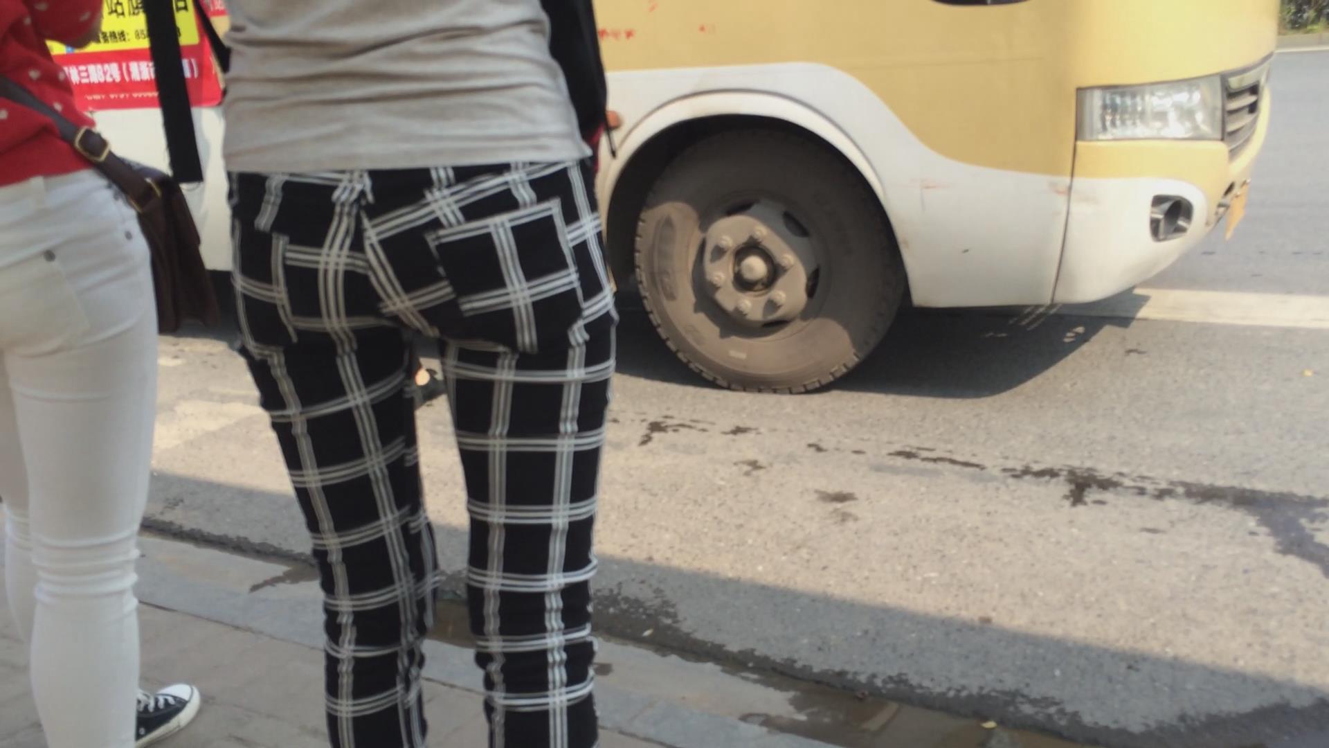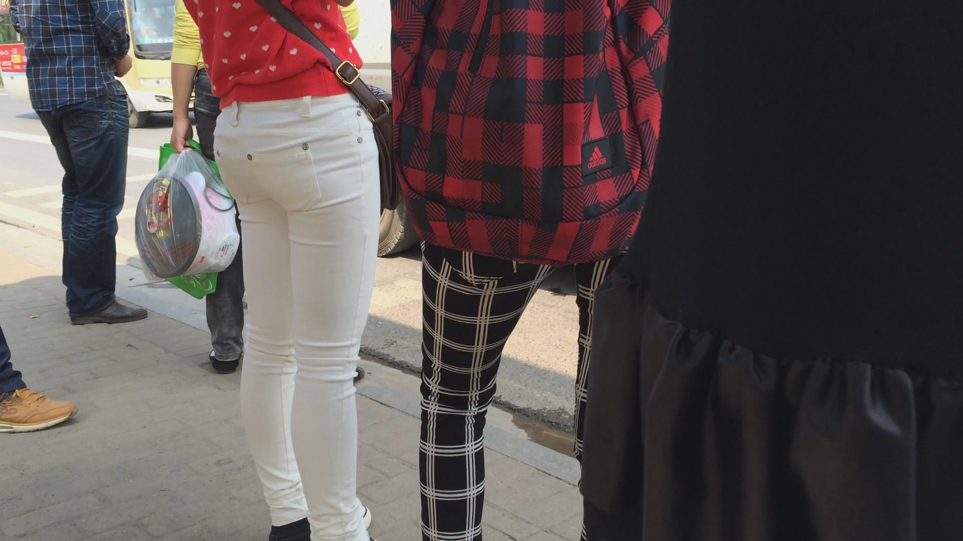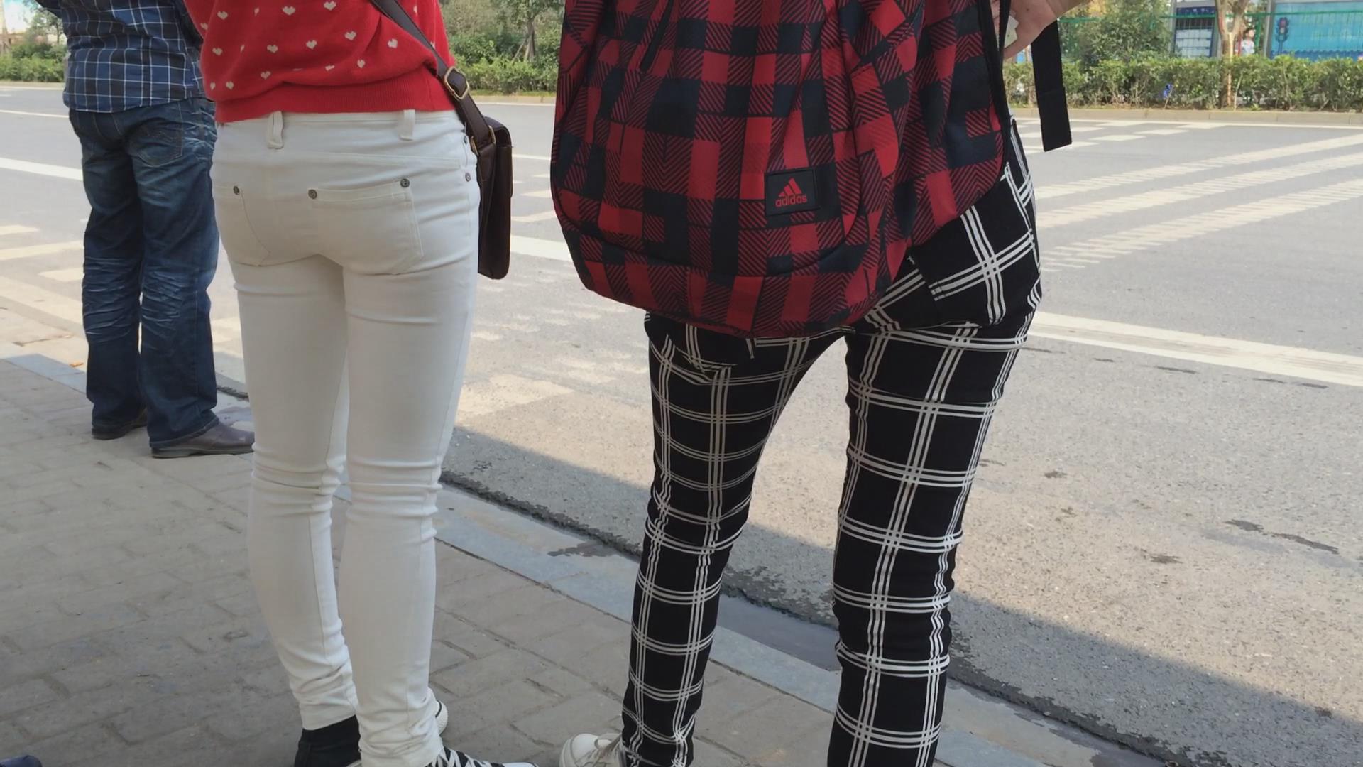 紧身翘臀白裤姐妹花等车,不相上下的美 编号5774