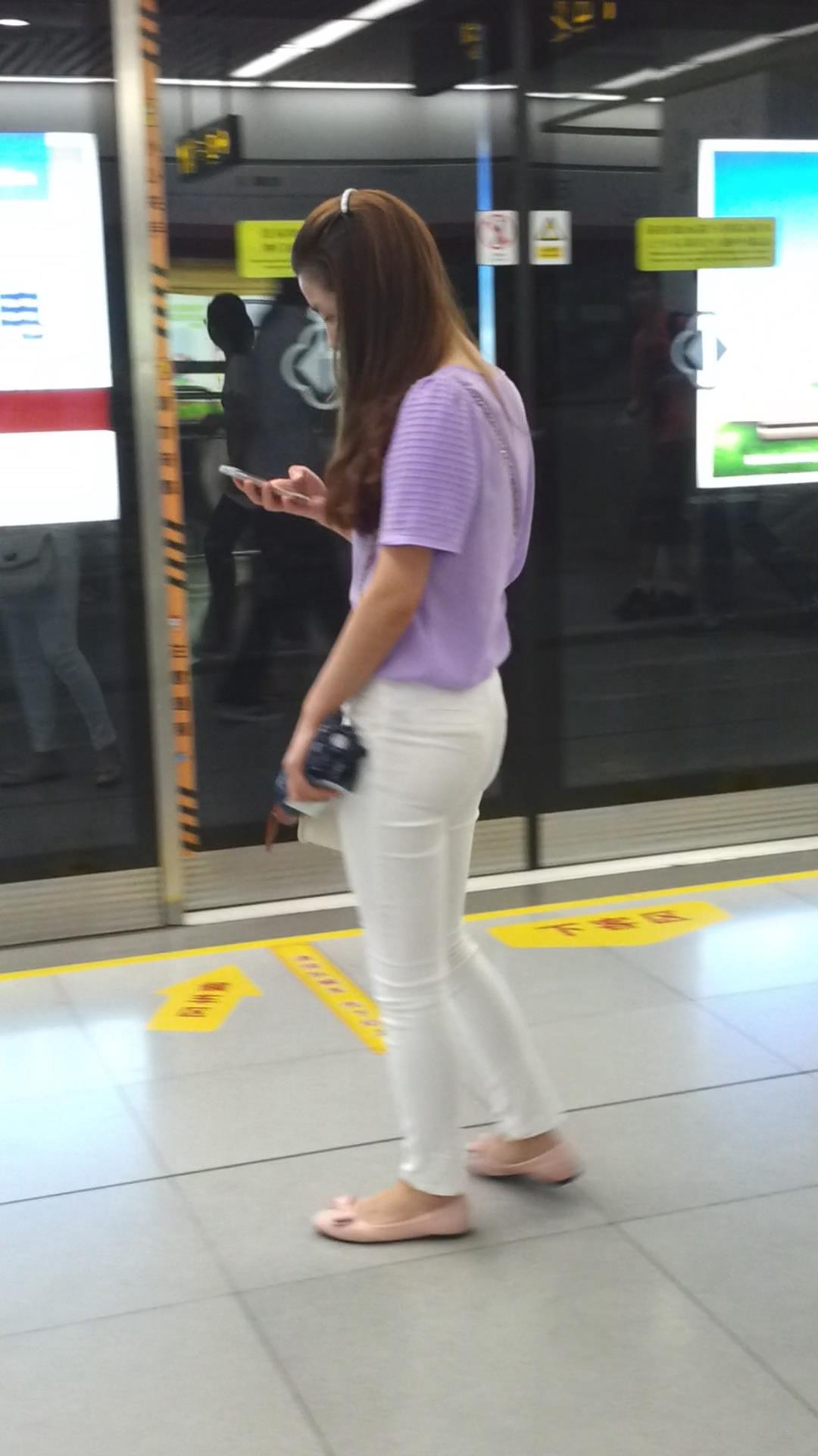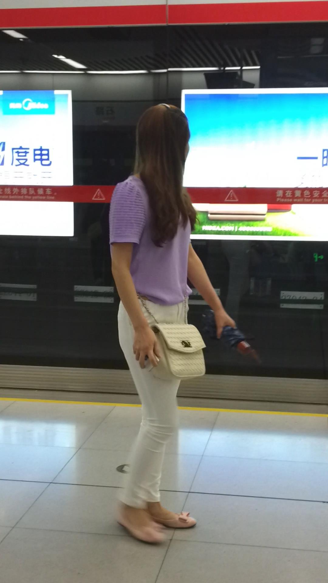 街拍等地铁的紧身白裤平底鞋美眉 编号5796