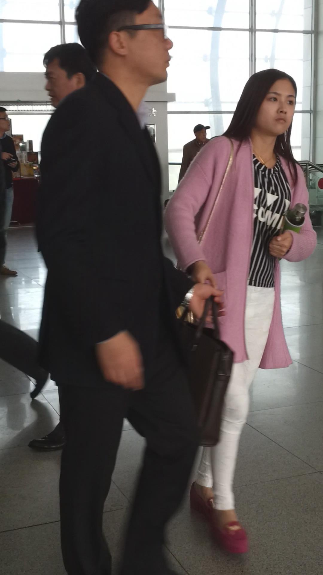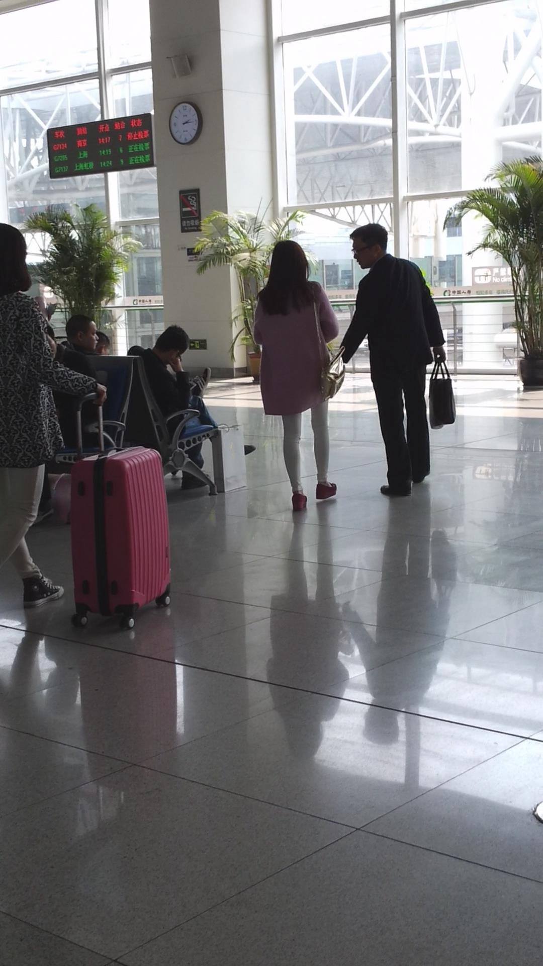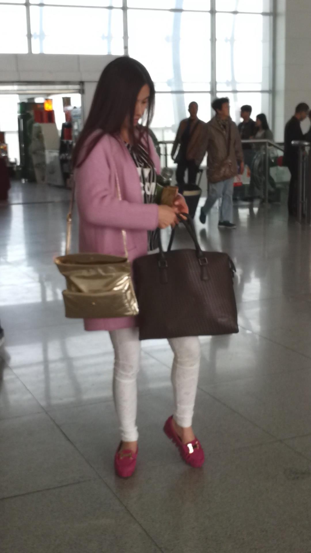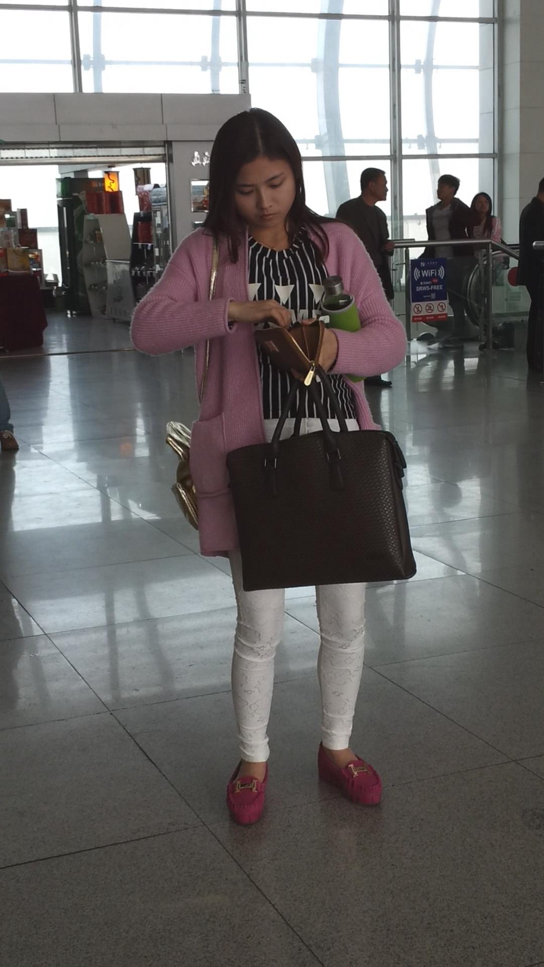 车站拍摄粉衣白色紧身裤长发美女 编号5797