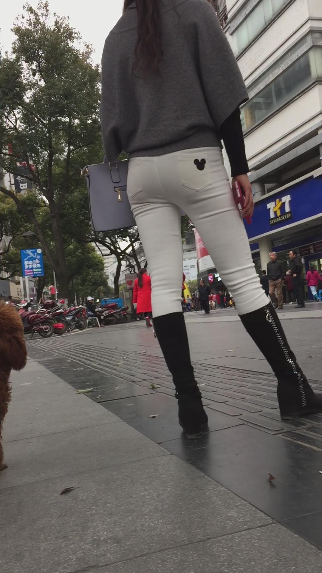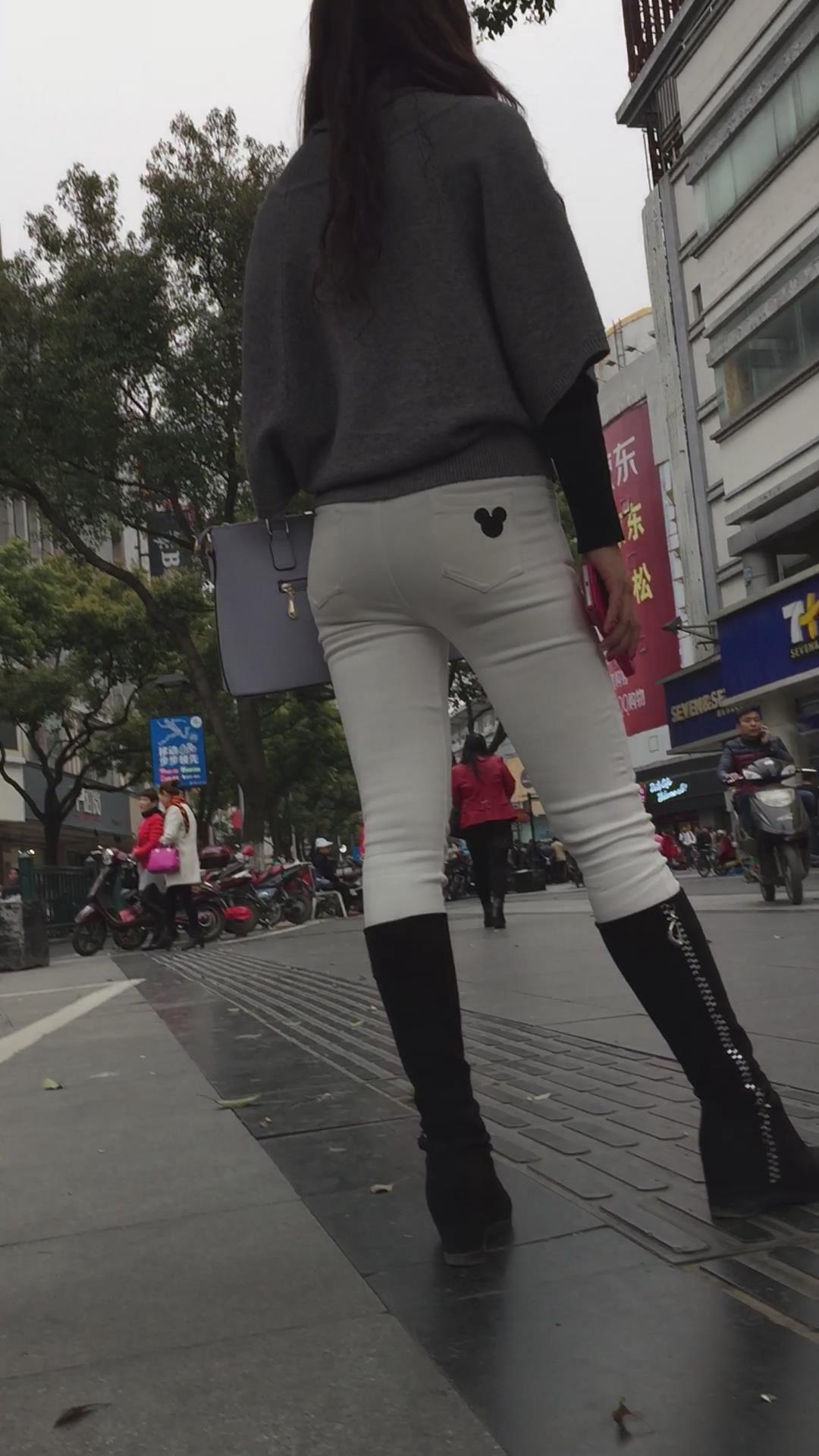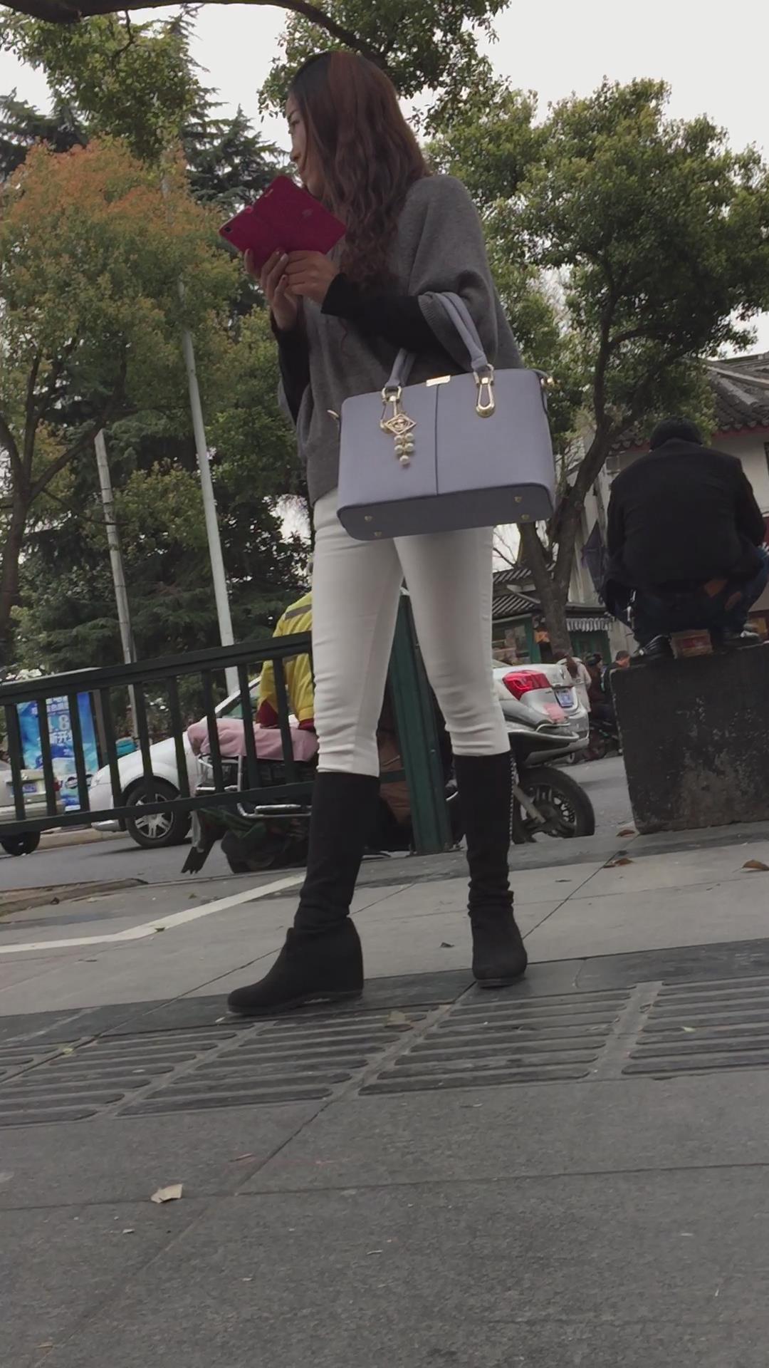 街拍紧身白裤长筒靴美少妇在等密友! 编号5807