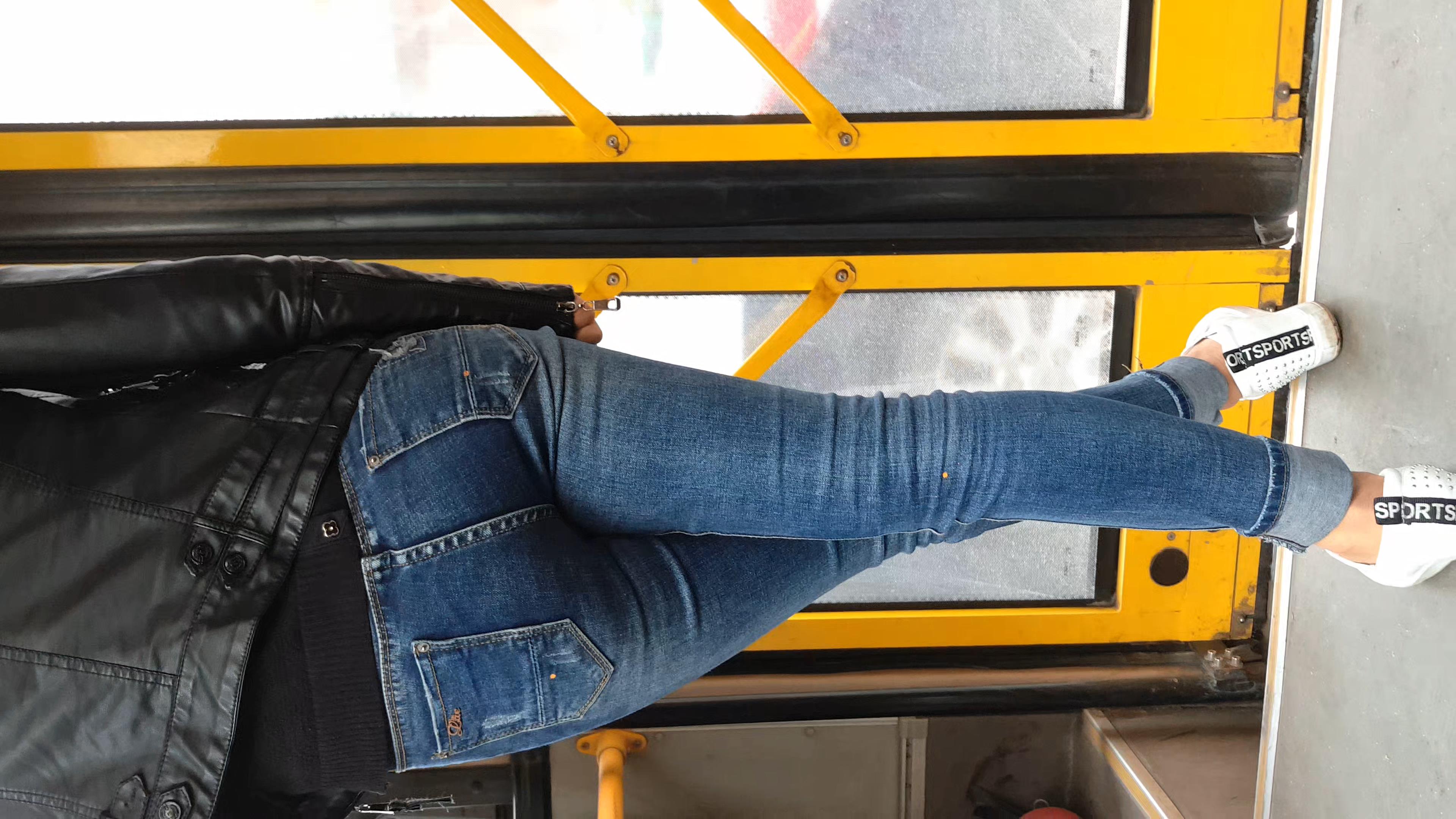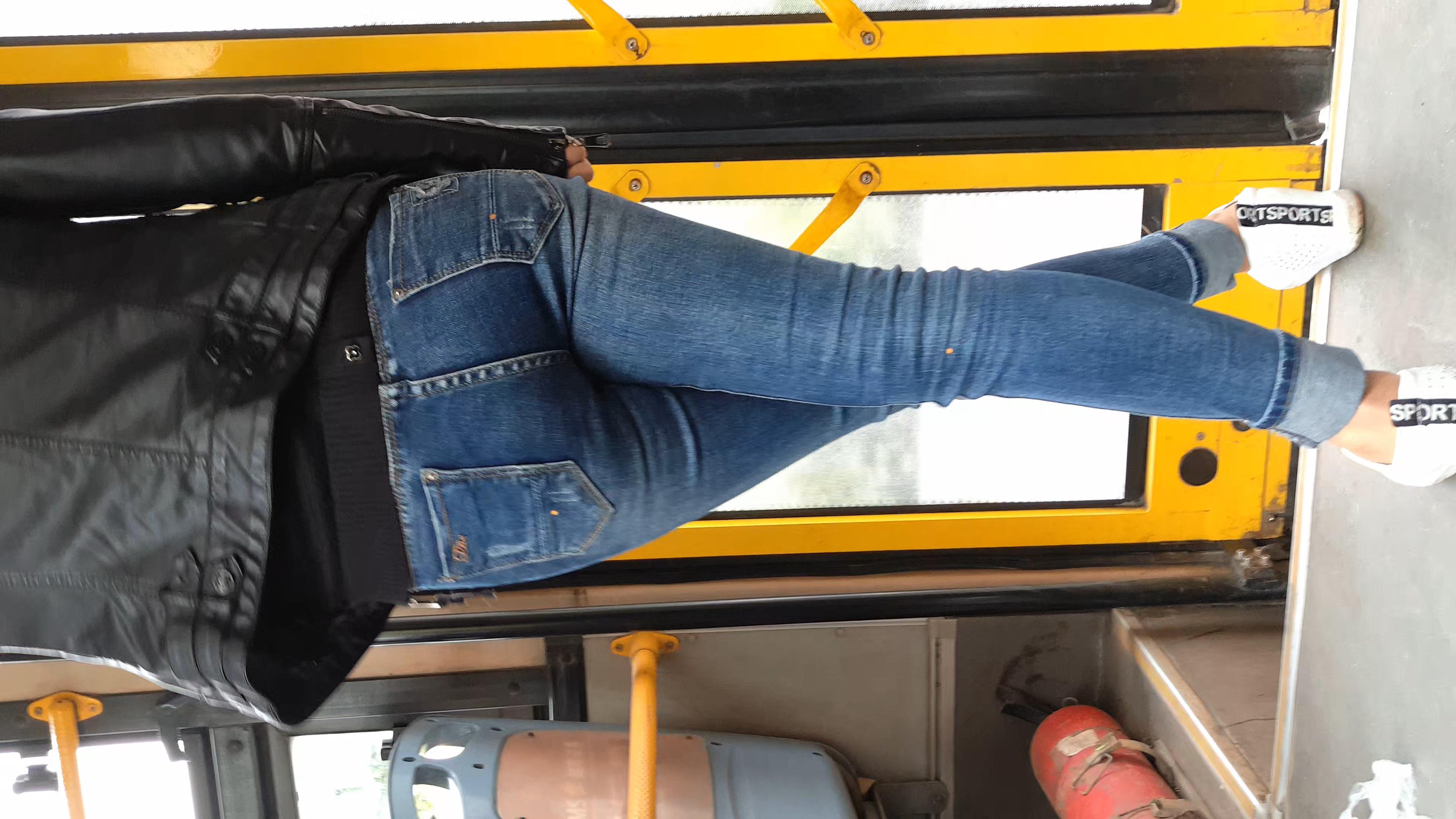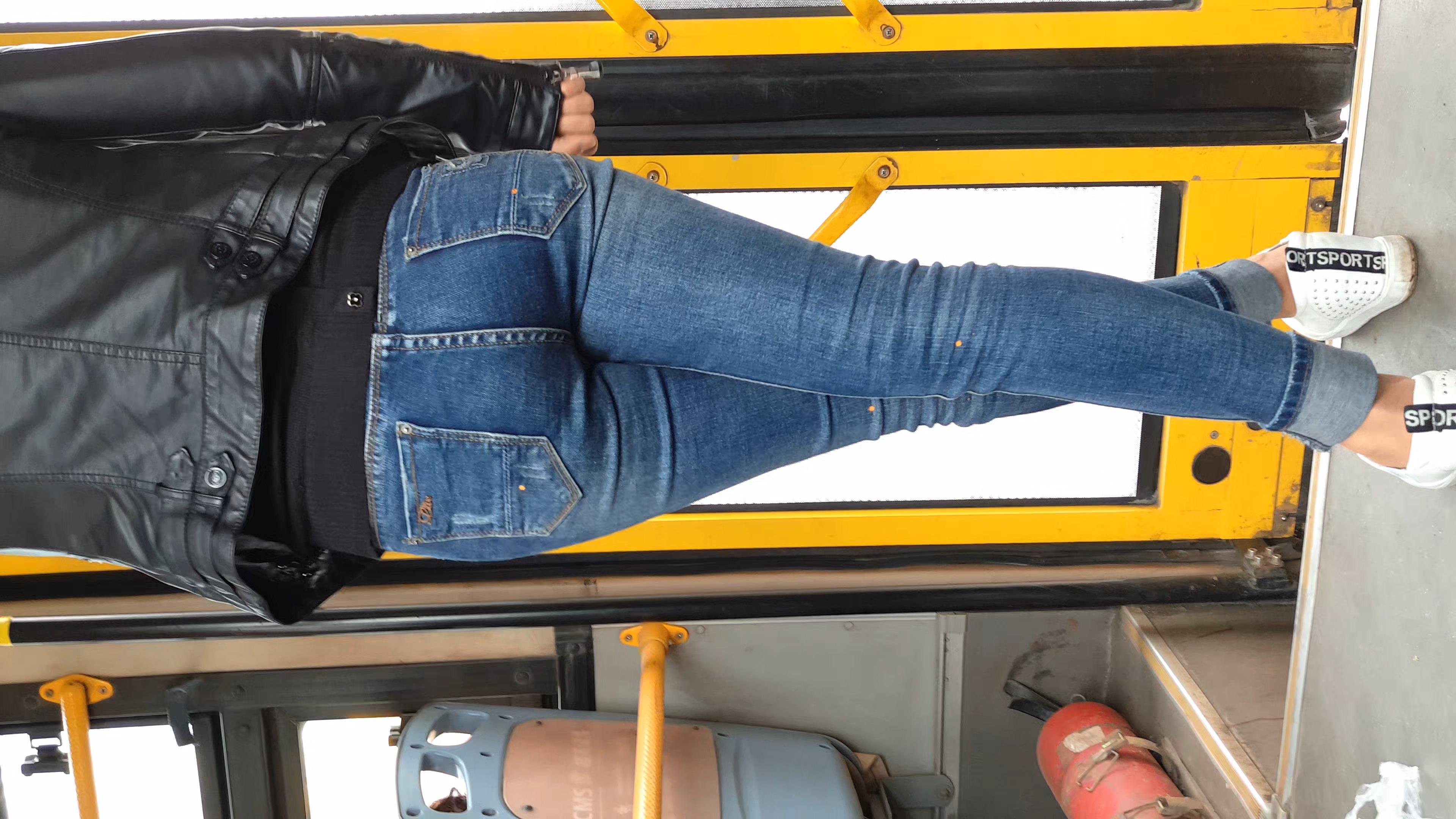 公交偶遇紧身蓝色牛仔裤翘臀美眉交叉腿站着 编号5827