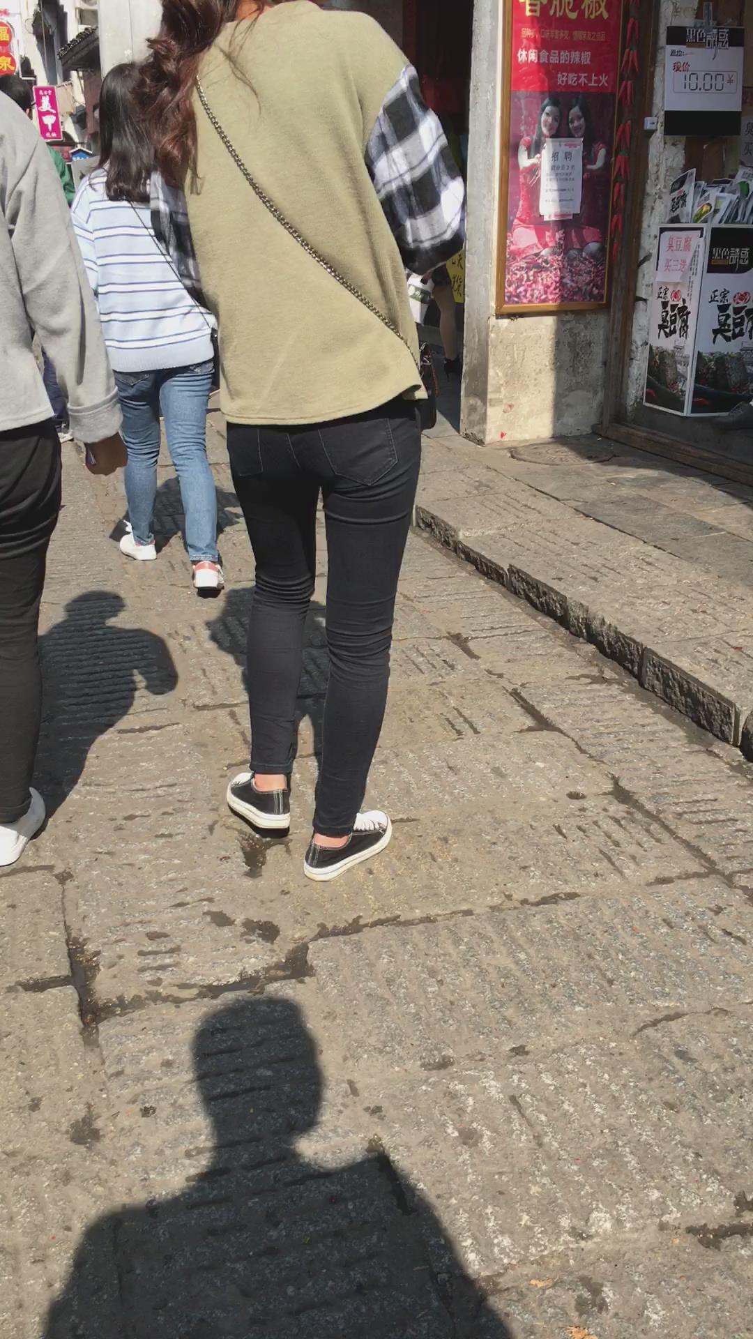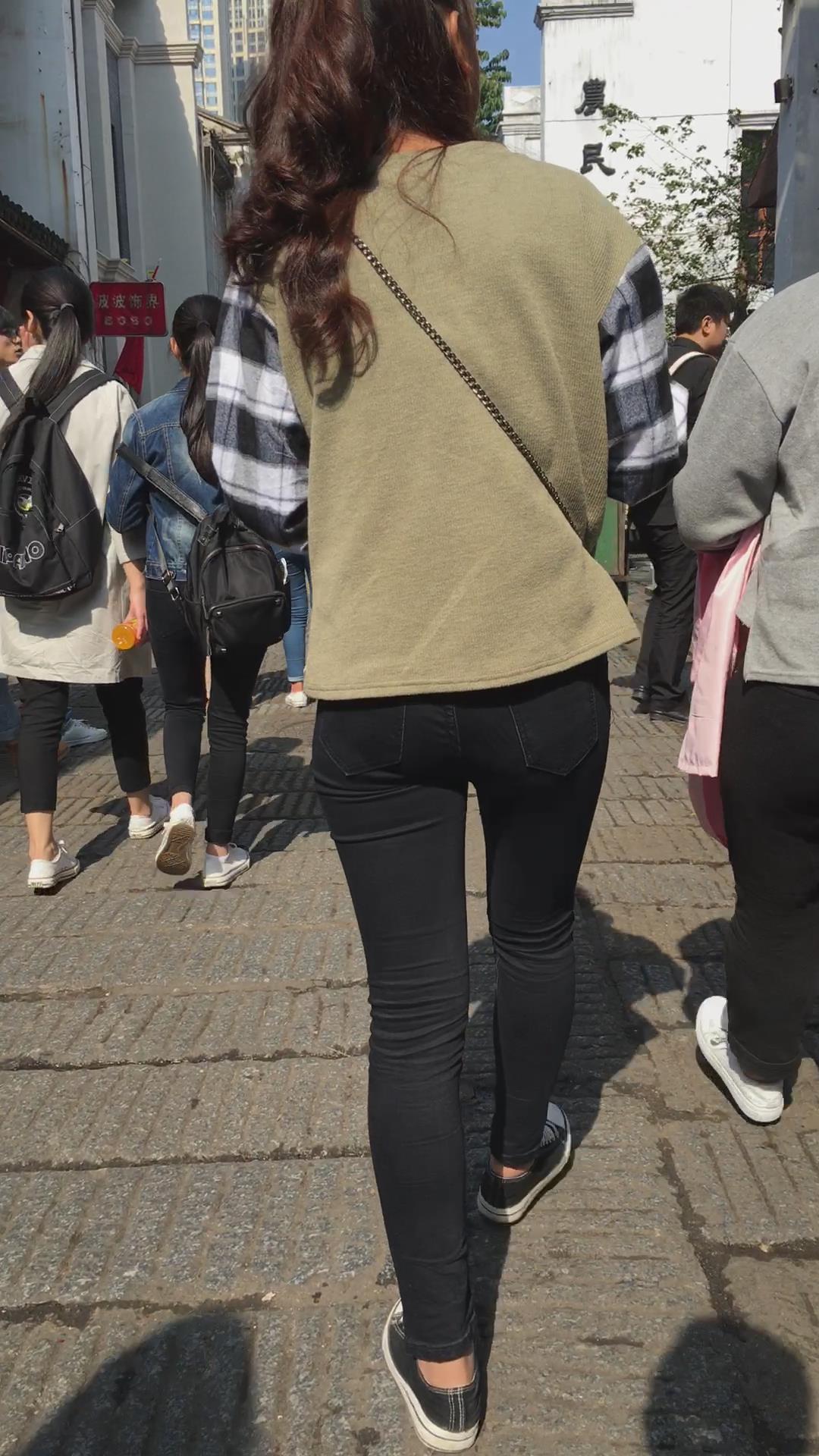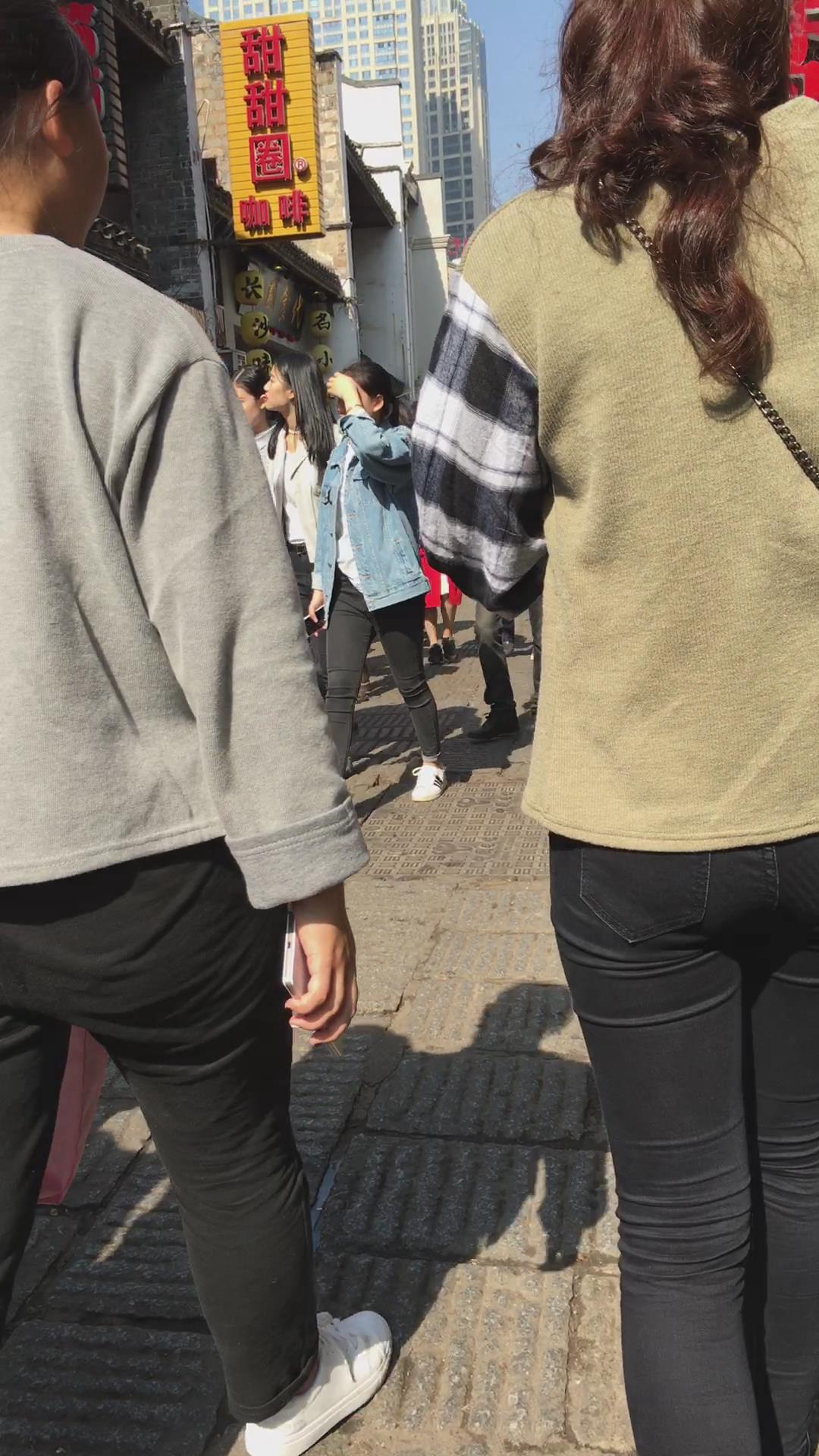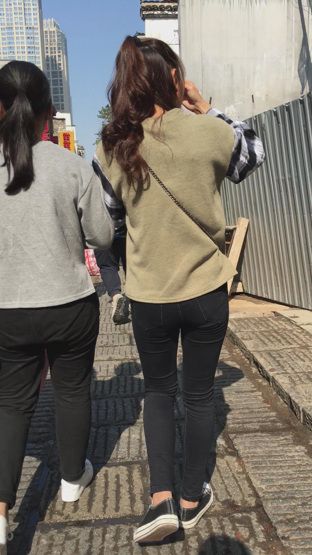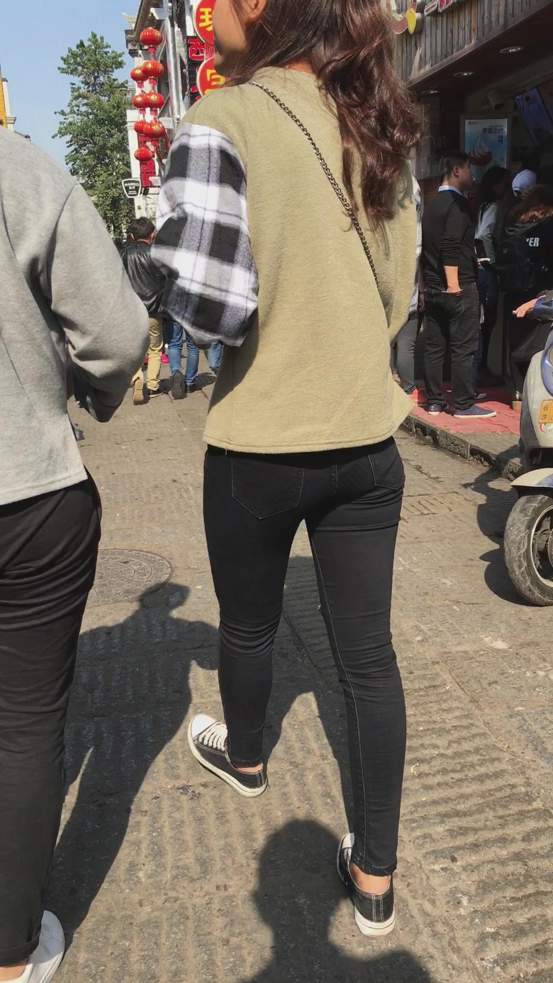 街拍马尾辫清纯黑色紧身裤美女 编号5842