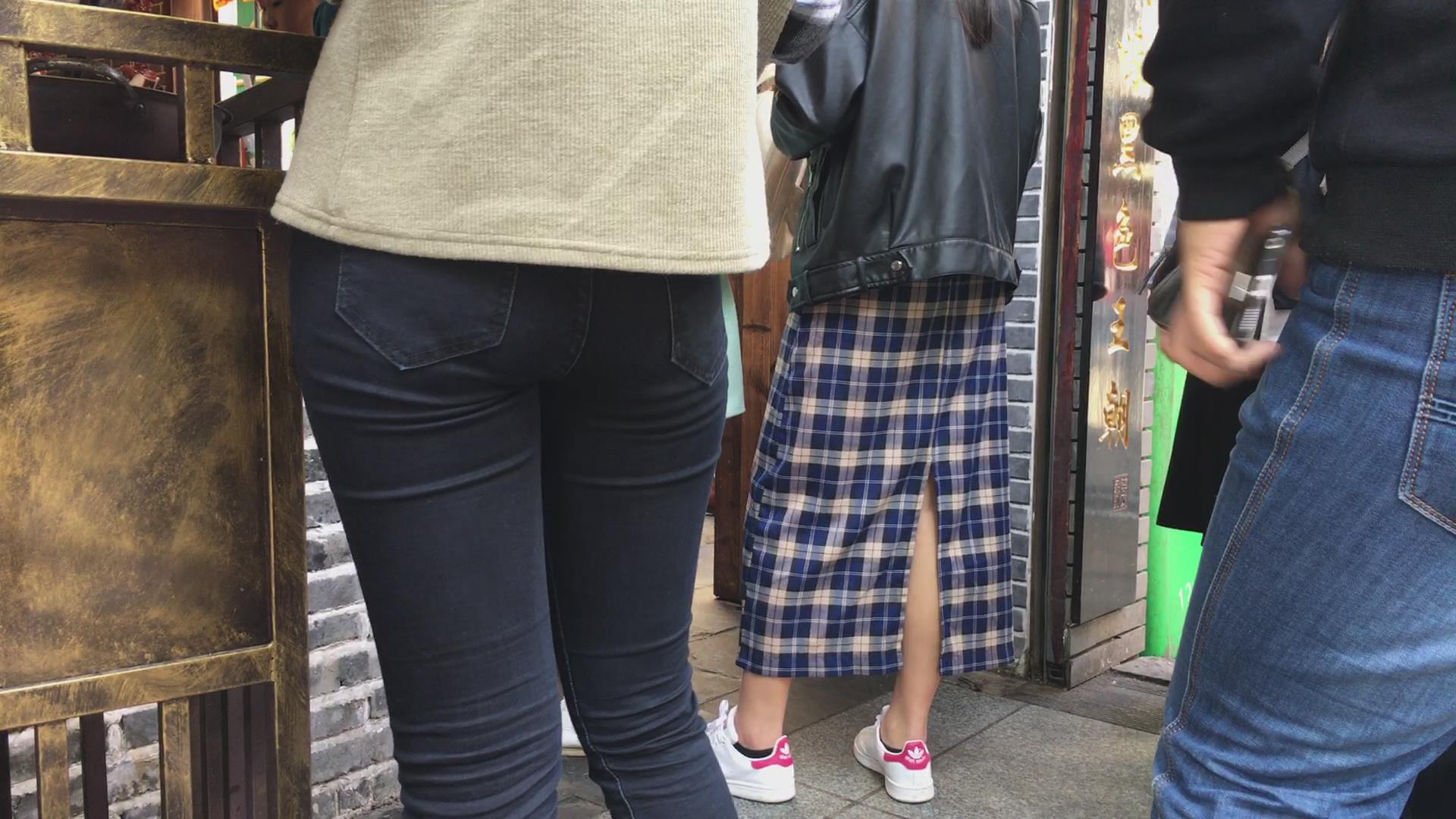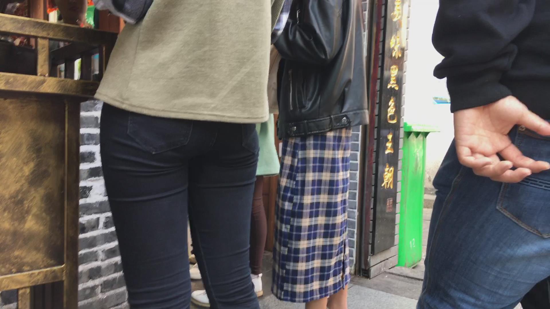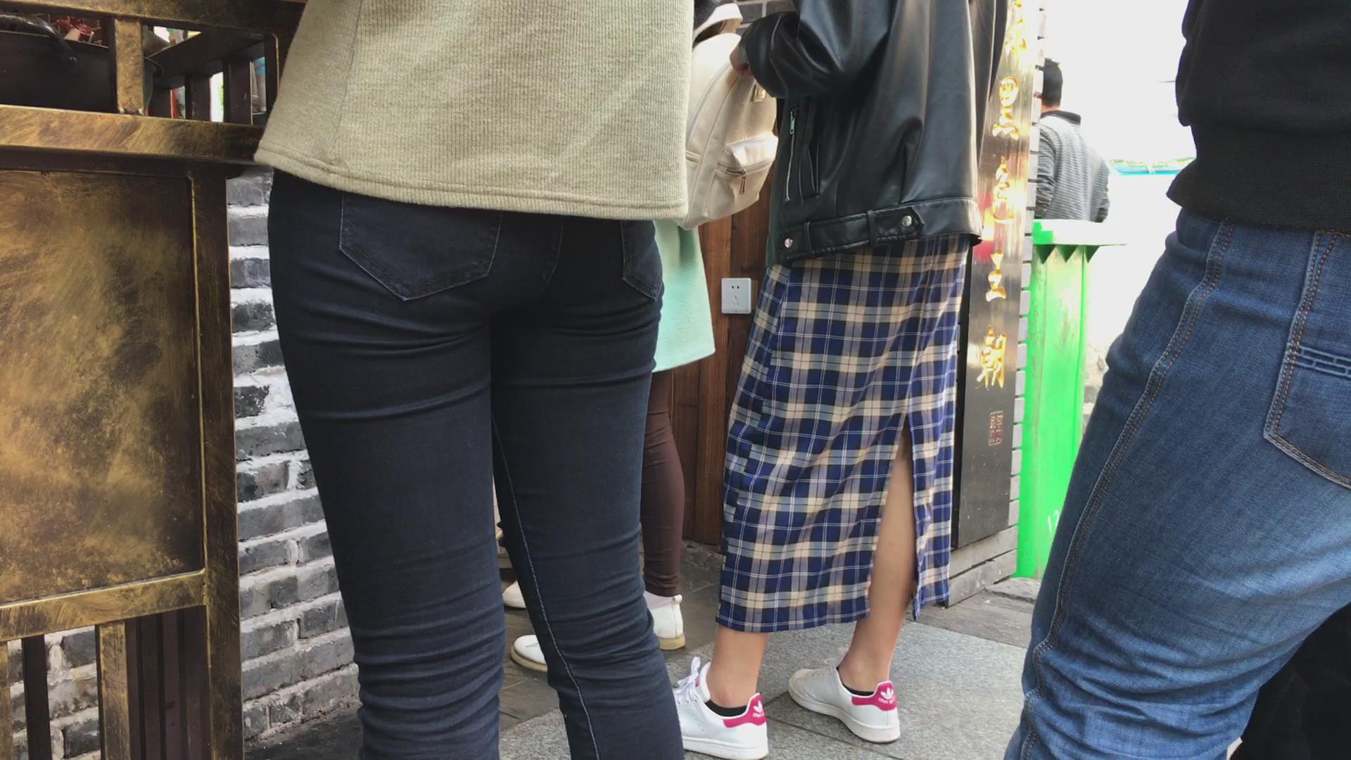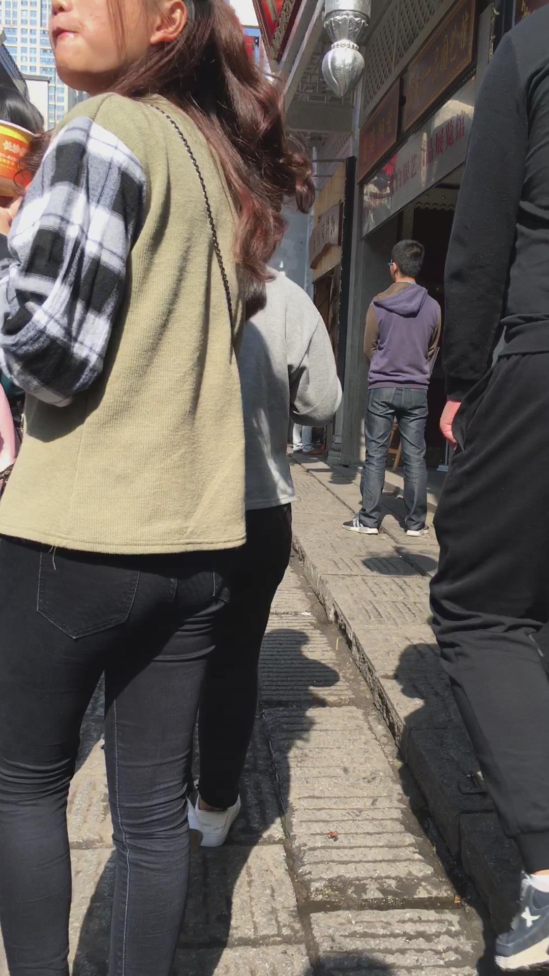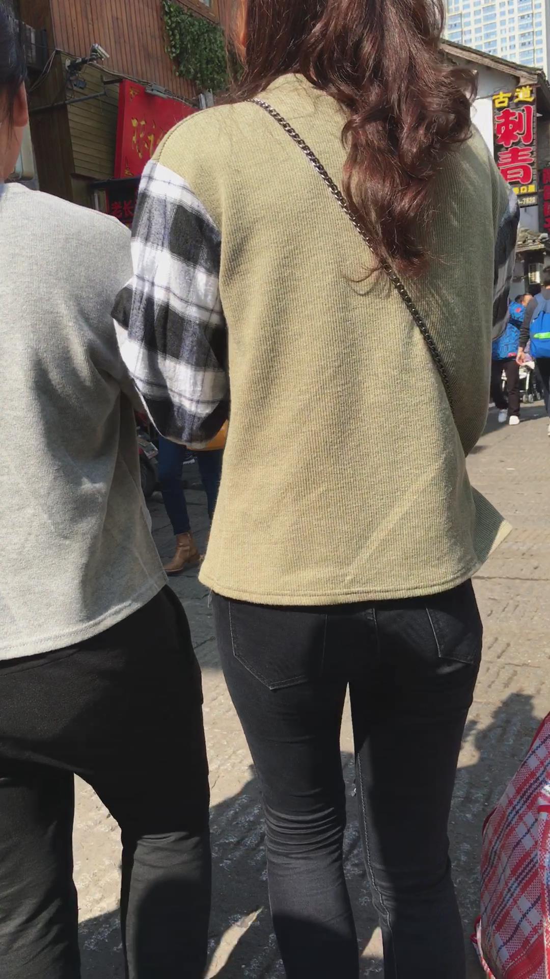 街拍马尾辫清纯黑色紧身裤美女 编号5842
