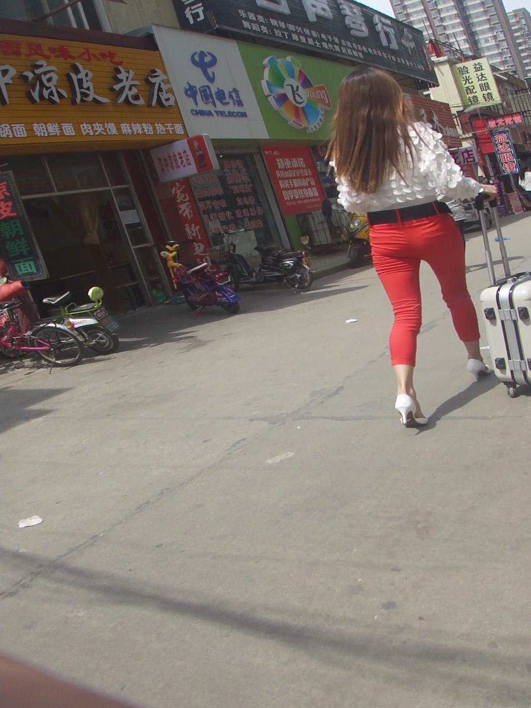 街拍紧身红裤高跟鞋美女 编号5873