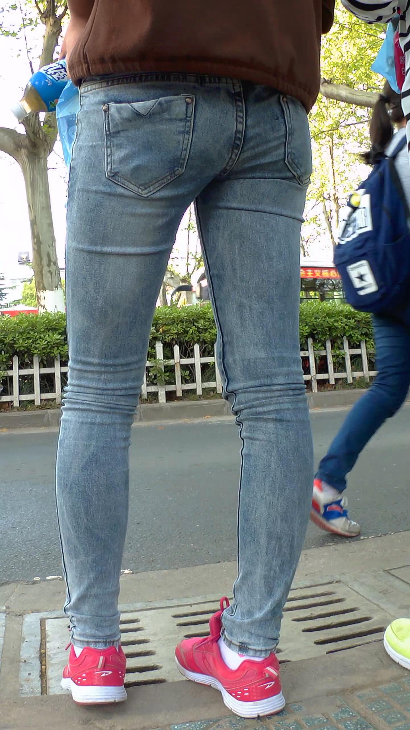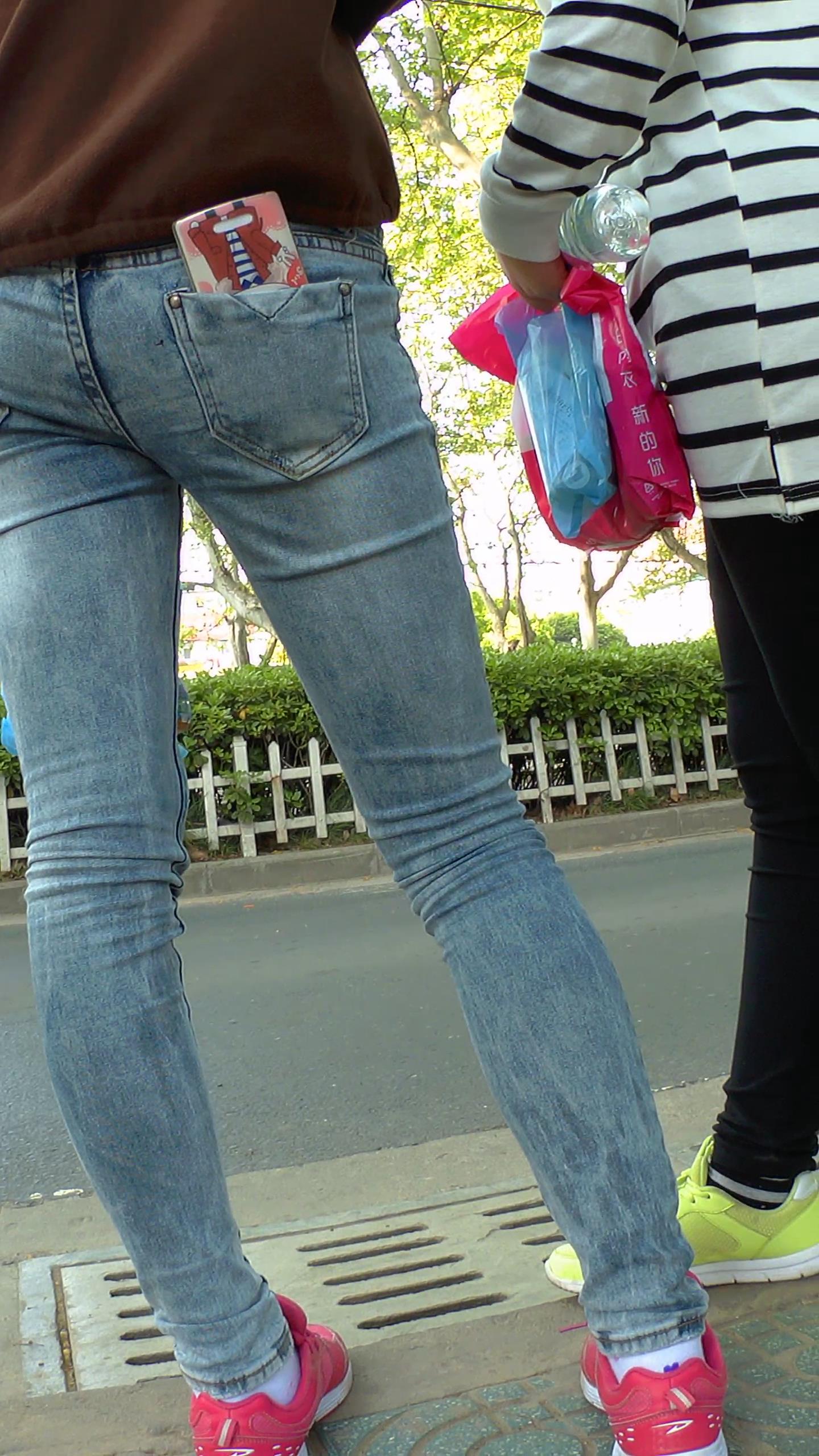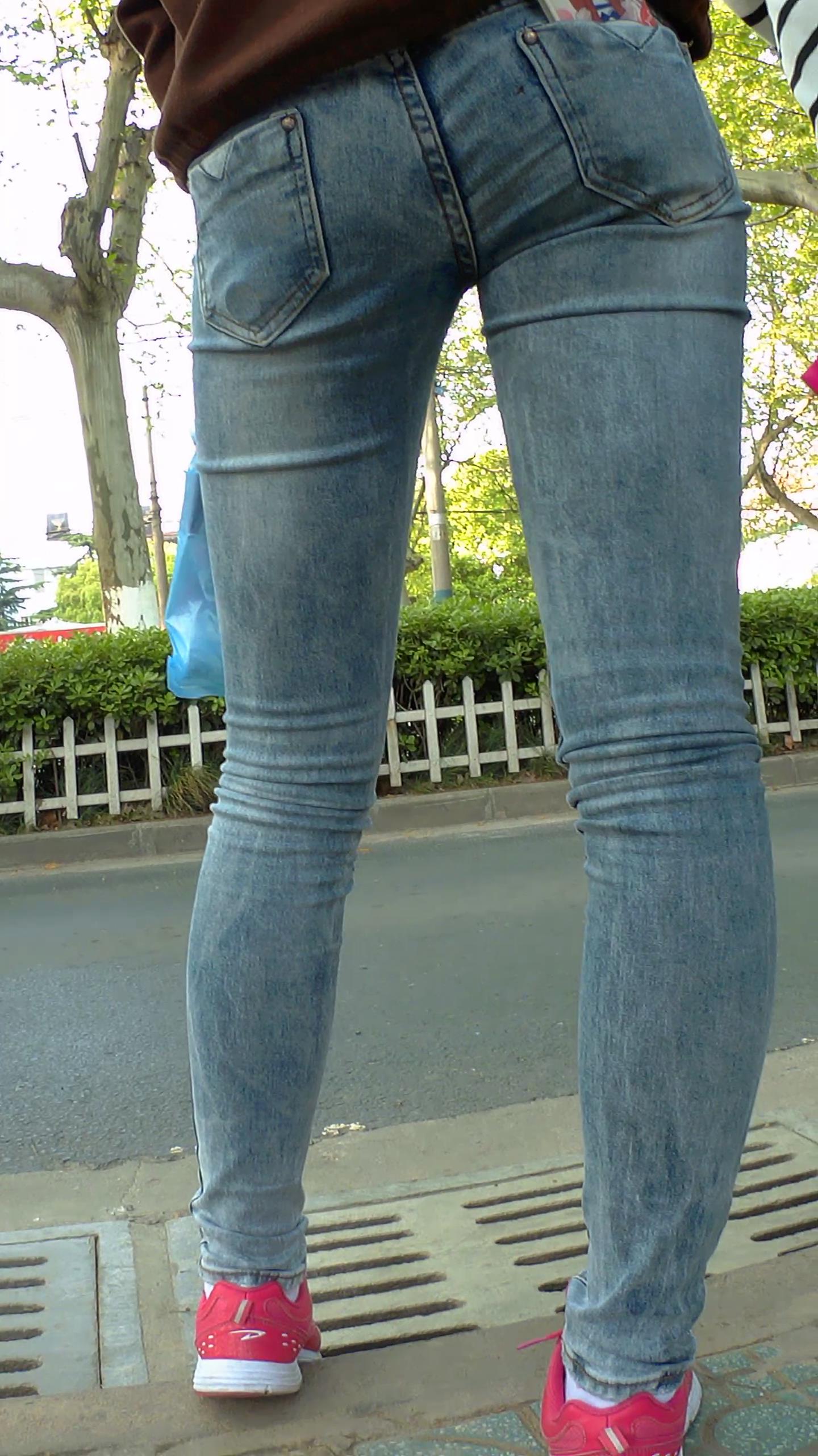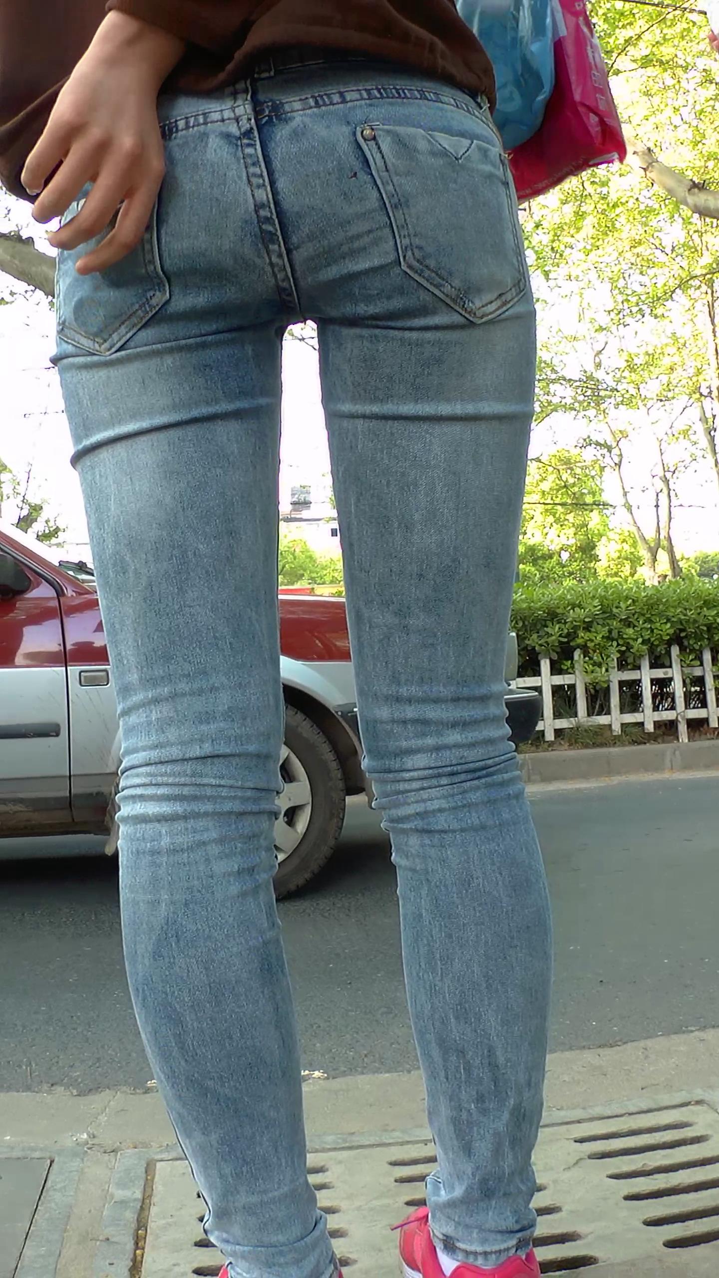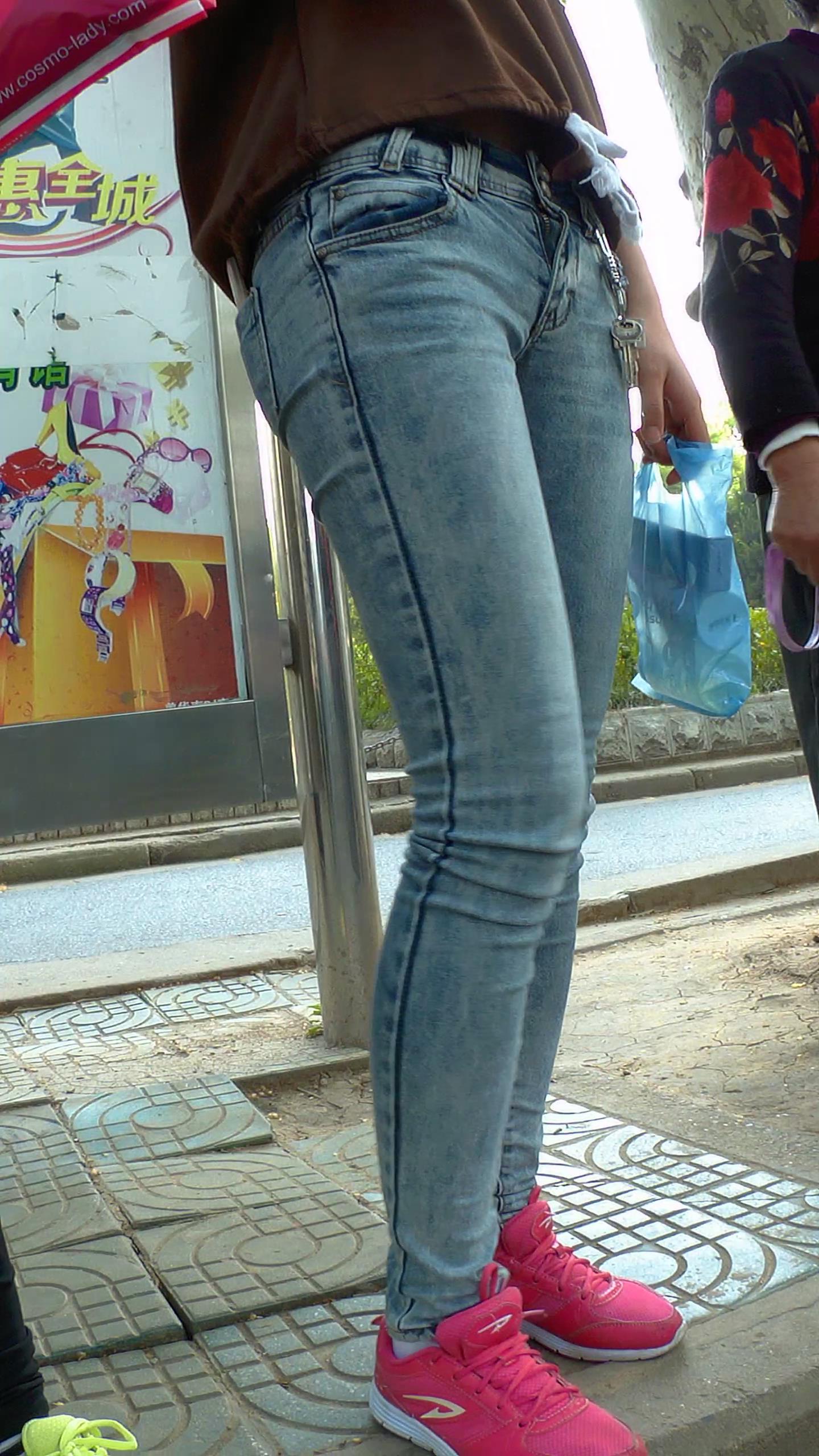 路边等公交的紧身蓝牛学生妹 编号5895