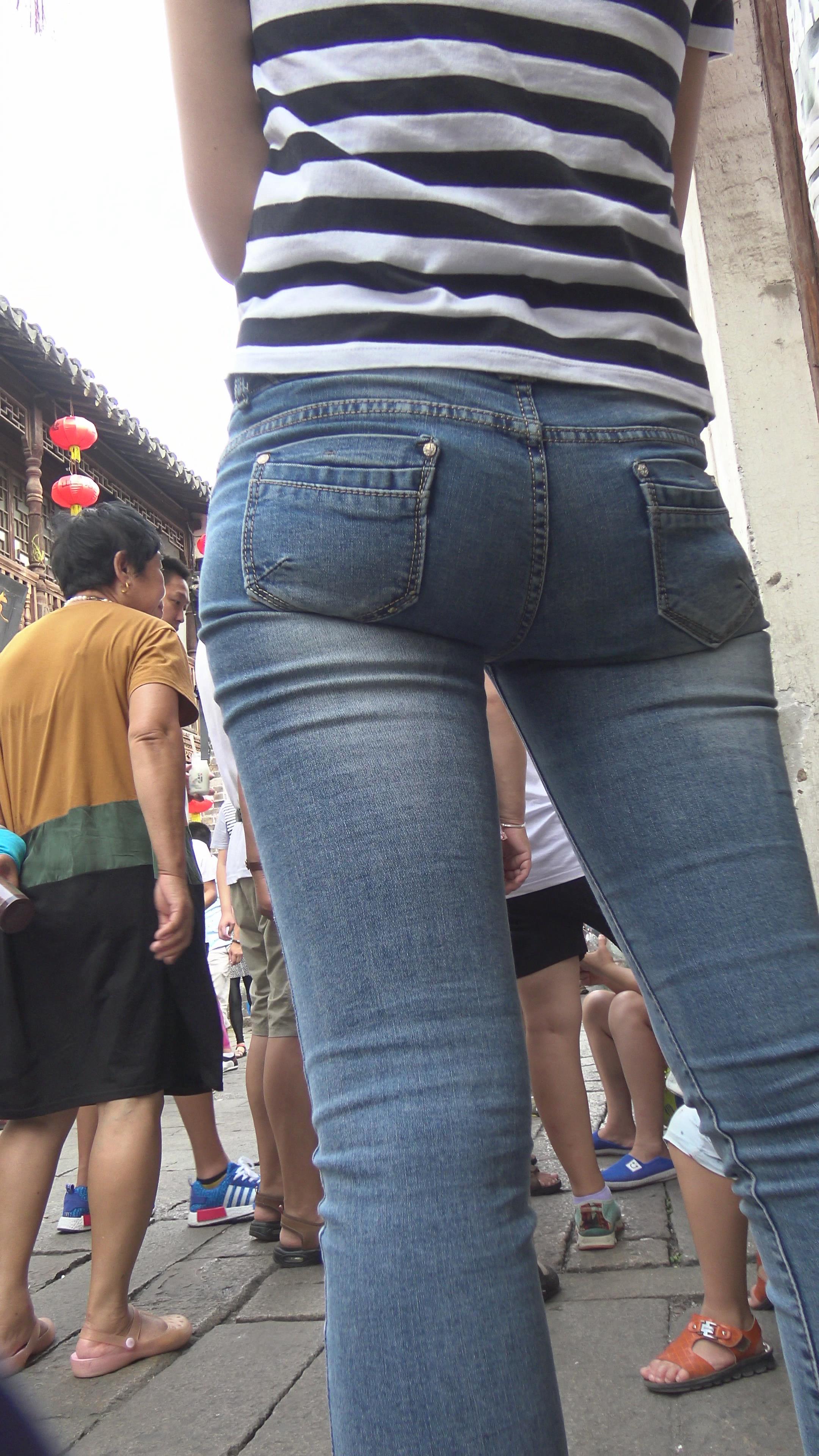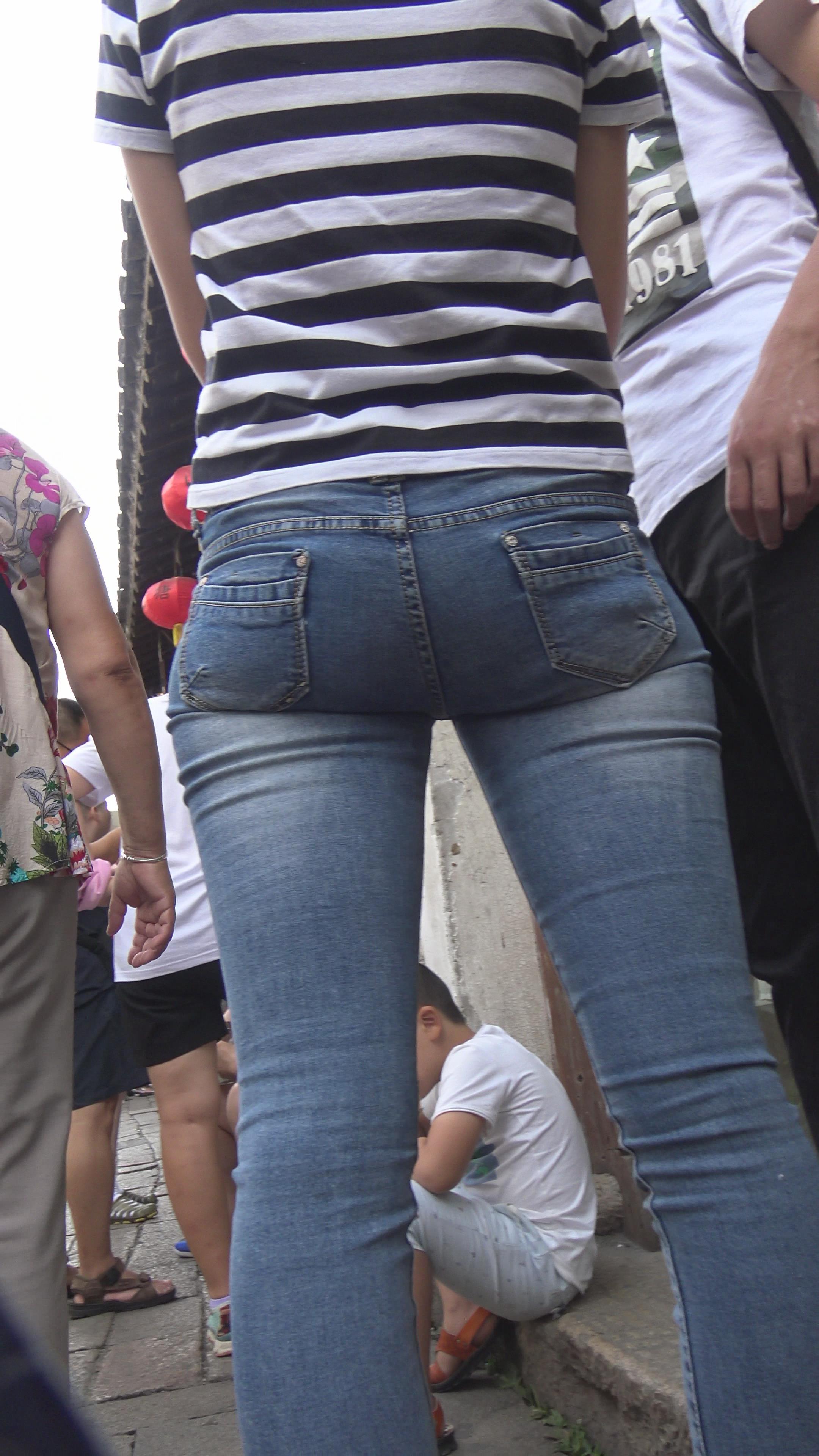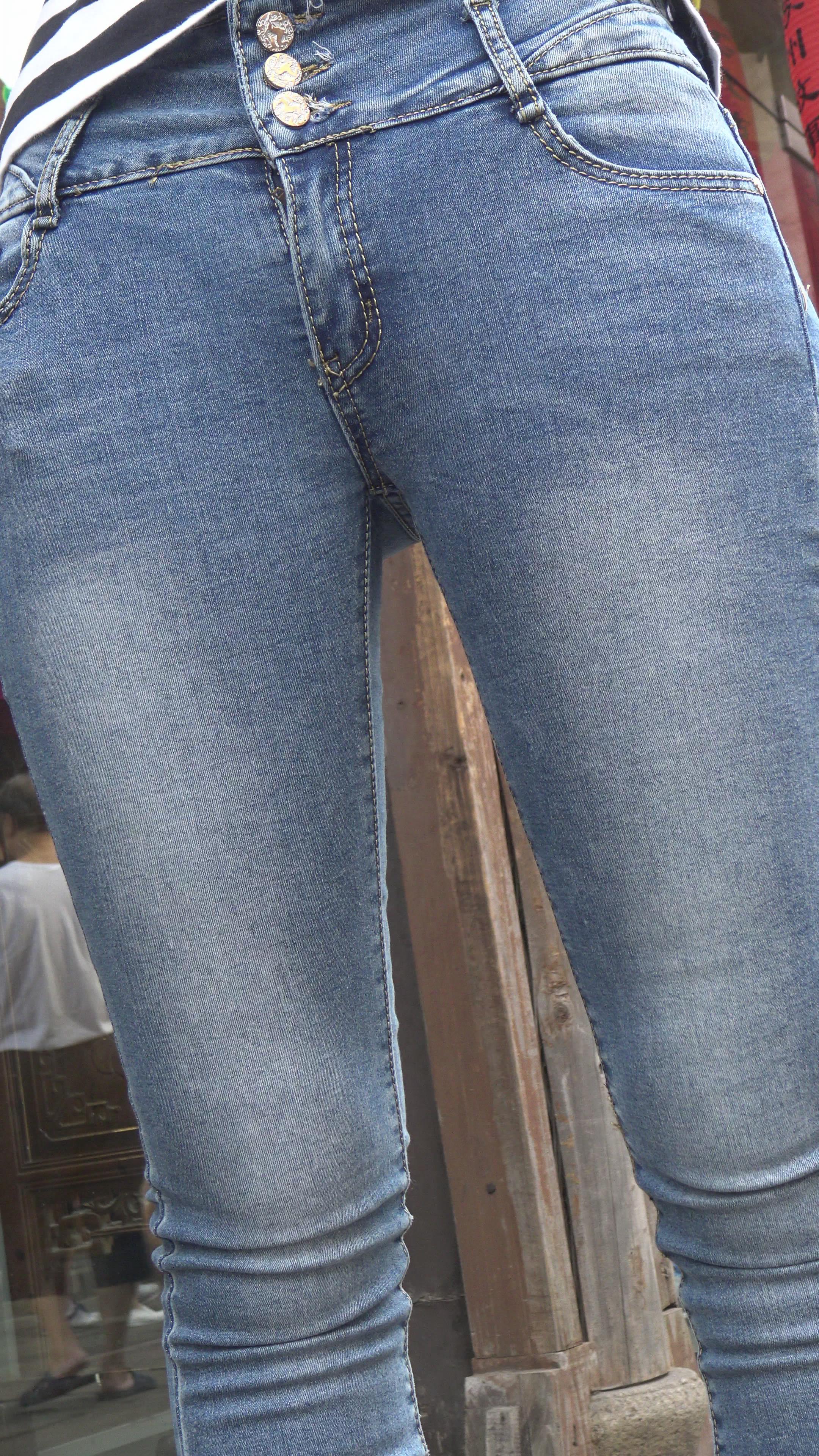 4k-街拍超级紧绷七分蓝色牛仔裤美女。 编号5975
