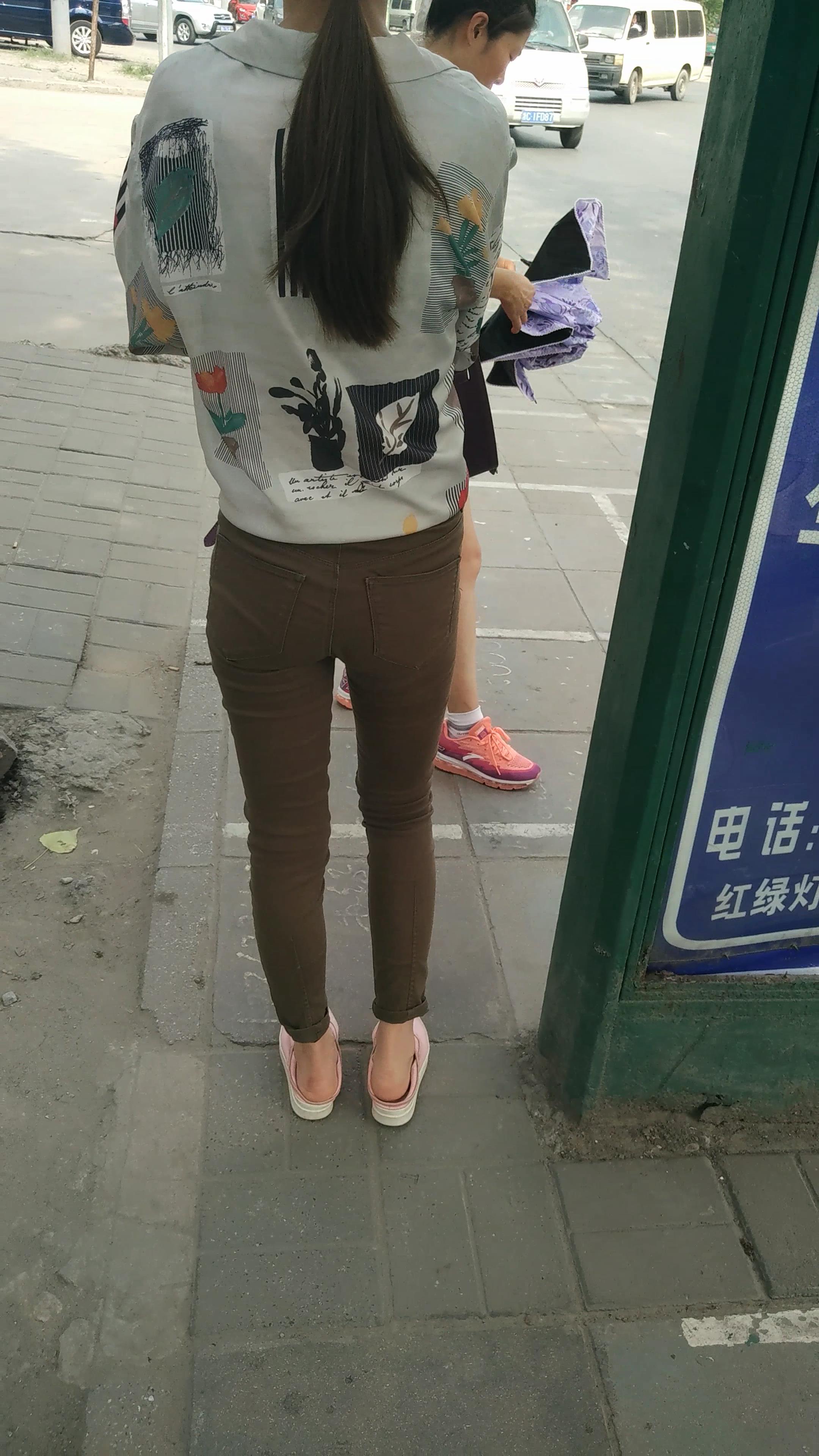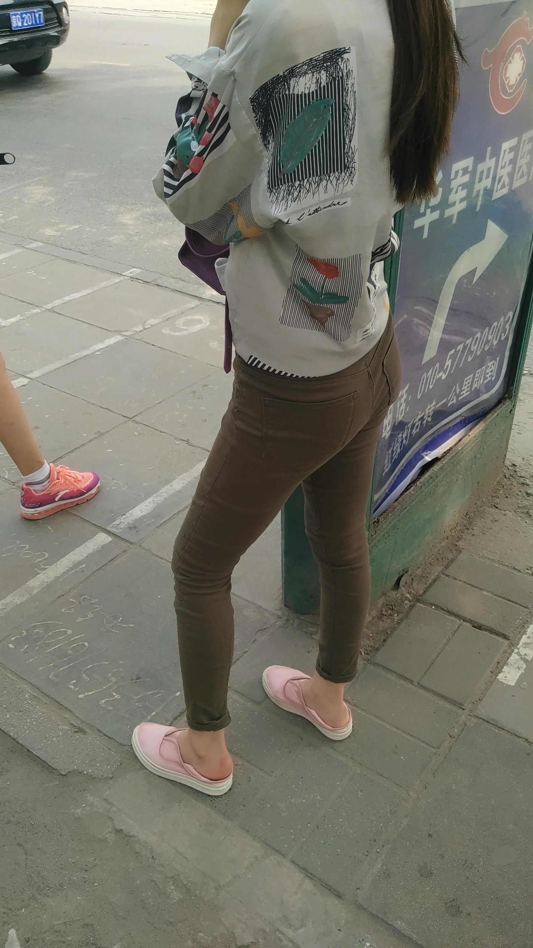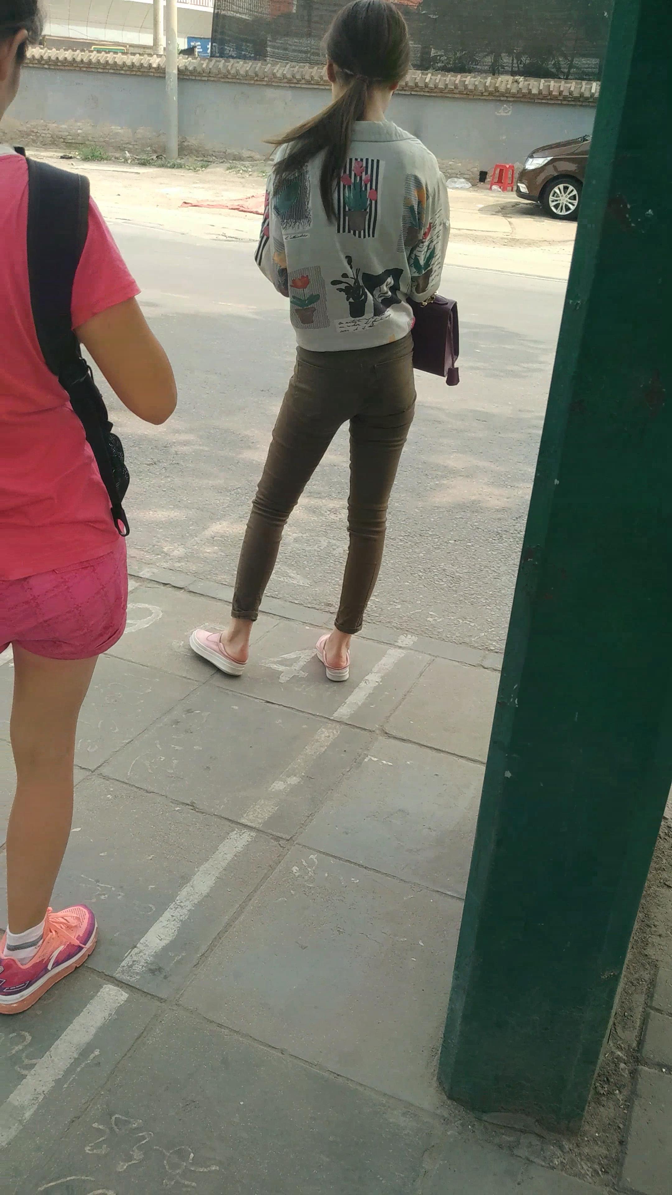 4k-街拍苗条细腿紧身裤女孩等公交车。 编号5996