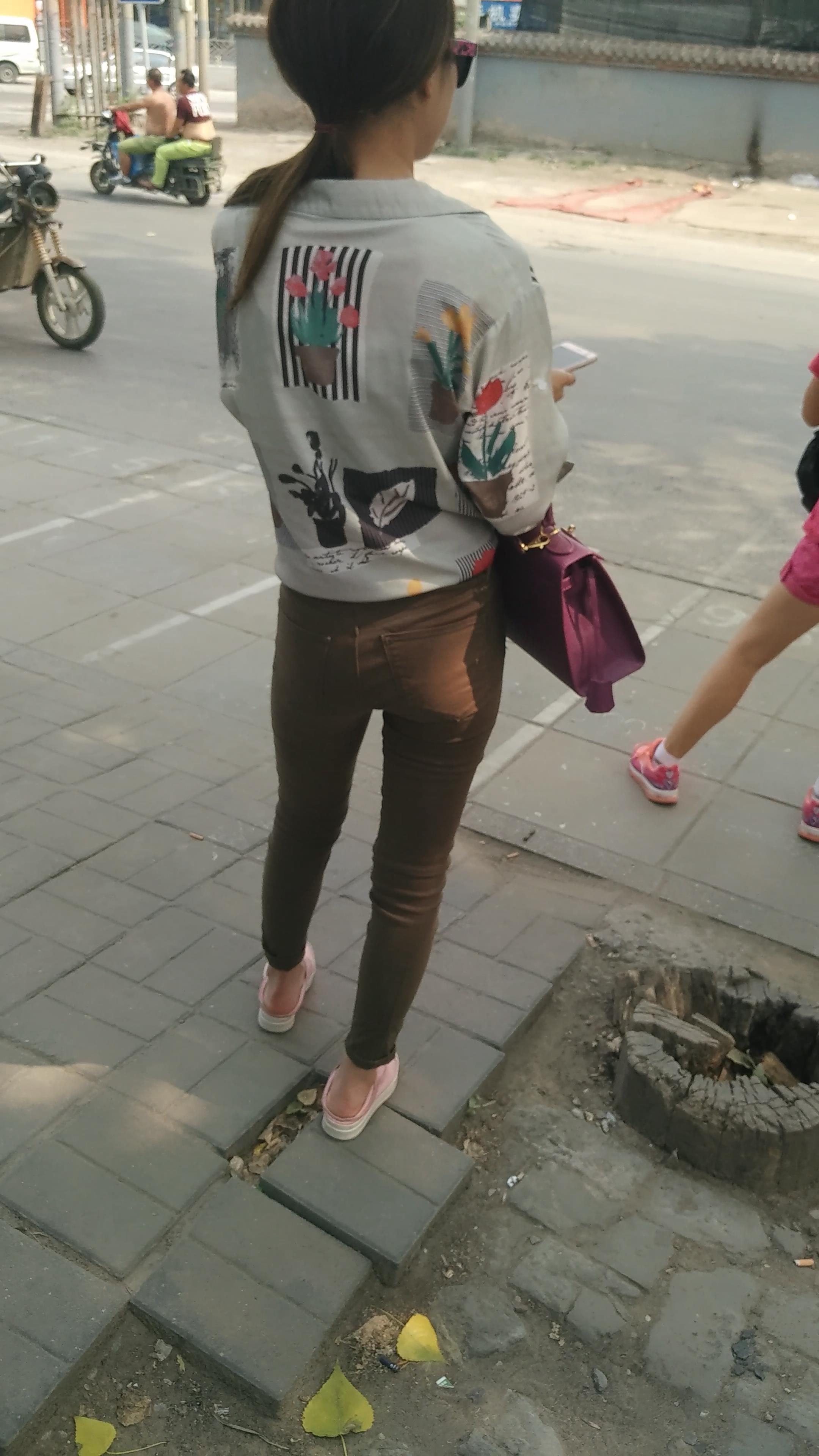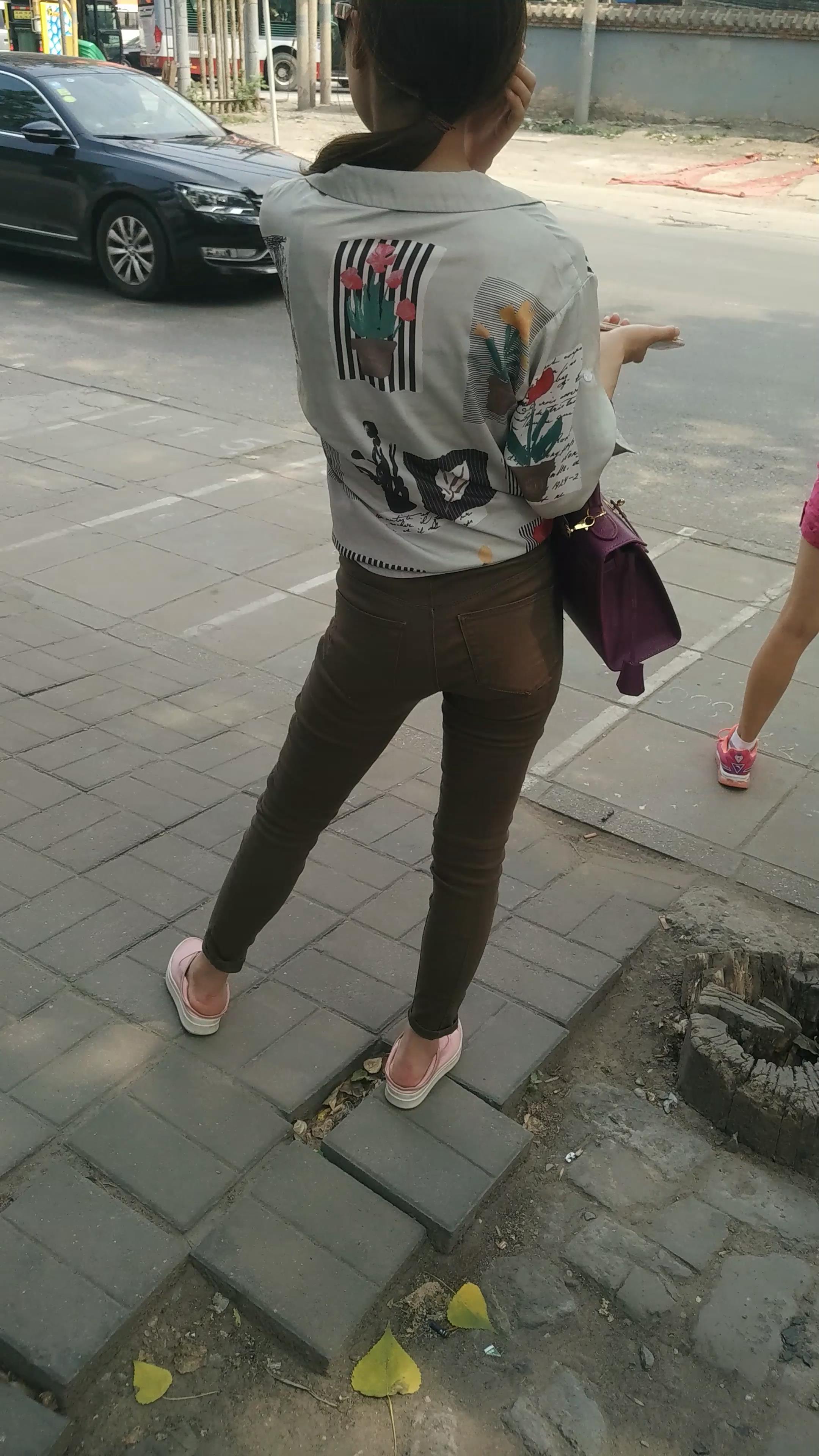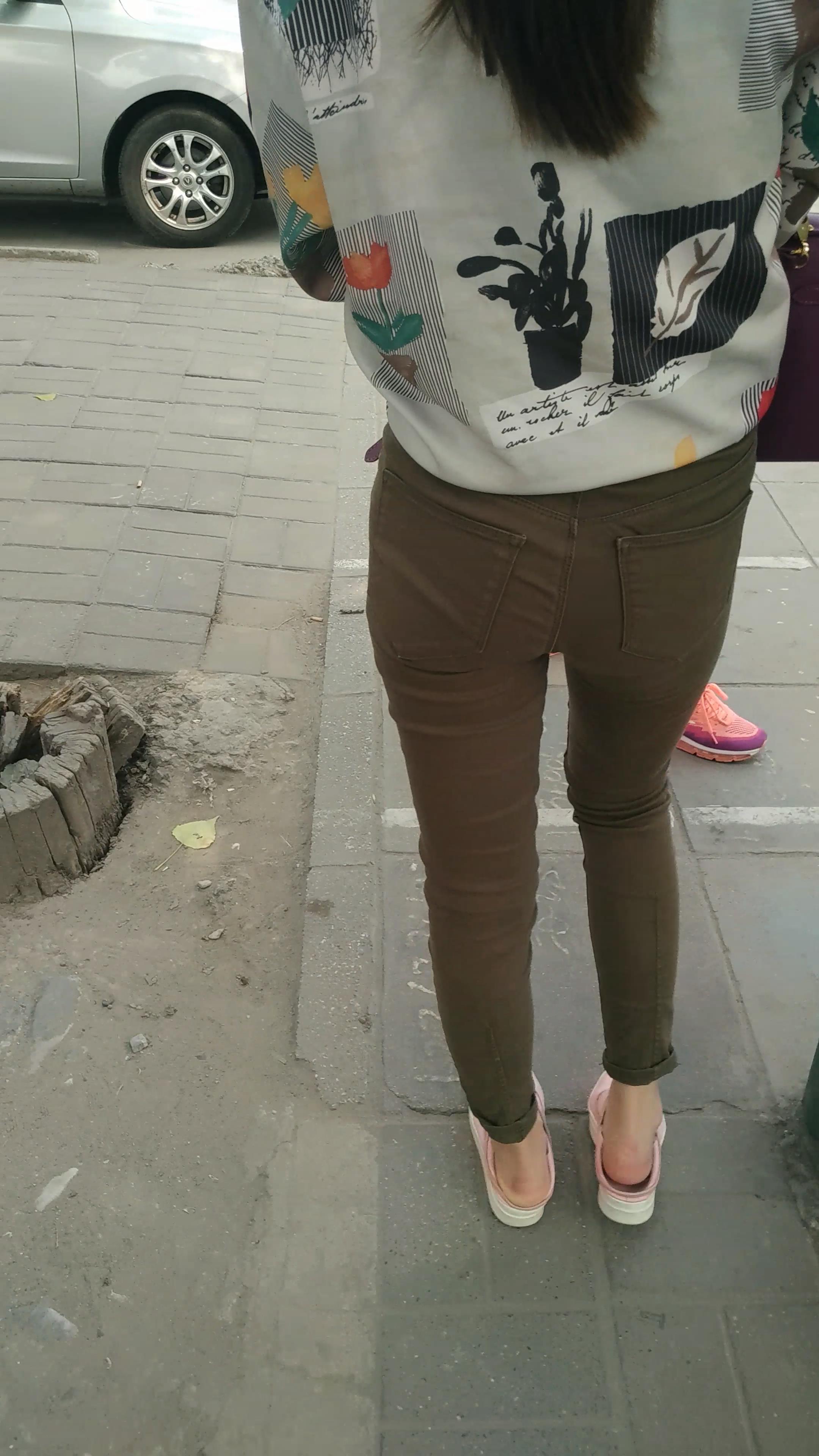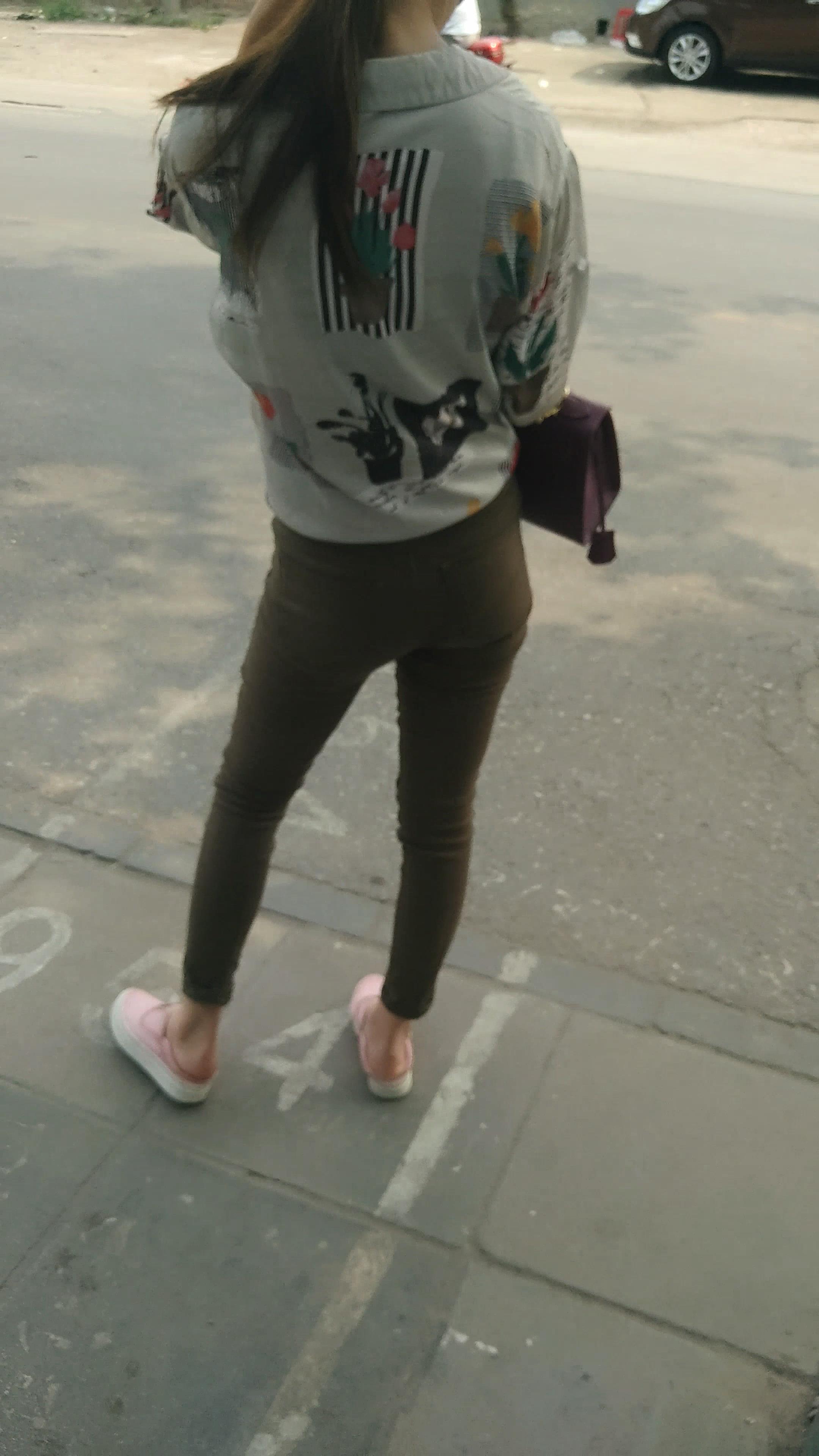4k-街拍苗条细腿紧身裤女孩等公交车。 编号5996
