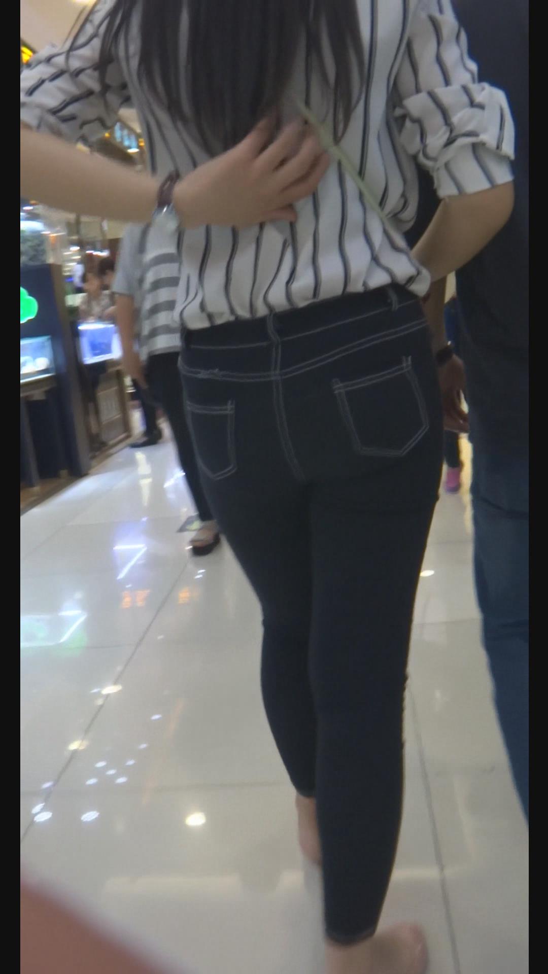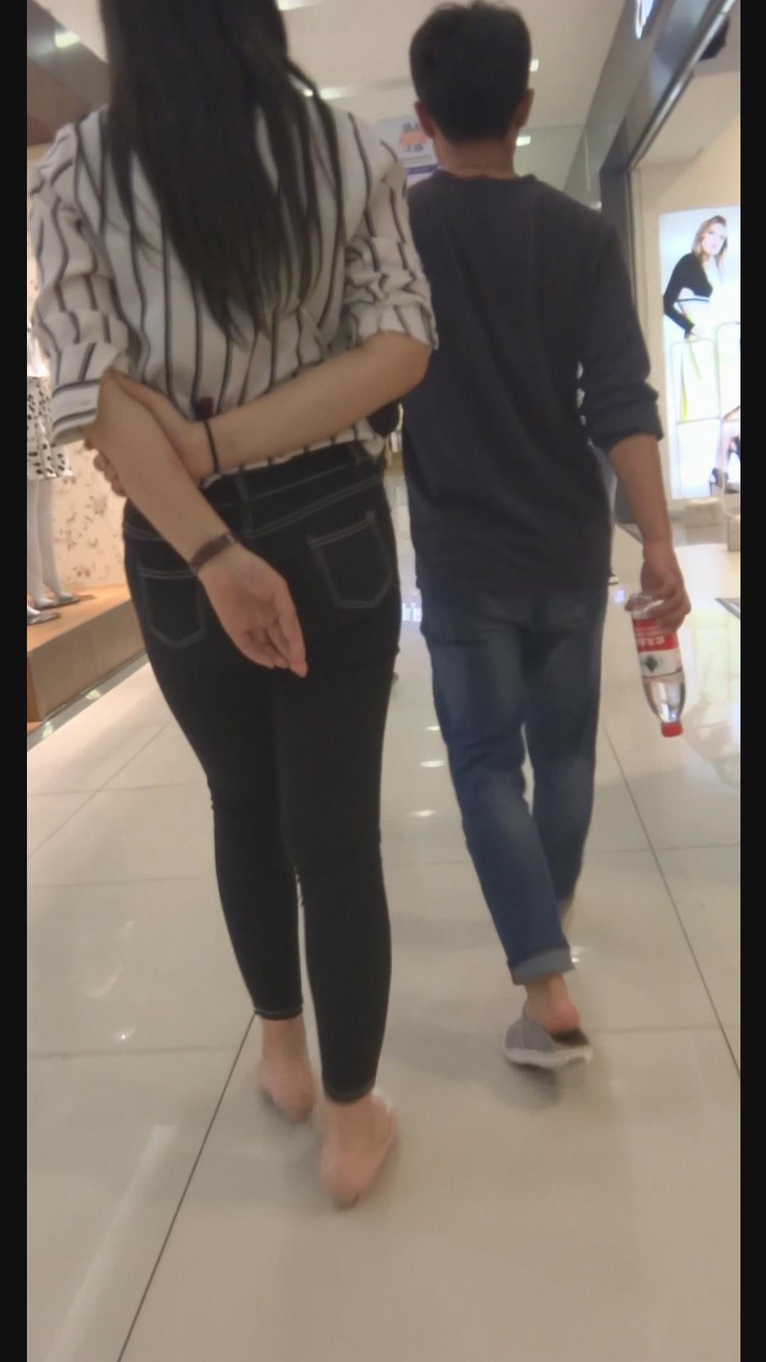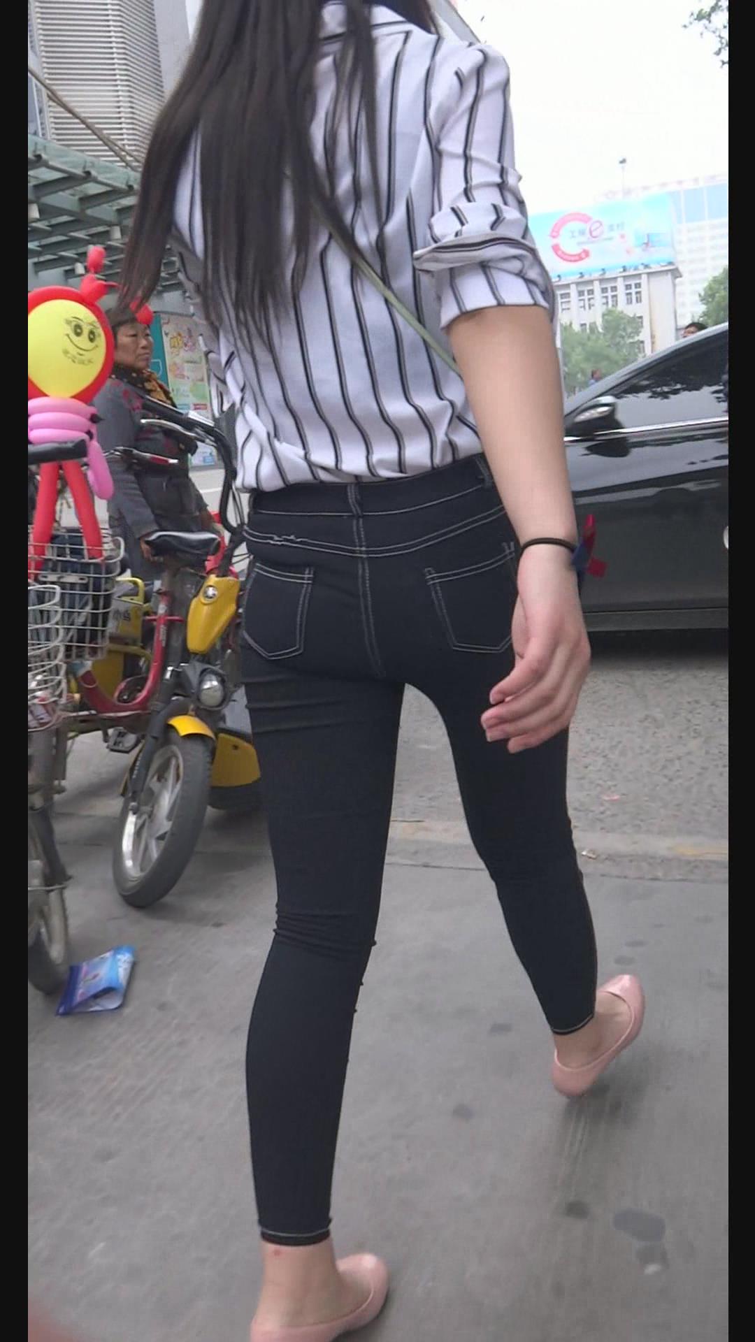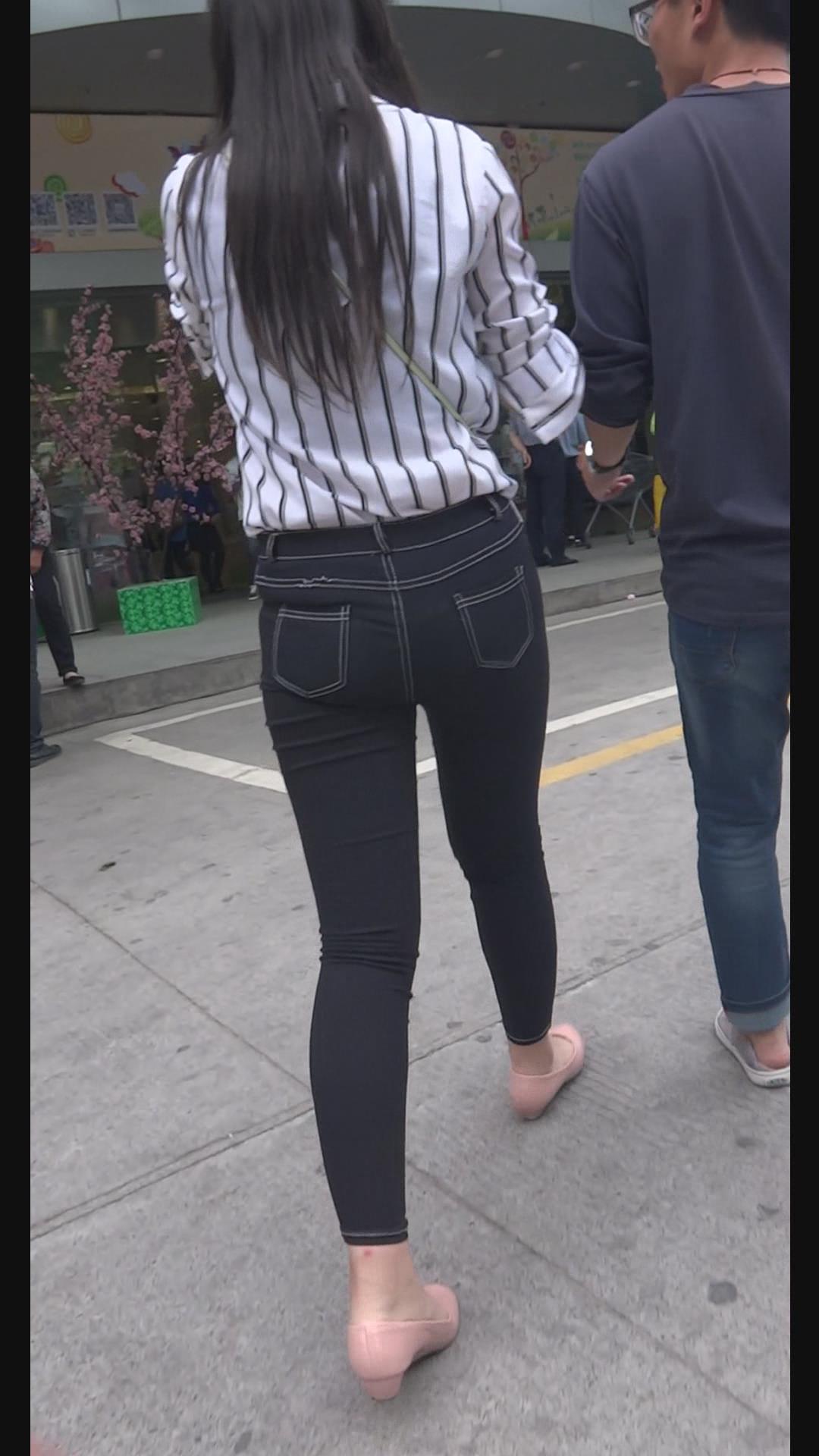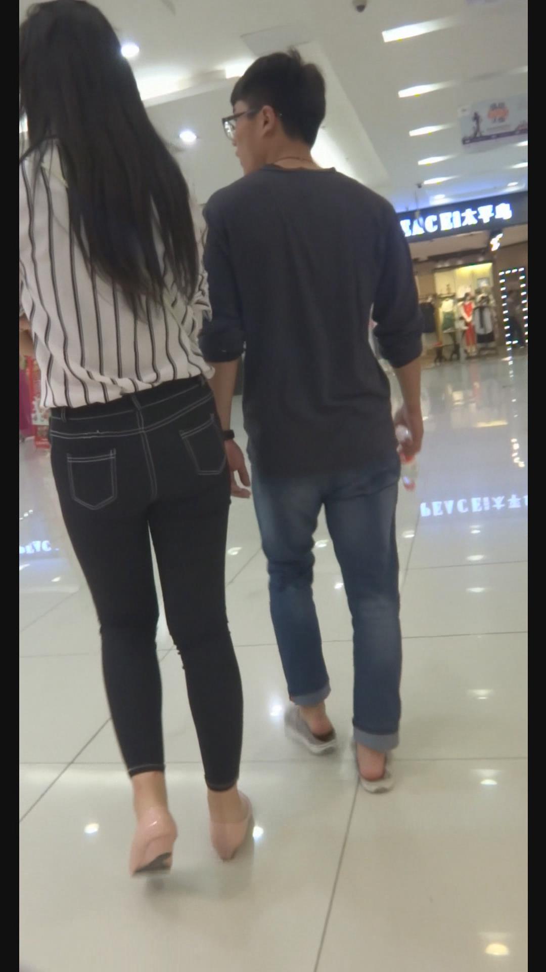 街拍条纹白衬衫紧身黑牛美女陪男友逛街。 编号6000