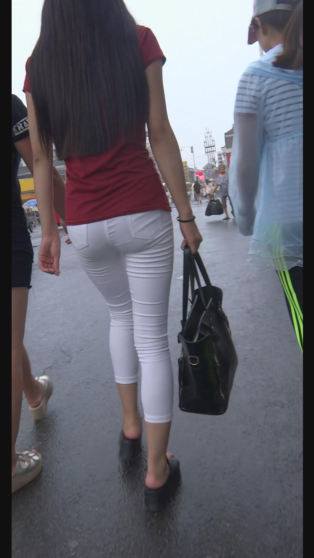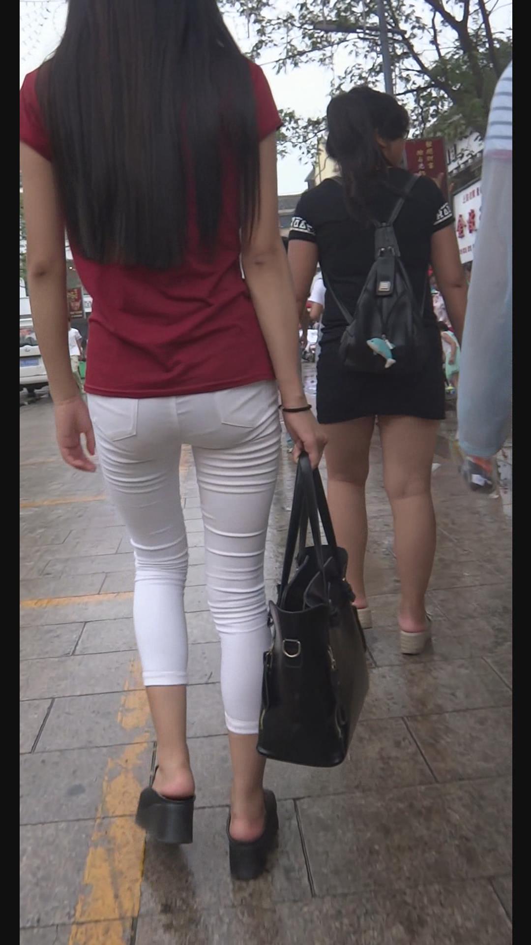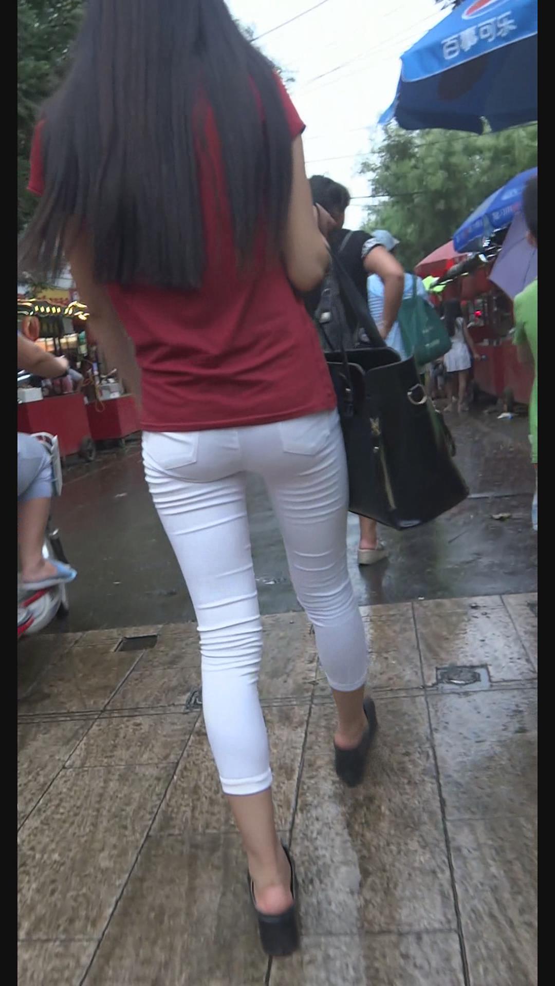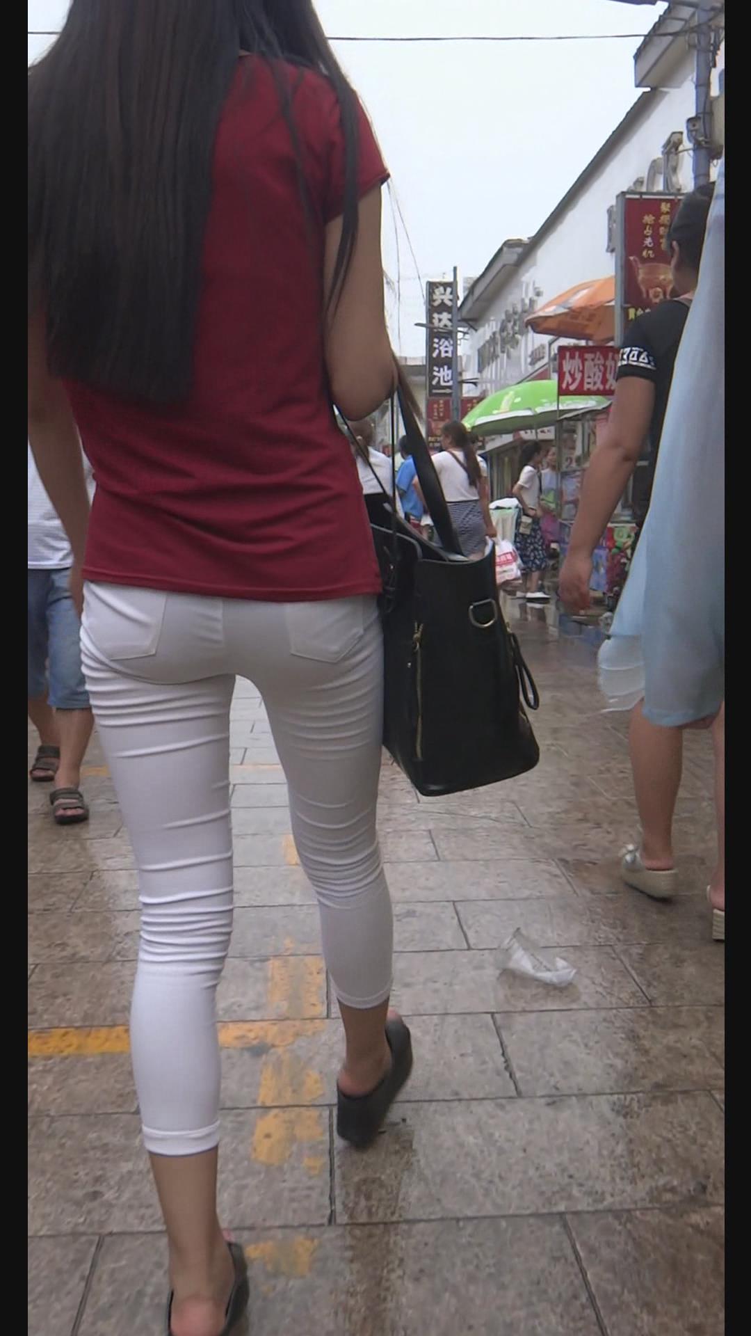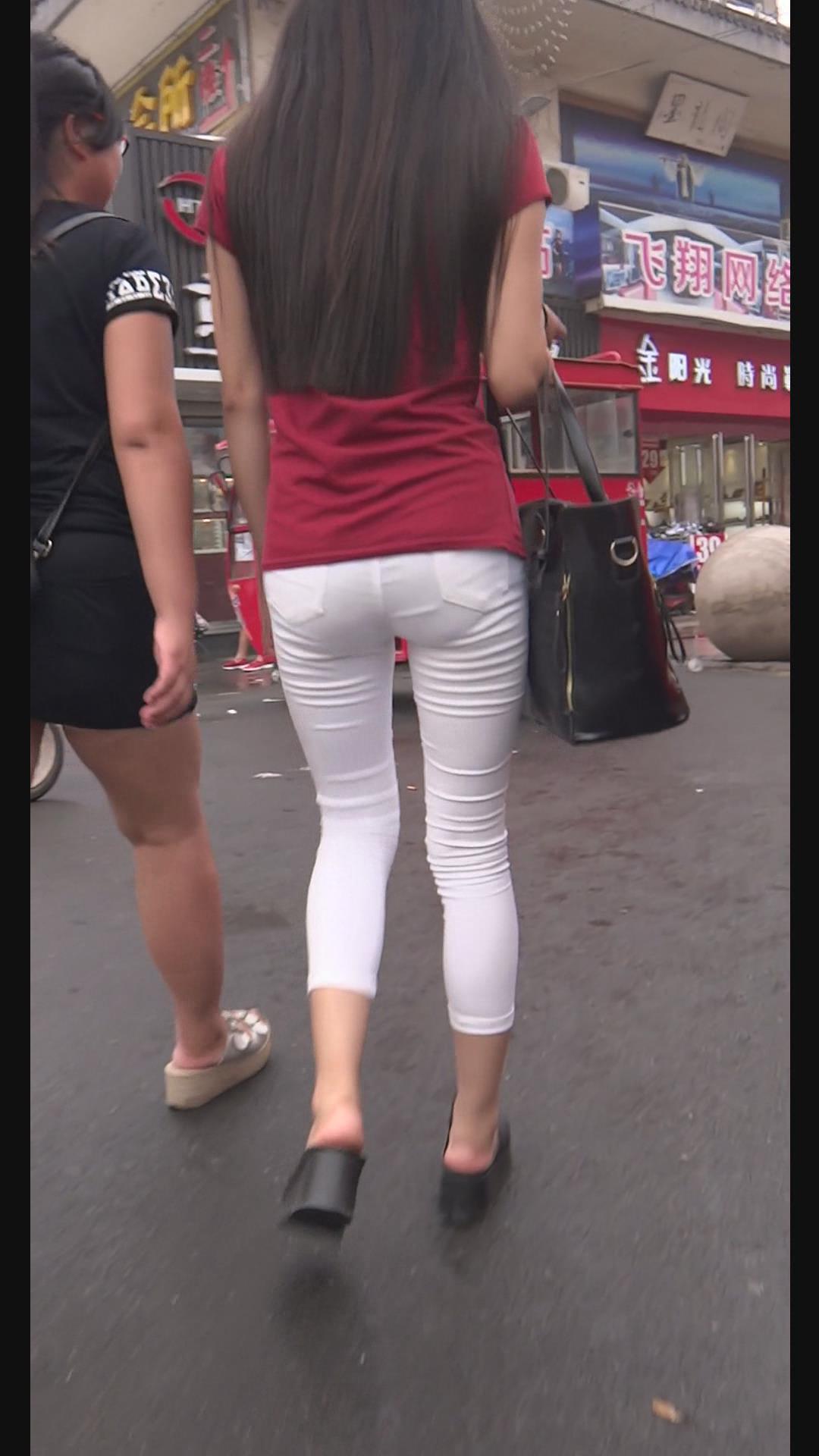 街拍紧身美臀红T恤美腿美女。 编号6001