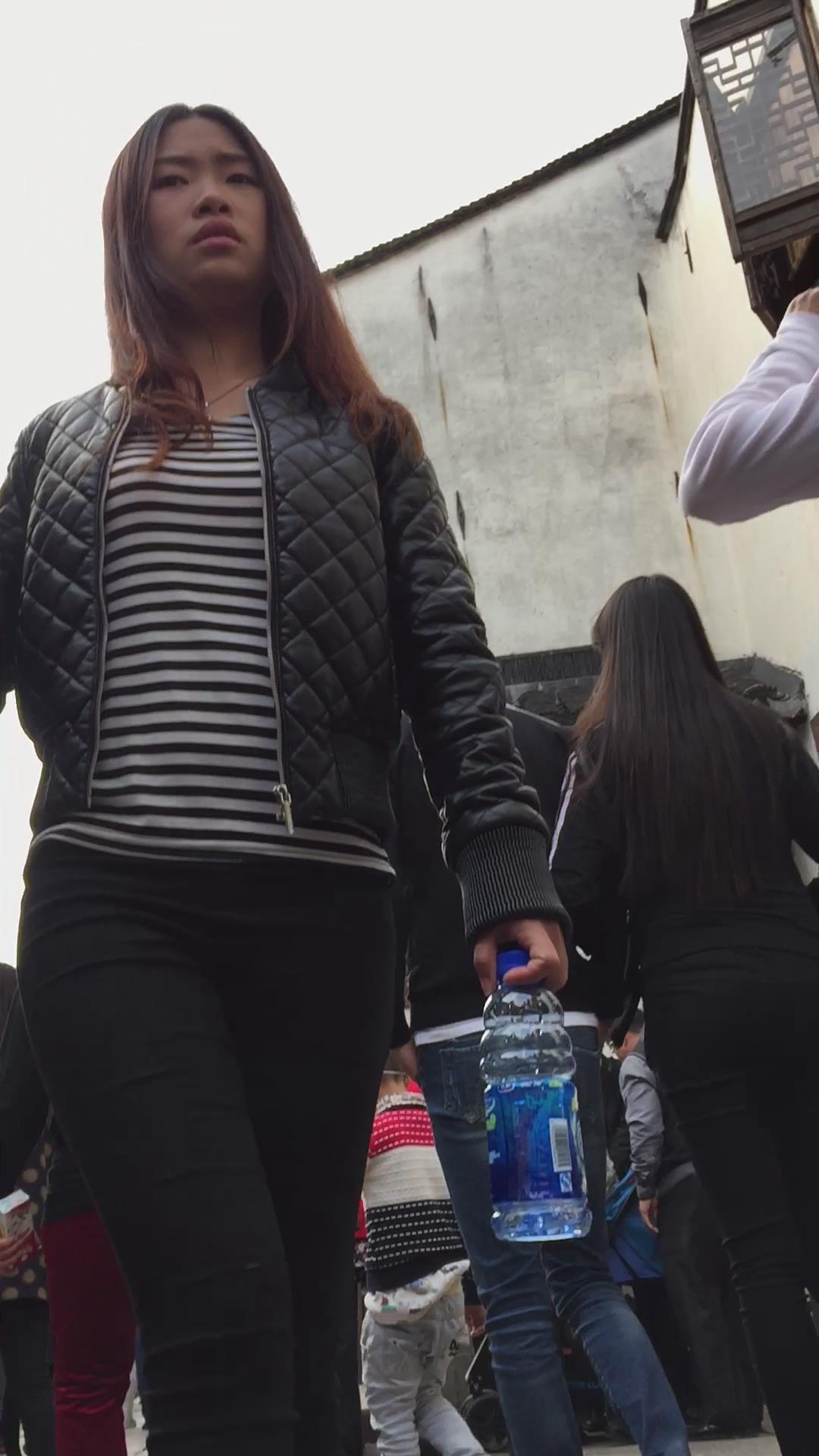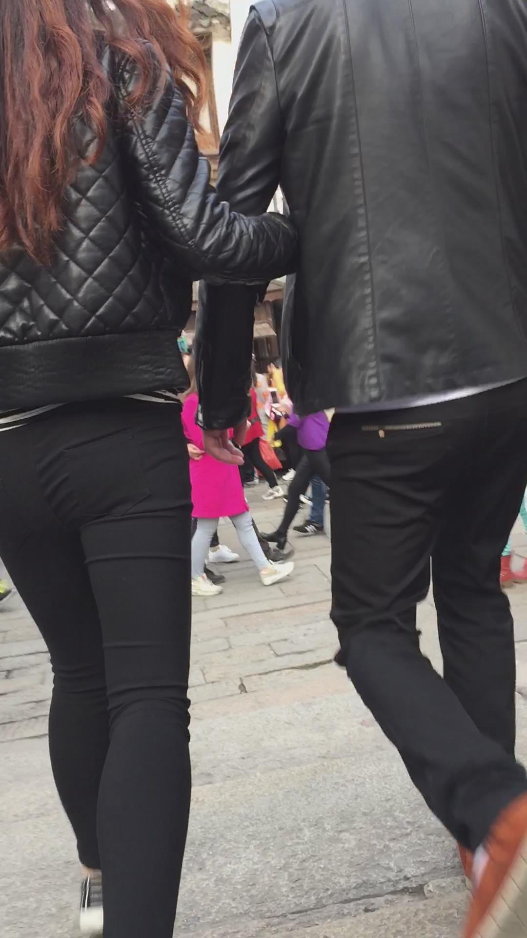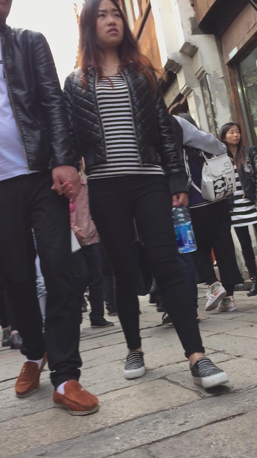 街拍黑色紧身裤美女跟小男友手拉手逛街。 编号6005