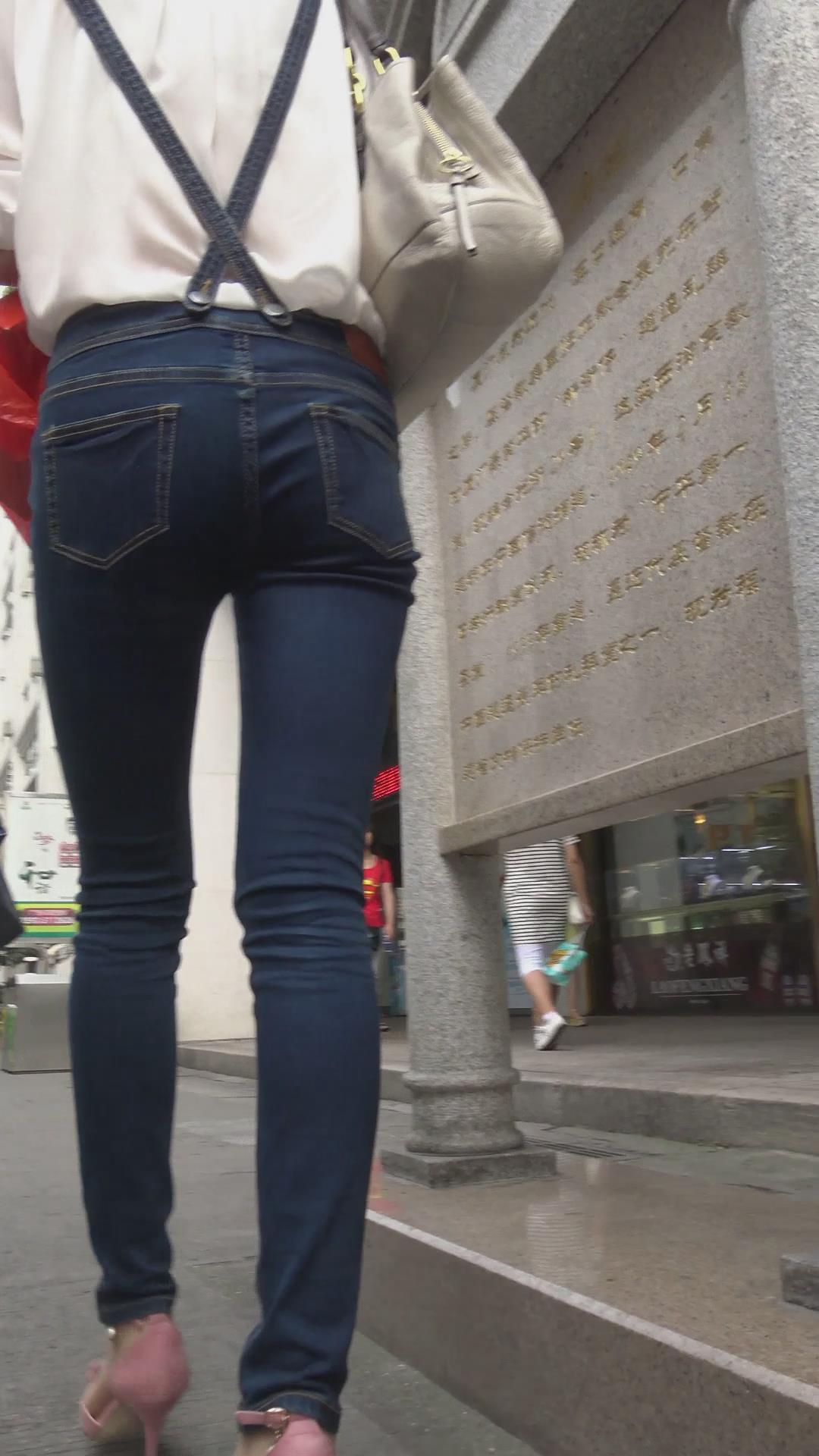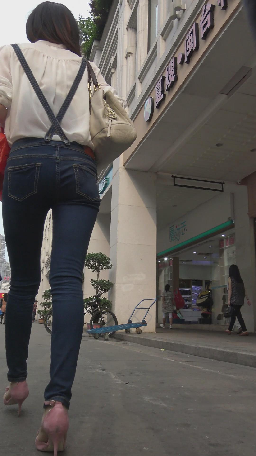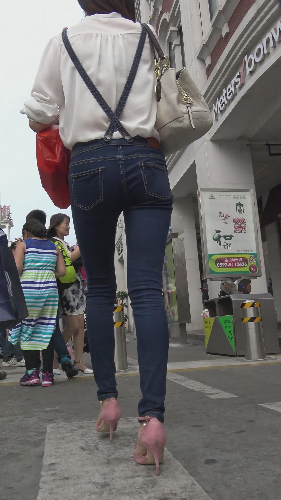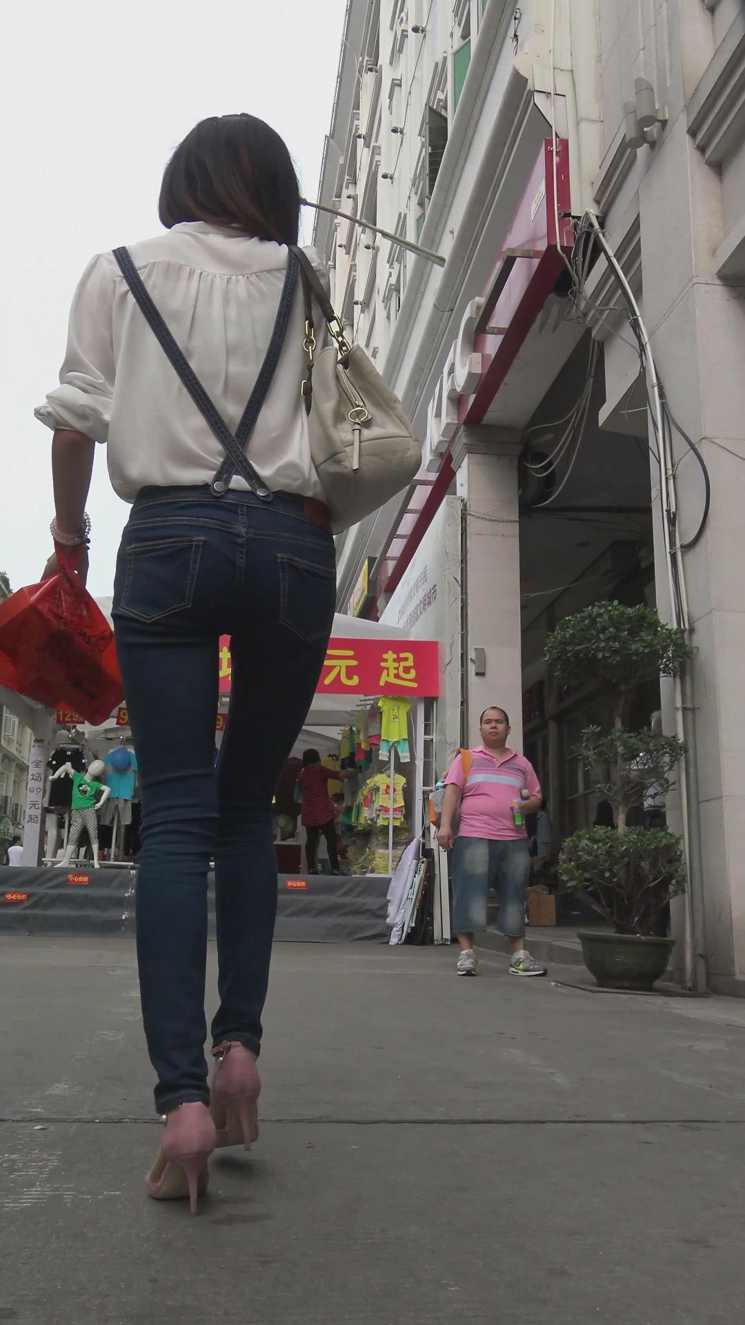 街拍极品长腿背带牛仔裤粉高跟气质美女姐姐 编号6045