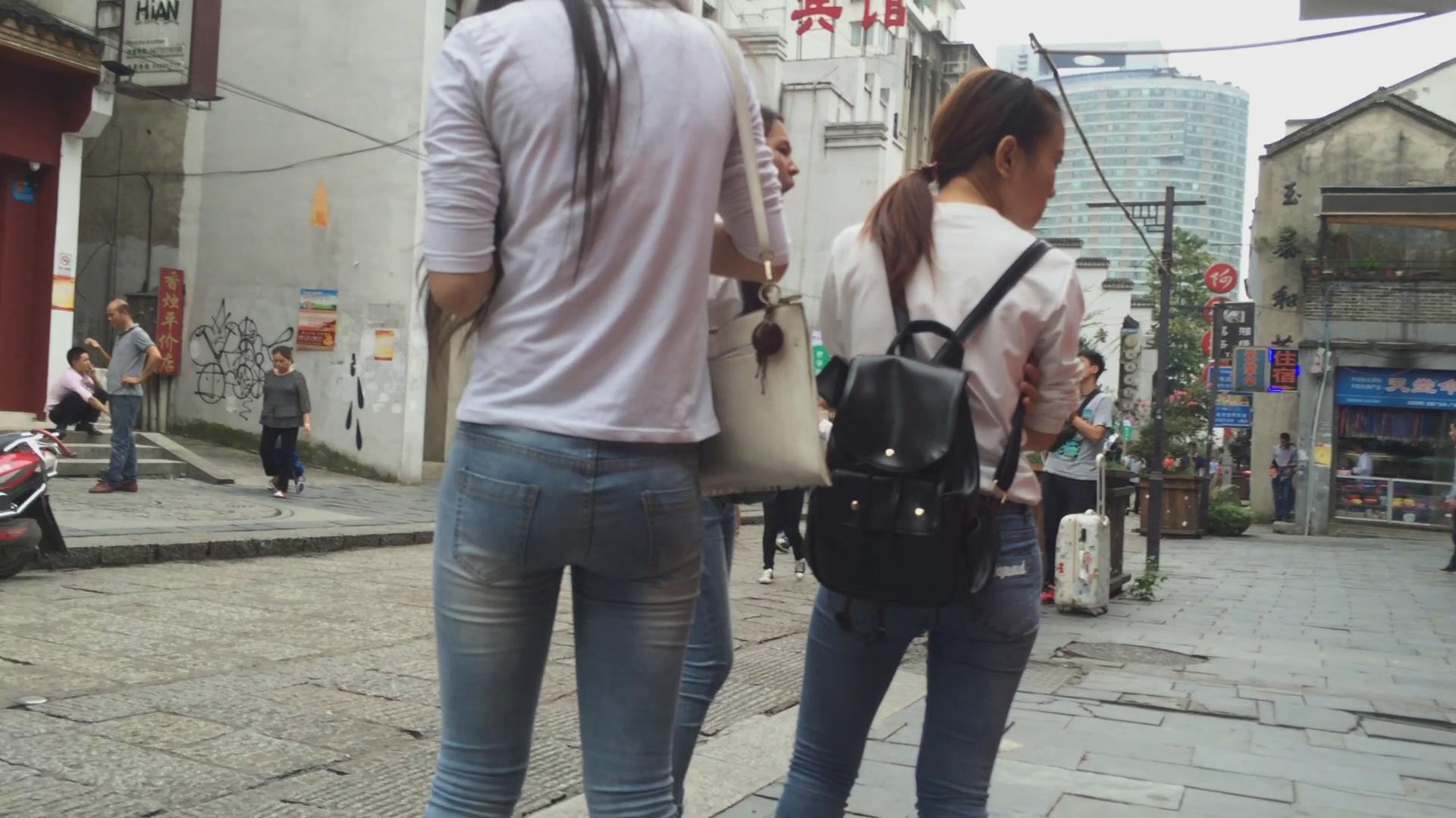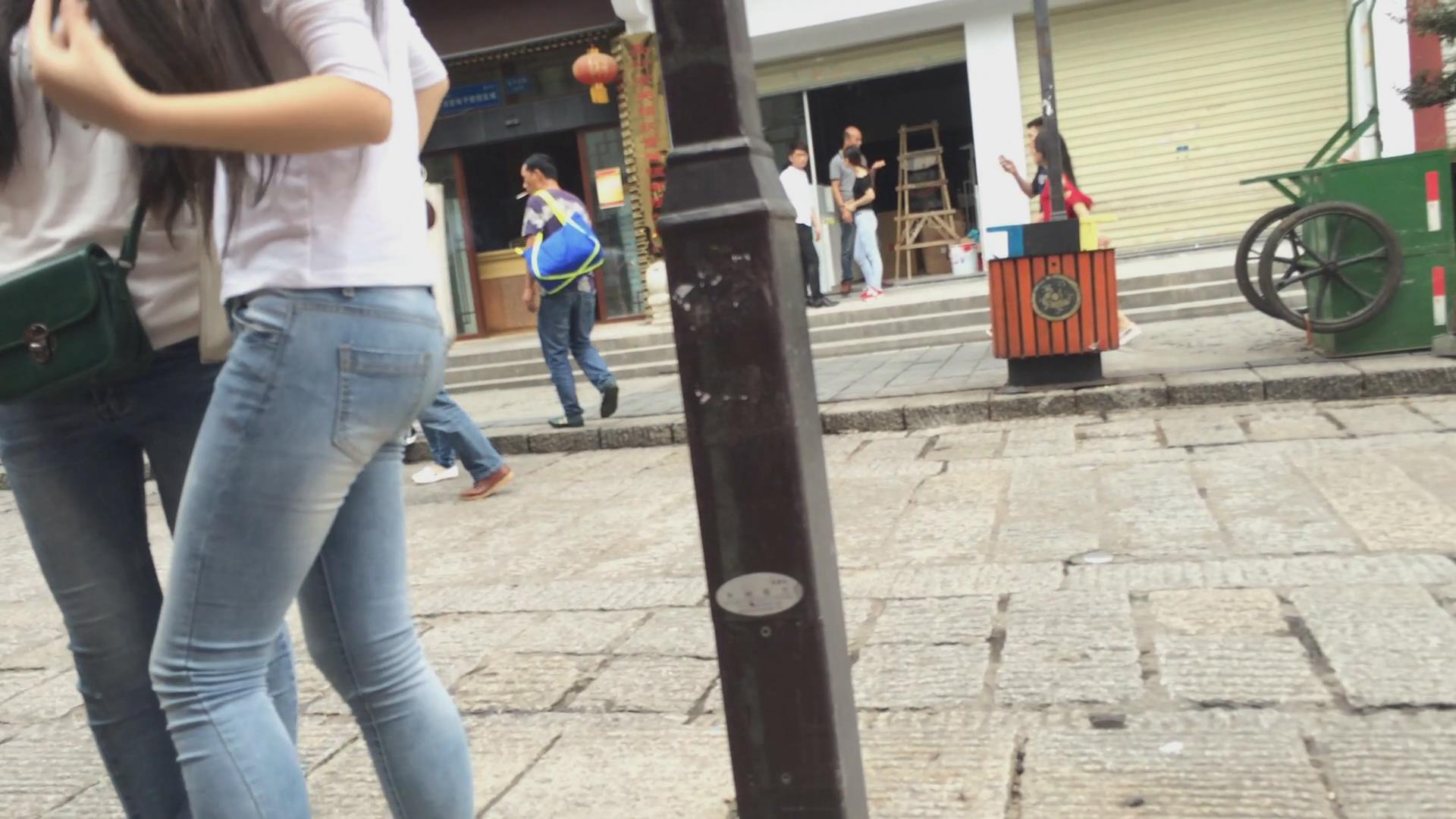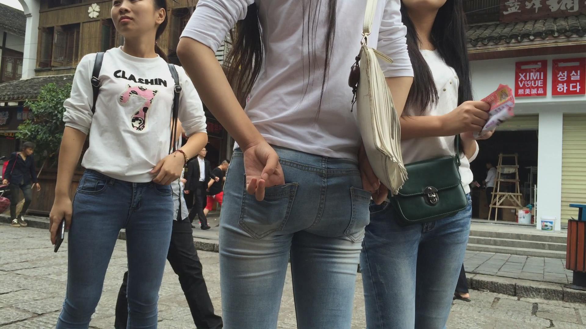 街拍路边闲聊的三位紧身蓝牛学生妹 编号6047