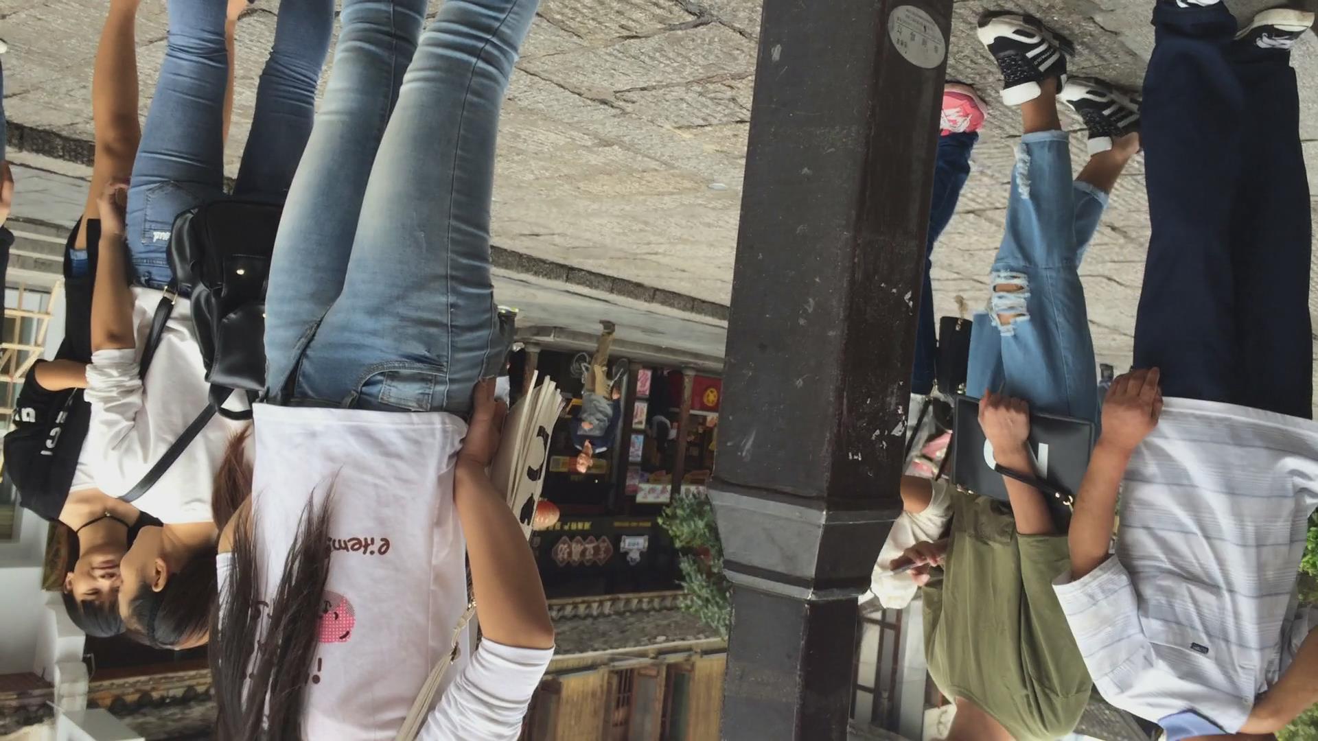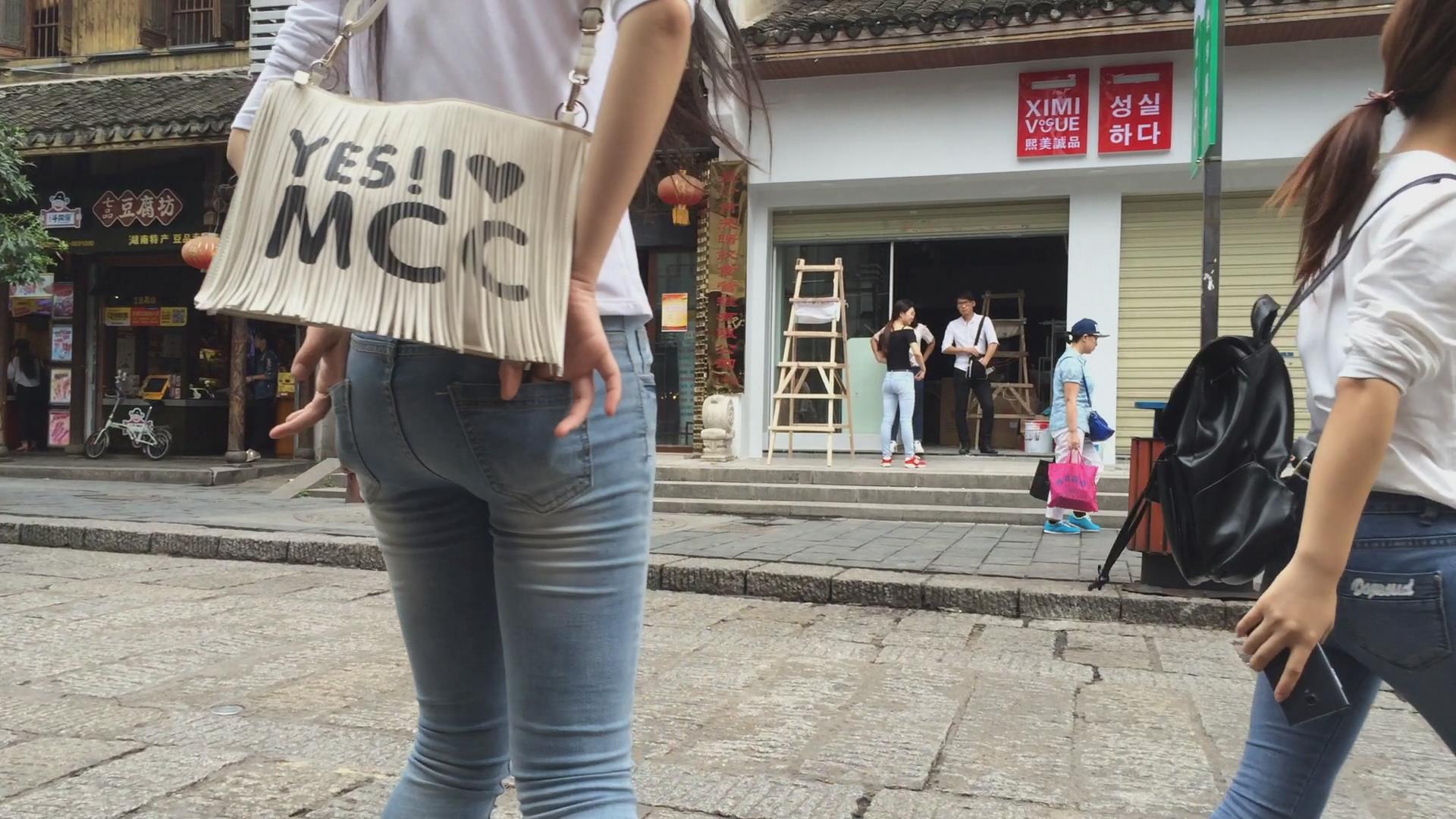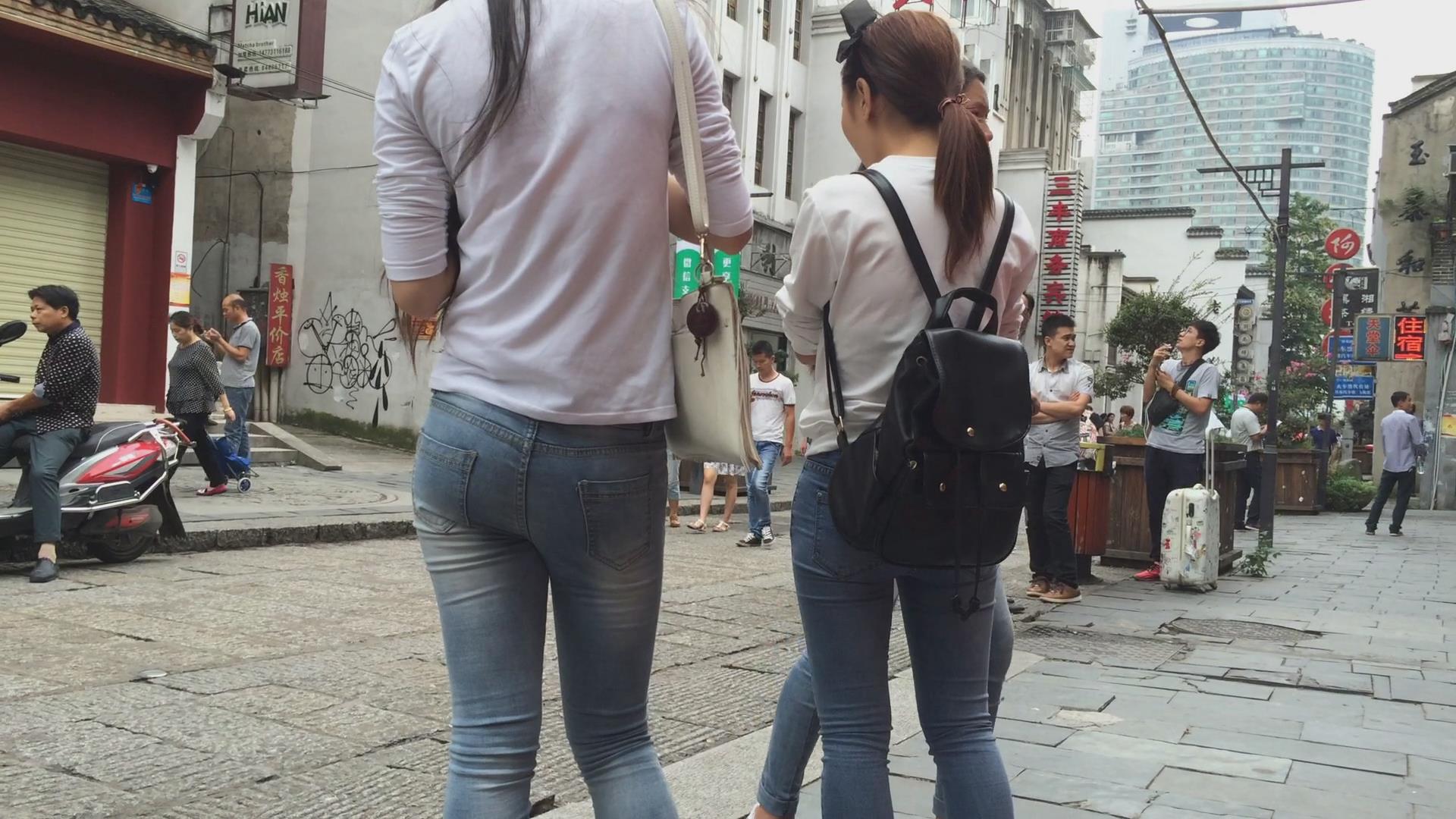 街拍路边闲聊的三位紧身蓝牛学生妹 编号6047