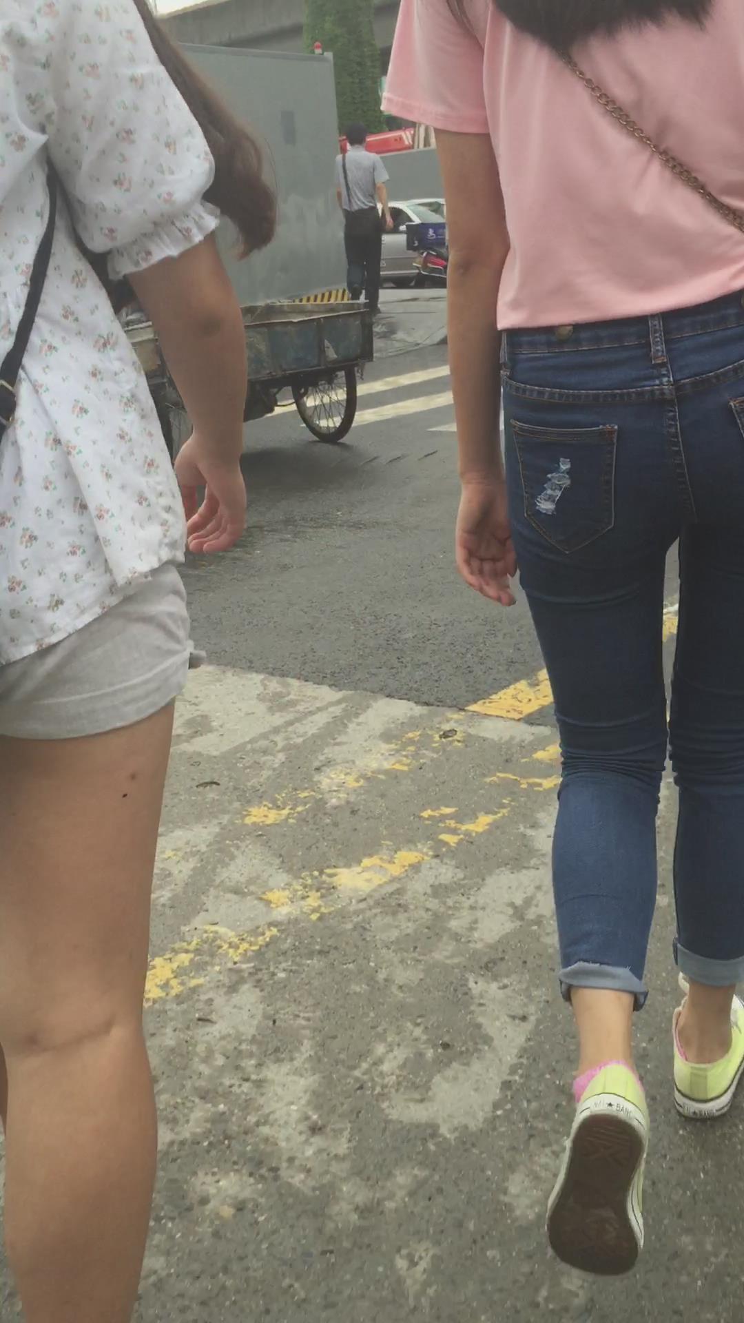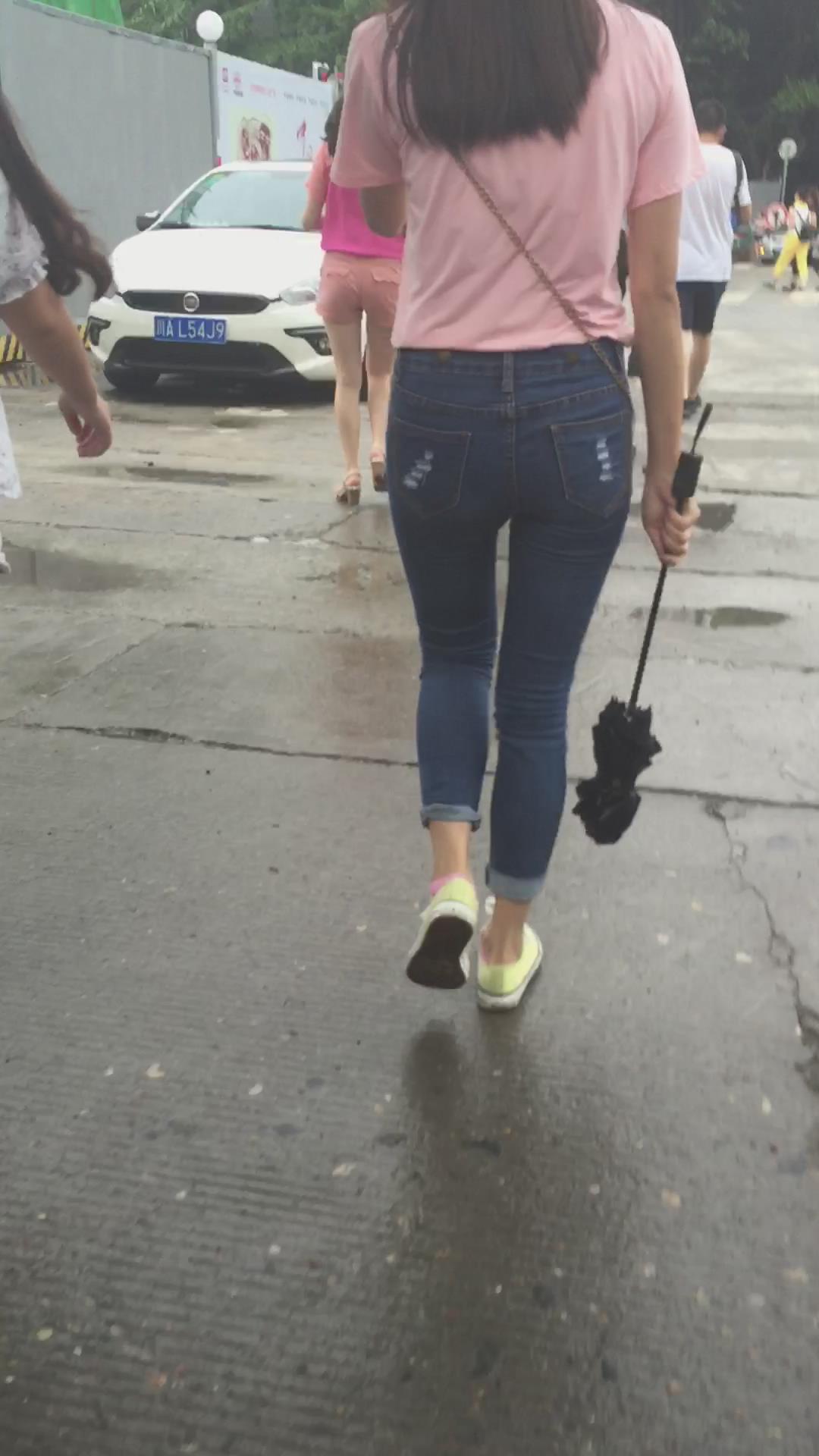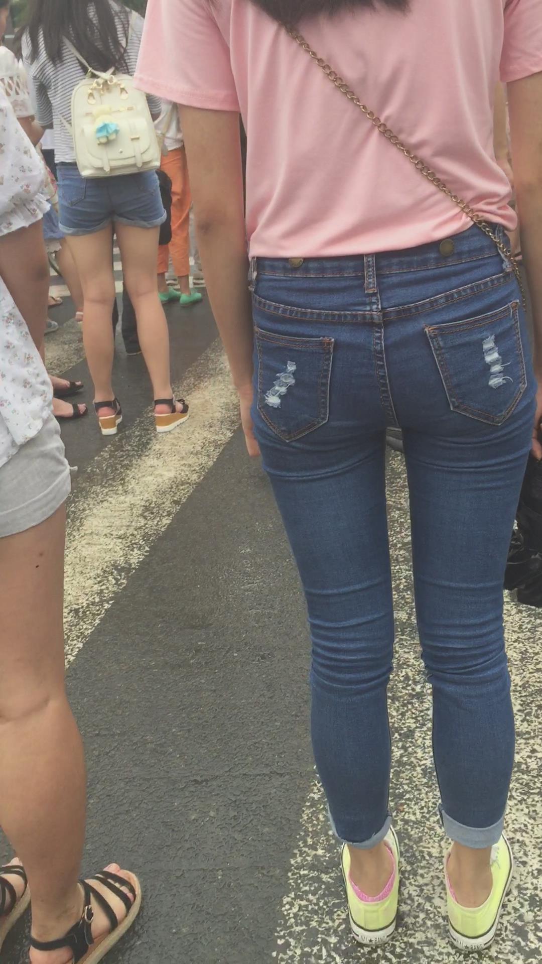 粉色T恤街拍紧身蓝色牛仔裤妹纸 编号6059